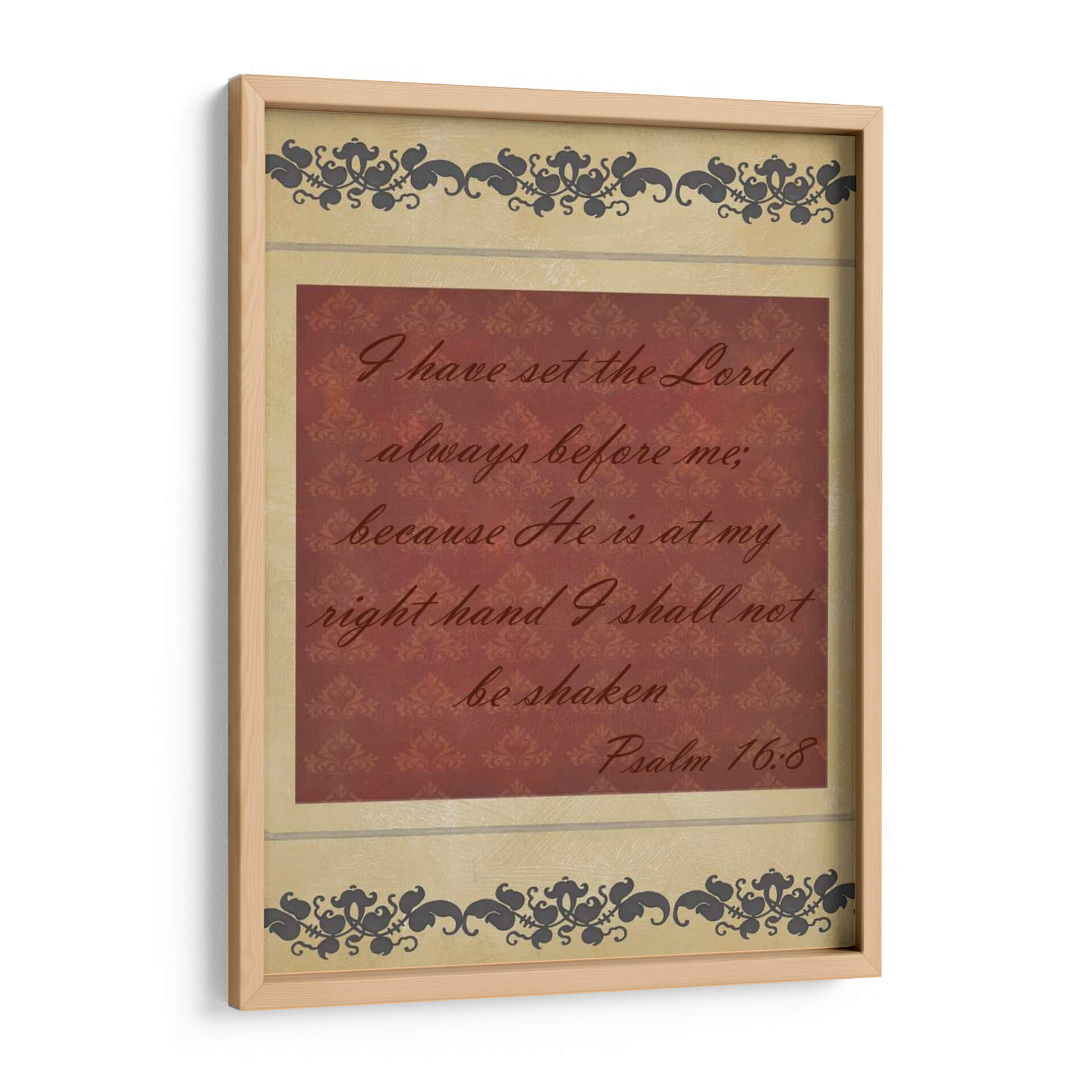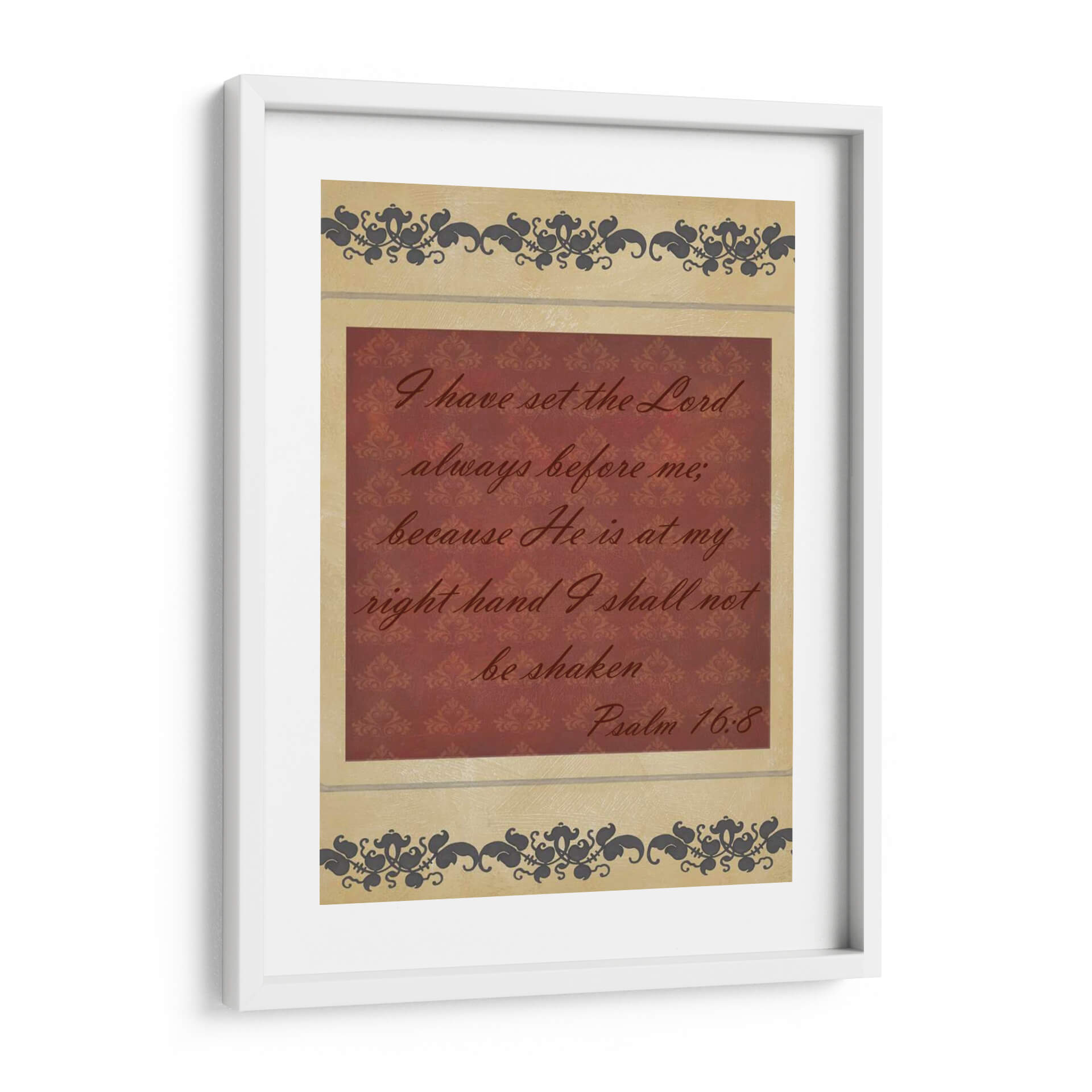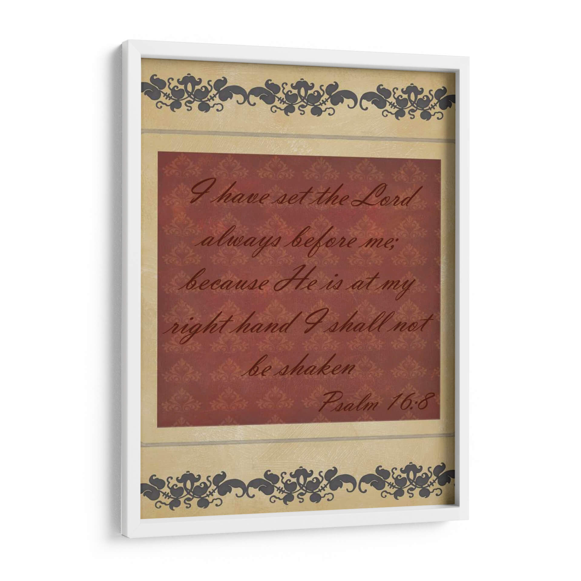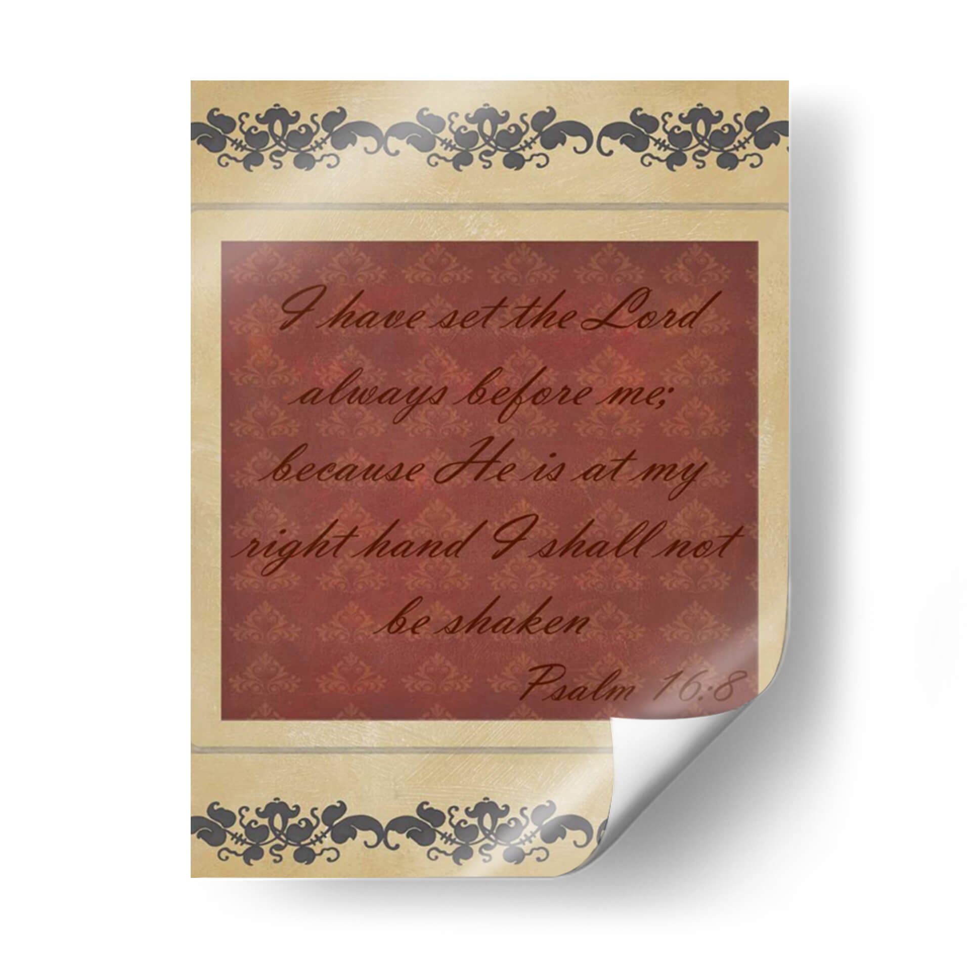 Inyecta serenidad y fortaleza a tu espacio con "Mas Que Palabras Iv", una obra de arte textual que captura la esencia de la fe inquebrantable. Este cuadro decorativo presenta una cita bíblica inspiradora en una caligrafía elegante sobre un fondo texturizado de damasco en tonos borgoña, enmarcado por delicados motivos ornamentales en tonos tierra y gris oscuro. La composición equilibra la fuerza del mensaje con la sutileza del diseño, creando una pieza que invita a la reflexión y la paz interior. Ideal para quienes buscan un recordatorio constante de esperanza y protección, este cuadro es perfecto para salones, dormitorios o espacios de meditación, aportando un toque de espiritualidad y sofisticación. Su diseño atemporal y su mensaje universal lo convierten en una adición valiosa para cualquier hogar que valore la inspiración y la belleza.