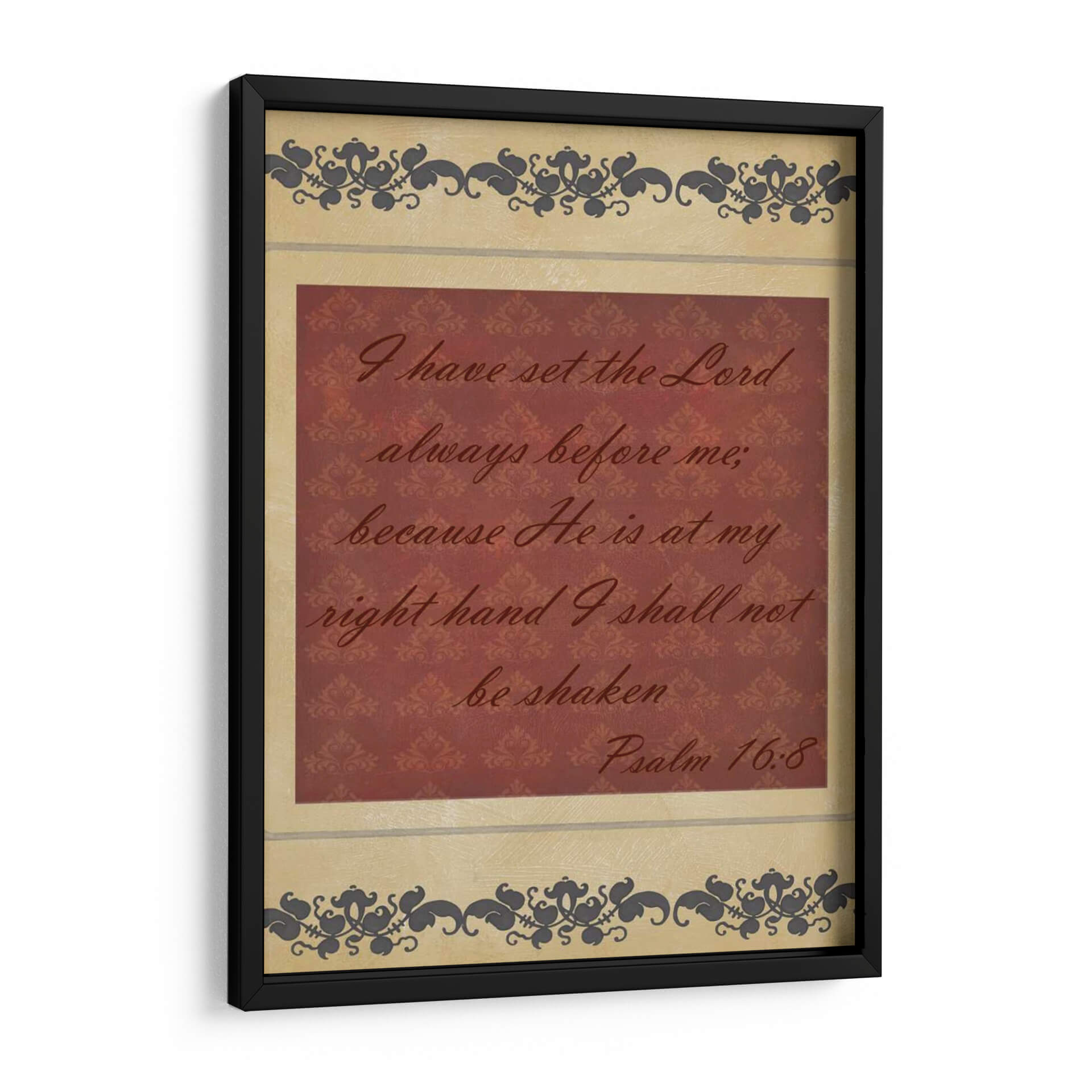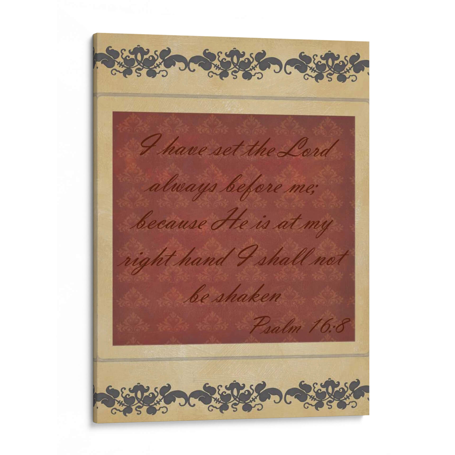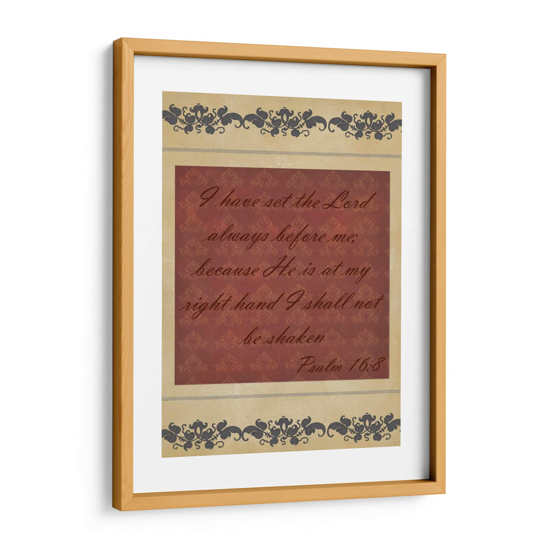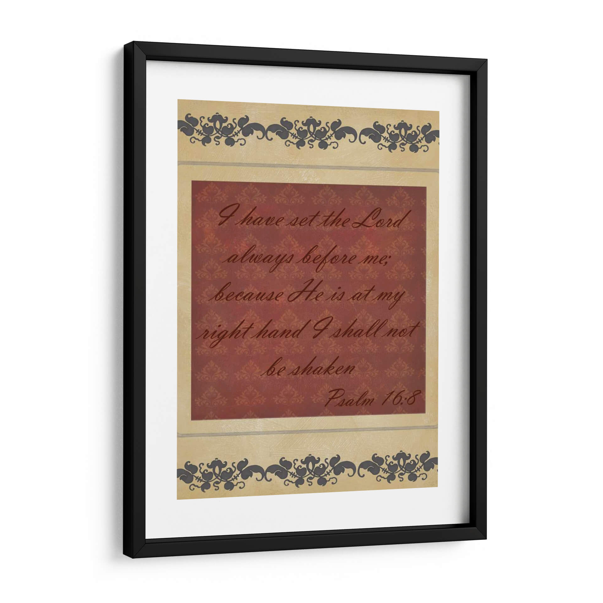 Inyecta serenidad y fortaleza a tu espacio con "Mas Que Palabras Iv", una obra de arte textual que captura la esencia de la fe inquebrantable. Este cuadro decorativo presenta una cita bíblica inspiradora en una caligrafía elegante sobre un fondo texturizado de damasco en tonos borgoña, enmarcado por delicados motivos ornamentales en tonos tierra y gris oscuro. La composición equilibra la fuerza del mensaje con la sutileza del diseño, creando una pieza que invita a la reflexión y la paz interior. Ideal para quienes buscan un recordatorio constante de esperanza y protección, este cuadro es perfecto para salones, dormitorios o espacios de meditación, aportando un toque de espiritualidad y sofisticación. Su diseño atemporal y su mensaje universal lo convierten en una adición valiosa para cualquier hogar que valore la inspiración y la belleza.