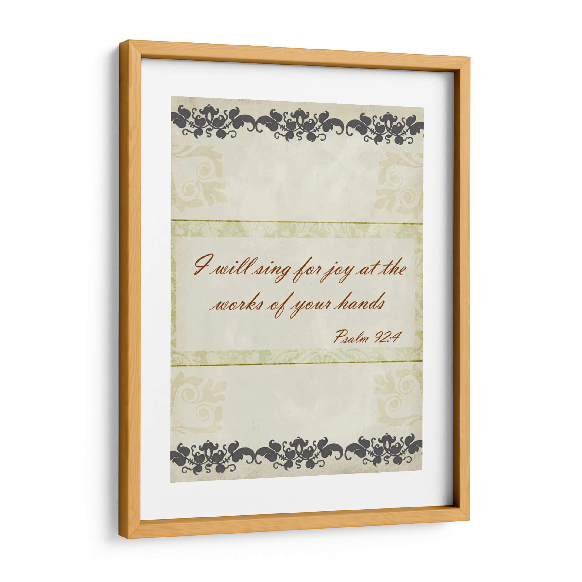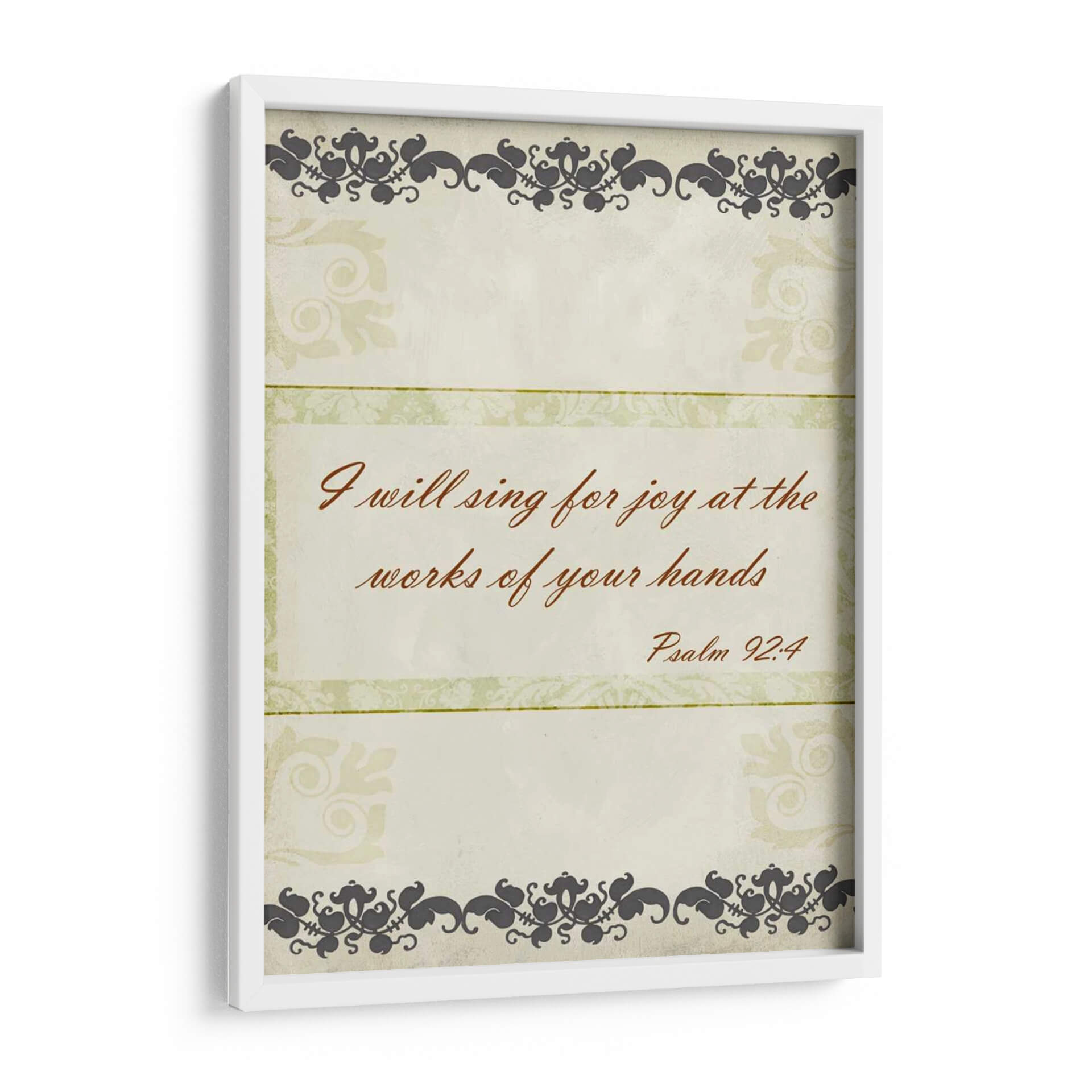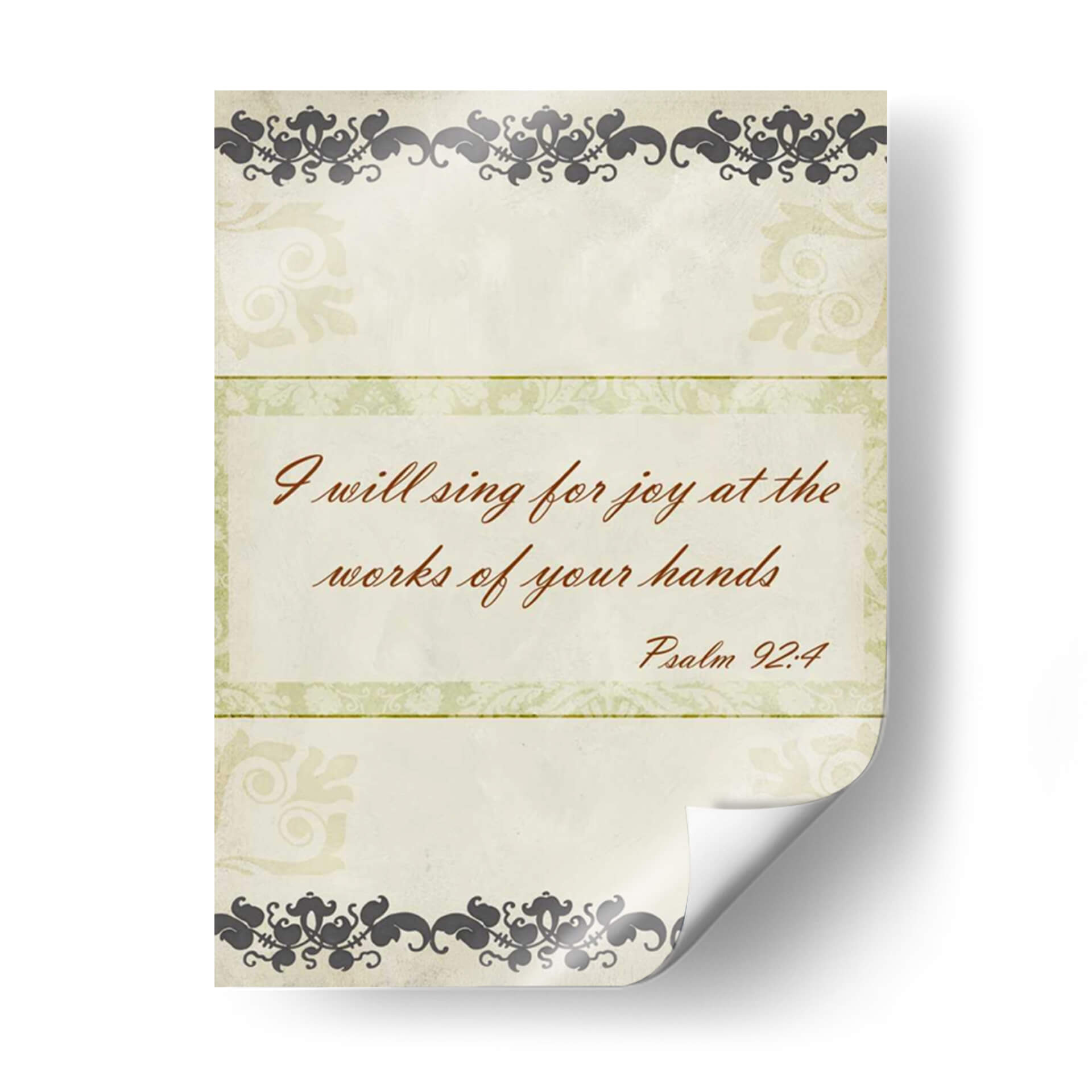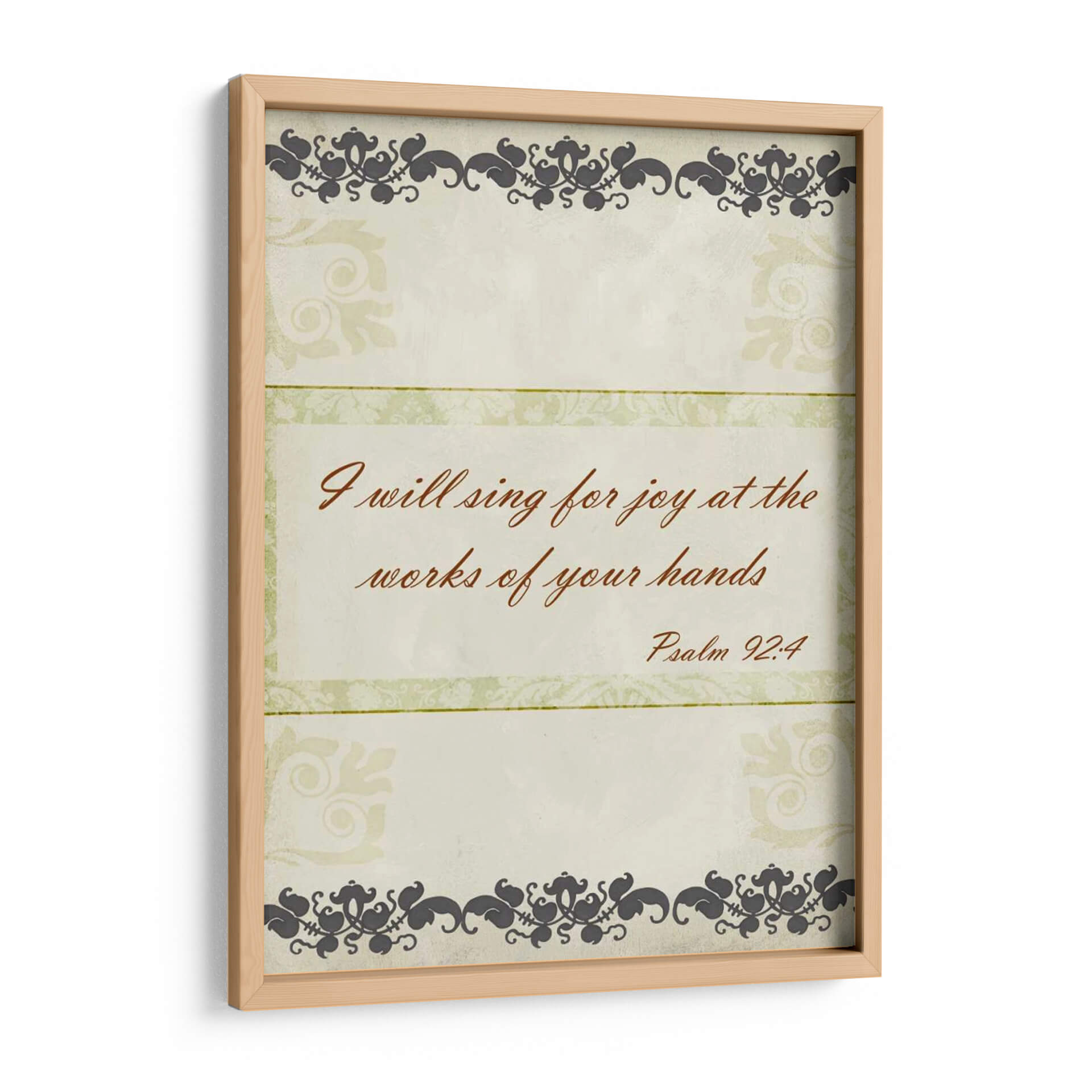 Inunda tu hogar de serenidad y gratitud con este inspirador cuadro decorativo "Mas Que Palabras Vi" del artista Studio W. La obra presenta un diseño elegante y atemporal, centrado en una cita bíblica "I will sing for joy at the works of your hands, Psalm 92:4" (Cantaré de gozo por las obras de tus manos, Salmo 92:4), escrita en una caligrafía cursiva de tonos rojizos sobre un fondo texturizado en crema y verde pálido. Delicados patrones ornamentales en gris oscuro flanquean la composición superior e inferior, aportando un toque de sofisticación clásica. Esta pieza es ideal para crear un ambiente de reflexión y paz en tu sala de estar, dormitorio o pasillo. Su paleta de colores neutros y su mensaje inspirador la convierten en una adición perfecta para cualquier espacio que busque transmitir calma, fe y aprecio por las maravillas de la vida. Añade un toque de significado profundo y belleza serena a tu decoración con este cuadro que va más allá de las palabras.