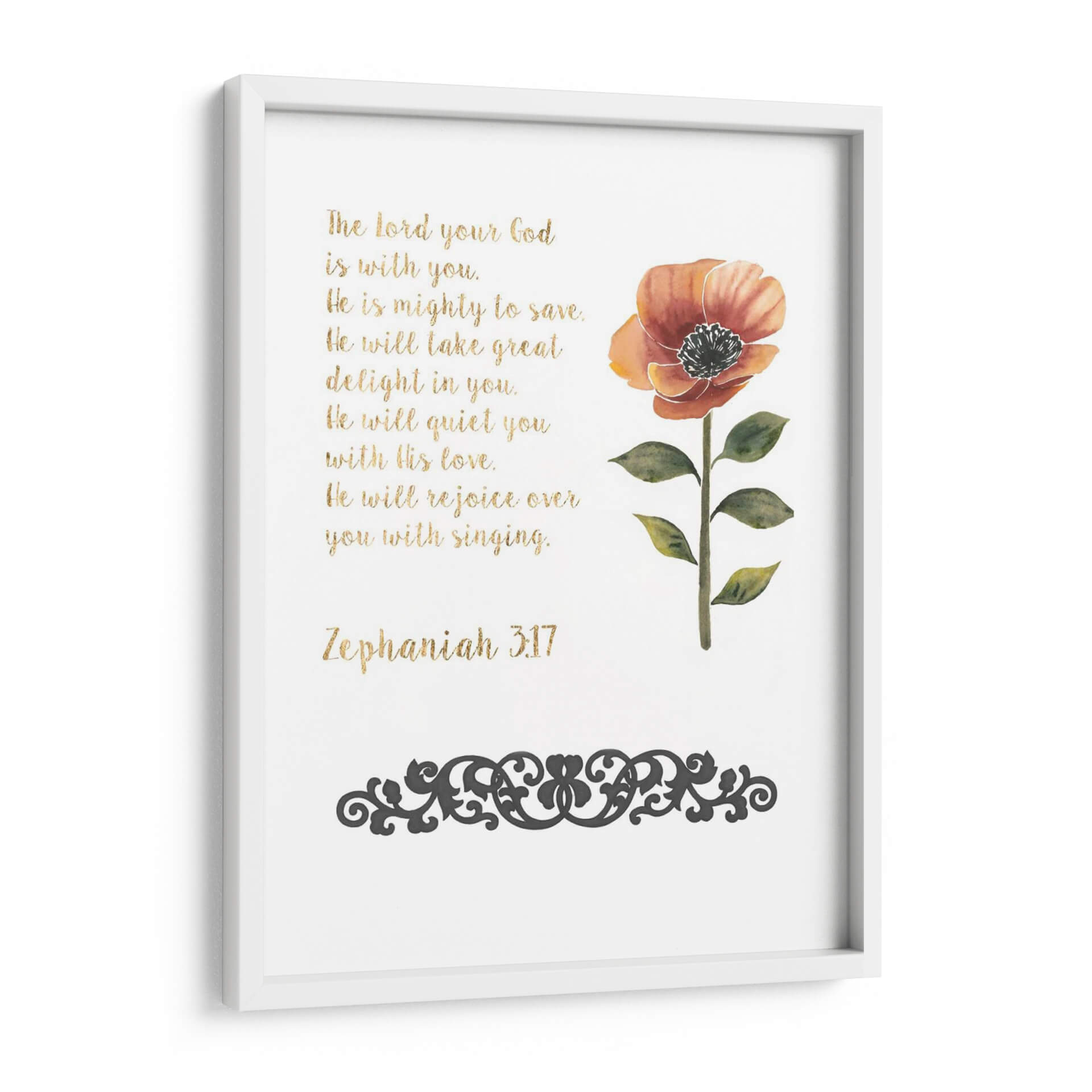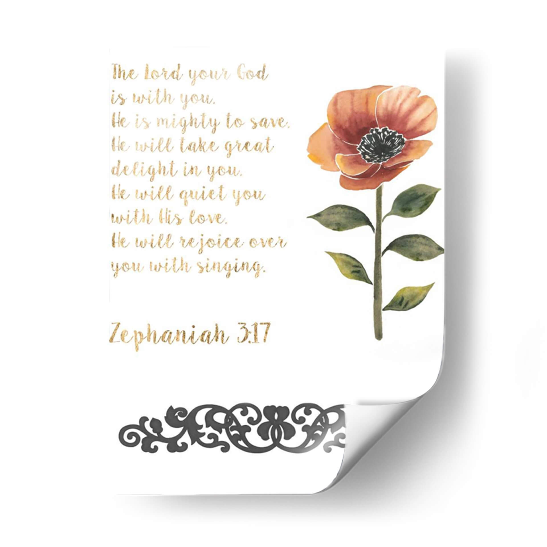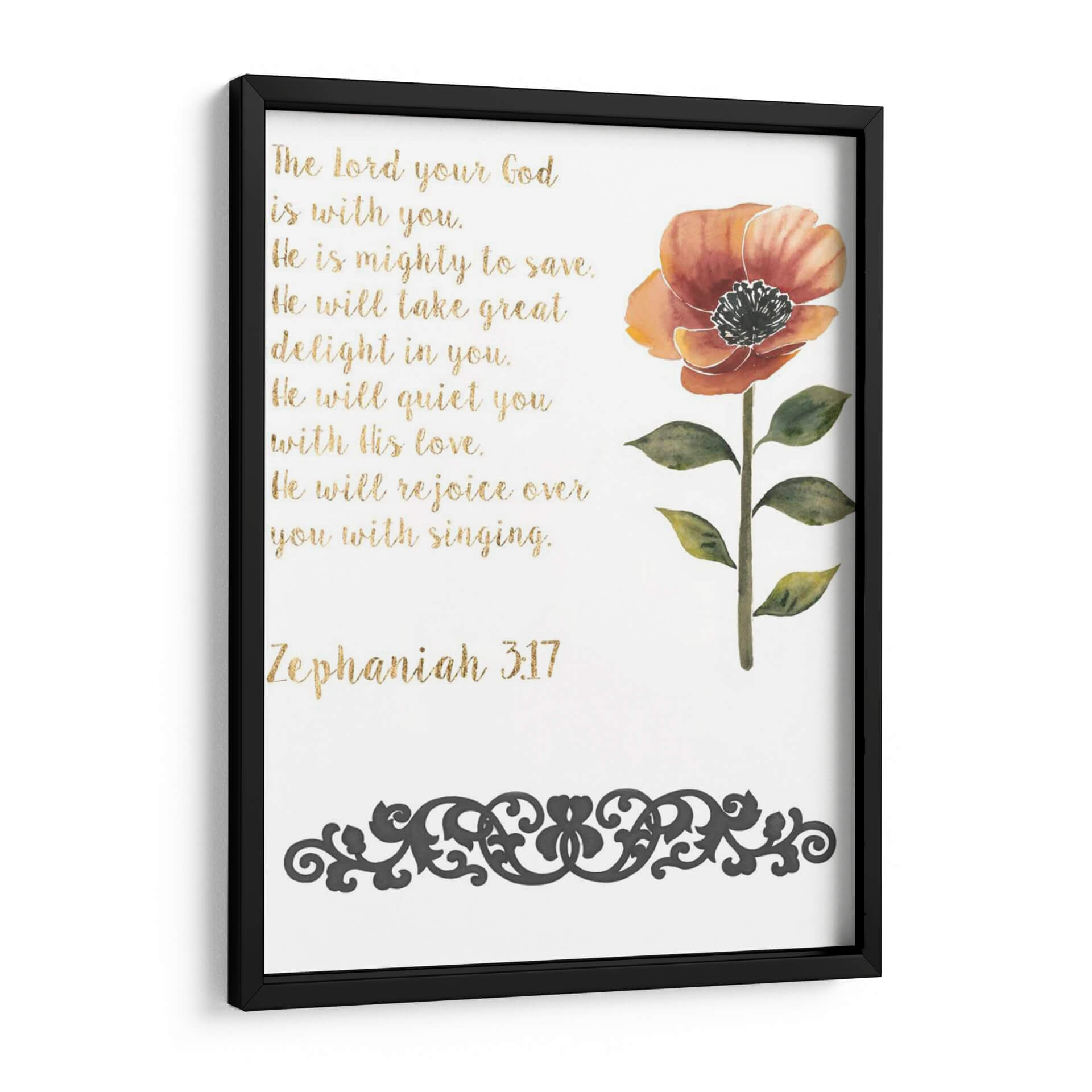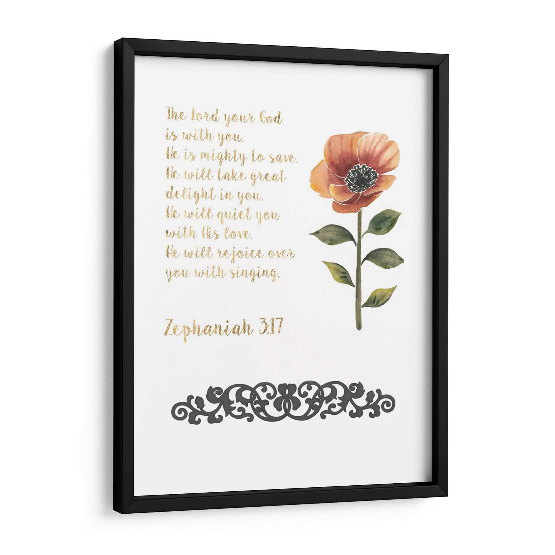 Infundir a tu espacio una dosis de fe y belleza con "Mas Que Palabras X", una obra de arte inspiradora del artista Studio W. Este cuadro decorativo presenta una delicada acuarela de una amapola vibrante en tonos naranjas y rojos, con pétalos detallados y un centro oscuro contrastante. La flor se alza con gracia sobre un tallo verde y hojas, evocando la fuerza y la delicadeza de la naturaleza. Complementando la imagen, el texto bíblico de Sofonías 3:17 aparece en una elegante caligrafía dorada, añadiendo un mensaje de consuelo y esperanza. La combinación de la flor naturalista y el texto sagrado crea una pieza de arte religioso y contemporáneo que invita a la reflexión y a la paz interior. Su estilo, que fusiona la sutileza de la acuarela con el brillo del oro, lo hace perfecto para cualquier rincón que necesite un toque de serenidad y espiritualidad. Ideal para salones, dormitorios o como un regalo significativo que eleva el espíritu y embellece el hogar. Una elección que resonará con quienes buscan arte con propósito.
