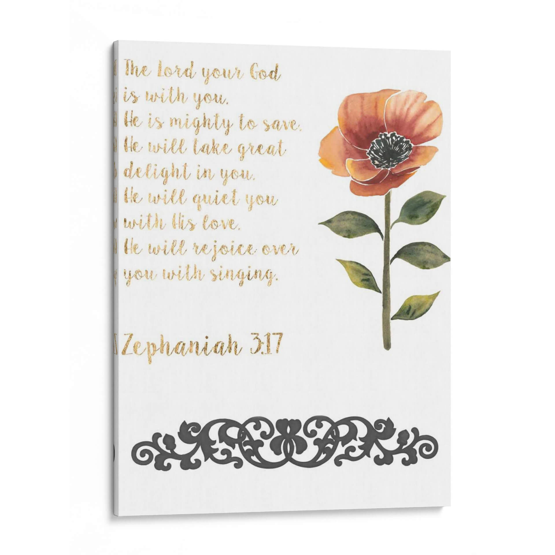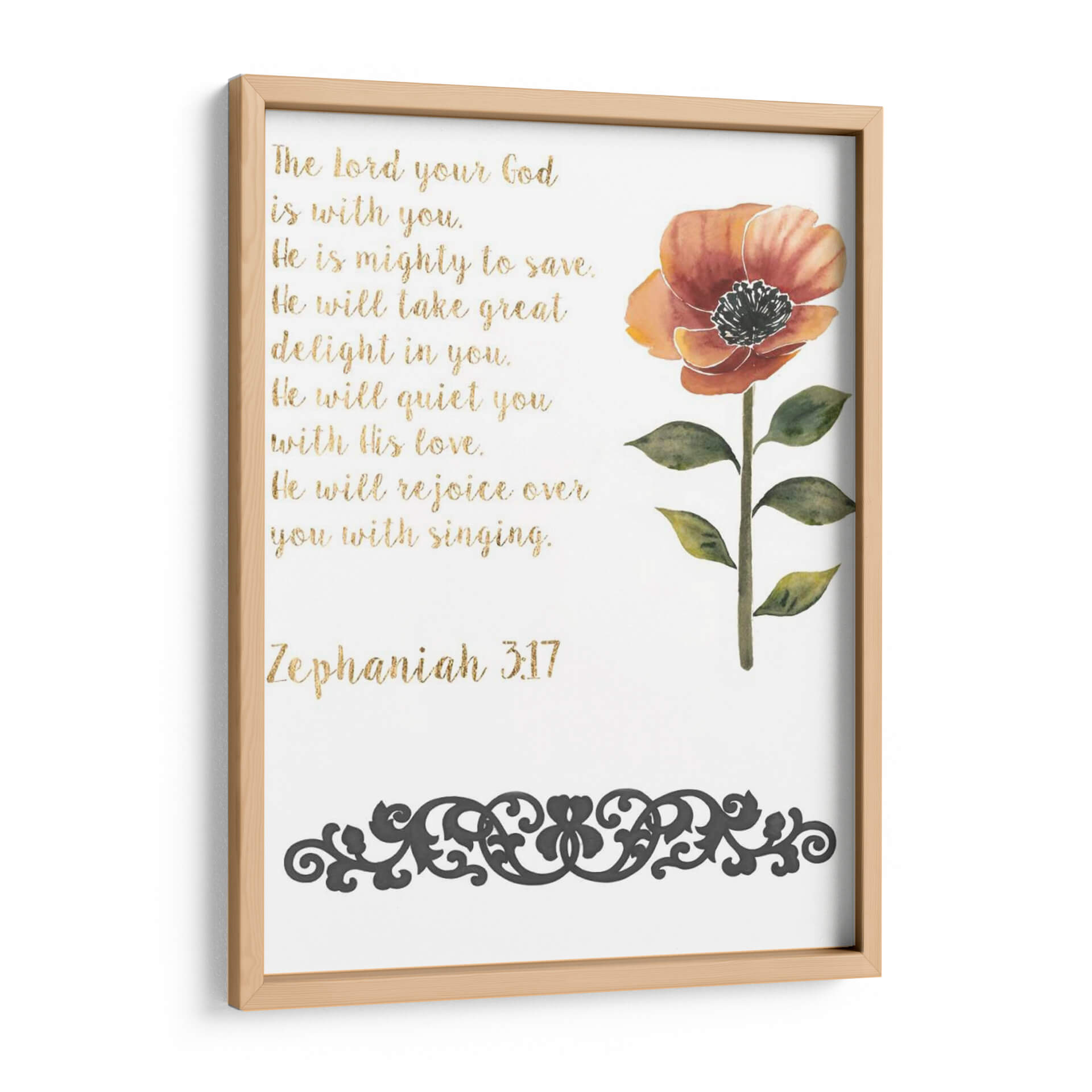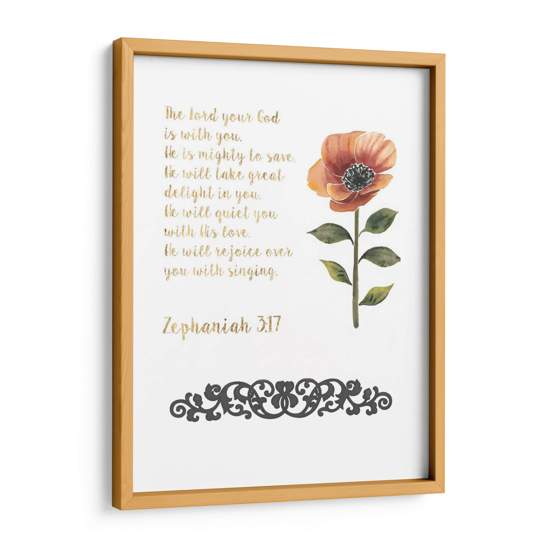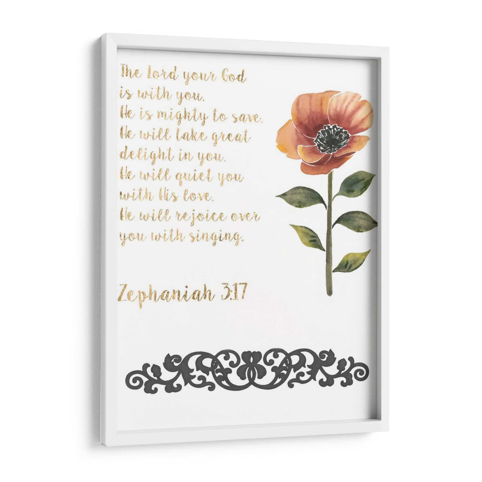Infundir a tu espacio una dosis de fe y belleza con "Mas Que Palabras X", una obra de arte inspiradora del artista Studio W. Este cuadro decorativo presenta una delicada acuarela de una amapola vibrante en tonos naranjas y rojos, con pétalos detallados y un centro oscuro contrastante. La flor se alza con gracia sobre un tallo verde y hojas, evocando la fuerza y la delicadeza de la naturaleza. Complementando la imagen, el texto bíblico de Sofonías 3:17 aparece en una elegante caligrafía dorada, añadiendo un mensaje de consuelo y esperanza. La combinación de la flor naturalista y el texto sagrado crea una pieza de arte religioso y contemporáneo que invita a la reflexión y a la paz interior. Su estilo, que fusiona la sutileza de la acuarela con el brillo del oro, lo hace perfecto para cualquier rincón que necesite un toque de serenidad y espiritualidad. Ideal para salones, dormitorios o como un regalo significativo que eleva el espíritu y embellece el hogar. Una elección que resonará con quienes buscan arte con propósito.
