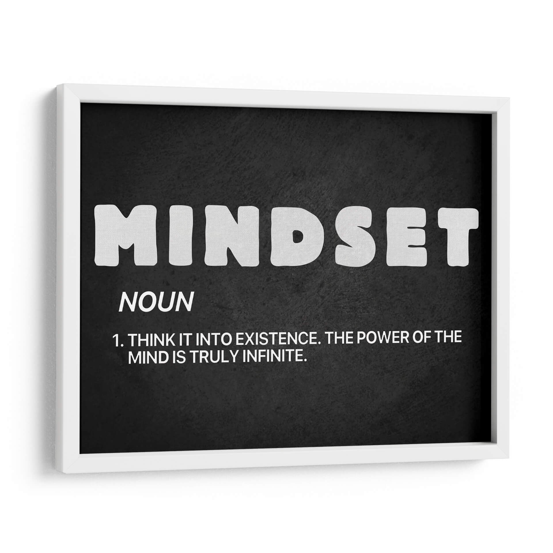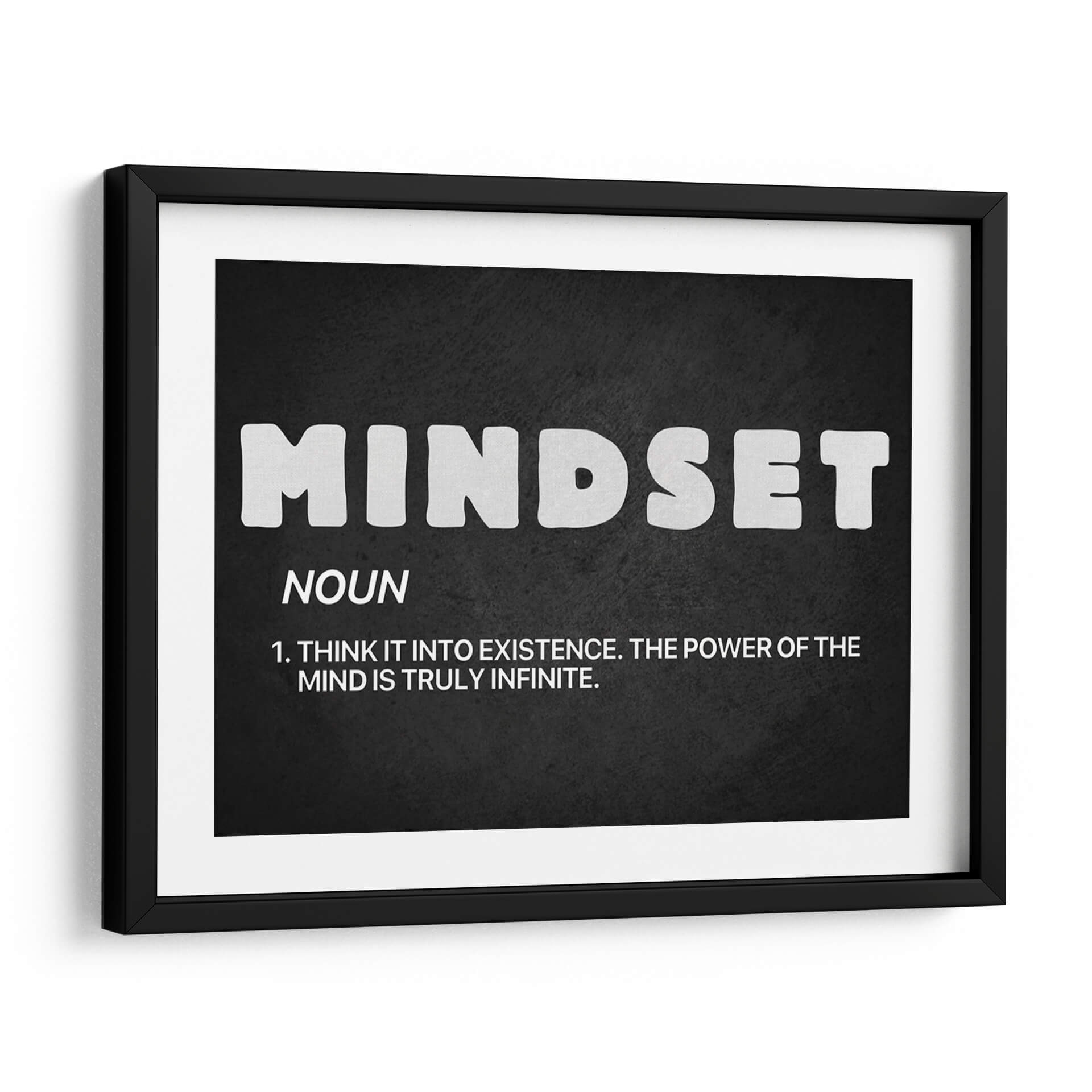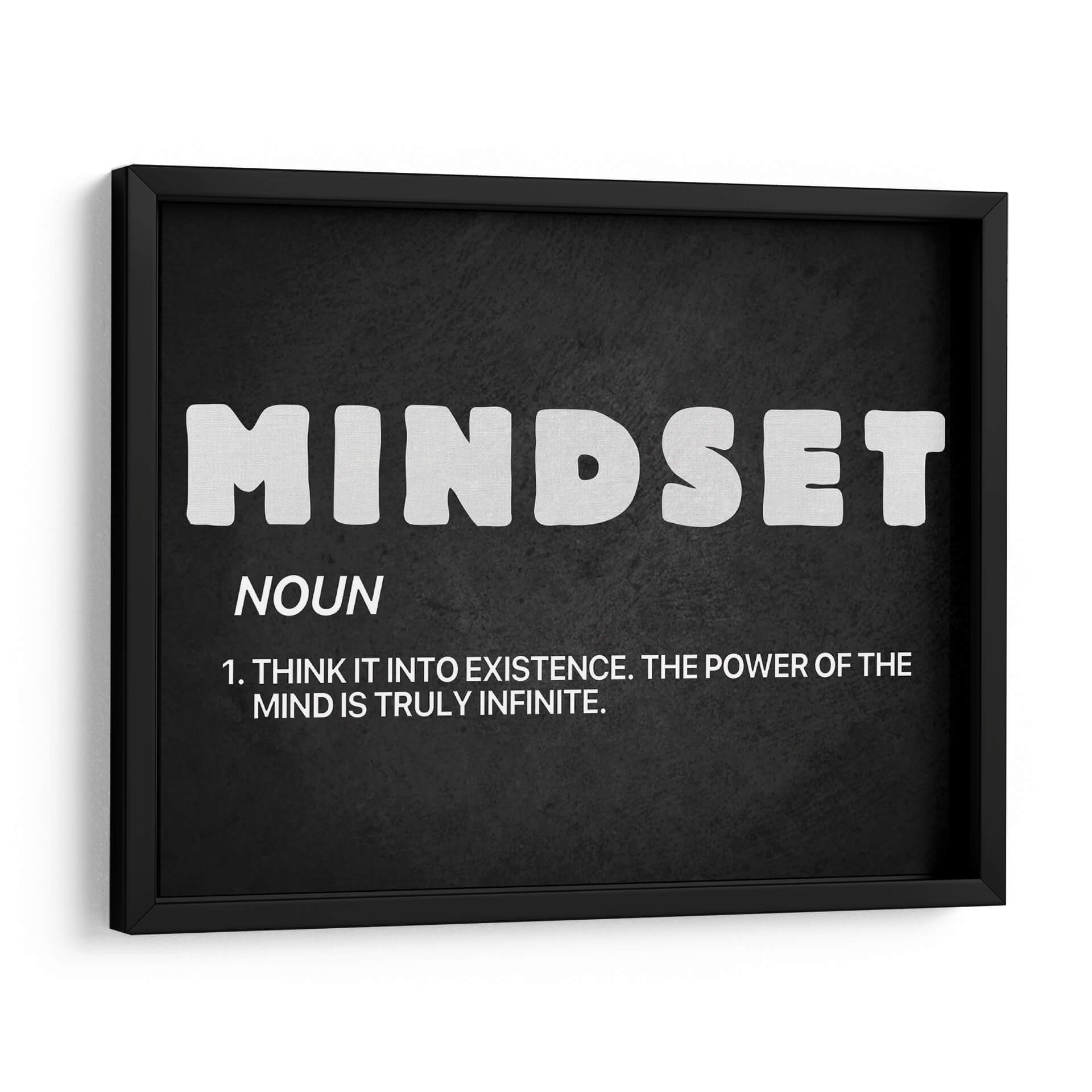 Inyecta inspiración y motivación a tu espacio con "Mindset noun", un cuadro decorativo que redefine el concepto de la mentalidad. Esta obra, presentada sobre un fondo oscuro y texturizado, destaca la palabra "MINDSET" en letras blancas audaces y estilizadas, acompañada de su definición: "NOUN. 1. THINK IT INTO EXISTENCE. THE POWER OF THE MIND IS TRULY INFINITE.". Su diseño minimalista y tipográfico lo convierte en una pieza poderosa, ideal para cualquier ambiente que busque fomentar el crecimiento personal y la positividad. La sencillez de su paleta de colores, basada en el contraste entre el blanco y el negro, asegura que esta obra se integre a la perfección en una amplia gama de decoraciones, desde oficinas modernas hasta salas de estar contemporáneas o incluso dormitorios. Transforma tu entorno en un santuario de empoderamiento y claridad mental con este inspirador cuadro decorativo. Es la elección perfecta para aquellos que creen en el potencial ilimitado de la mente y desean rodearse de recordatorios visuales de su propia fuerza interior. Añade este toque de sabiduría y estilo a tu hogar u oficina.