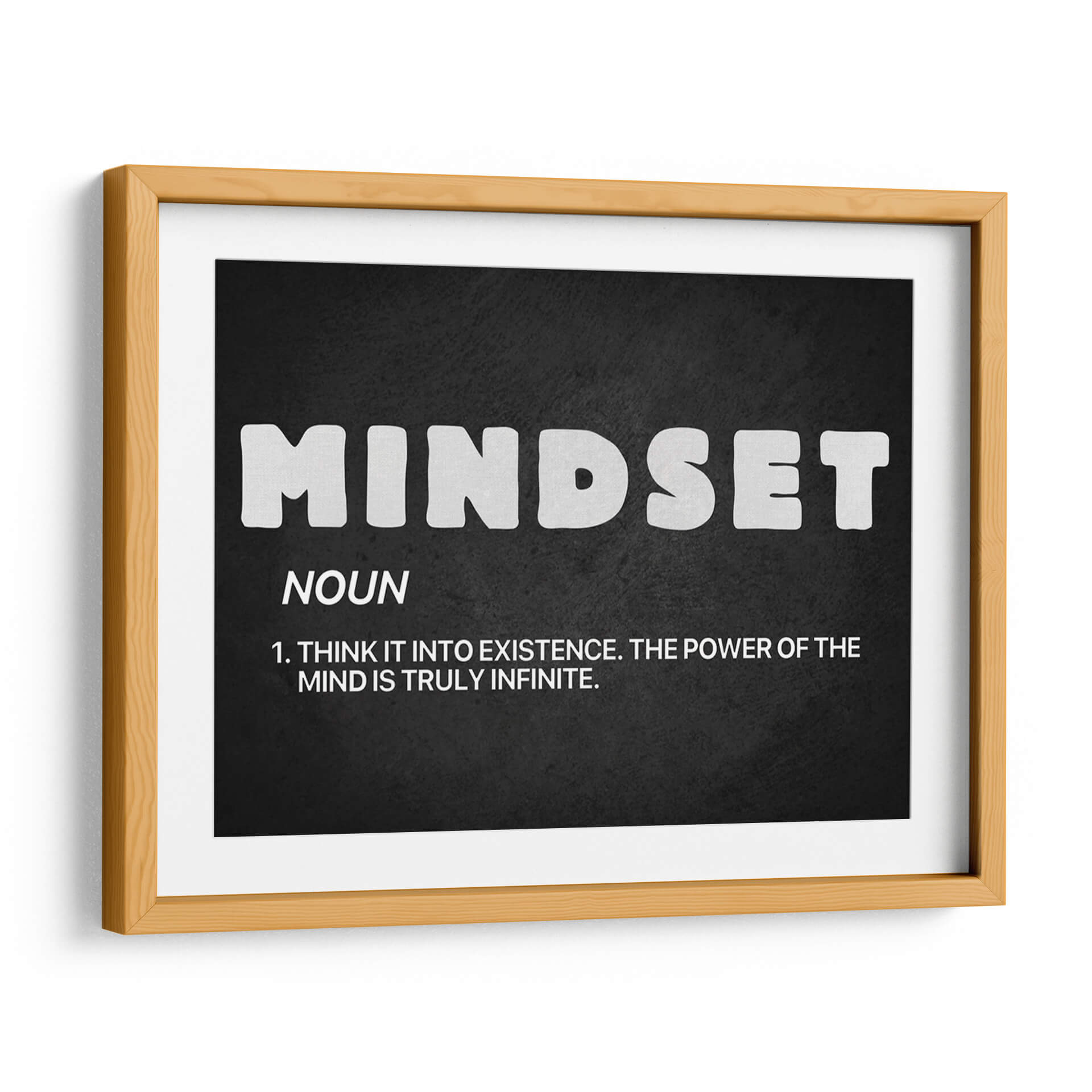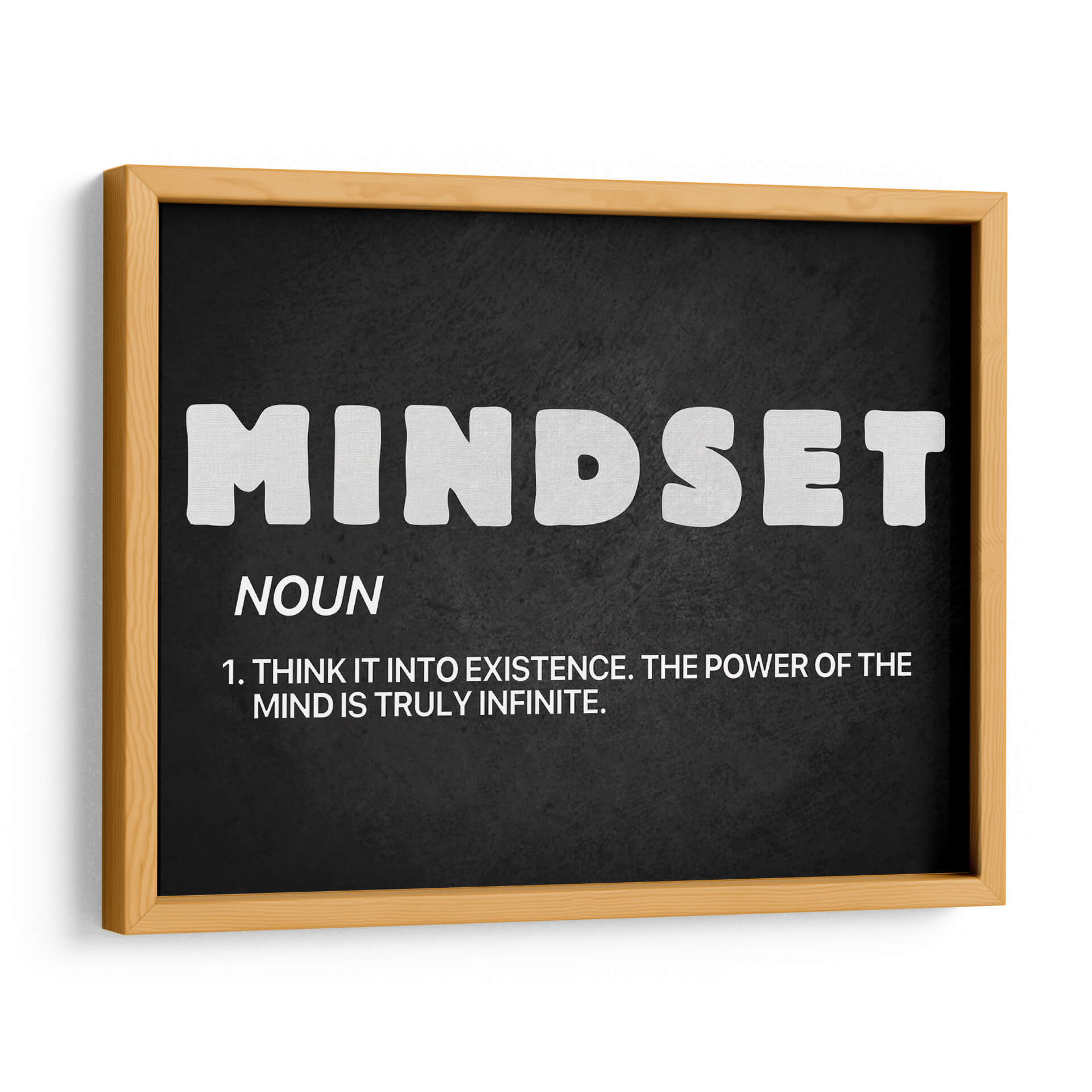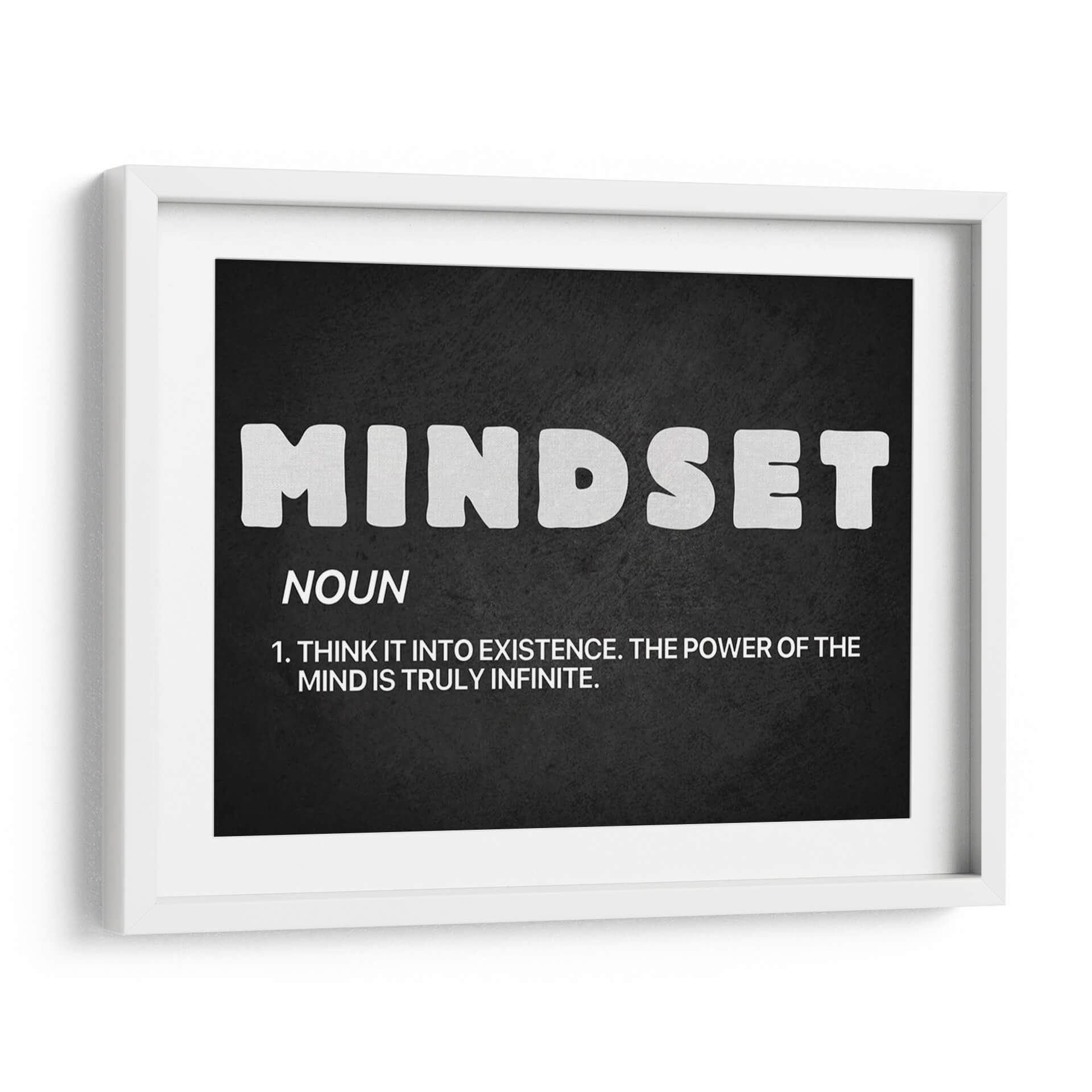 Inyecta inspiración y motivación a tu espacio con "Mindset noun", un cuadro decorativo que redefine el concepto de la mentalidad. Esta obra, presentada sobre un fondo oscuro y texturizado, destaca la palabra "MINDSET" en letras blancas audaces y estilizadas, acompañada de su definición: "NOUN. 1. THINK IT INTO EXISTENCE. THE POWER OF THE MIND IS TRULY INFINITE.". Su diseño minimalista y tipográfico lo convierte en una pieza poderosa, ideal para cualquier ambiente que busque fomentar el crecimiento personal y la positividad. La sencillez de su paleta de colores, basada en el contraste entre el blanco y el negro, asegura que esta obra se integre a la perfección en una amplia gama de decoraciones, desde oficinas modernas hasta salas de estar contemporáneas o incluso dormitorios. Transforma tu entorno en un santuario de empoderamiento y claridad mental con este inspirador cuadro decorativo. Es la elección perfecta para aquellos que creen en el potencial ilimitado de la mente y desean rodearse de recordatorios visuales de su propia fuerza interior. Añade este toque de sabiduría y estilo a tu hogar u oficina.