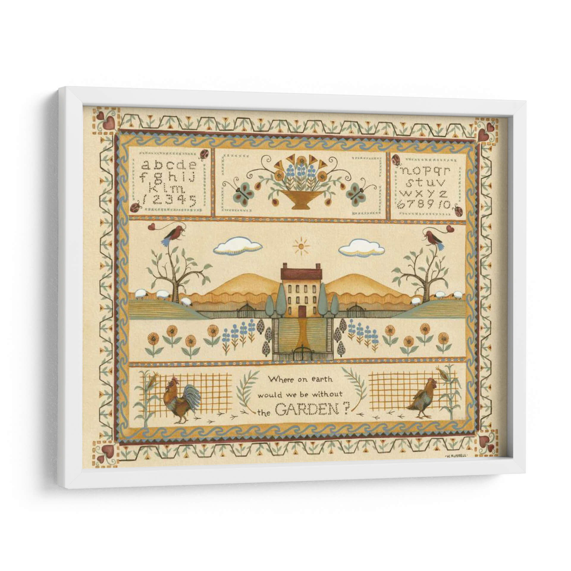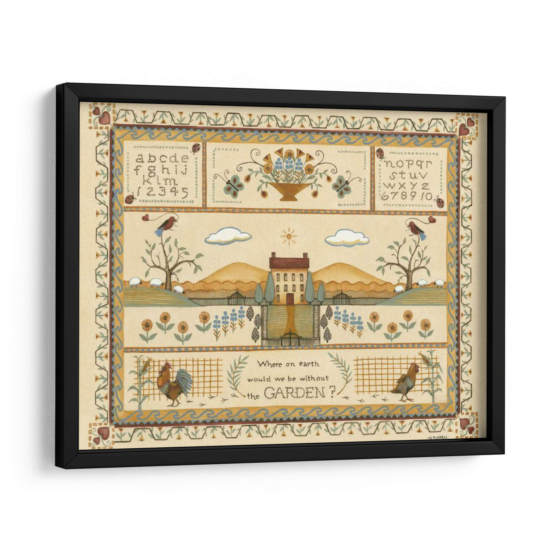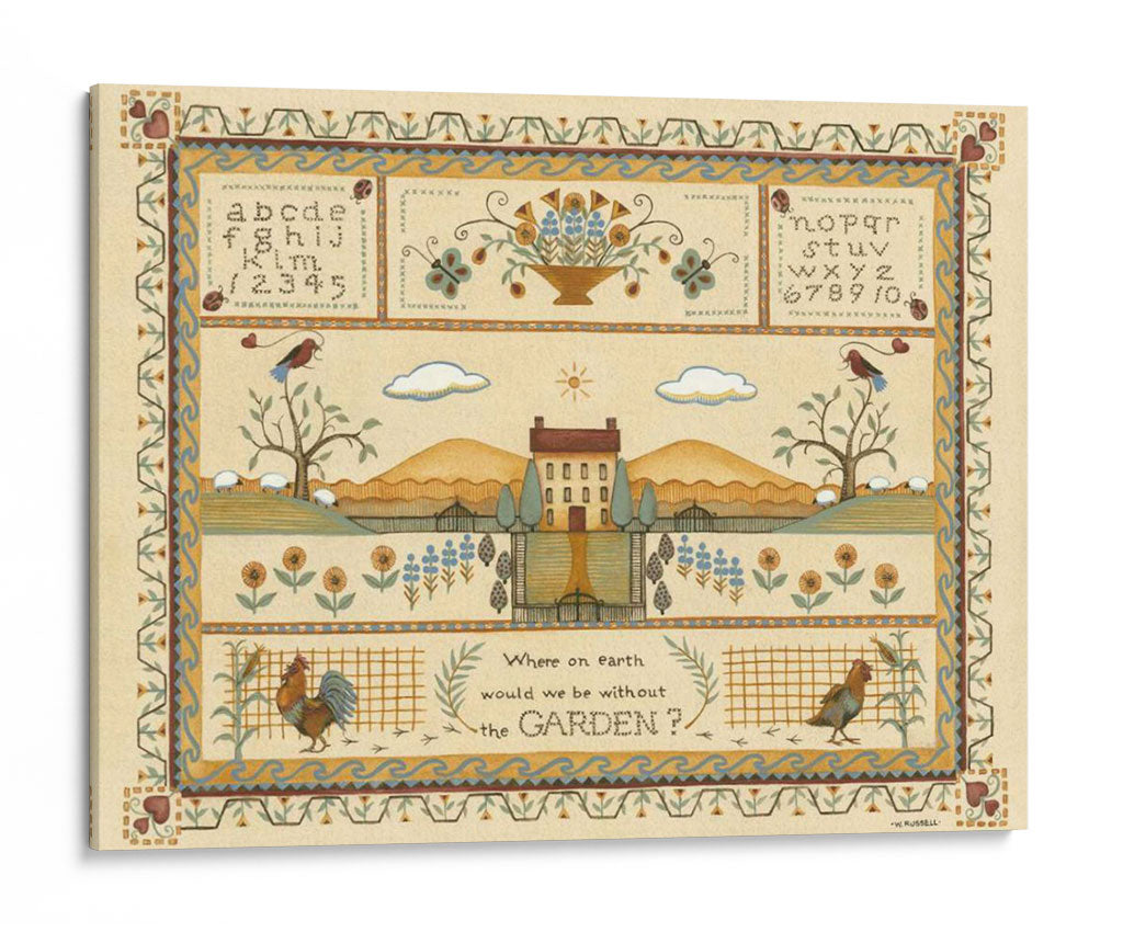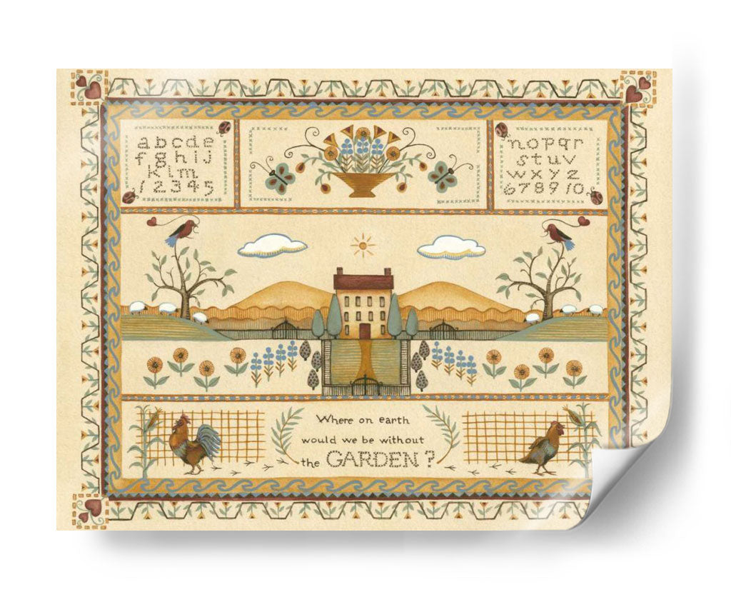 Sumérgete en la serenidad campestre con "Muestra de Jardín I", una obra de arte de Wendy Russell que captura la esencia idílica de la vida rural. Este cuadro decorativo te transporta a un paisaje pintoresco, con una casa de campo central flanqueada por colinas ondulantes y un cielo sereno adornado con nubes y un sol radiante. La composición se enriquece con detalles encantadores como un gallo vibrante, ovejas pastando y aves posadas en árboles, todo ello enmarcado por bordes ornamentados que recuerdan a la artesanía tradicional. La paleta de colores, dominada por tonos tierra cálidos, amarillos suaves y toques de azul y verde, crea una atmósfera de paz y nostalgia. Ideal para quienes buscan infundir a su hogar una sensación de tranquilidad y conexión con la naturaleza, este cuadro es perfecto para salas de estar, comedores o cualquier espacio que necesite un toque de encanto rústico y un recordatorio de la belleza sencilla del mundo natural. "Muestra de Jardín I" no es solo una pieza decorativa, es una invitación a pausar y apreciar la belleza que nos rodea, evocando la calidez del hogar y la vitalidad del jardín.
