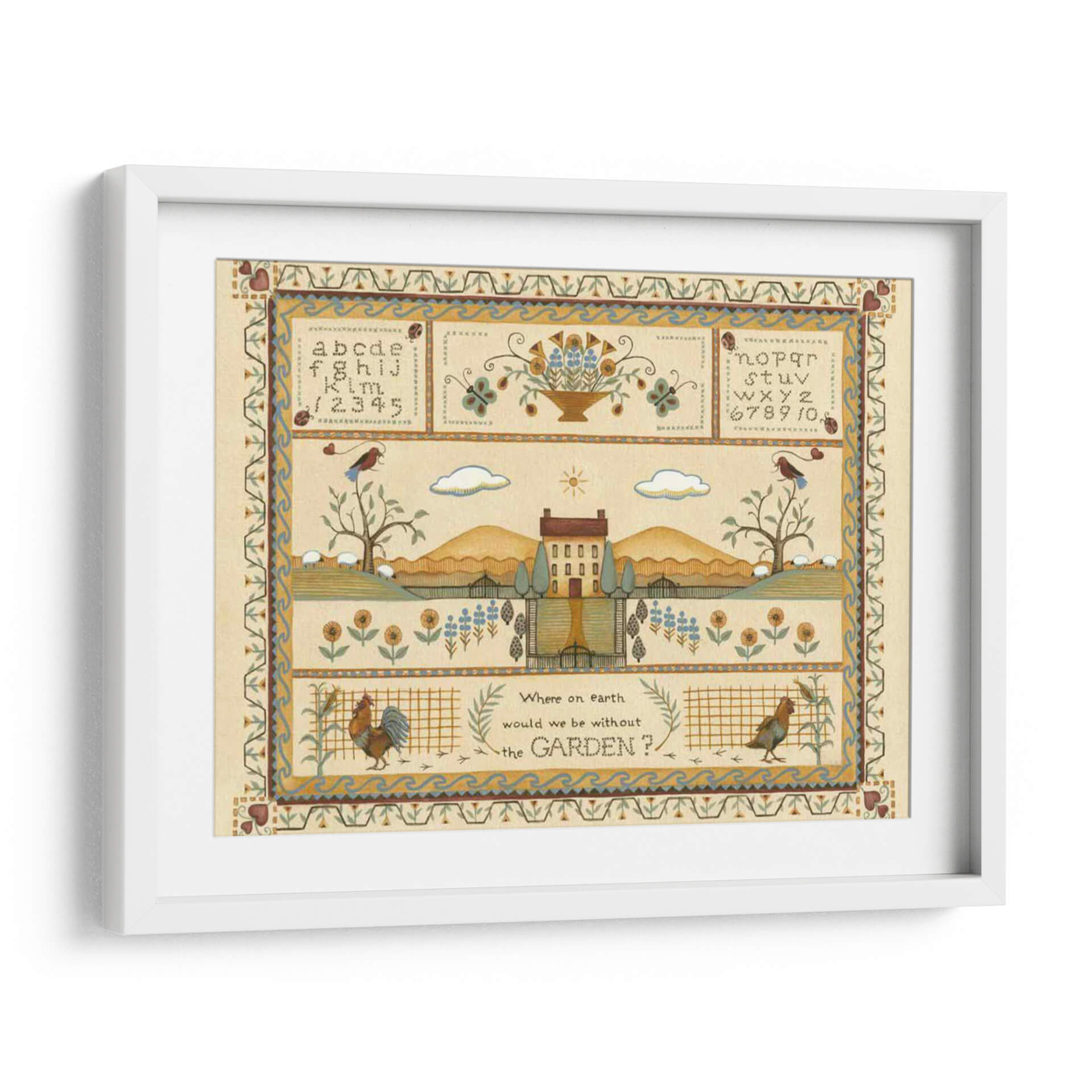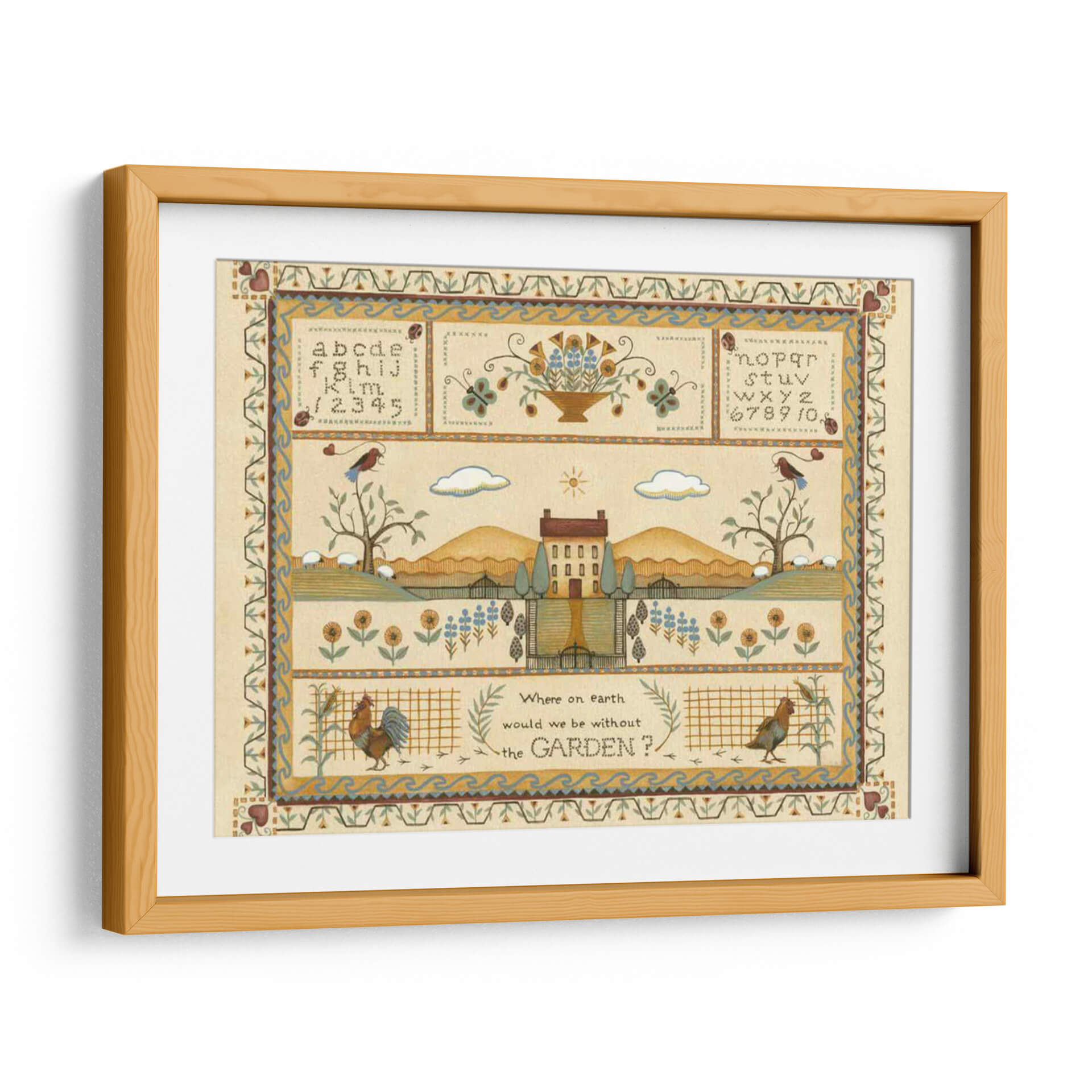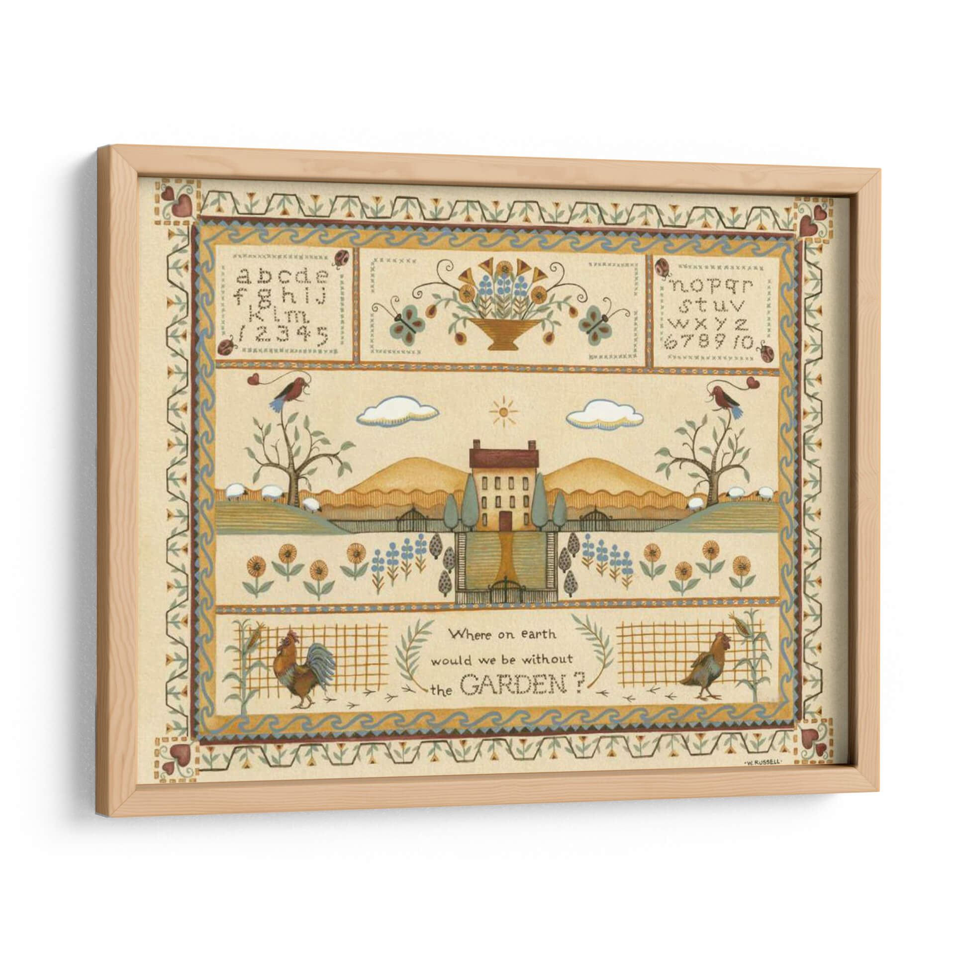 Sumérgete en la serenidad campestre con "Muestra de Jardín I", una obra de arte de Wendy Russell que captura la esencia idílica de la vida rural. Este cuadro decorativo te transporta a un paisaje pintoresco, con una casa de campo central flanqueada por colinas ondulantes y un cielo sereno adornado con nubes y un sol radiante. La composición se enriquece con detalles encantadores como un gallo vibrante, ovejas pastando y aves posadas en árboles, todo ello enmarcado por bordes ornamentados que recuerdan a la artesanía tradicional. La paleta de colores, dominada por tonos tierra cálidos, amarillos suaves y toques de azul y verde, crea una atmósfera de paz y nostalgia. Ideal para quienes buscan infundir a su hogar una sensación de tranquilidad y conexión con la naturaleza, este cuadro es perfecto para salas de estar, comedores o cualquier espacio que necesite un toque de encanto rústico y un recordatorio de la belleza sencilla del mundo natural. "Muestra de Jardín I" no es solo una pieza decorativa, es una invitación a pausar y apreciar la belleza que nos rodea, evocando la calidez del hogar y la vitalidad del jardín.