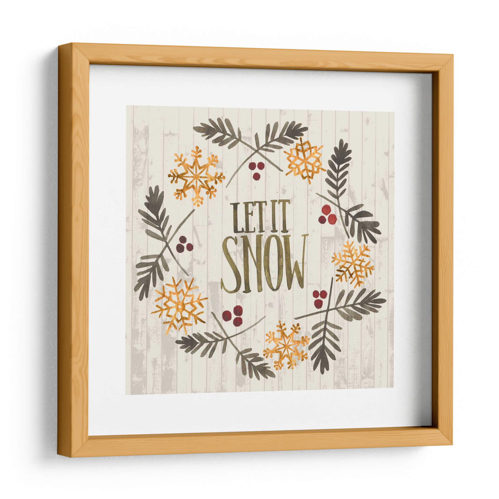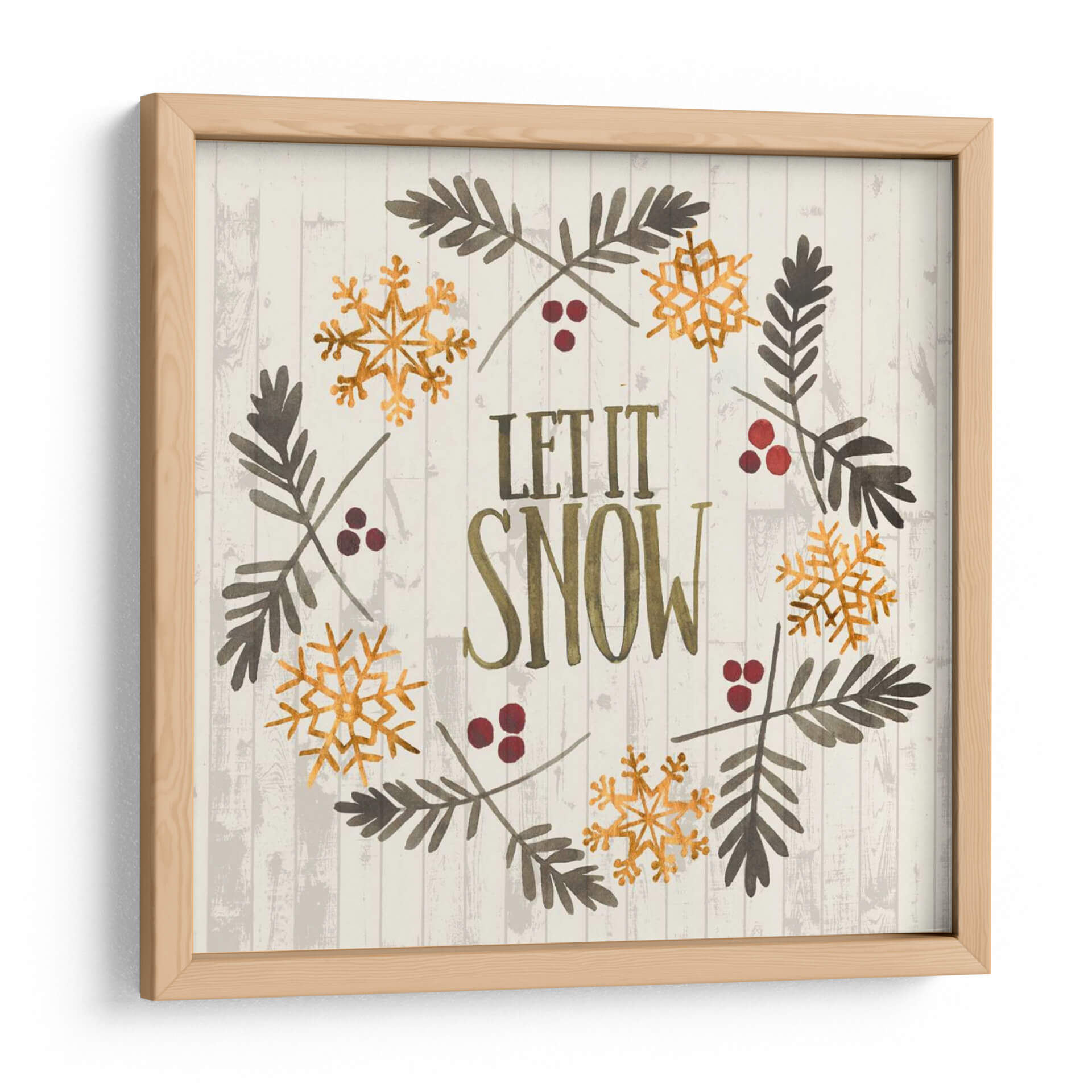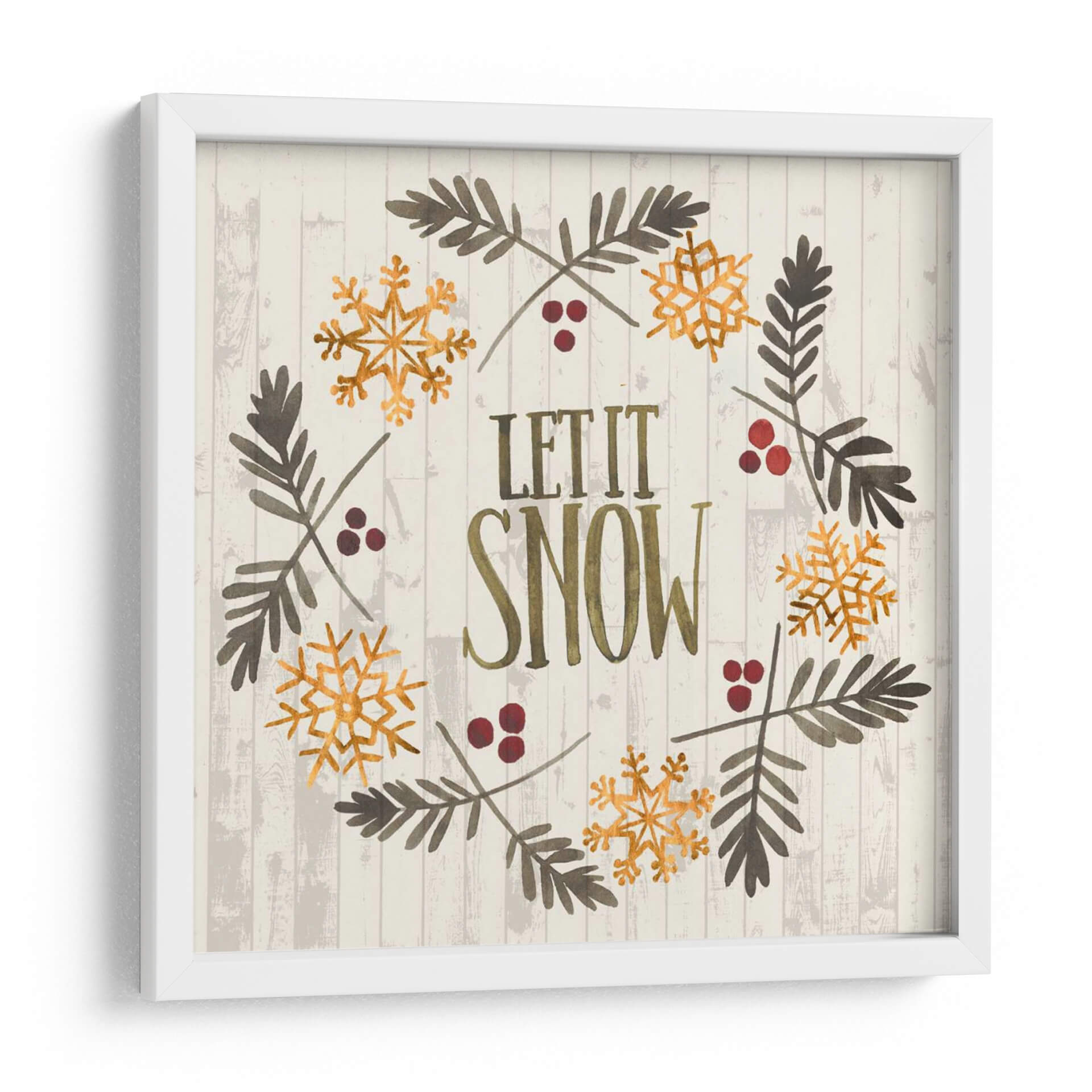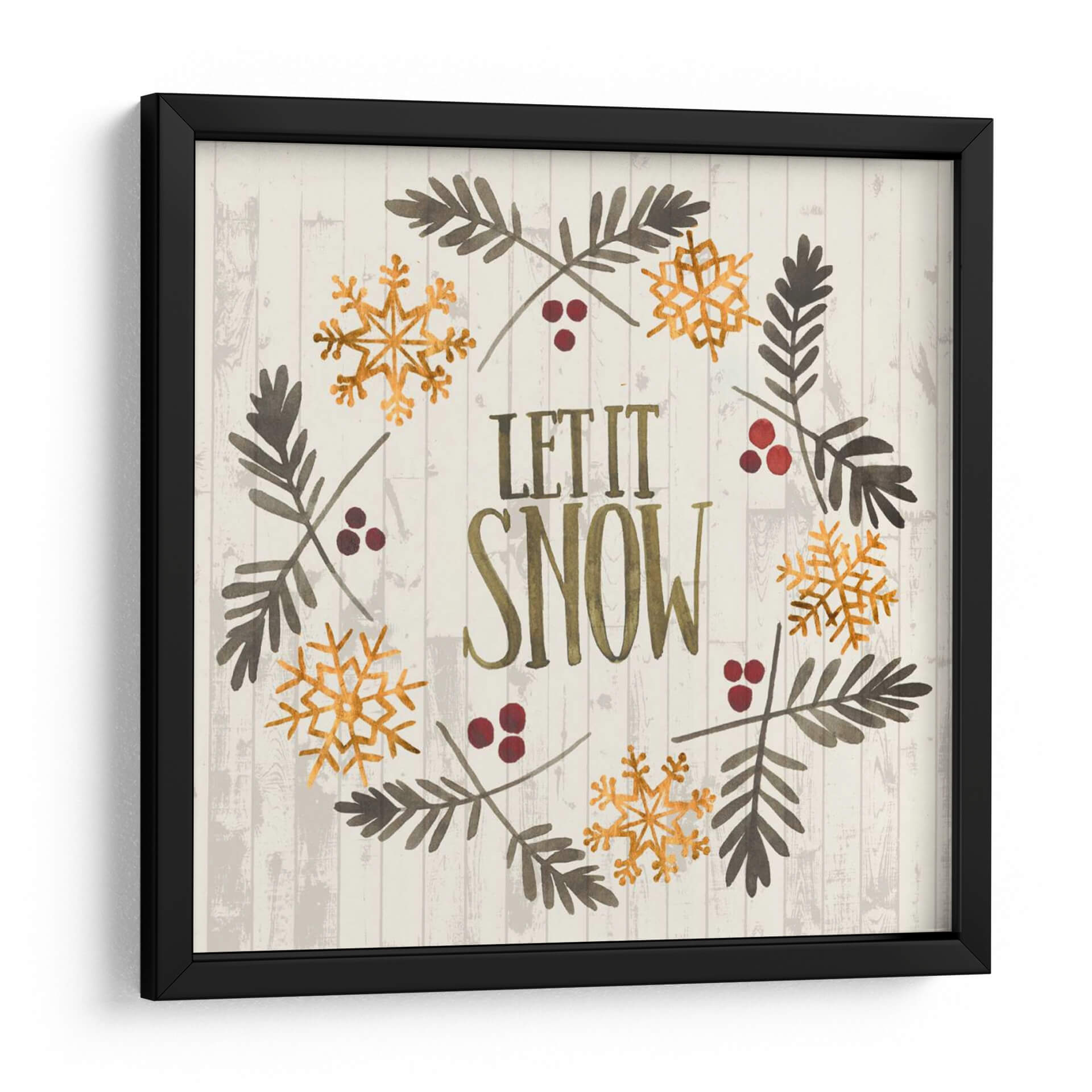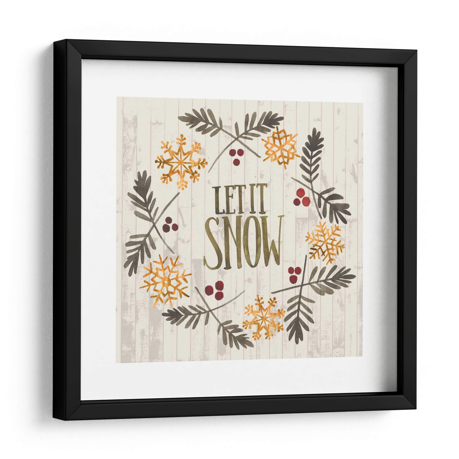 Añade un toque de encanto invernal a tu hogar con este cautivador cuadro decorativo "Navidad Rústica Vi" de Grace Popp. La obra presenta una composición circular que evoca un diseño de corona festiva, adornada con delicados copos de nieve dorados y ramas de pino en tonos tierra. Las bayas rojas añaden un sutil contraste, mientras que el texto "LET IT SNOW" en letras vintage y doradas ancla la pieza con un mensaje acogedor. El fondo texturizado de tablones de madera clara en grisáceo aporta una estética rústica y serena, perfecta para crear un ambiente cálido y festivo. Ideal para quienes buscan arte de pared que celebre la temporada navideña con elegancia y simplicidad. Este cuadro es una elección fantástica para la sala de estar, el comedor o incluso un porche cubierto, infundiendo un espíritu de alegría invernal y tranquilidad en cualquier espacio. La acuarela y el estilo gráfico de Grace Popp se combinan para crear una pieza que es a la vez moderna y atemporal, capturando la magia de la Navidad.