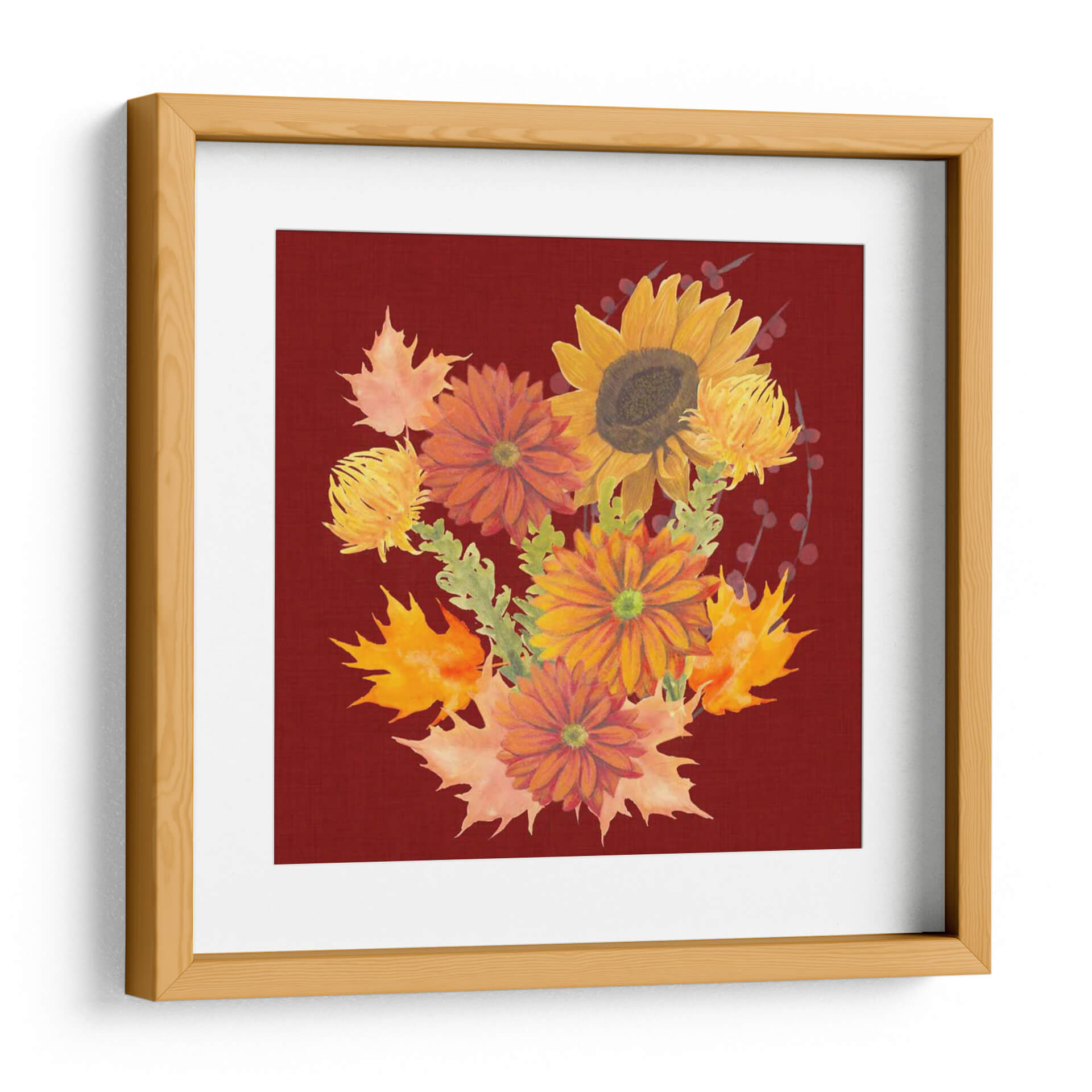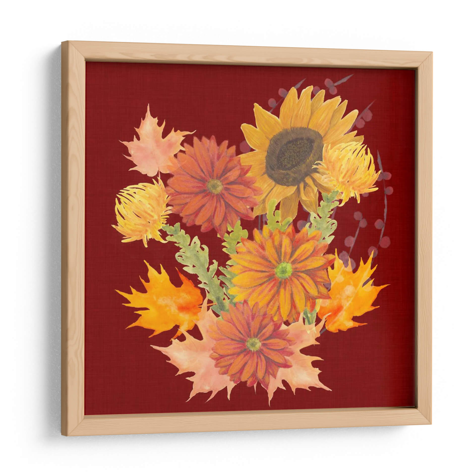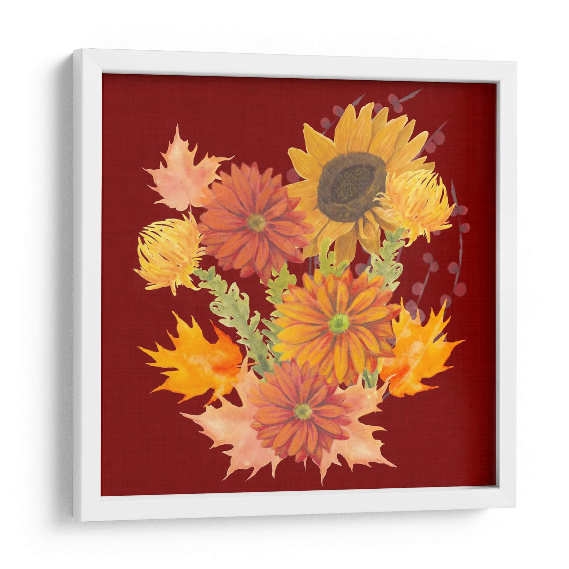 Celebra la calidez y la belleza del otoño con "Otoño Floral II", una obra de arte vibrante del artista Grace Popp. Este cuadro decorativo captura la esencia de la temporada con un exuberante ramo de flores en tonos dorados, naranjas y rojizos, complementado por la delicada presencia de hojas de arce que evocan el crujido bajo tus pies. La composición, centrada en un girasol majestuoso y rodeada de crisantemos y otras flores de temporada, irradia una energía positiva y acogedora. El fondo de color burdeos profundo proporciona un contraste rico y sofisticado, realzando los colores cálidos de las flores y creando un punto focal cautivador para cualquier habitación. Esta pieza es ideal para añadir un toque de naturaleza y calidez a tu sala de estar, comedor o incluso a un espacio de oficina que necesite un respiro de color. El estilo pictórico, con pinceladas que sugieren movimiento y vida, aporta una dimensión artística única a la decoración de tu hogar. "Otoño Floral II" no es solo un cuadro, es una invitación a disfrutar de la belleza efímera de la estación, trayendo consigo una sensación de confort y alegría durante todo el año. Un toque perfecto para quienes buscan arte contemporáneo que celebre la naturaleza y el ciclo de las estaciones con elegancia y vitalidad.