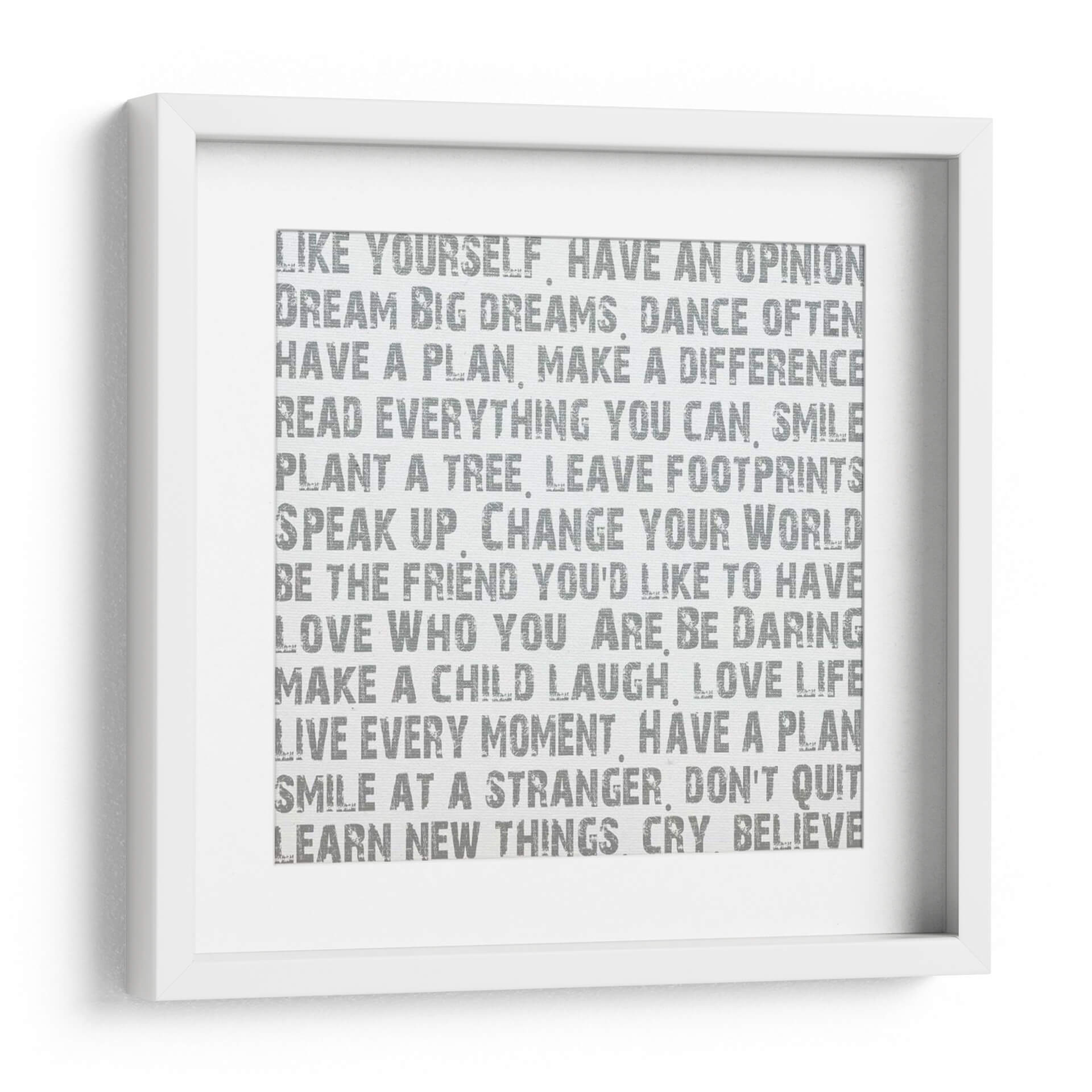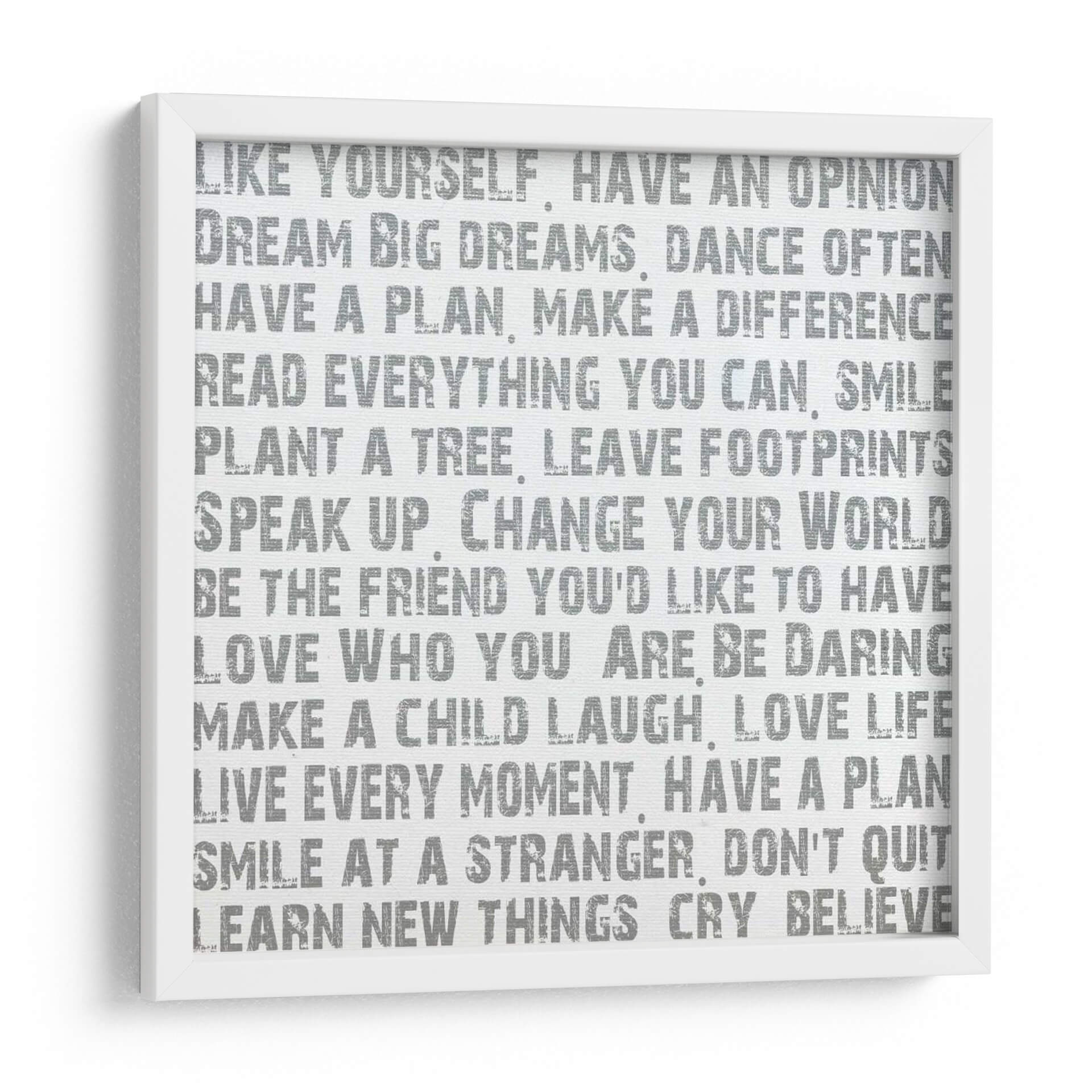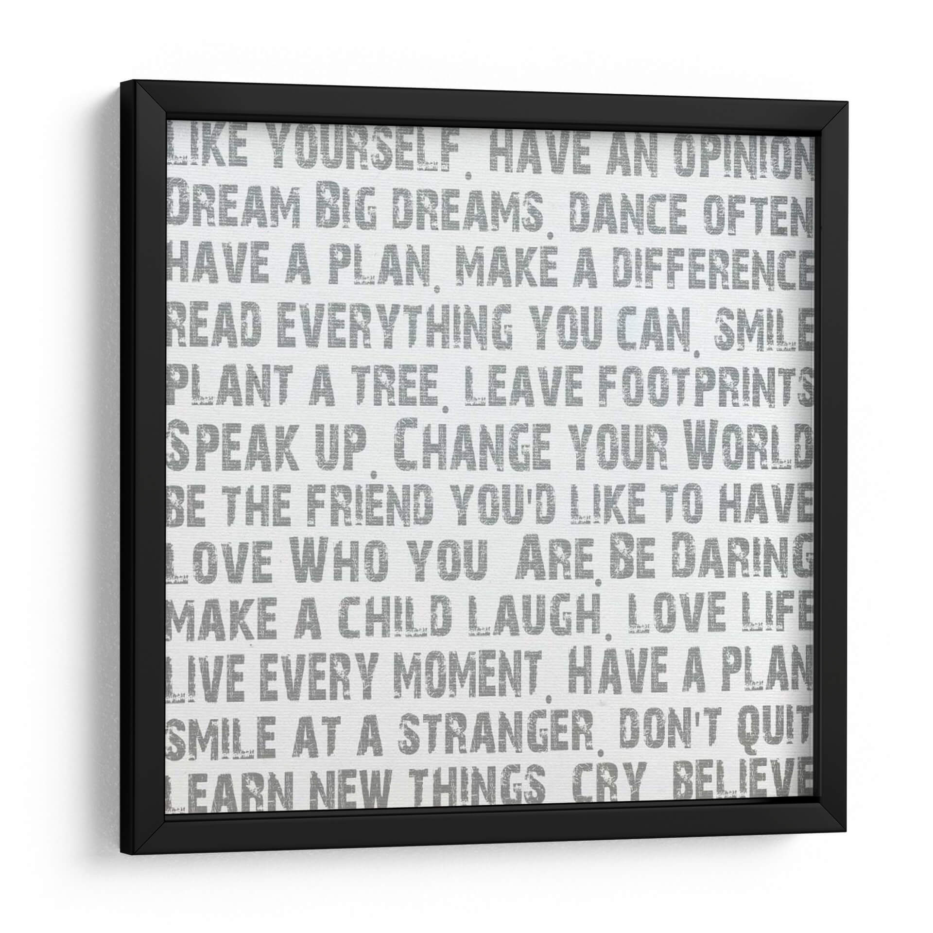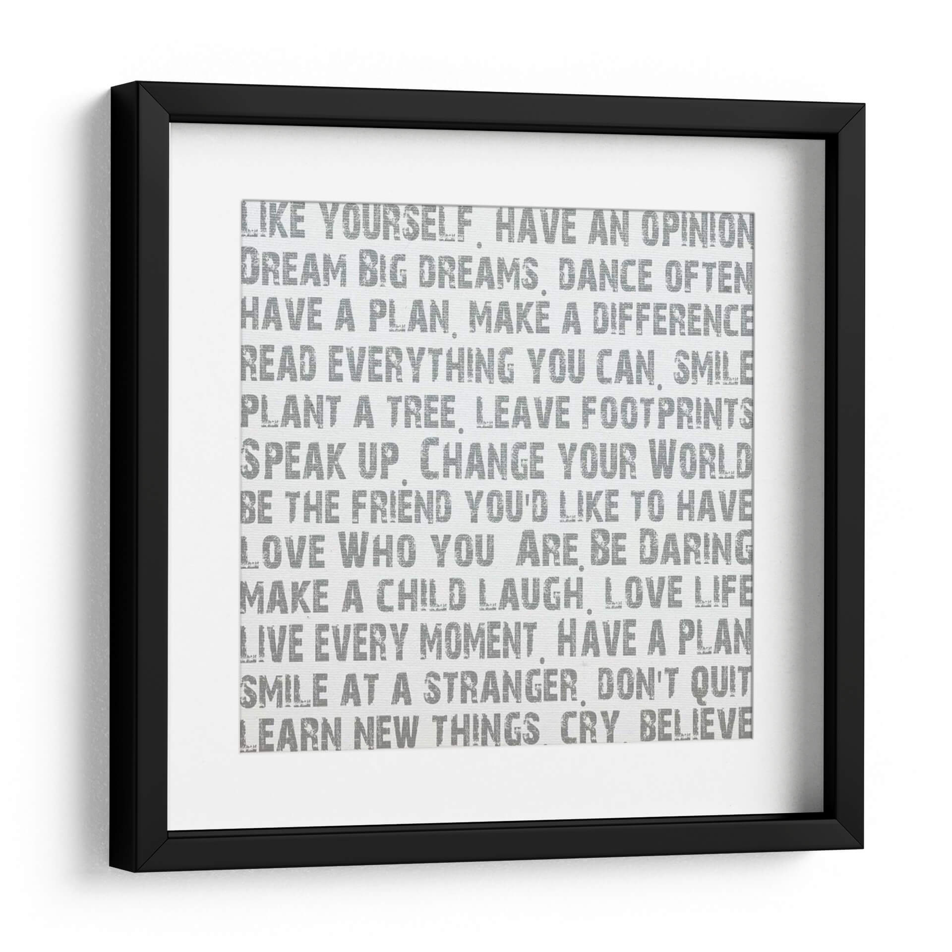 Inspira tu vida diaria con "Palabras", una obra de arte textual del artista Andrea James. Este cuadro decorativo presenta una composición tipográfica cautivadora sobre un fondo blanco, con frases motivacionales escritas en un elegante gris desgastado. Cada línea es un recordatorio de vivir plenamente: "Sueña grandes sueños", "Sonríe a un extraño", "Cambia tu mundo". La paleta de colores neutra y el estilo minimalista lo convierten en una adición versátil para cualquier espacio, desde una oficina en casa hasta una sala de estar contemporánea. Su diseño limpio y poderoso evoca un sentimiento de optimismo y propósito, sirviendo como un recordatorio constante de las verdades universales de la vida. "Palabras" no es solo una pieza de arte, es una declaración de intenciones, una fuente de inspiración diaria que resonará contigo y tus invitados. Perfecto para aquellos que buscan un toque de significado y estilo en su decoración, esta obra de Andrea James transformará tu pared en un lienzo de positividad y reflexión.