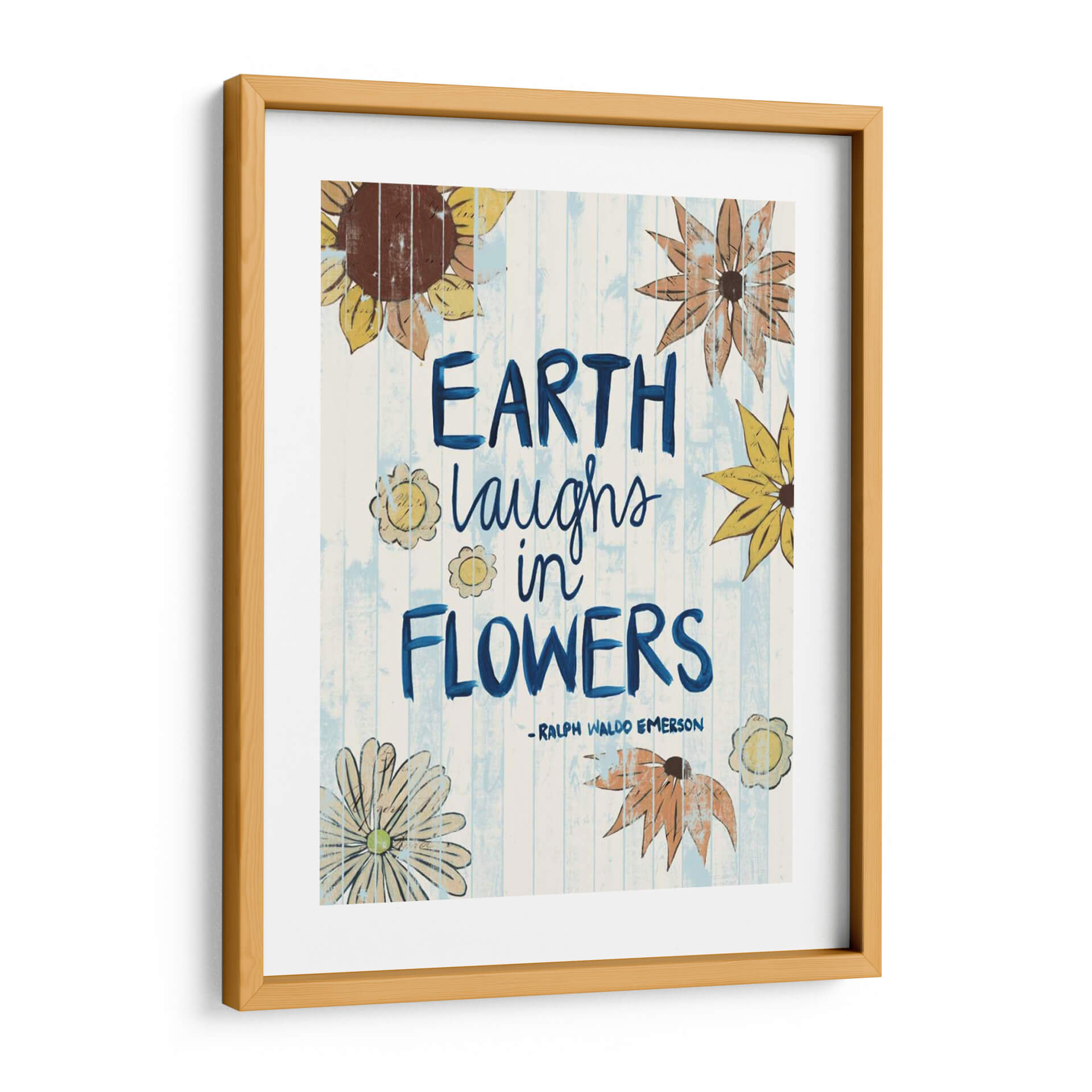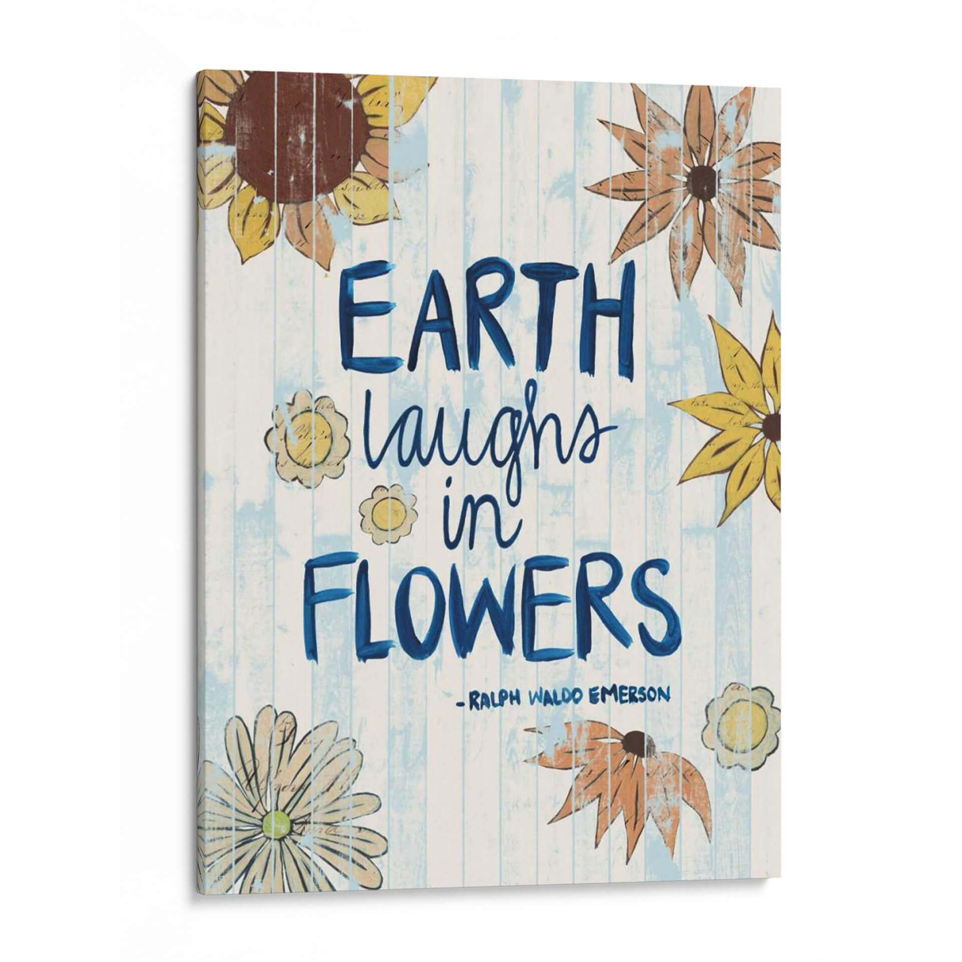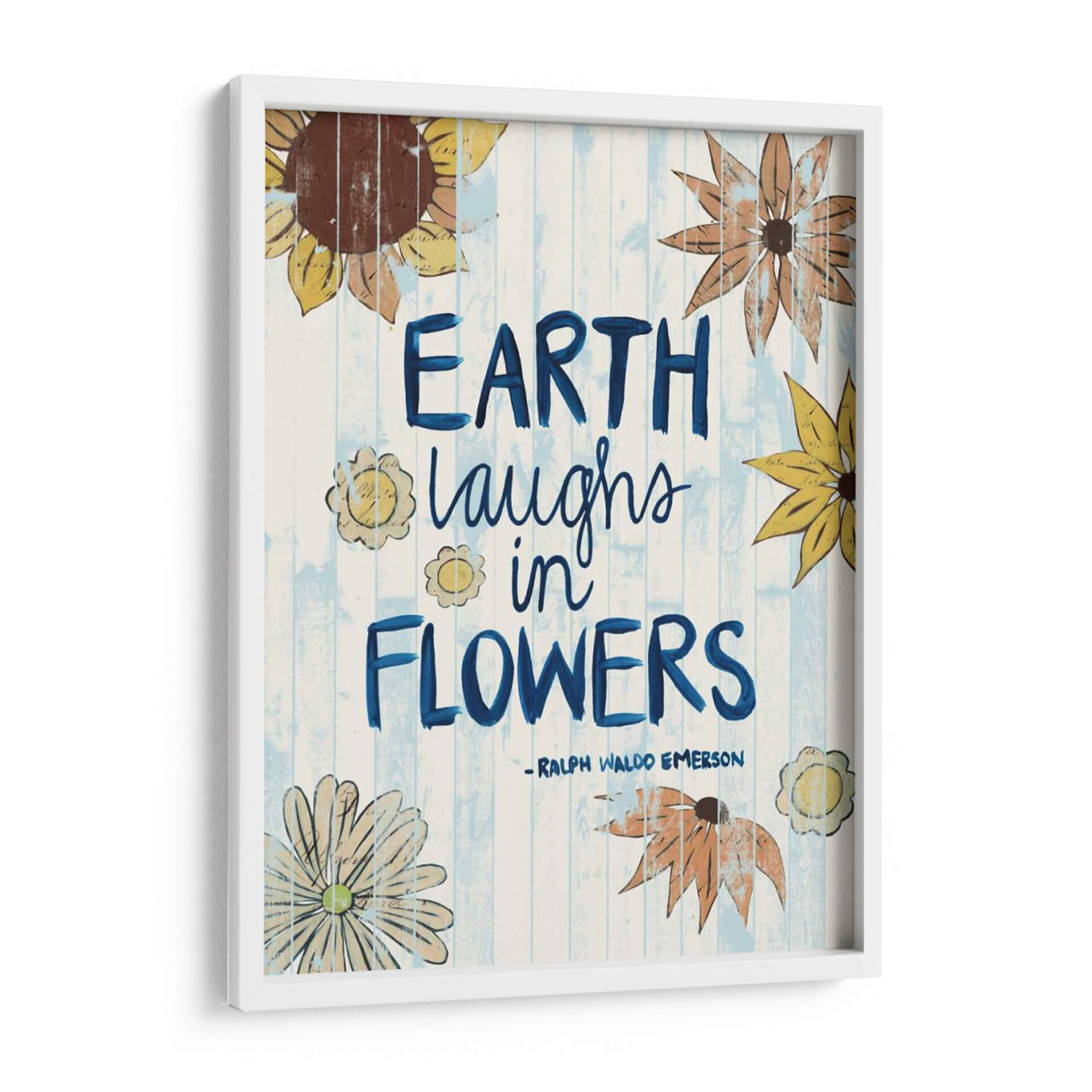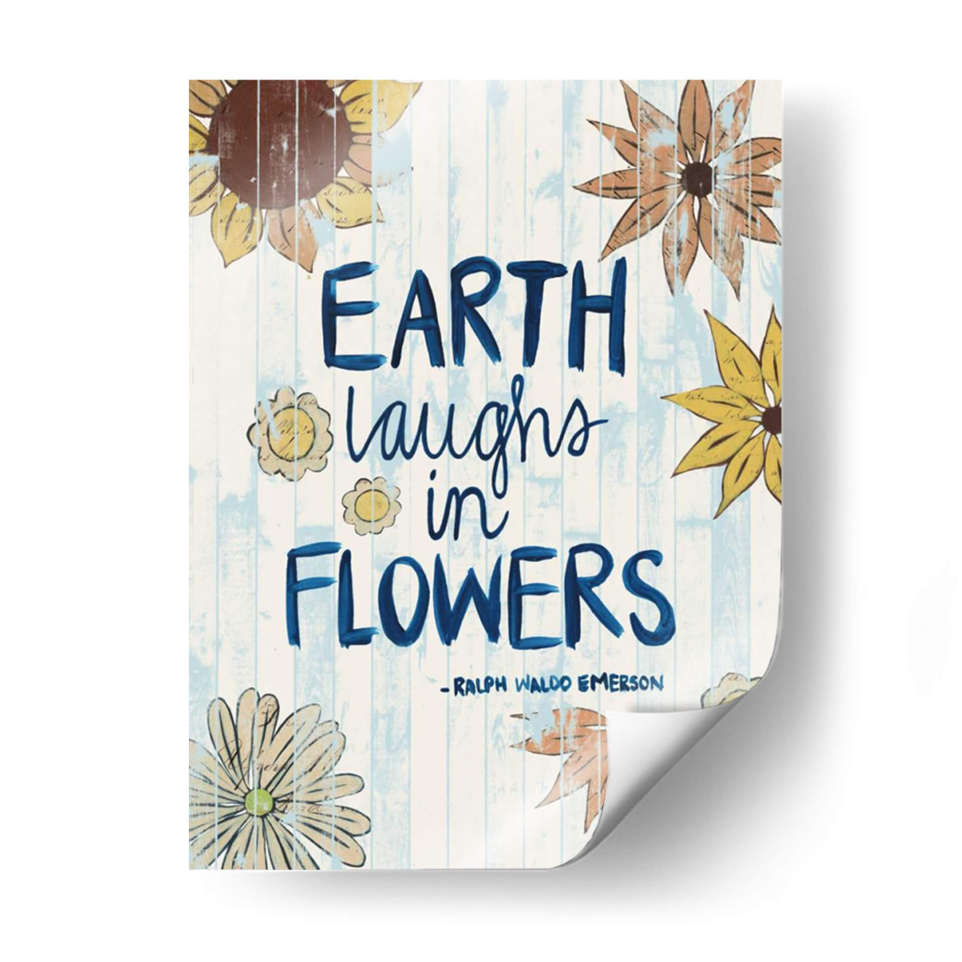 Inyecta una dosis de alegría y optimismo a tu hogar con "Palabras De Día Soleado III", una obra de arte que celebra la belleza efímera de la naturaleza. Este cuadro decorativo, creado por la talentosa Grace Popp, presenta una composición vibrante y llena de vida, donde la frase "Earth laughs in flowers" se entrelaza con delicadas ilustraciones botánicas. Los girasoles y otras flores estilizadas, en tonos cálidos y terrosos, contrastan maravillosamente con el fondo de tablones de madera pintados en un suave azul y blanco, evocando una sensación de frescura y luminosidad. El estilo desenfadado y ligeramente rústico de la obra, con sus pinceladas visibles y textura sutil, aporta un toque de autenticidad y calidez a cualquier espacio. Ideal para salones, cocinas o incluso estudios, este cuadro inspirará conversaciones y sonrisas, recordándote la sencilla magia que florece a nuestro alrededor. Añade un toque de color y positividad que transformará tu ambiente y reflejará tu amor por la vida y la naturaleza.