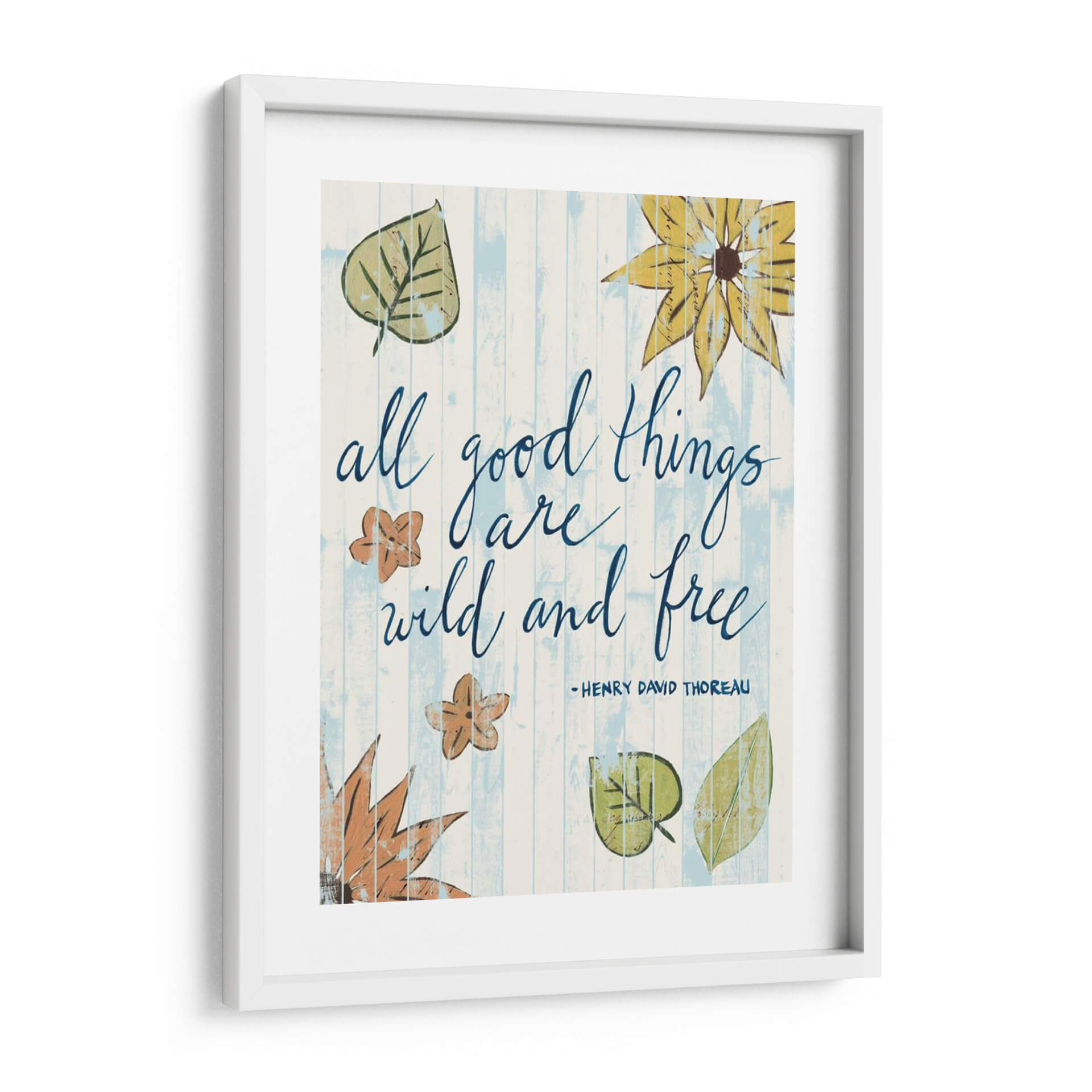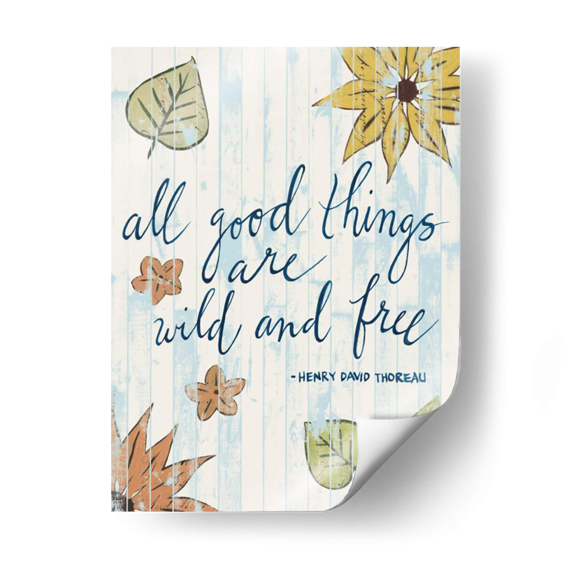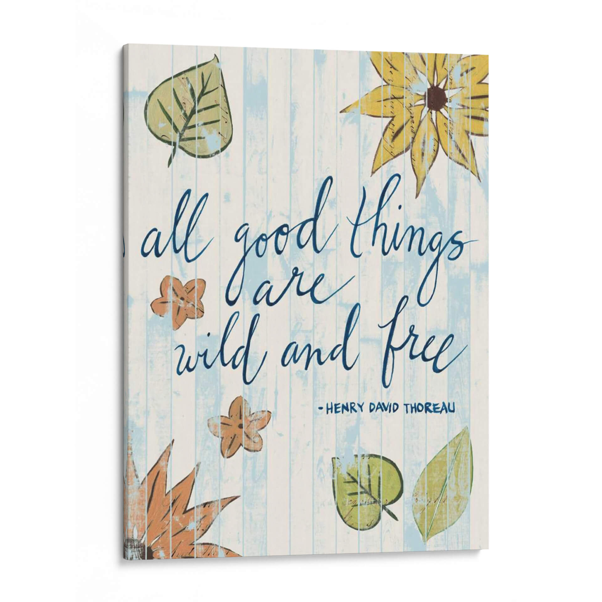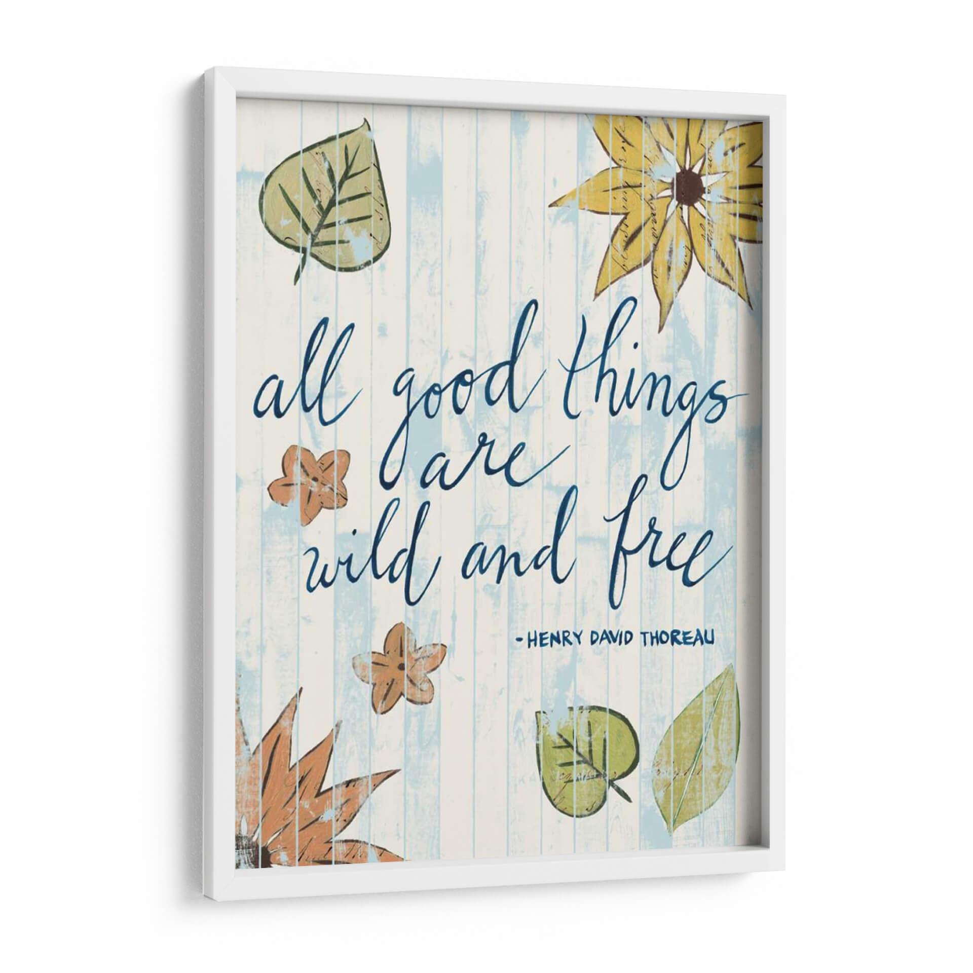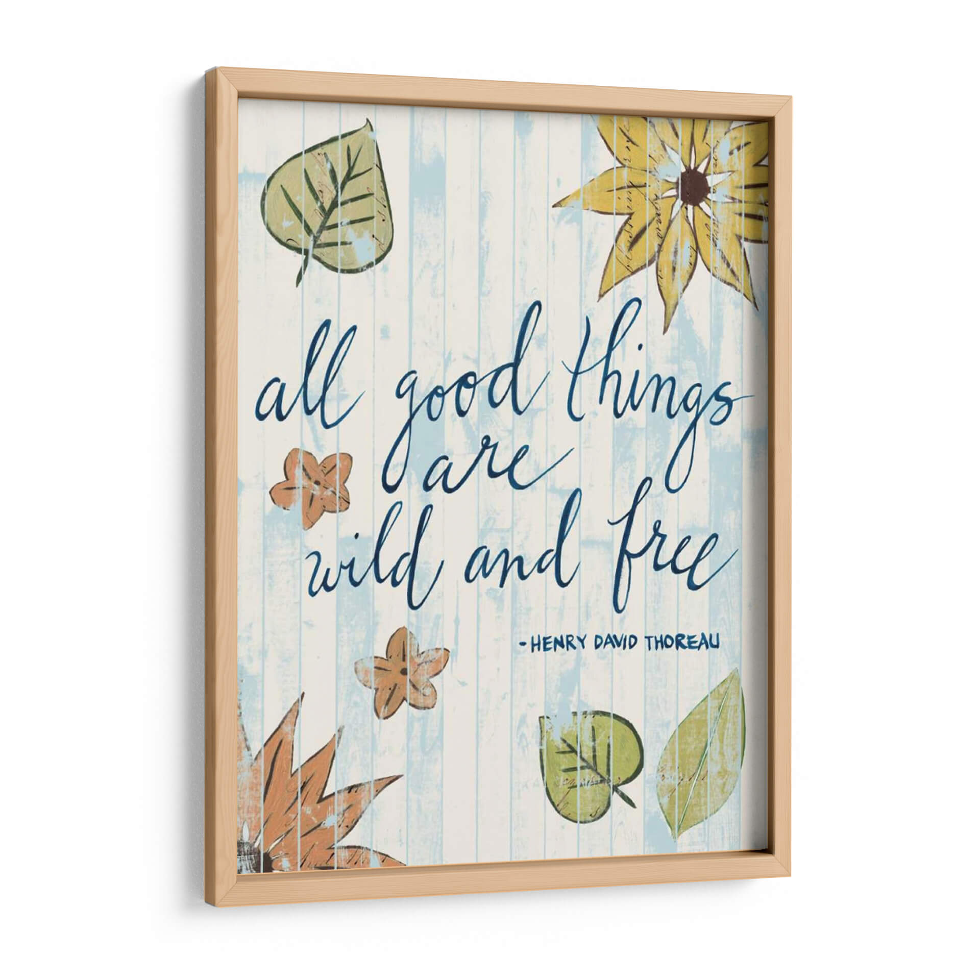 Inyecta una dosis de inspiración y serenidad a tu hogar con "Palabras Soleadas Del Día Iv", una cautivadora obra de arte de Grace Popp. Este cuadro decorativo presenta una composición encantadora sobre un fondo de tablones de madera verticales en tonos azul claro y blanco, evocando una sensación de calma y frescura. Destacan elementos botánicos pintados a mano con un estilo rústico y encantador: hojas en tonos verdes y ocres, y flores sencillas en naranja y amarillo, que parecen danzar alrededor de la cita célebre "all good things are wild and free" (todas las cosas buenas son salvajes y libres), atribuida a Henry David Thoreau. La tipografía en azul profundo, de estilo caligráfico fluido, añade un toque artístico y personal a la pieza. "Palabras Soleadas Del Día Iv" es más que una simple decoración de pared; es un recordatorio visual de la libertad, la naturaleza y la belleza de las cosas simples. Ideal para quienes buscan infundir optimismo y un espíritu bohemio en sus espacios, ya sea en la sala de estar, el dormitorio o una oficina acogedora. Añade este inspirador cuadro decorativo a tu colección y transforma tu ambiente en un refugio de paz y libertad creativa.