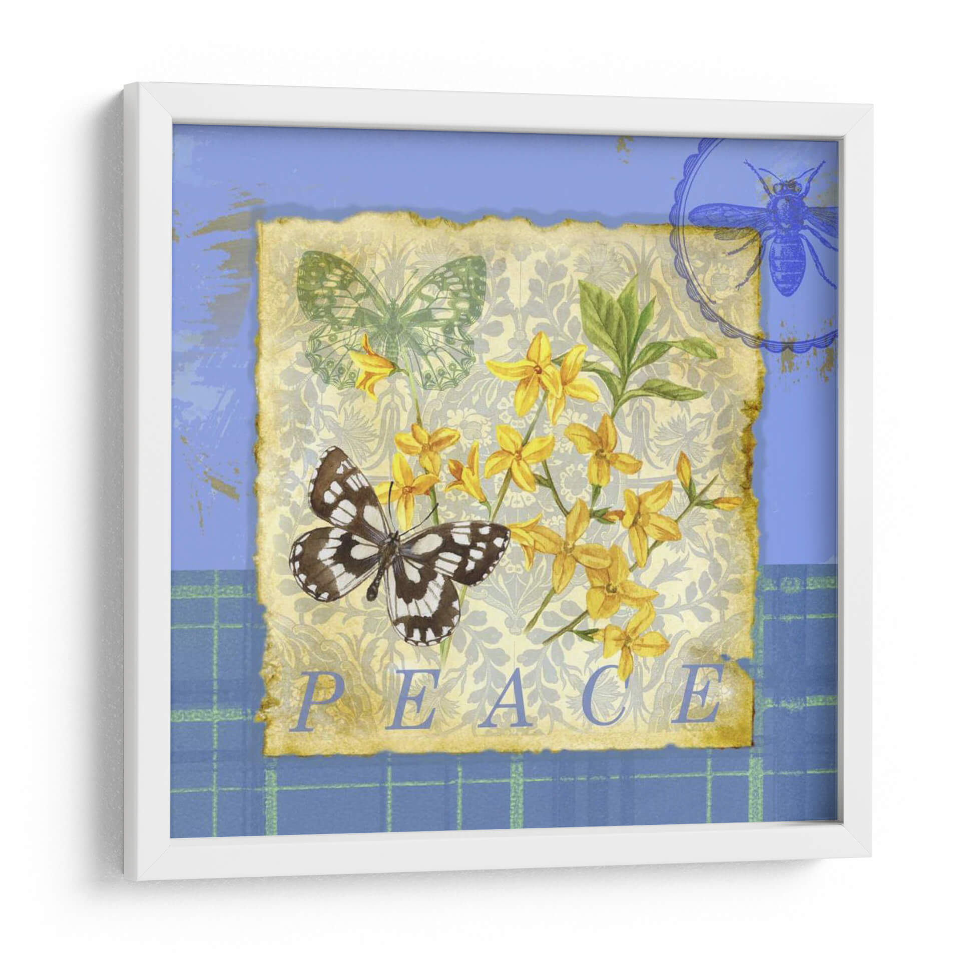 Sumérgete en la serenidad de "Papillon Plaid Iv", una obra de arte que captura la delicada belleza de la naturaleza con un toque encantador. Este cuadro decorativo presenta dos mariposas, una con un patrón intrincado en blanco y negro y otra etérea en tonos verdes, posadas graciosamente sobre un vibrante ramo de flores amarillas. El fondo, adornado con un sutil damasco en tonos crema y dorado, evoca una sensación de elegancia atemporal, mientras que el marco exterior en azul con un patrón de cuadros sutil añade un toque rústico y acogedor. La palabra "PEACE" aparece discretamente, invitando a la calma y la reflexión. Los colores predominantes, un azul sereno y el cálido amarillo de las flores, crean una atmósfera de tranquilidad y alegría. Esta pieza es ideal para quienes buscan infundir paz y un toque de encanto natural en su hogar u oficina, siendo perfecta para salones, dormitorios o espacios de meditación. Añade un aire de sofisticación orgánica a tu decoración con este cautivador cuadro.