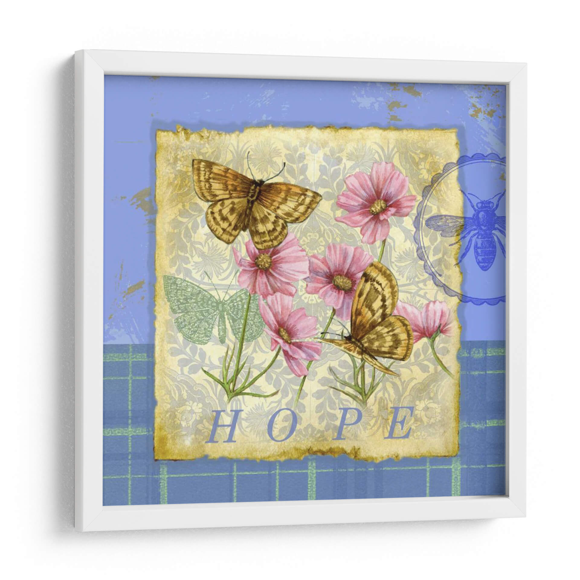 Celebra la belleza efímera de la naturaleza con 'Papillon Plain Iii', una obra de arte que irradia serenidad y optimismo. Este cautivador cuadro decorativo presenta una delicada composición de mariposas revoloteando entre vibrantes flores rosas, evocando un jardín en plena floración. La paleta de colores, dominada por suaves tonos azules y toques cálidos de dorado y rosa, crea una atmósfera de tranquilidad y dulzura. Los detalles intrincados, como el patrón damasco de fondo y el sutil relieve que simula un sello de abeja, añaden una capa de sofisticación y encanto vintage. La palabra 'HOPE' sutilmente integrada en la parte inferior, refuerza el mensaje positivo y esperanzador de la pieza. Ideal para añadir un toque de calma y elegancia a tu dormitorio, salón o cualquier espacio que necesite un respiro de paz visual. Este cuadro decorativo es perfecto para quienes buscan arte que inspire y embellezca su hogar con un sentimiento de delicadeza y renovación. Deja que las mariposas y las flores de 'Papillon Plain Iii' pinten tu mundo de esperanza y serenidad.