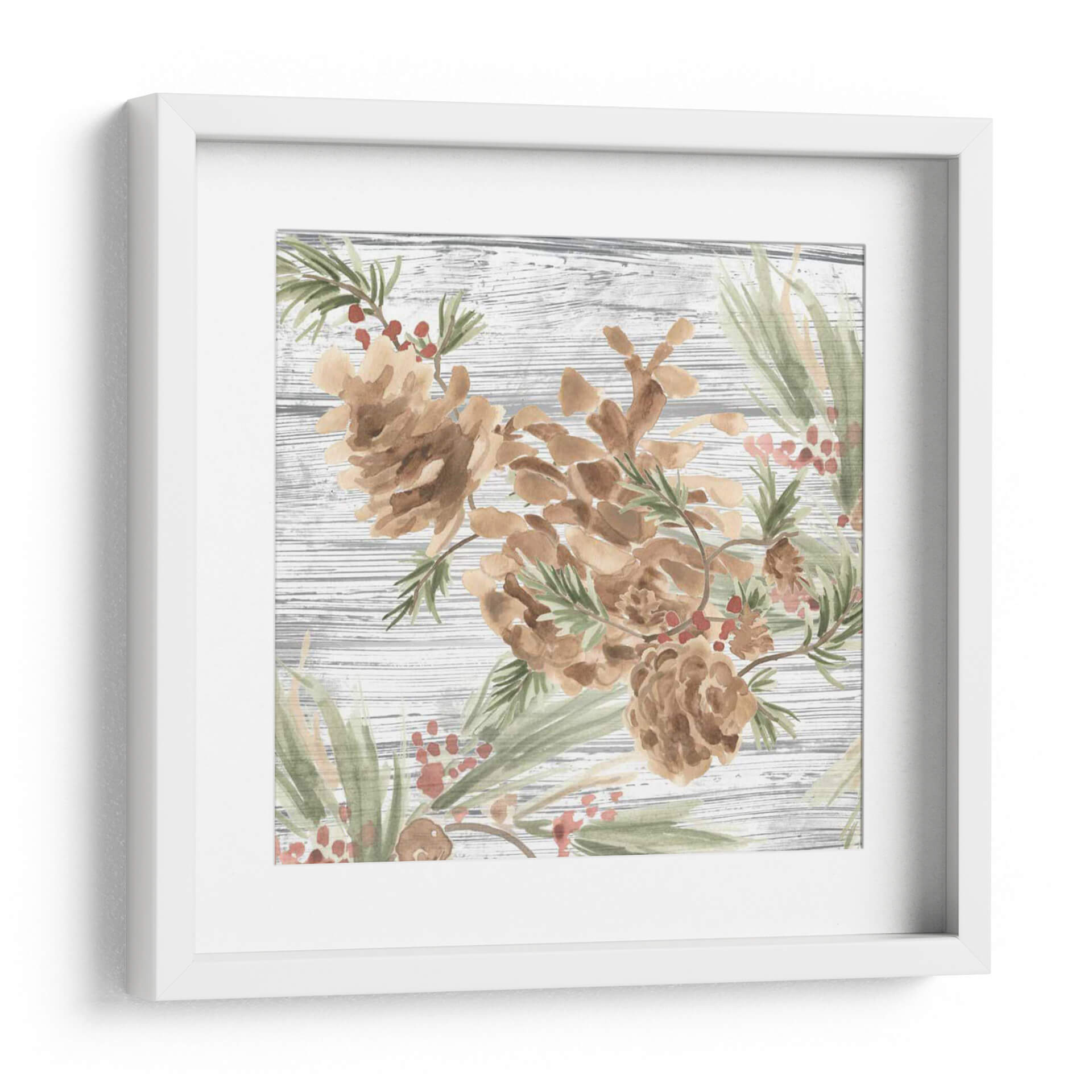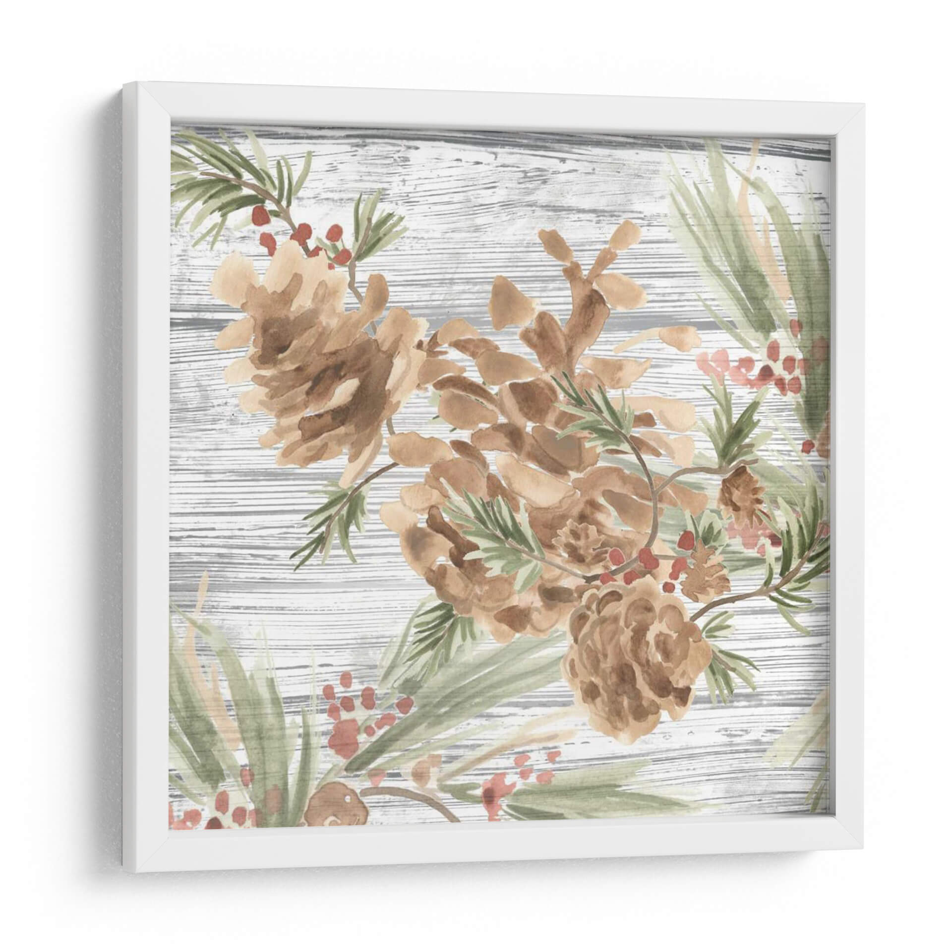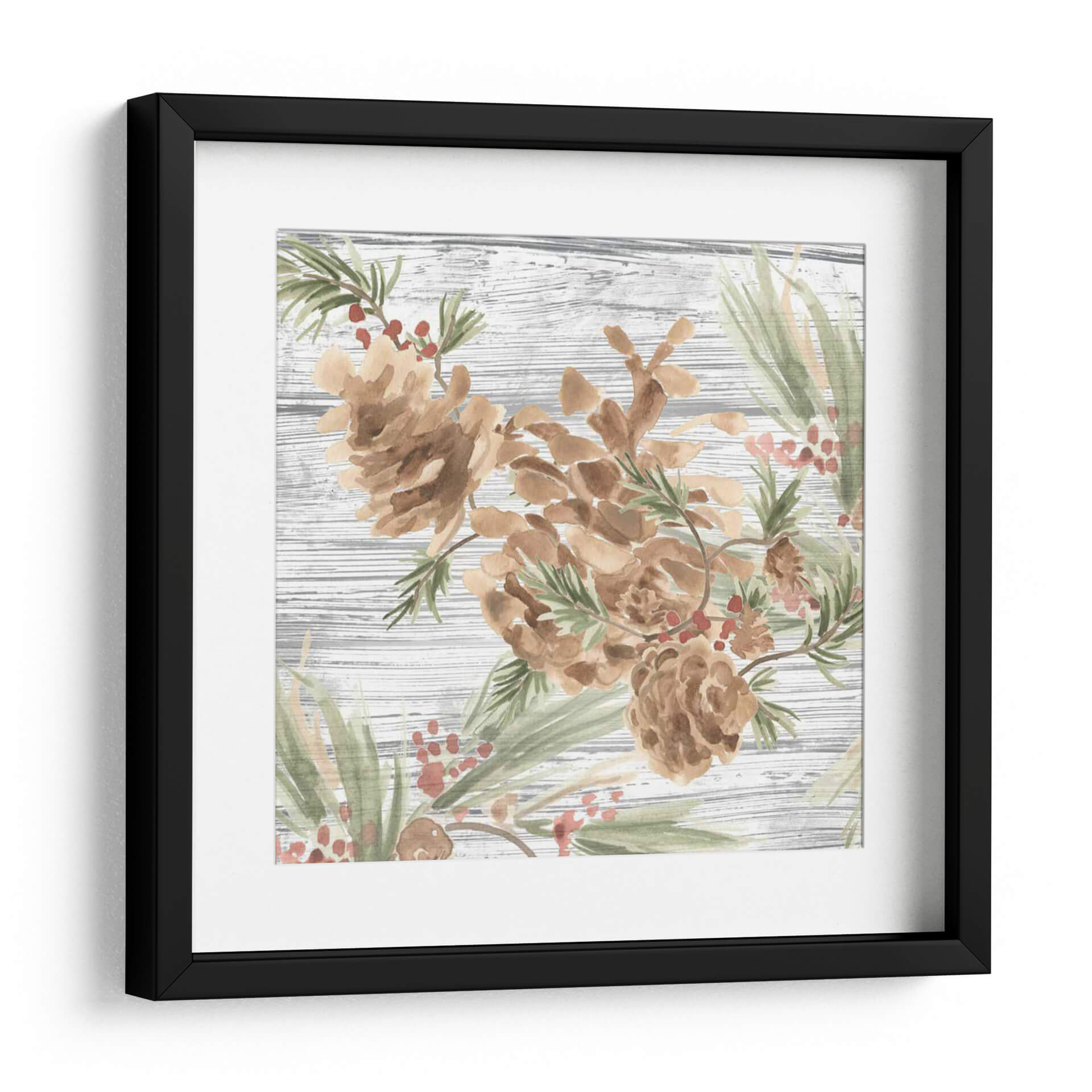 Sumérgete en la serenidad de la naturaleza con este encantador cuadro decorativo que presenta piñas y bayas rojas sobre un fondo rústico de madera texturizada. La técnica de acuarela, suave y etérea, captura la delicadeza de estos elementos otoñales y invernales, creando una atmósfera de tranquilidad y calidez hogareña. Los tonos tierra de las piñas se complementan a la perfección con el verde suave de las agujas de pino y los sutiles toques rosados de las bayas, formando una paleta de colores armoniosa y relajante. Ideal para espacios que buscan un toque orgánico y natural, este cuadro es perfecto para salones acogedores, dormitorios serenos o incluso un estudio que necesite un respiro visual. Su estilo, que evoca la acuarela tradicional con un toque moderno, lo convierte en una pieza versátil que puede integrarse en decoraciones rústicas, campestres o contemporáneas, aportando siempre una sensación de paz y conexión con el exterior. Añade esta obra de arte a tu hogar y transforma cualquier rincón en un refugio de serenidad.