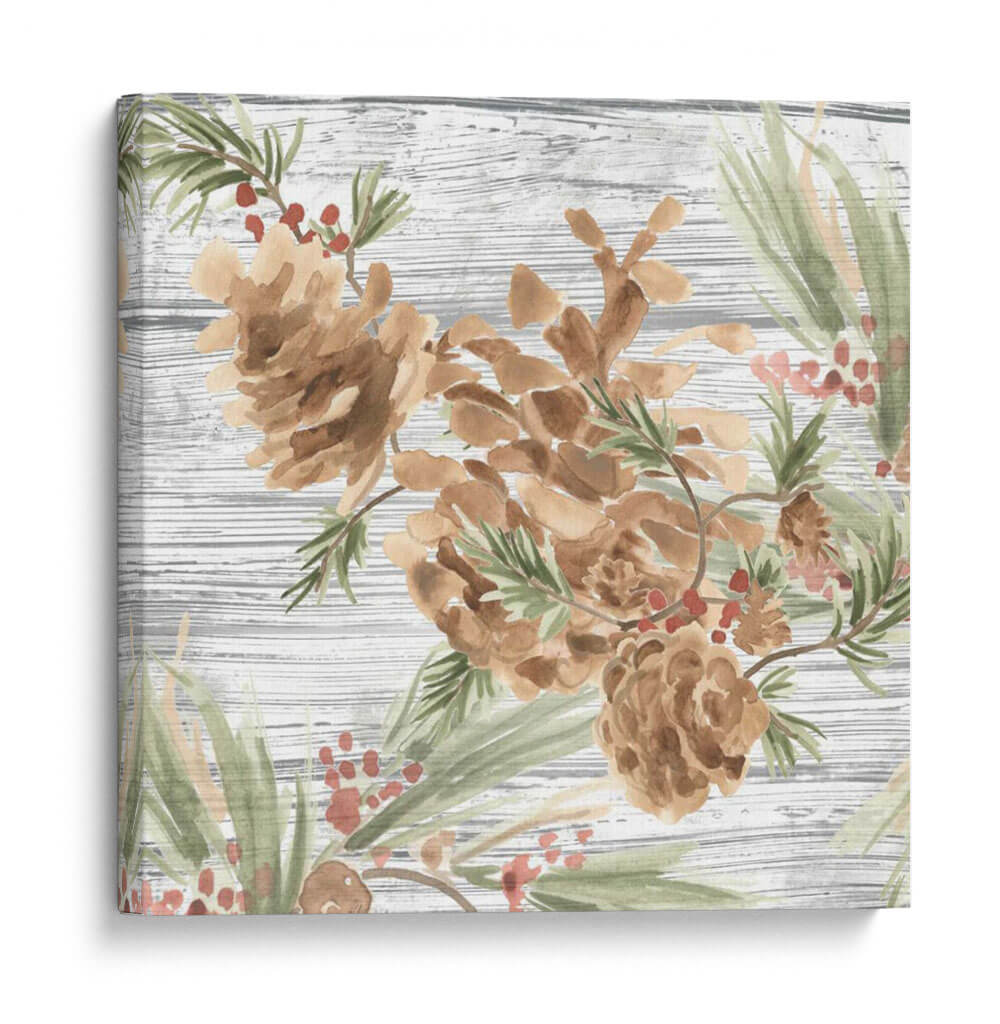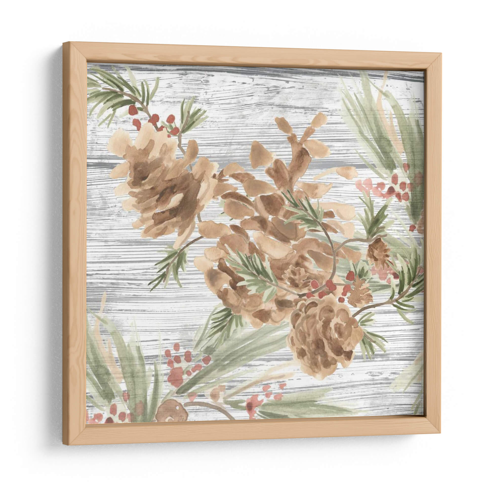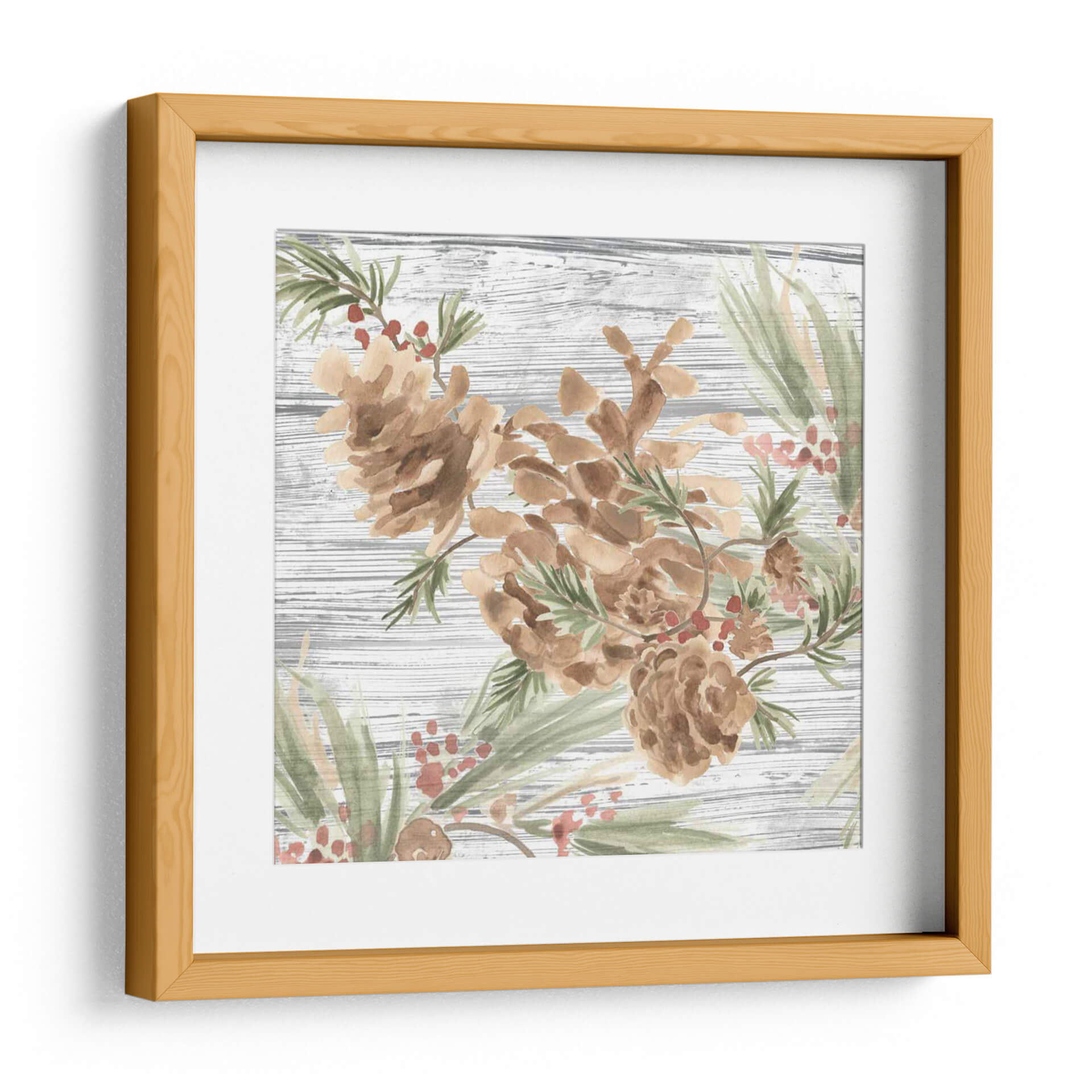 Sumérgete en la serenidad de la naturaleza con este encantador cuadro decorativo que presenta piñas y bayas rojas sobre un fondo rústico de madera texturizada. La técnica de acuarela, suave y etérea, captura la delicadeza de estos elementos otoñales y invernales, creando una atmósfera de tranquilidad y calidez hogareña. Los tonos tierra de las piñas se complementan a la perfección con el verde suave de las agujas de pino y los sutiles toques rosados de las bayas, formando una paleta de colores armoniosa y relajante. Ideal para espacios que buscan un toque orgánico y natural, este cuadro es perfecto para salones acogedores, dormitorios serenos o incluso un estudio que necesite un respiro visual. Su estilo, que evoca la acuarela tradicional con un toque moderno, lo convierte en una pieza versátil que puede integrarse en decoraciones rústicas, campestres o contemporáneas, aportando siempre una sensación de paz y conexión con el exterior. Añade esta obra de arte a tu hogar y transforma cualquier rincón en un refugio de serenidad.