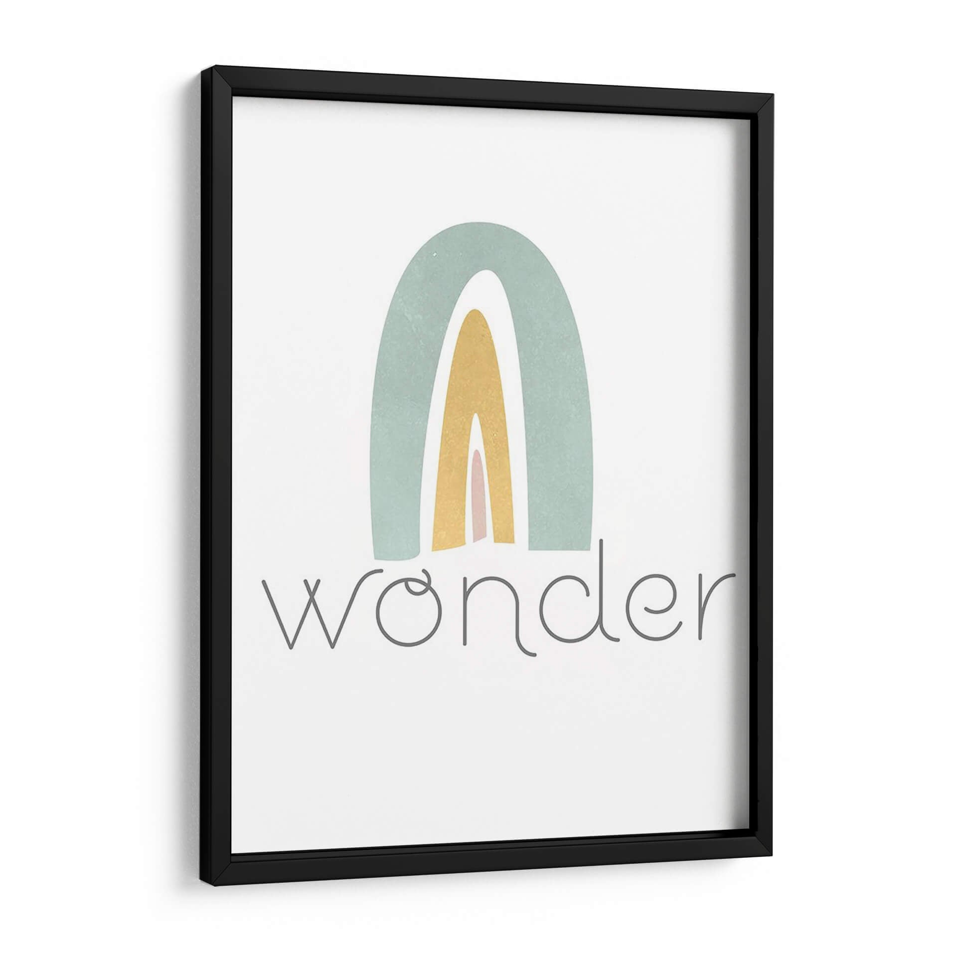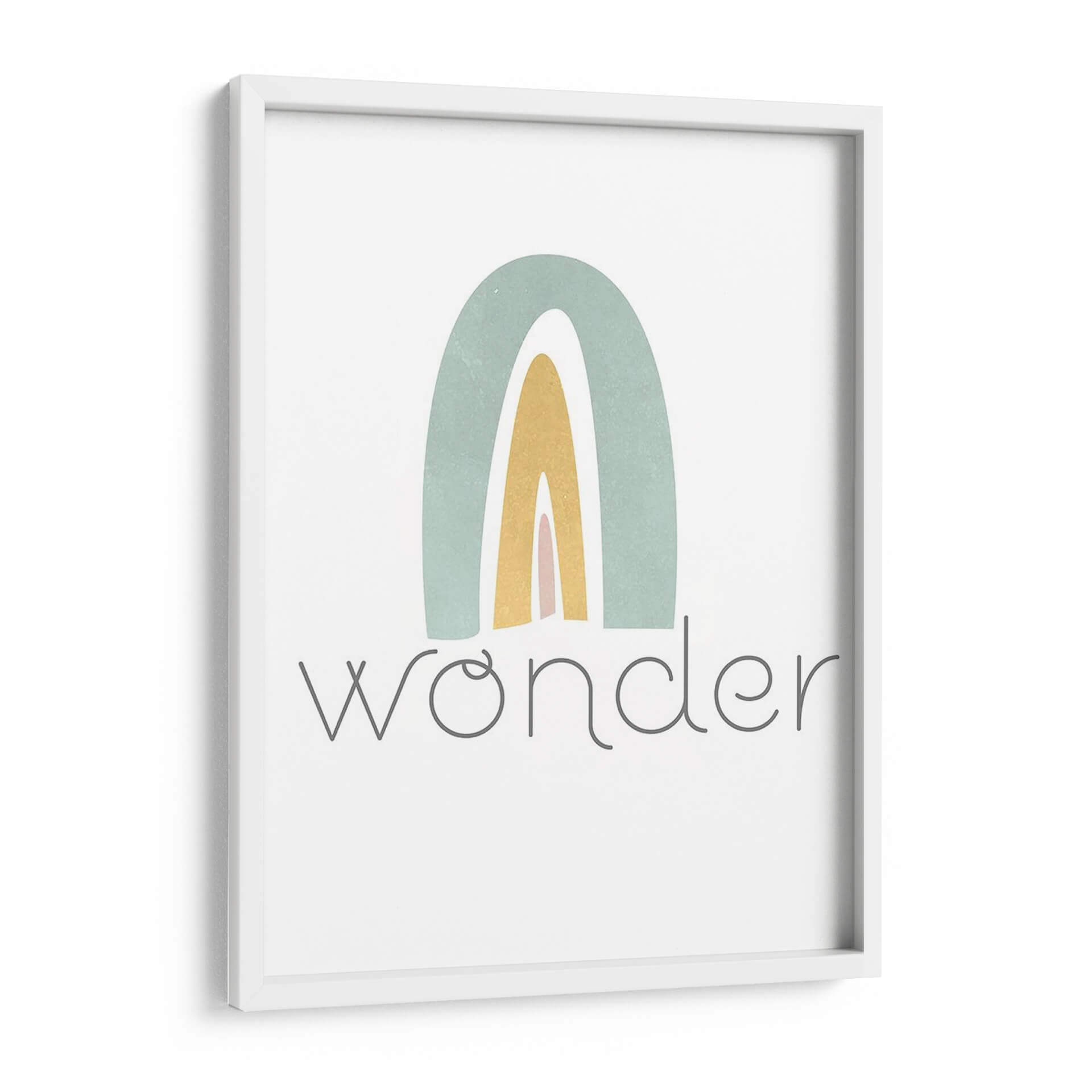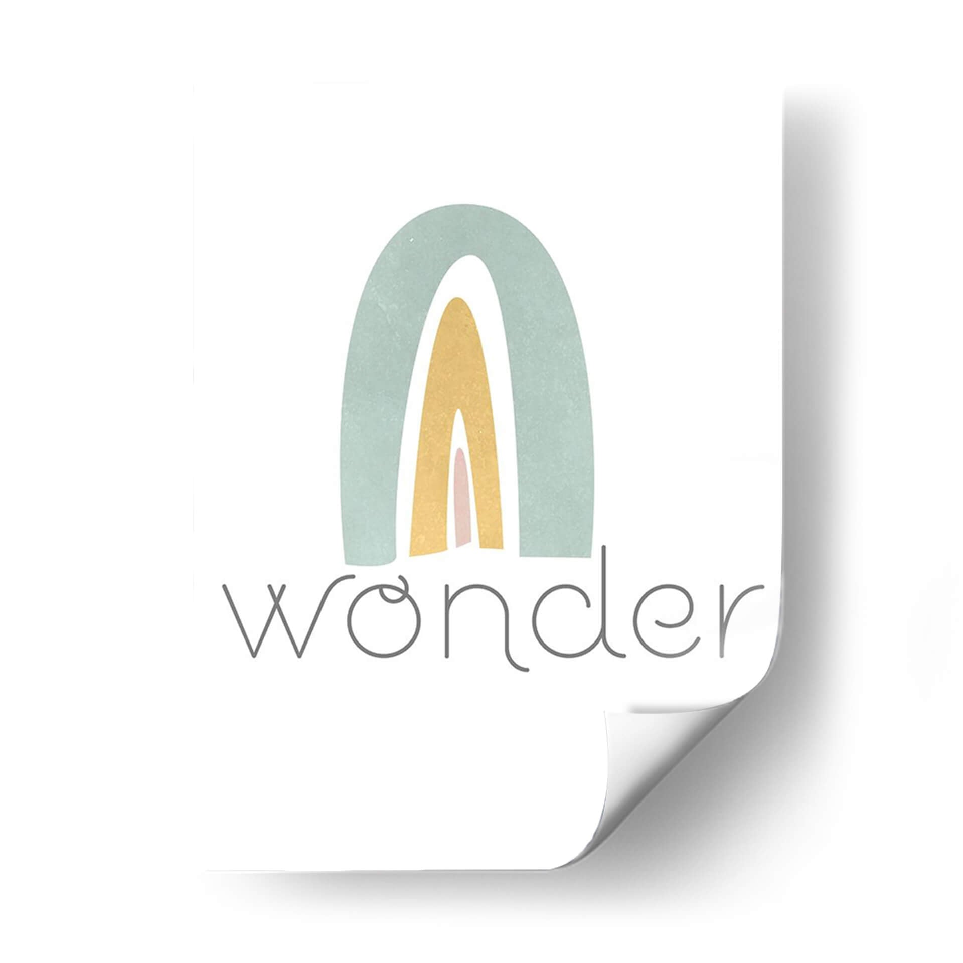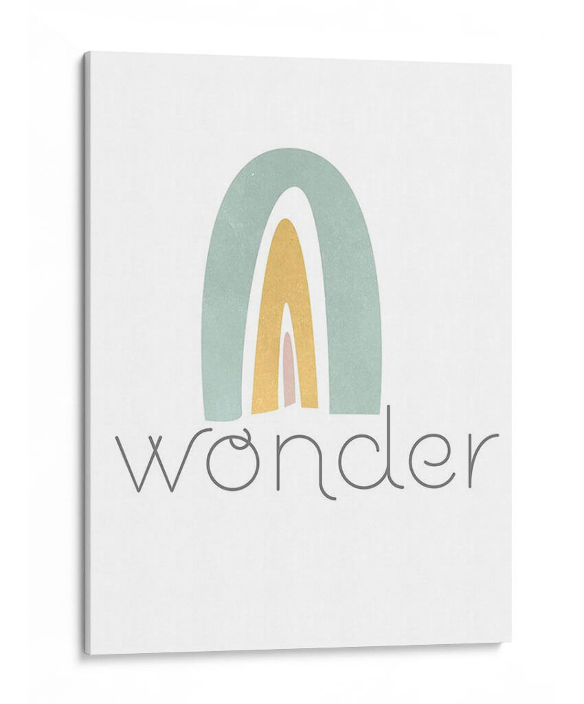 Este encantador cuadro decorativo, titulado "Rainbow Play III" de Jarman Fagalde, evoca una sensación de alegría y asombro infantil a través de su sencilla pero cautivadora representación de un arcoíris. La obra presenta arcos suaves en tonos pastel de verde azulado, amarillo dorado y rosa pálido, superpuestos sobre un fondo blanco nítido. El estilo es claramente abstracto y minimalista, con líneas limpias y una paleta de colores delicada que transmite calma y optimismo. Debajo del arcoíris, la palabra "wonder" (asombro) aparece escrita en una tipografía gris sutil y elegante, reforzando el tema de la curiosidad y la maravilla. Esta pieza es ideal para añadir un toque de dulzura y positividad a cualquier espacio, especialmente en habitaciones infantiles, guarderías o cualquier rincón del hogar que busque una atmósfera serena y esperanzadora. Su diseño contemporáneo y su mensaje inspirador la convierten en una adición perfecta para aquellos que buscan arte que celebre la inocencia y la belleza de las cosas simples.