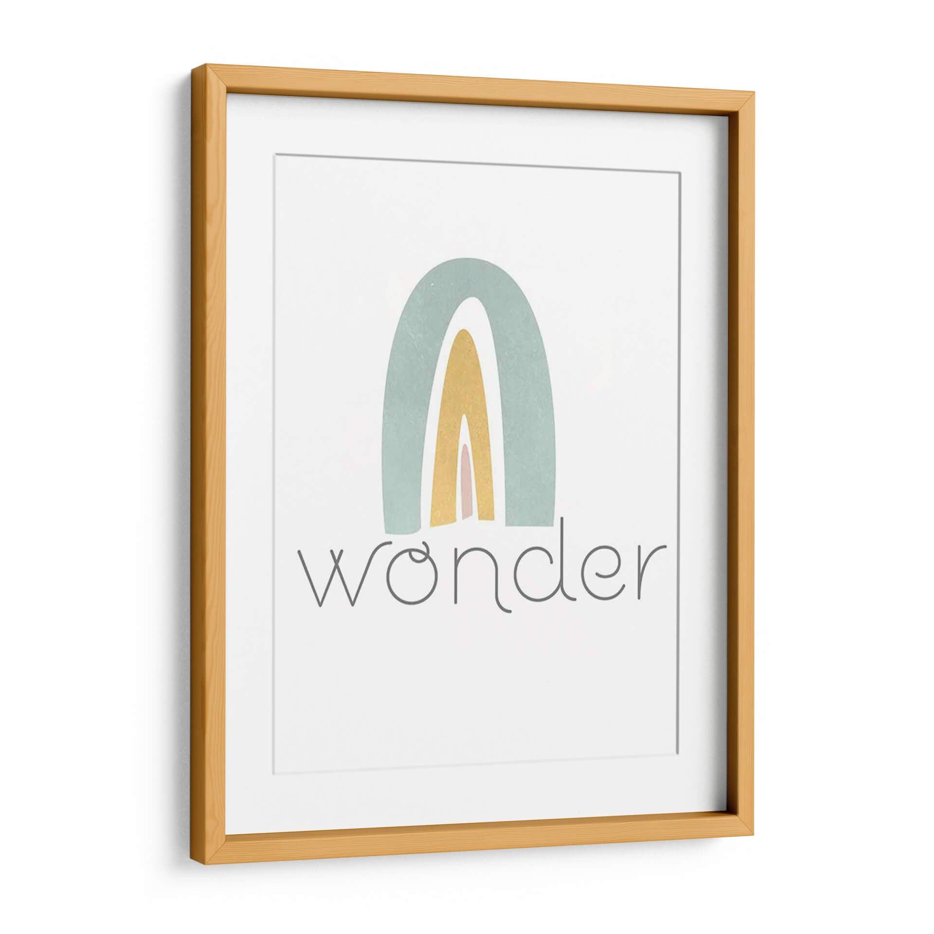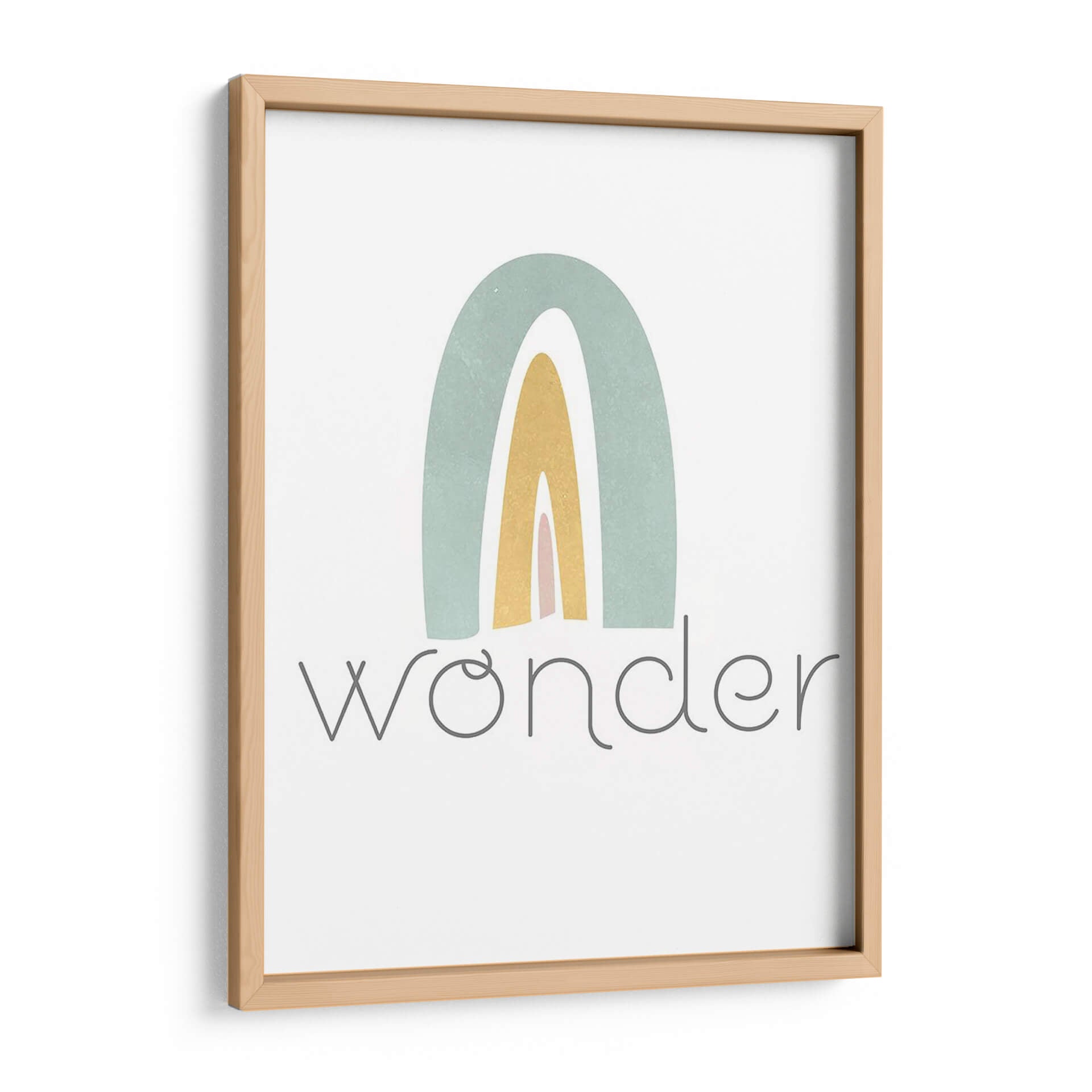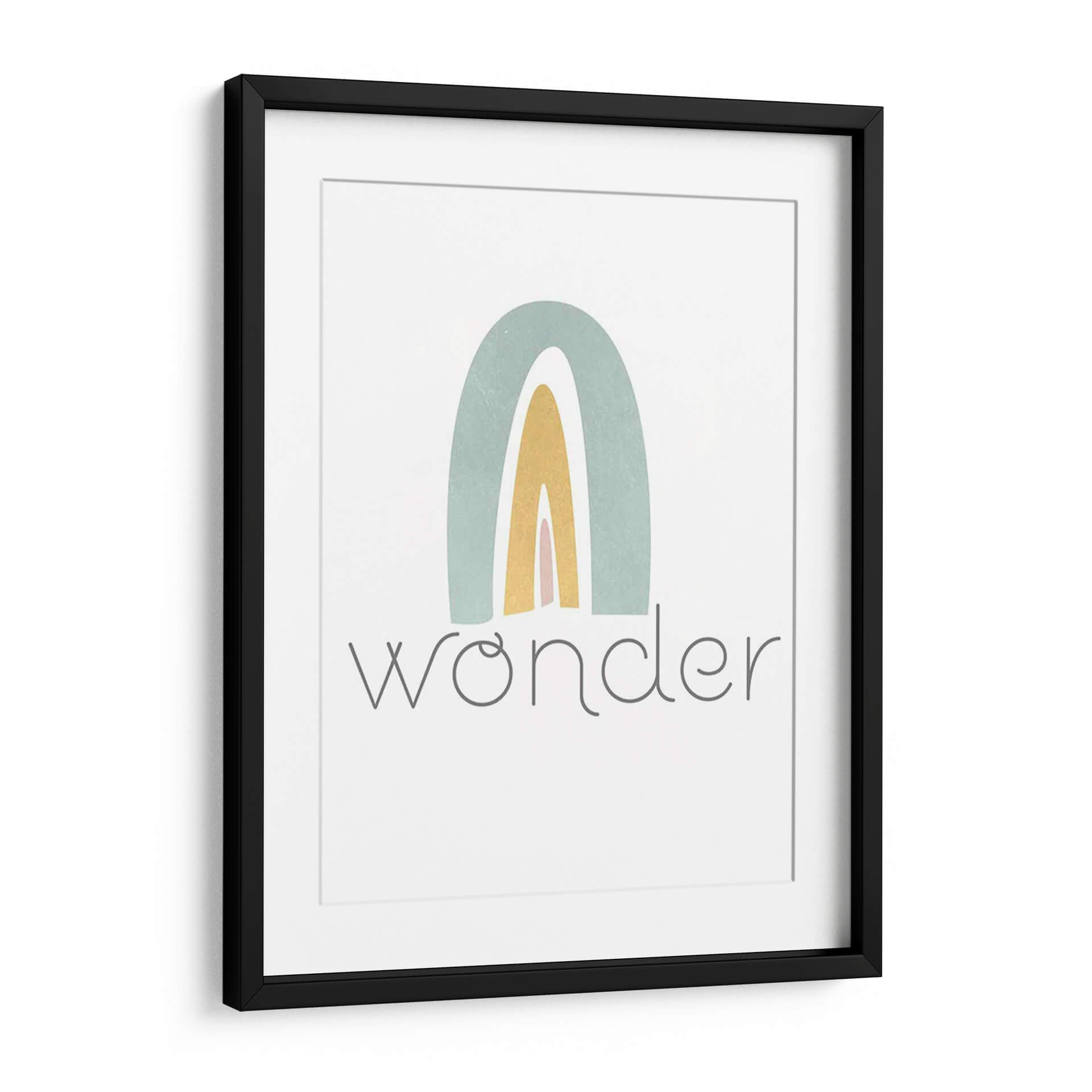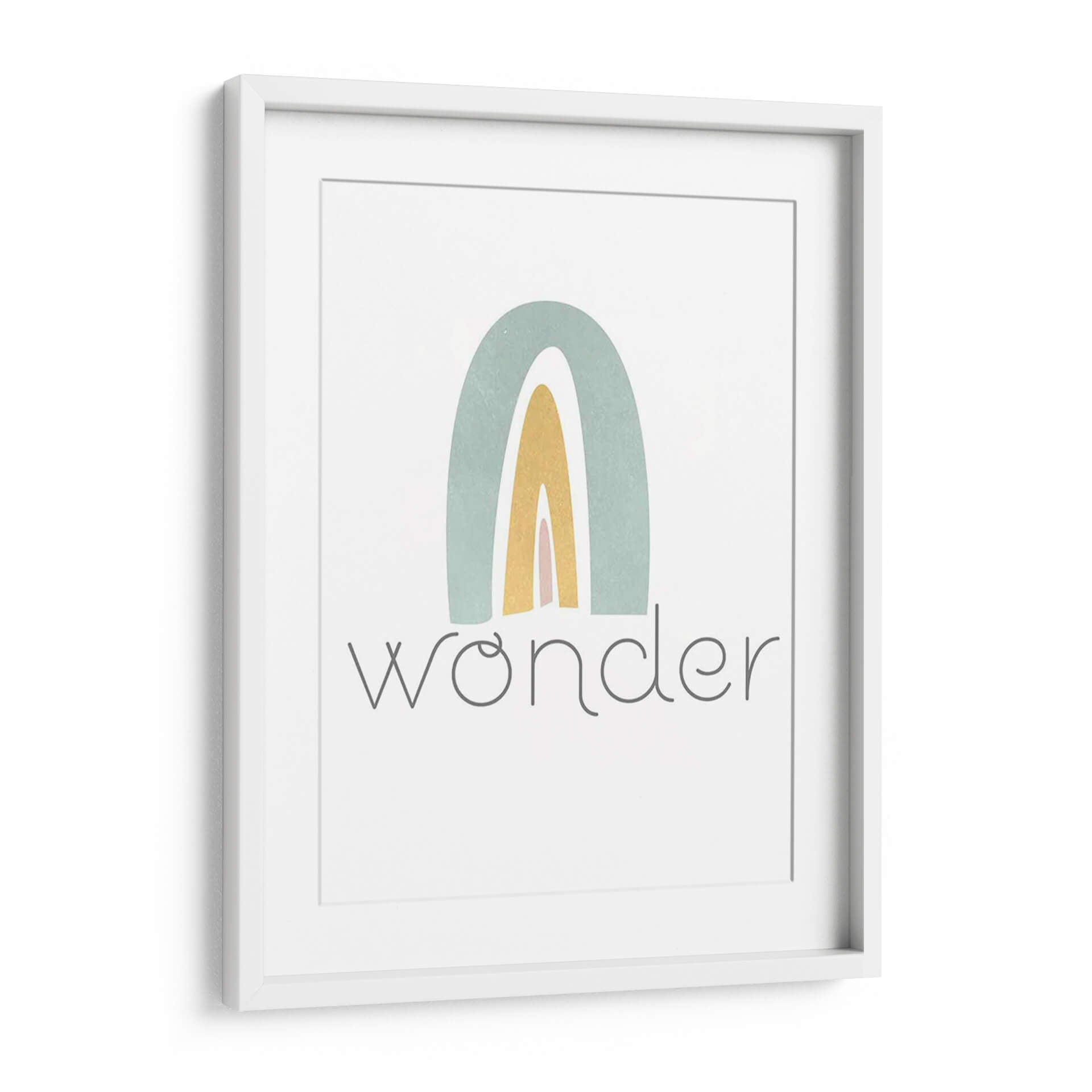 Este encantador cuadro decorativo, titulado "Rainbow Play III" de Jarman Fagalde, evoca una sensación de alegría y asombro infantil a través de su sencilla pero cautivadora representación de un arcoíris. La obra presenta arcos suaves en tonos pastel de verde azulado, amarillo dorado y rosa pálido, superpuestos sobre un fondo blanco nítido. El estilo es claramente abstracto y minimalista, con líneas limpias y una paleta de colores delicada que transmite calma y optimismo. Debajo del arcoíris, la palabra "wonder" (asombro) aparece escrita en una tipografía gris sutil y elegante, reforzando el tema de la curiosidad y la maravilla. Esta pieza es ideal para añadir un toque de dulzura y positividad a cualquier espacio, especialmente en habitaciones infantiles, guarderías o cualquier rincón del hogar que busque una atmósfera serena y esperanzadora. Su diseño contemporáneo y su mensaje inspirador la convierten en una adición perfecta para aquellos que buscan arte que celebre la inocencia y la belleza de las cosas simples.