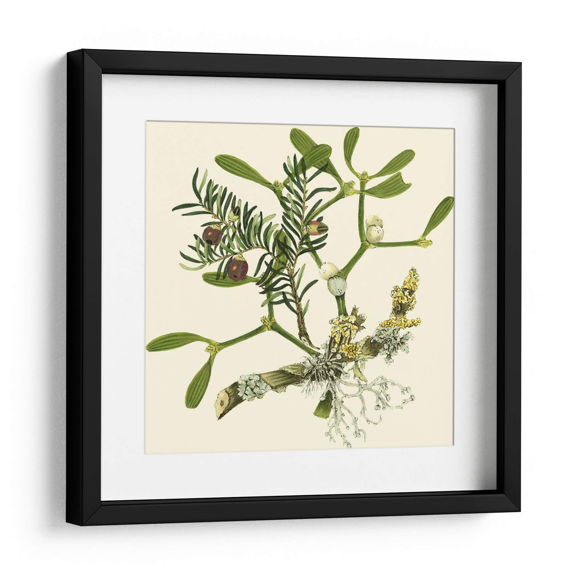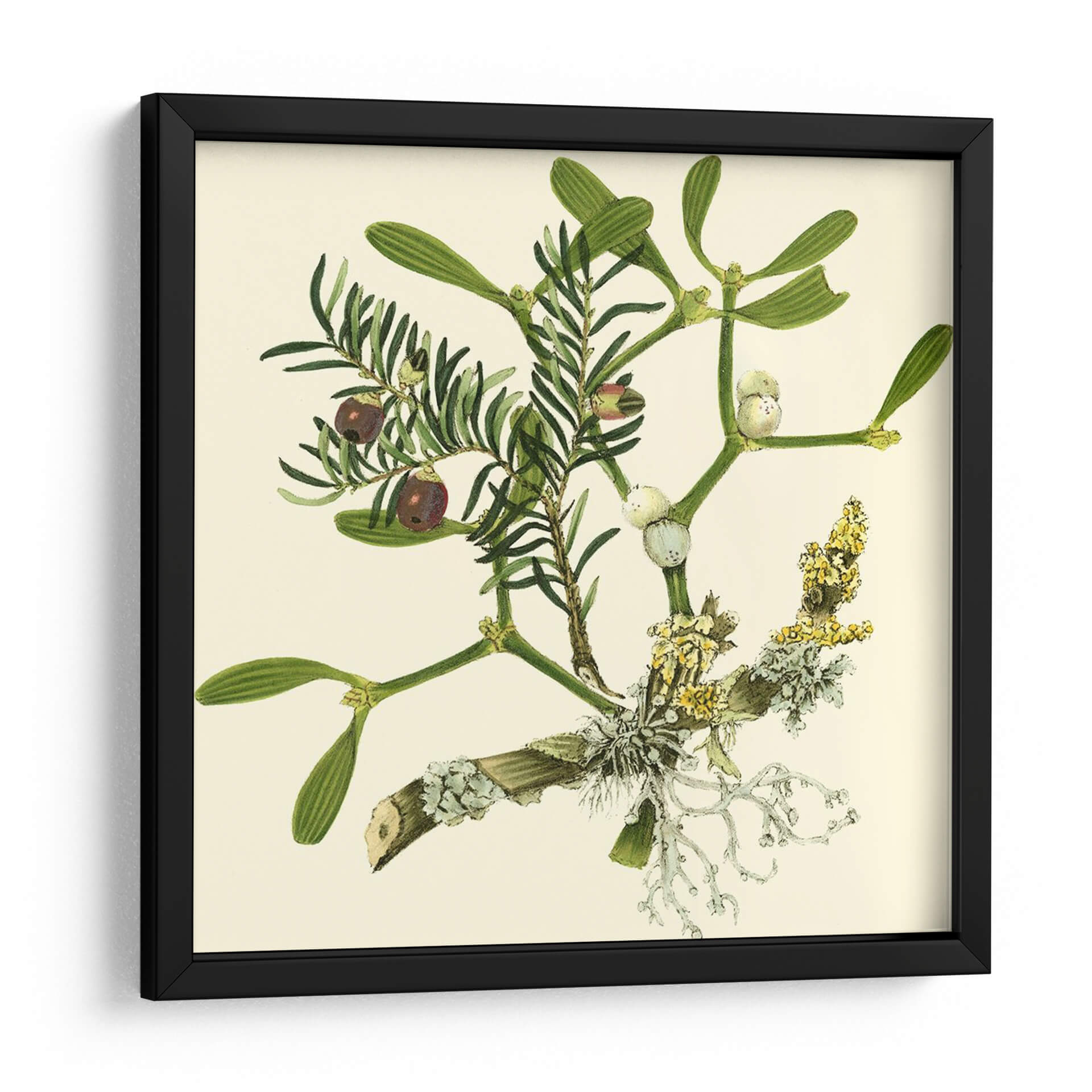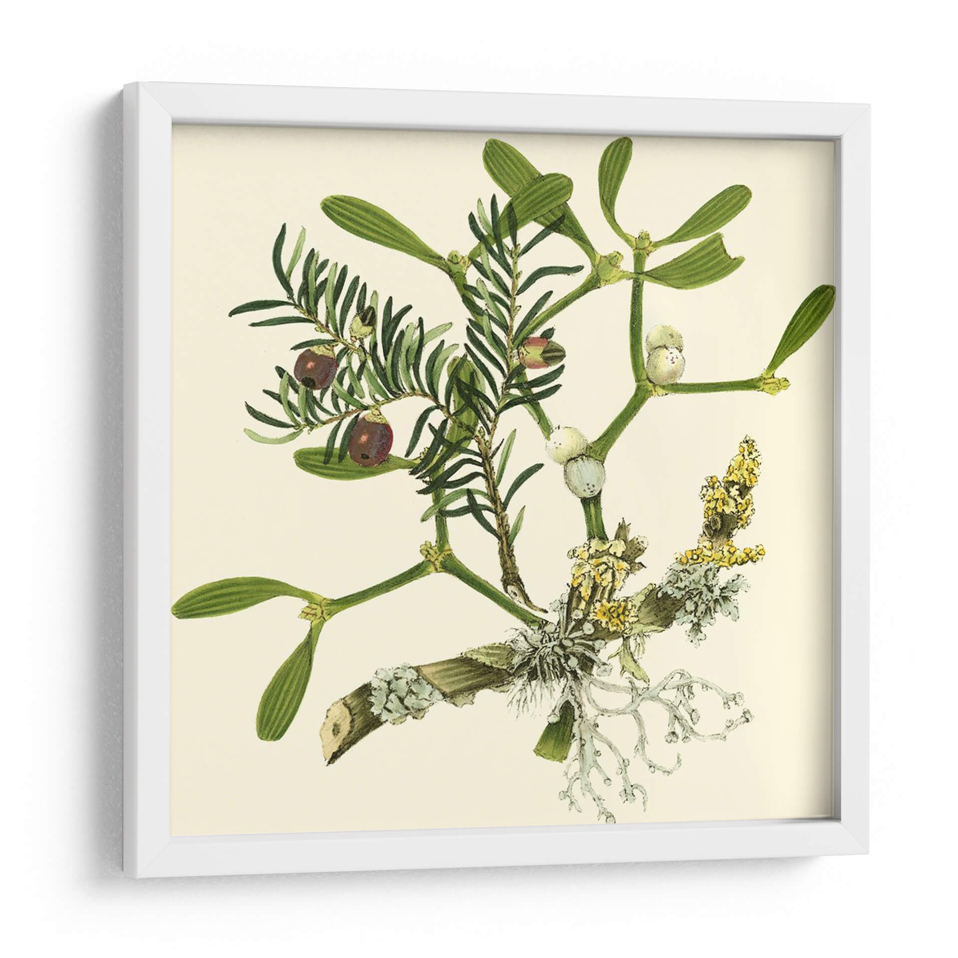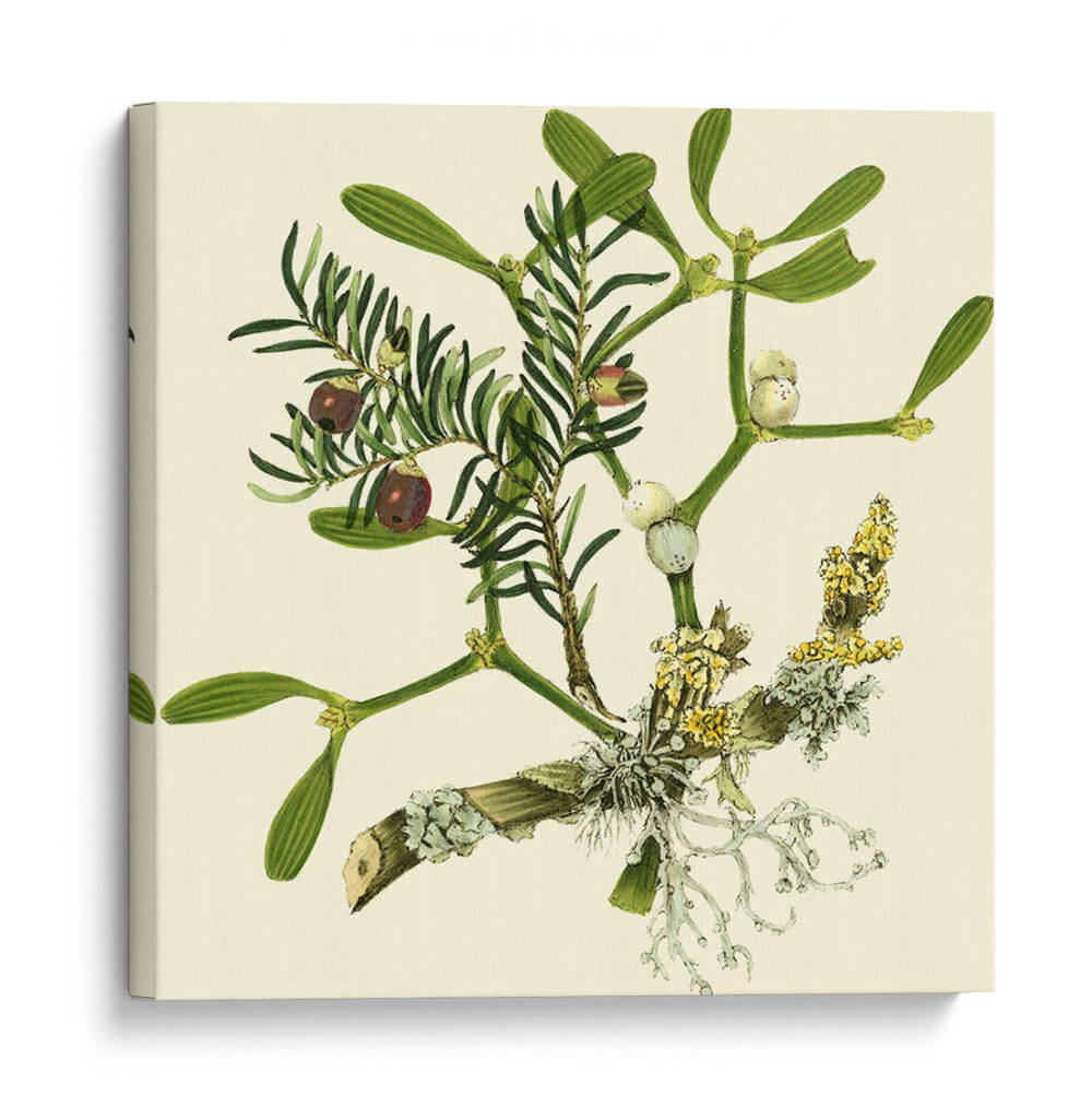 Embellece tu hogar con el encanto botánico de "Rama de Muérdago", una obra de arte inspirada en la naturaleza y creada por Vision Studio. Este detallado cuadro decorativo captura la delicadeza de las ramas de muérdago y otras plantas verdes, adornadas con bayas oscuras y racimos florales en tonos amarillos y blancos. La paleta de colores, dominada por verdes intensos y el suave beige del fondo, crea una atmósfera de serenidad y conexión con el mundo natural. Su estilo evocador, que recuerda a las ilustraciones botánicas clásicas con un toque contemporáneo, lo convierte en una pieza versátil, ideal para añadir un toque de frescura y elegancia a cualquier rincón de tu hogar u oficina. Imagina este cuadro aportando calma a tu dormitorio, un acento natural a tu sala de estar o inspiración botánica a tu estudio. La composición se centra en la intrincada estructura de las ramas, invitando a la contemplación de los pequeños detalles y la belleza inherente de la flora. "Rama de Muérdago" es más que una simple decoración; es una ventana a la naturaleza que transforma tus espacios en santuarios de paz y estilo.