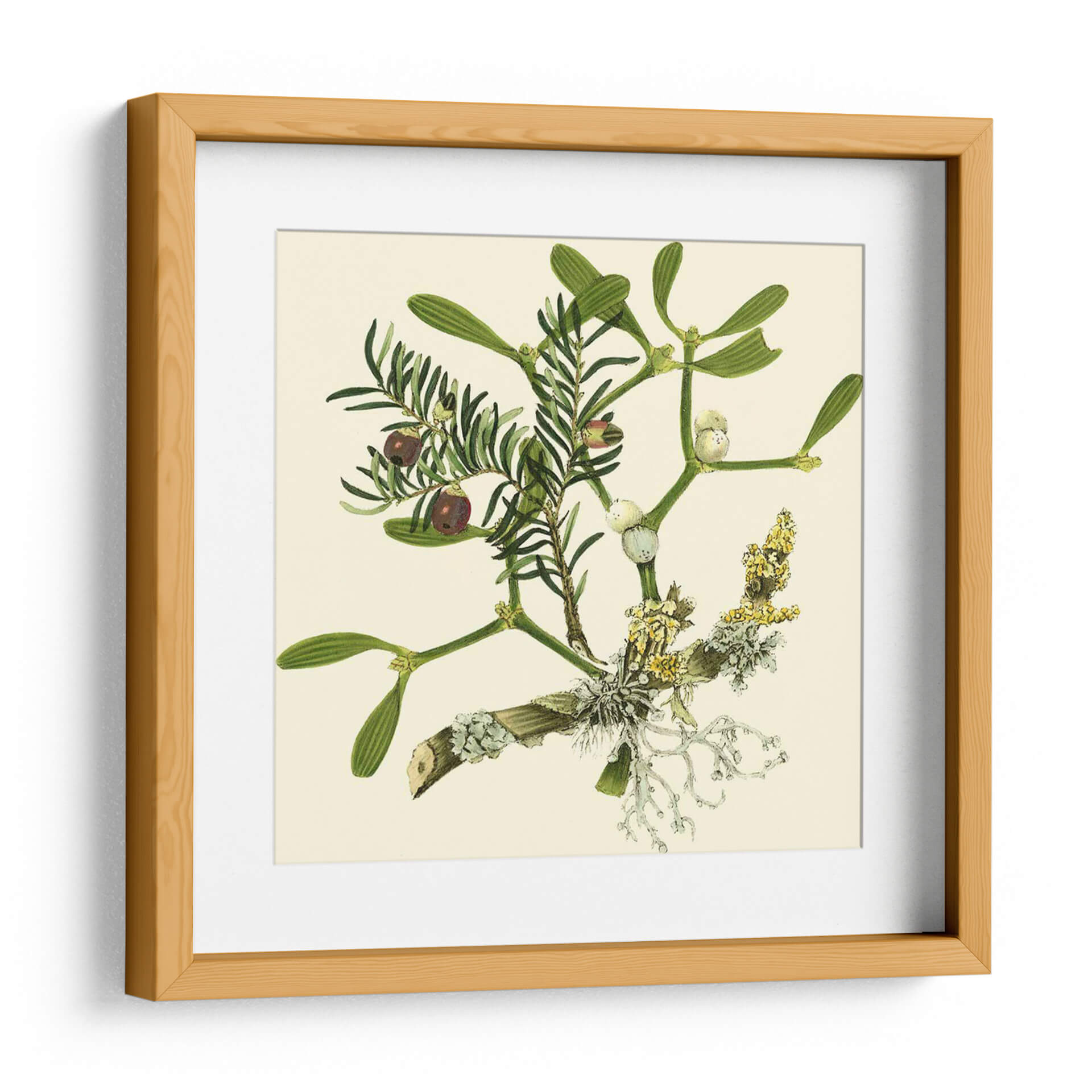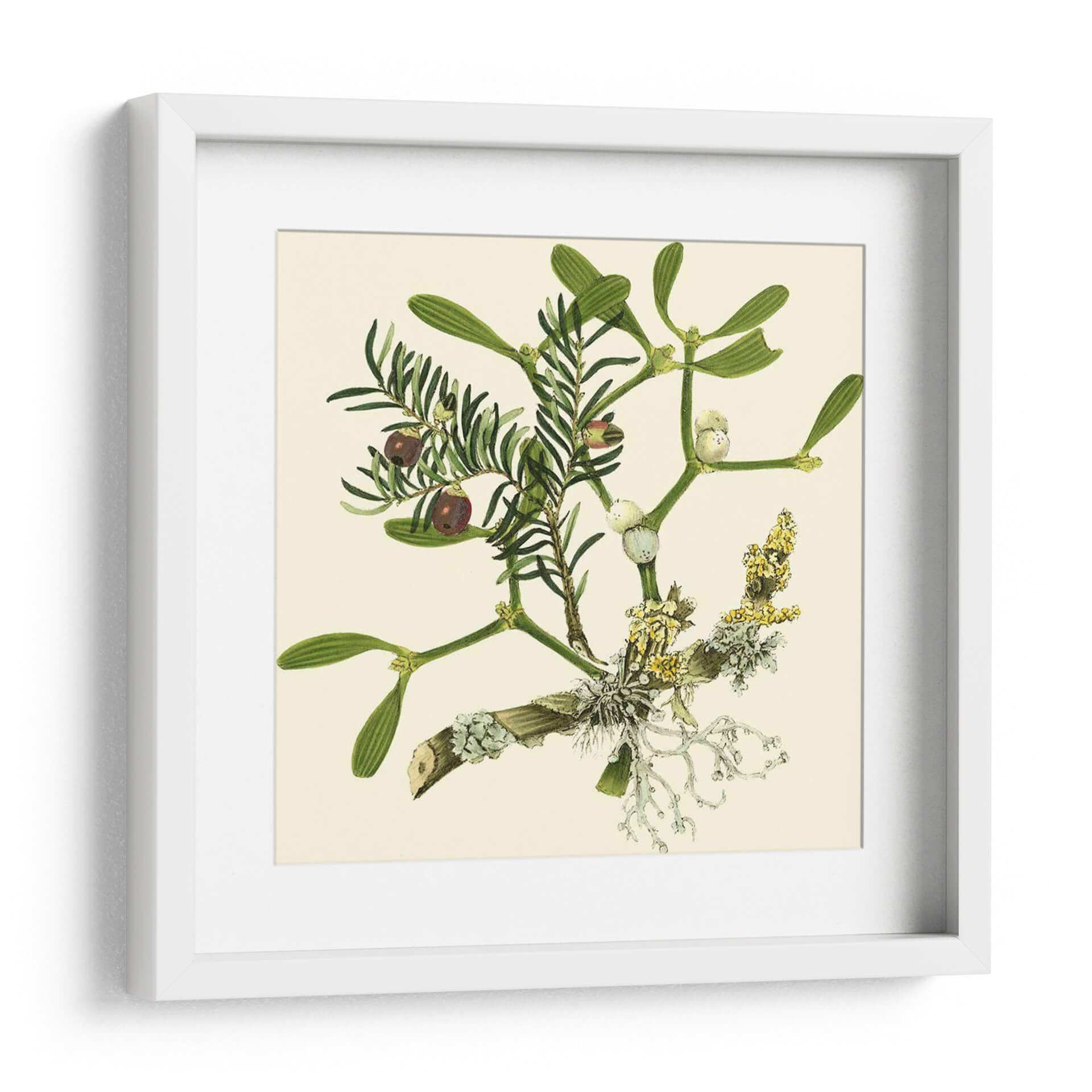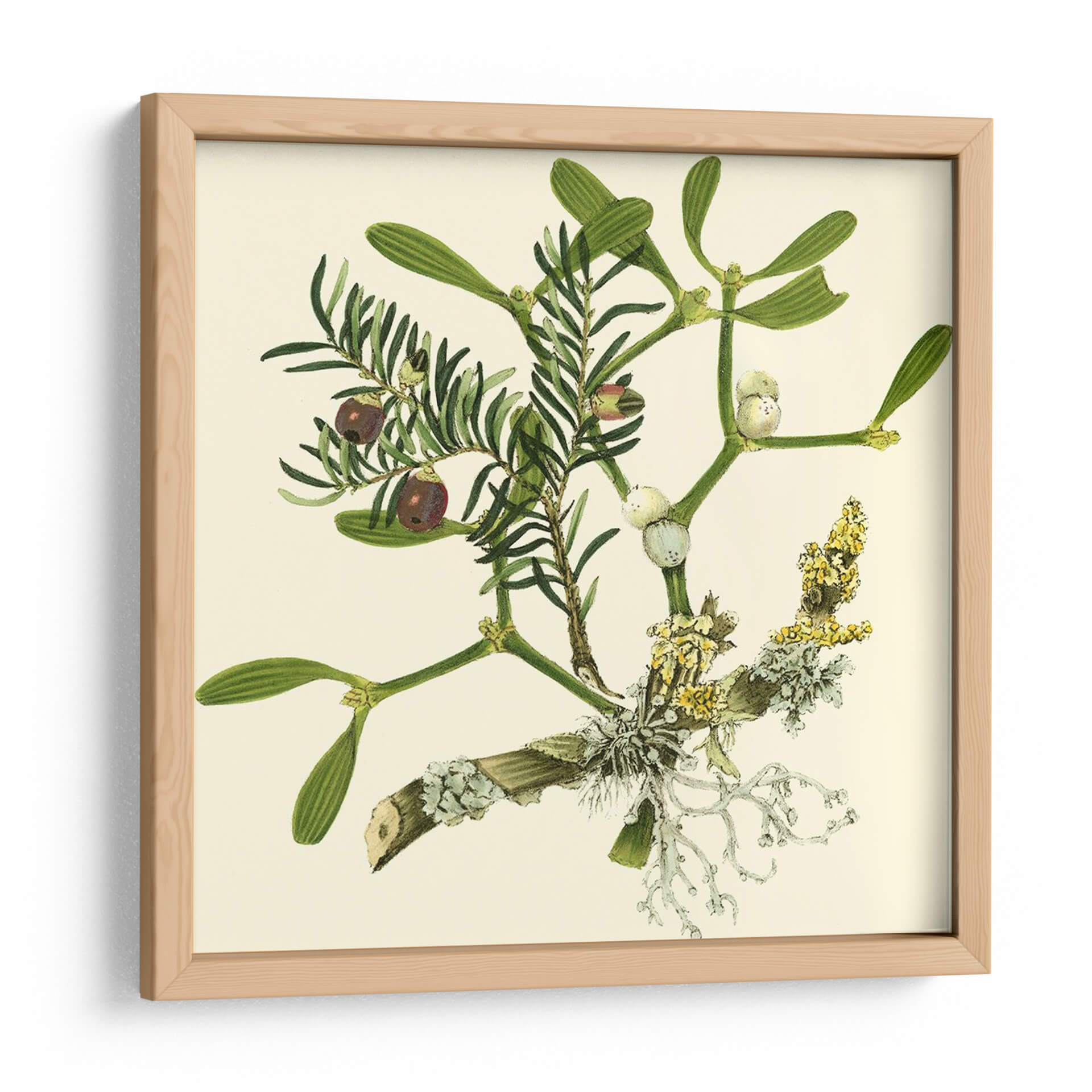 Embellece tu hogar con el encanto botánico de "Rama de Muérdago", una obra de arte inspirada en la naturaleza y creada por Vision Studio. Este detallado cuadro decorativo captura la delicadeza de las ramas de muérdago y otras plantas verdes, adornadas con bayas oscuras y racimos florales en tonos amarillos y blancos. La paleta de colores, dominada por verdes intensos y el suave beige del fondo, crea una atmósfera de serenidad y conexión con el mundo natural. Su estilo evocador, que recuerda a las ilustraciones botánicas clásicas con un toque contemporáneo, lo convierte en una pieza versátil, ideal para añadir un toque de frescura y elegancia a cualquier rincón de tu hogar u oficina. Imagina este cuadro aportando calma a tu dormitorio, un acento natural a tu sala de estar o inspiración botánica a tu estudio. La composición se centra en la intrincada estructura de las ramas, invitando a la contemplación de los pequeños detalles y la belleza inherente de la flora. "Rama de Muérdago" es más que una simple decoración; es una ventana a la naturaleza que transforma tus espacios en santuarios de paz y estilo.