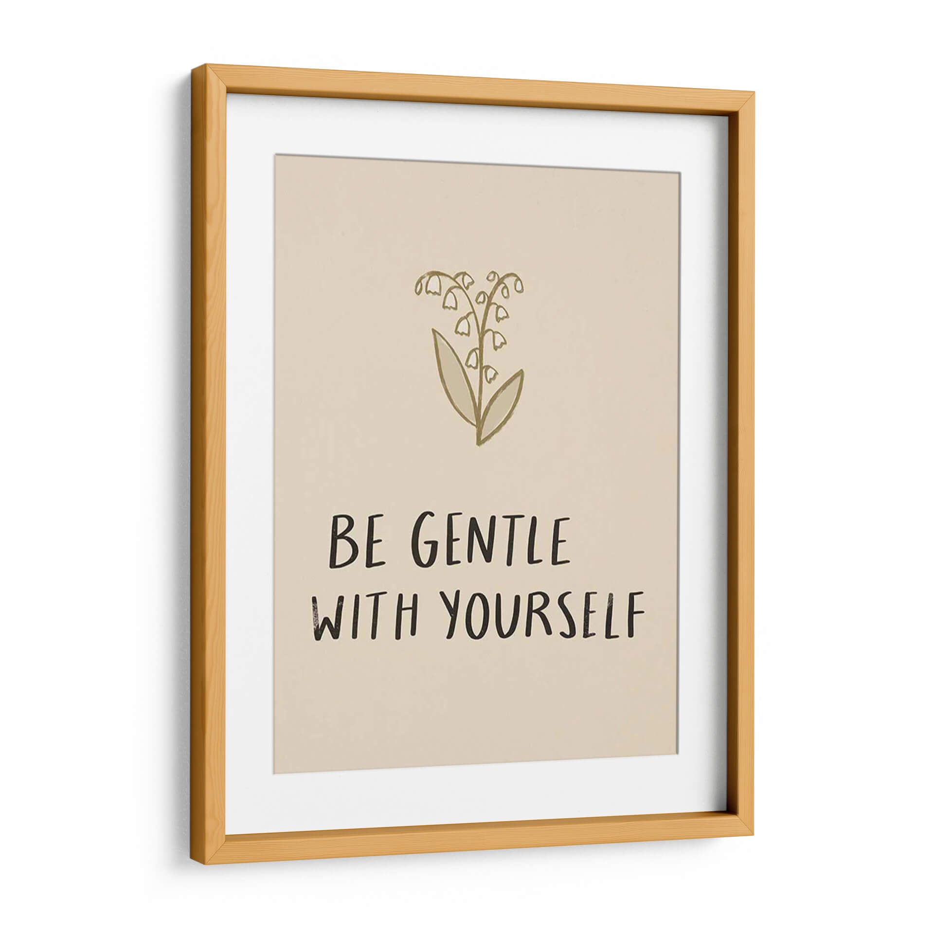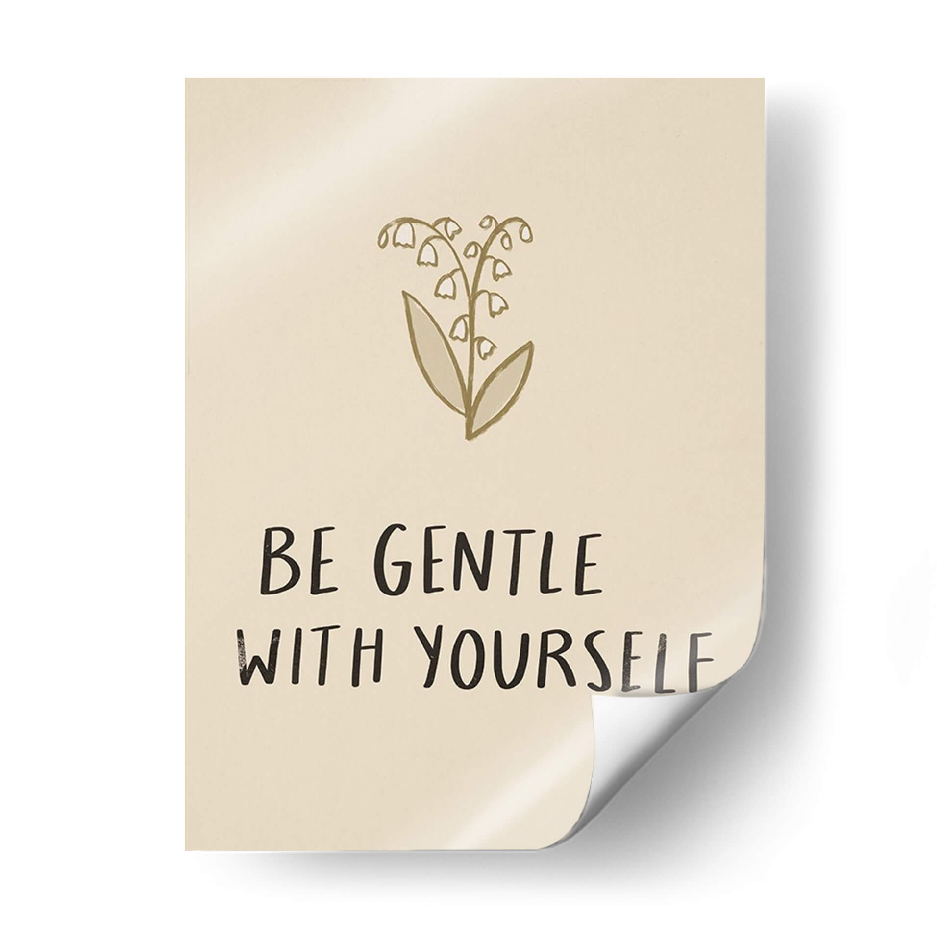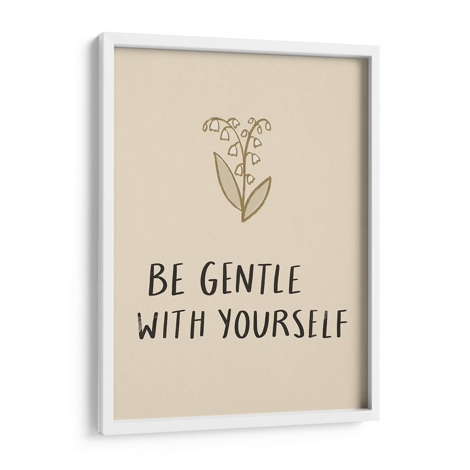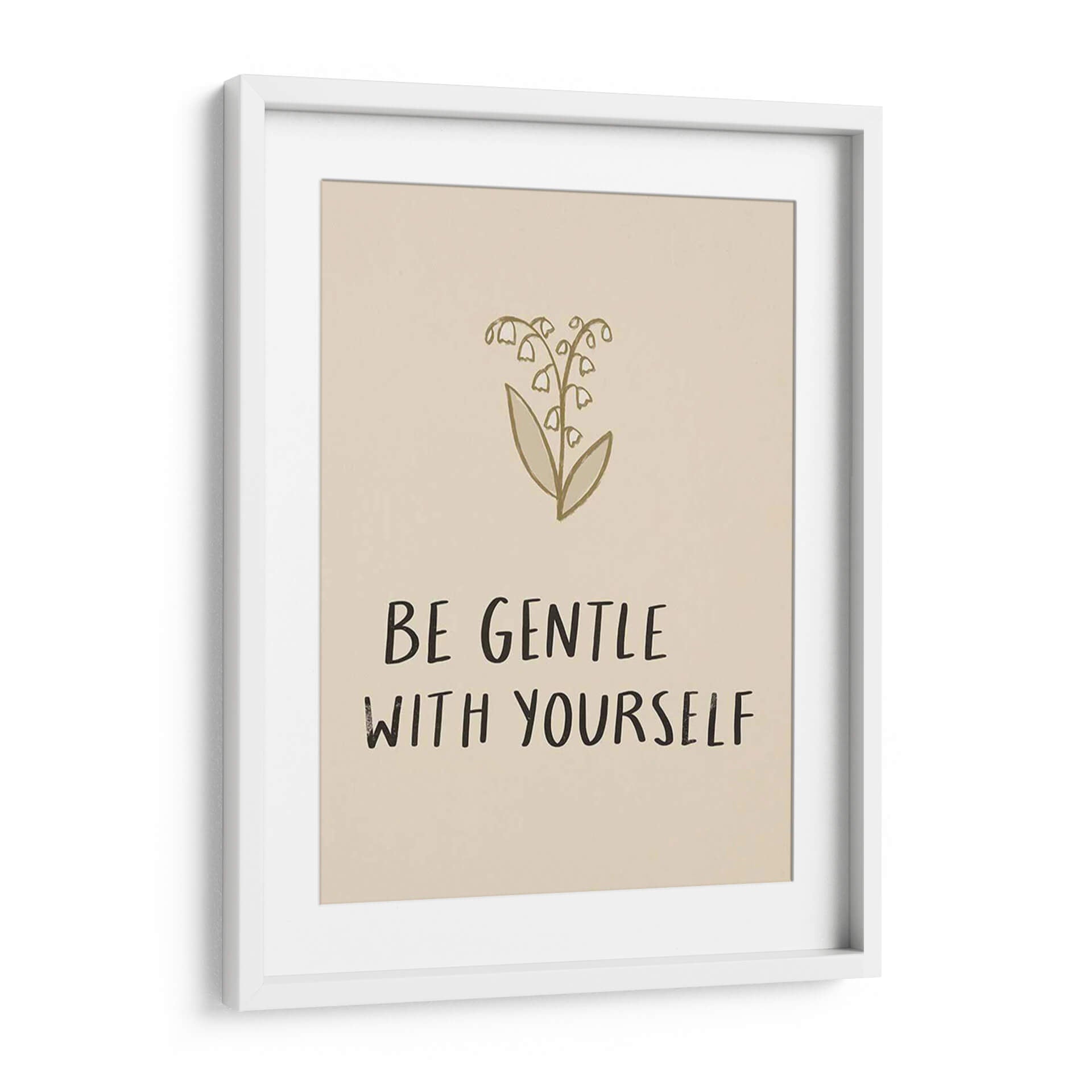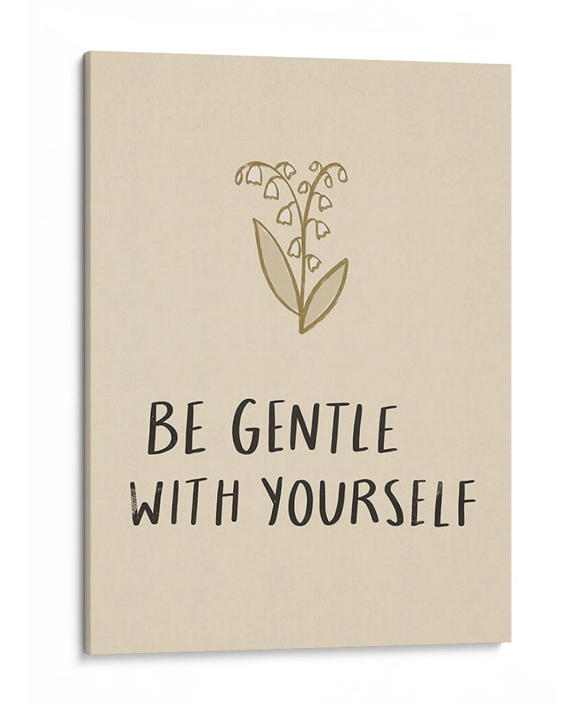 Transforma tu espacio con el inspirador cuadro decorativo "Recógeme III" de Susan Savory. Esta obra de arte evoca una sensación de calma y reflexión a través de su delicada ilustración de lirios del valle en tonos dorados y beige. Las flores, representadas con trazos sencillos y elegantes, se complementan con un poderoso mensaje en tipografía manuscrita: "BE GENTLE WITH YOURSELF". Este cuadro minimalista es perfecto para crear un ambiente sereno y de autocuidado en tu hogar u oficina. Su paleta de colores neutros lo convierte en un complemento versátil para cualquier estilo de decoración, desde el moderno hasta el escandinavo o bohemio. Imagina este cuadro aportando un toque de serenidad y positividad a tu dormitorio, sala de estar o incluso a tu rincón de meditación. Es una pieza que no solo embellece, sino que también invita a la introspección y al bienestar. Ideal para quienes buscan arte con significado, "Recógeme III" es un recordatorio visual para ser amables con uno mismo en el día a día. Añade esta pieza única a tu colección y cultiva un entorno de paz y armonía.