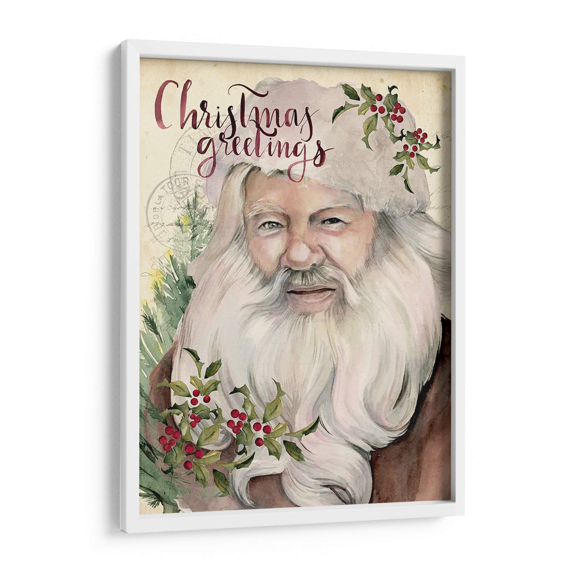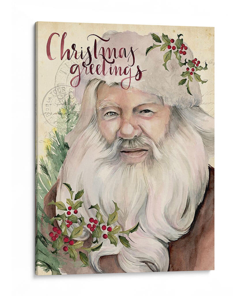 Celebra la temporada festiva con nuestro cautivador cuadro decorativo 'Saludos Navideños I', una obra de Jennifer Paxton Parker que evoca la calidez y la alegría de la Navidad. Esta pieza captura la esencia del espíritu navideño a través de una encantadora representación de Papá Noel, con su barba blanca icónica y una mirada amigable. La paleta de colores, dominada por tonos cálidos y terrosos con toques de rojo festivo de las bayas de acebo y el verde de los pinos, crea una atmósfera acogedora y nostálgica. El estilo de acuarela delicado aporta una suavidad y un toque artesanal que invitan a la contemplación. La composición, centrada en el rostro amable de Papá Noel y adornada con detalles como ramas de acebo y el sugerente texto 'Christmas greetings', lo convierte en un punto focal perfecto para cualquier espacio. Este cuadro es ideal para añadir un toque de encanto tradicional y espíritu festivo a tu sala de estar, comedor o incluso a un espacio de trabajo durante la temporada navideña. Su diseño atemporal y su emotiva representación lo convierten en una adición preciada a cualquier colección de arte decorativo, recordando los alegres momentos compartidos y la magia de estas fechas. Transforma tu hogar en un refugio navideño con esta hermosa pieza.