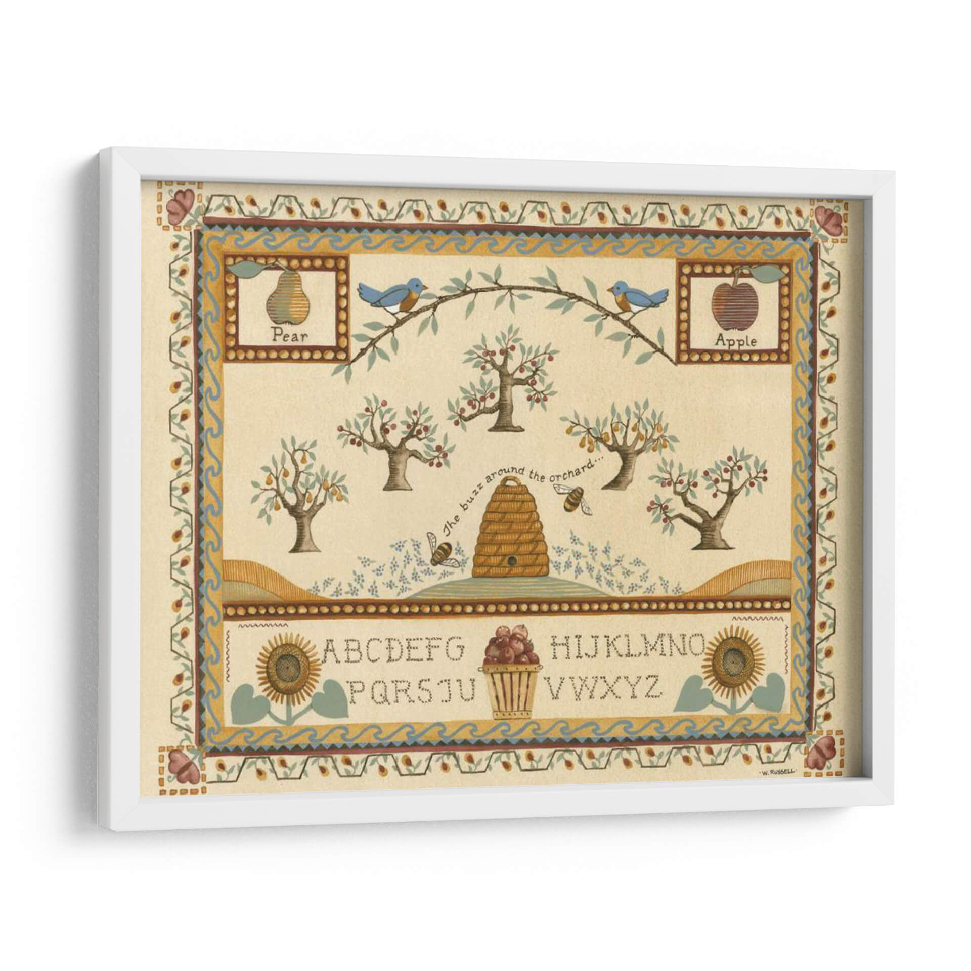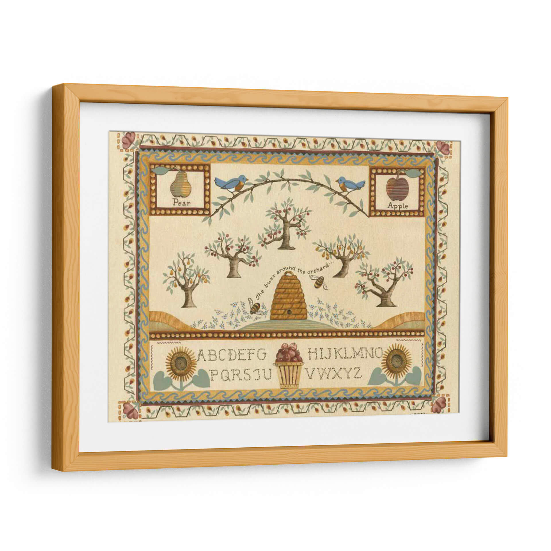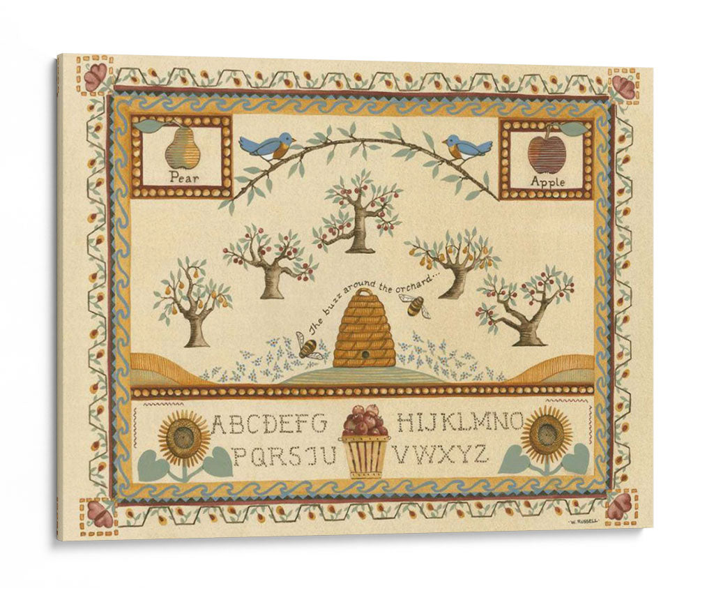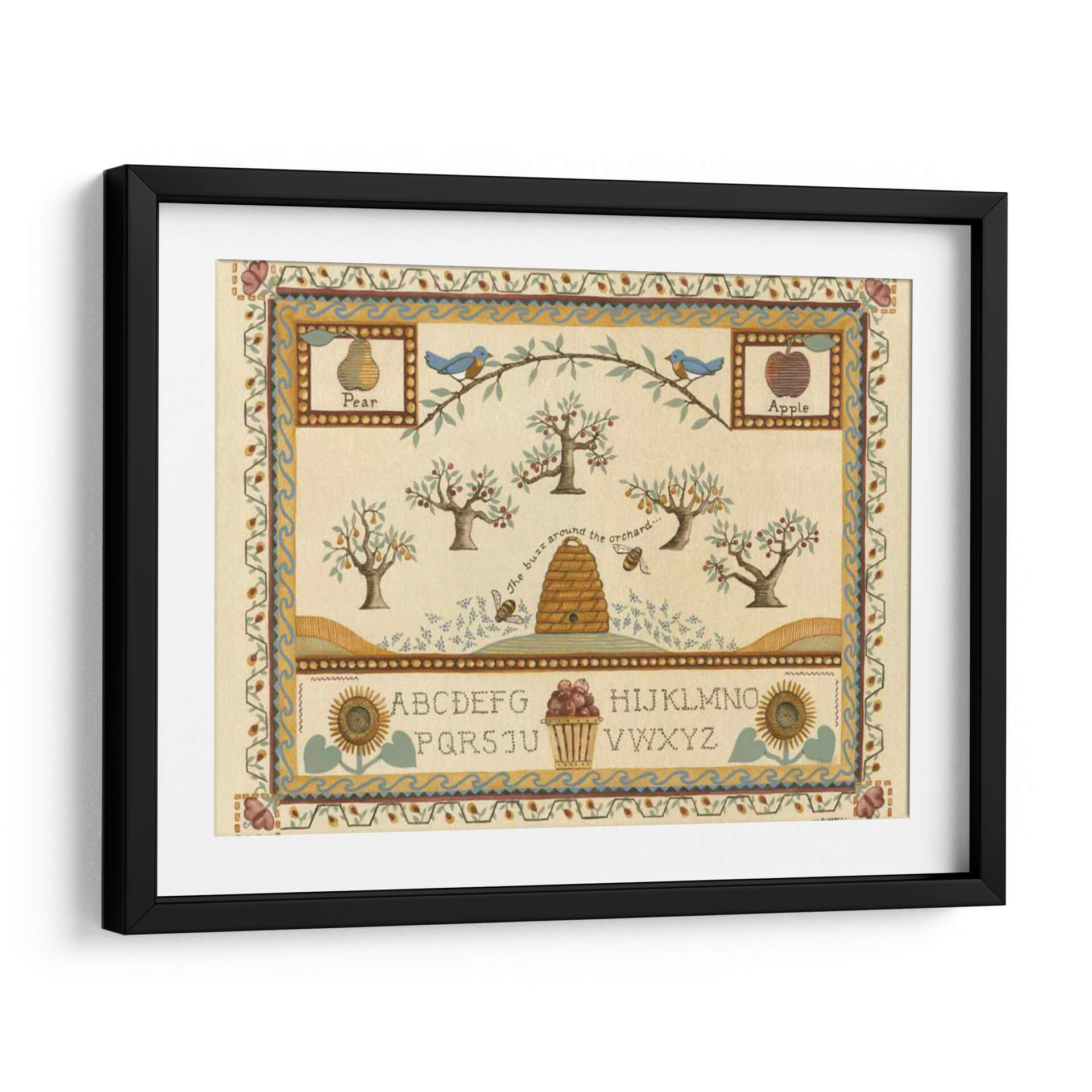 Sumérgete en la encantadora escena de 'Sampler Garden II' de Wendy Russell, un cuadro decorativo que evoca la serenidad y la vitalidad de un jardín apícola. Esta obra captura la esencia de la naturaleza con sus vibrantes árboles frutales, el zumbido de las abejas alrededor de una colmena y la presencia de frutas como manzanas y peras, todo ello enmarcado por un delicado diseño de alfabeto y girasoles. La paleta de colores, dominada por tonos tierra, verdes suaves y toques de rojo y azul, crea una atmósfera cálida y acogedora, perfecta para añadir un toque rústico y alegre a cualquier espacio. El estilo, que recuerda a los tradicionales tapices o 'samplers', aporta una sensación de nostalgia y artesanía. Ideal para cocinas, comedores o salas de estar que buscan una pieza de arte con carácter y un guiño a la vida rural. 'Sampler Garden II' no es solo una decoración, es una invitación a la tranquilidad y a la apreciación de los pequeños detalles de la vida.