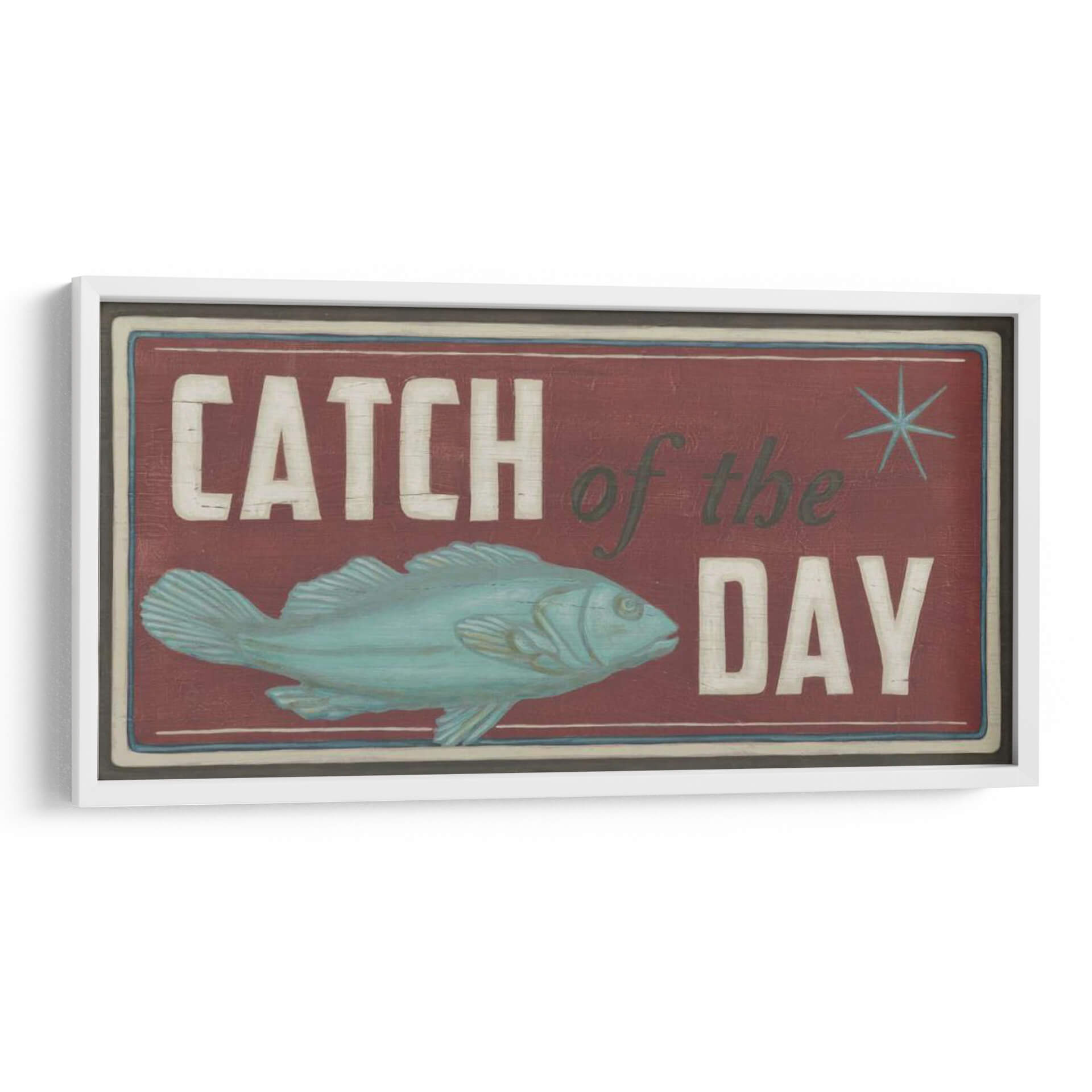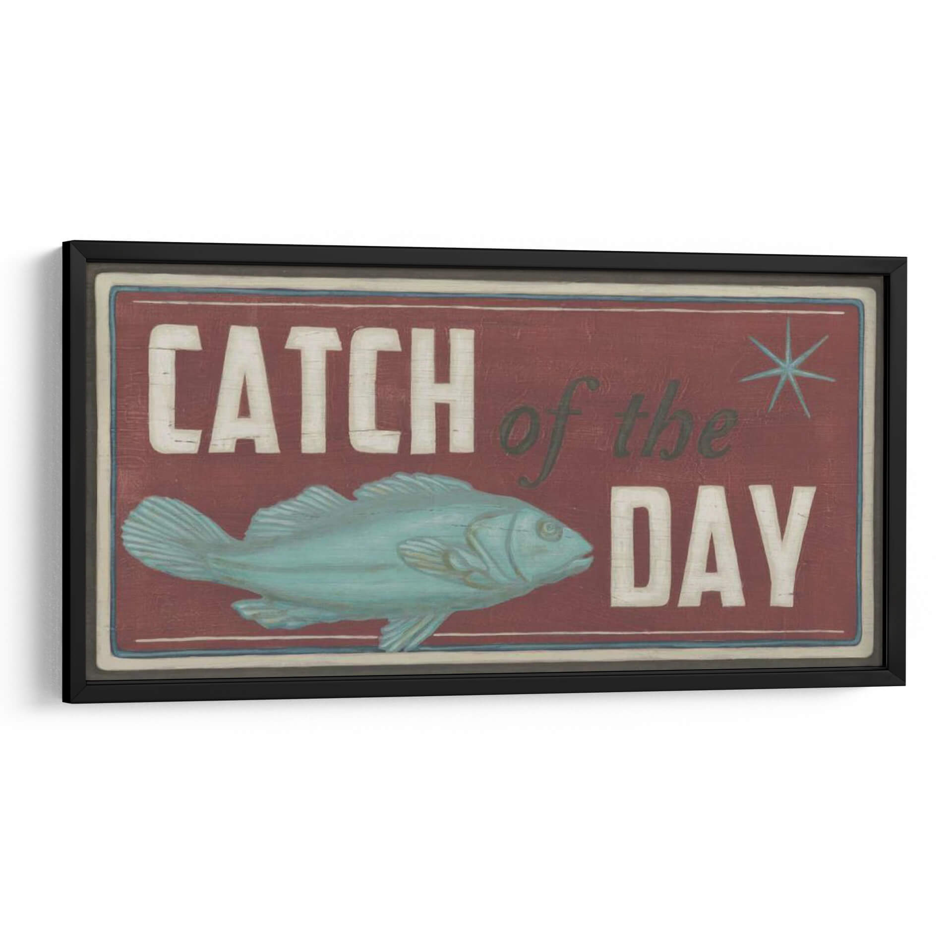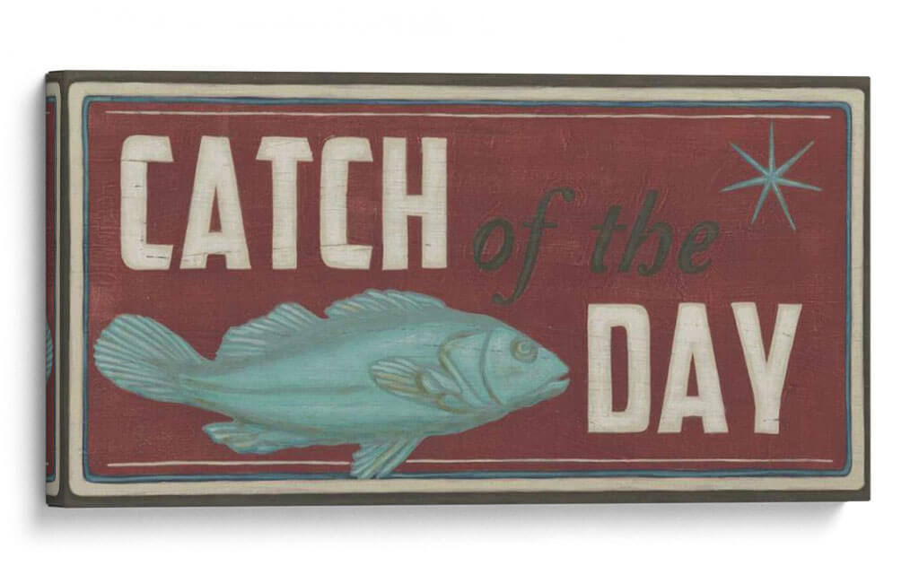 Captura la esencia de la aventura y la recompensa con nuestro cuadro decorativo "Signos De La Costa Iv". Esta obra de arte evoca el encanto rústico de la pesca y la emoción de un día exitoso en el mar. El diseño presenta un pez estilizado en tonos turquesa y aguamarina, posicionado dinámicamente sobre un fondo profundo de color burdeos. Las letras desgastadas en blanco y verde oscuro, que deletrean "Catch of the Day", añaden un toque vintage y nostálgico, evocando la sensación de un letrero de taberna junto al mar. La composición general es audaz y llamativa, con un sutil borde que enmarca la escena, creando una atmósfera de autenticidad y tradición marinera. Este cuadro es ideal para espacios que buscan un carácter distintivo y un aire de escapada costera. Perfecto para cocinas, comedores, estudios o cualquier rincón que necesite un toque de personalidad y un guiño a los placeres sencillos de la vida. Su estilo único se adapta a decoraciones rústicas, costeras o incluso eclécticas, aportando un punto focal lleno de historia y carácter. Añade esta pieza a tu colección para infundir tu hogar con el espíritu indomable del océano y la alegría de la captura perfecta.