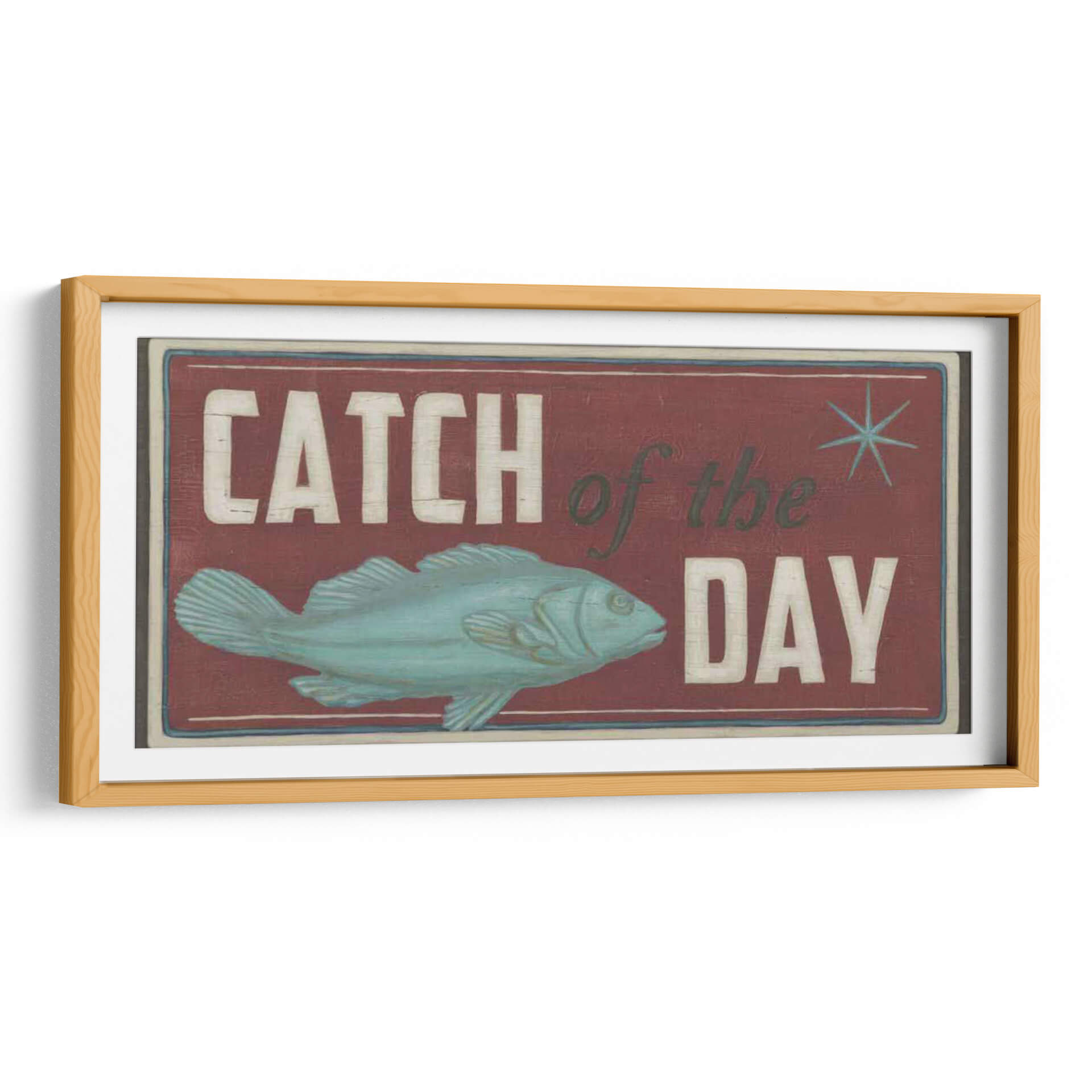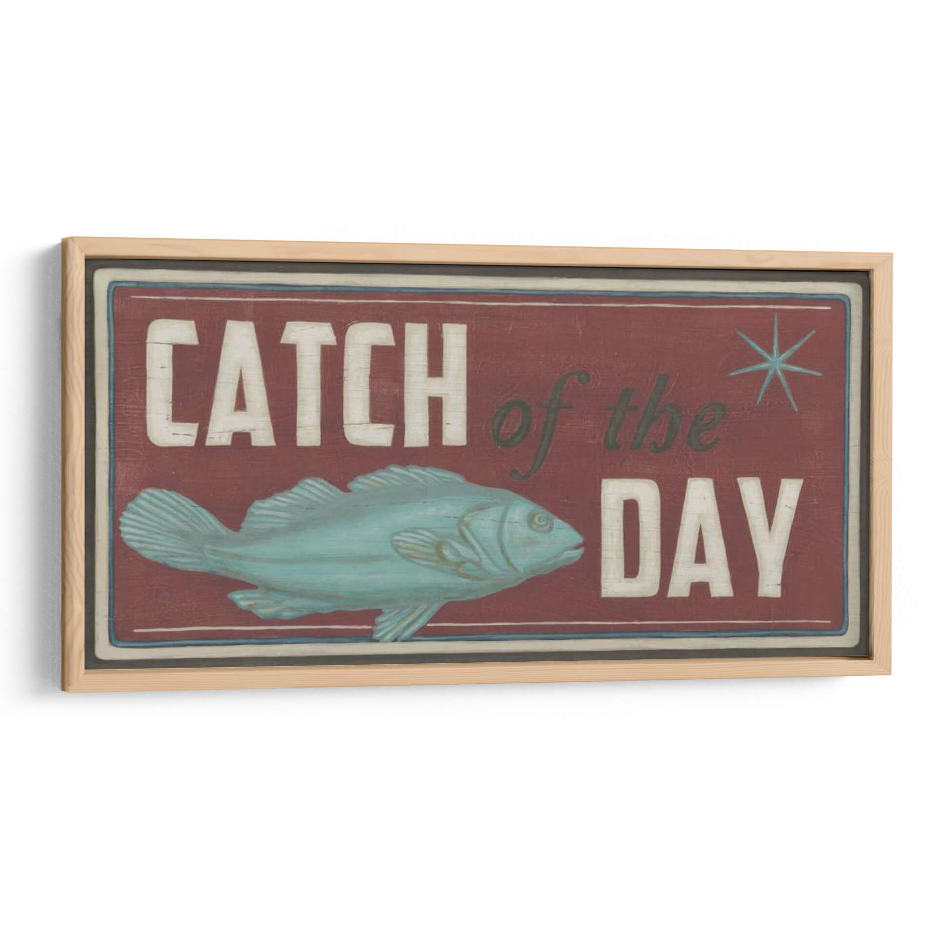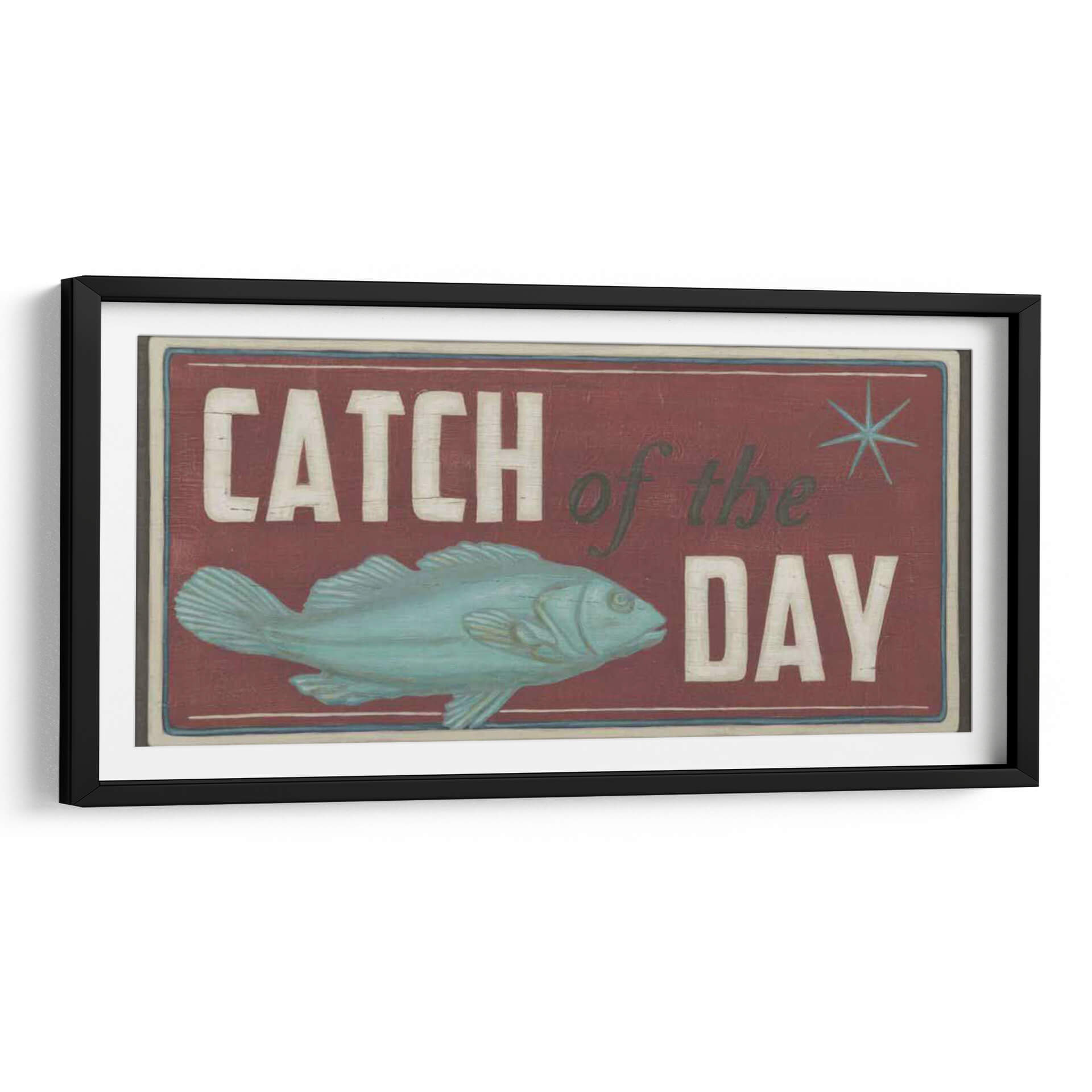 Captura la esencia de la aventura y la recompensa con nuestro cuadro decorativo "Signos De La Costa Iv". Esta obra de arte evoca el encanto rústico de la pesca y la emoción de un día exitoso en el mar. El diseño presenta un pez estilizado en tonos turquesa y aguamarina, posicionado dinámicamente sobre un fondo profundo de color burdeos. Las letras desgastadas en blanco y verde oscuro, que deletrean "Catch of the Day", añaden un toque vintage y nostálgico, evocando la sensación de un letrero de taberna junto al mar. La composición general es audaz y llamativa, con un sutil borde que enmarca la escena, creando una atmósfera de autenticidad y tradición marinera. Este cuadro es ideal para espacios que buscan un carácter distintivo y un aire de escapada costera. Perfecto para cocinas, comedores, estudios o cualquier rincón que necesite un toque de personalidad y un guiño a los placeres sencillos de la vida. Su estilo único se adapta a decoraciones rústicas, costeras o incluso eclécticas, aportando un punto focal lleno de historia y carácter. Añade esta pieza a tu colección para infundir tu hogar con el espíritu indomable del océano y la alegría de la captura perfecta.