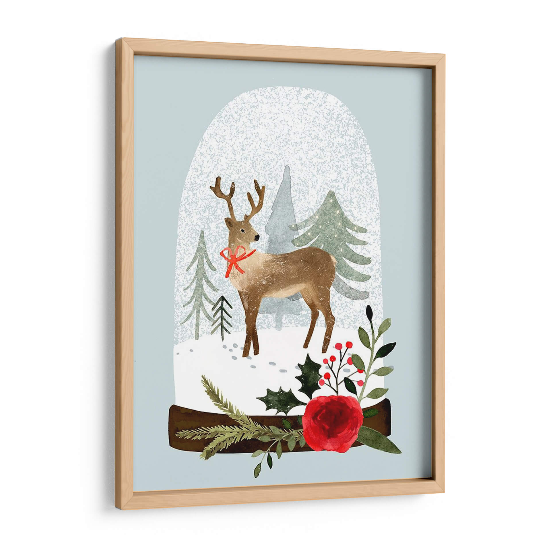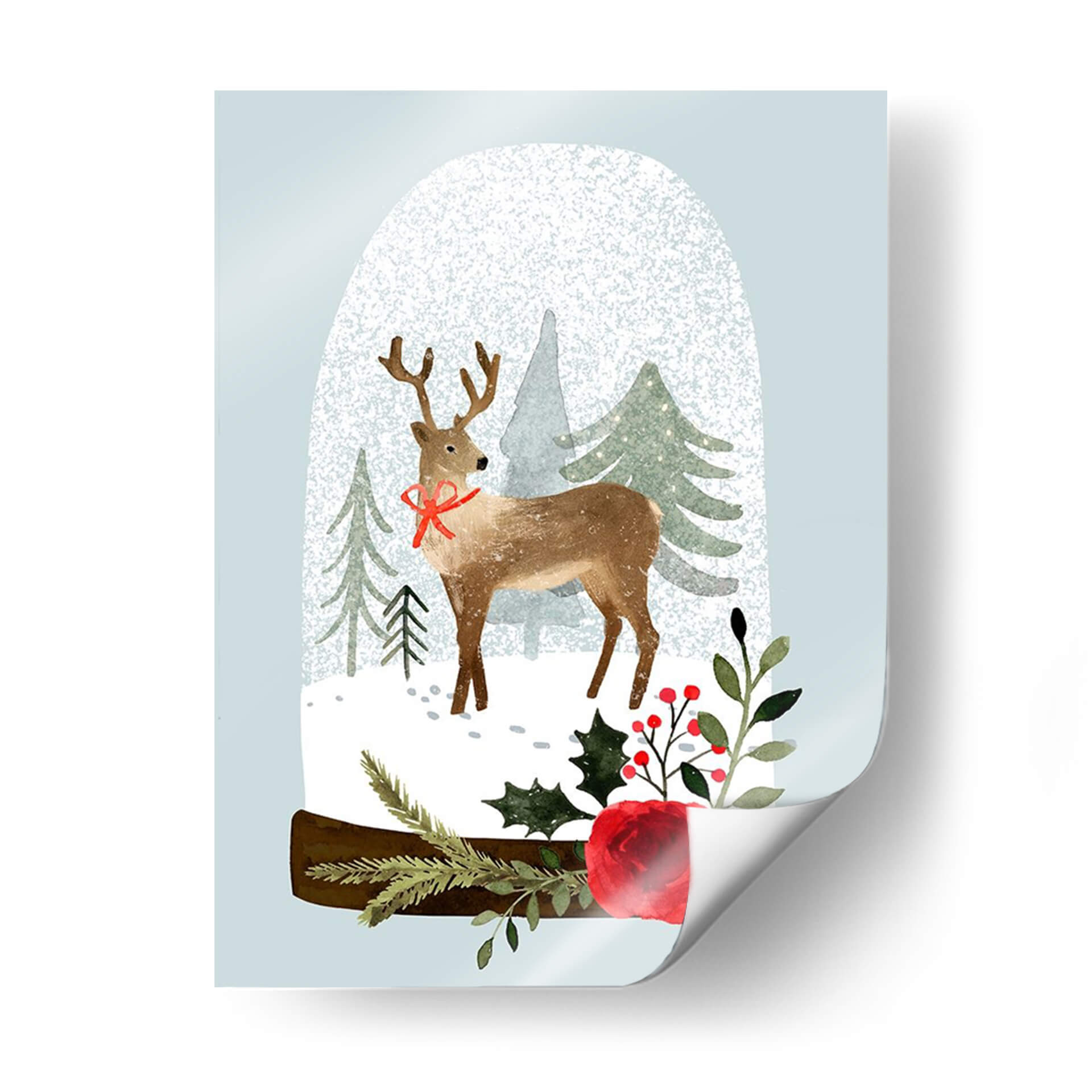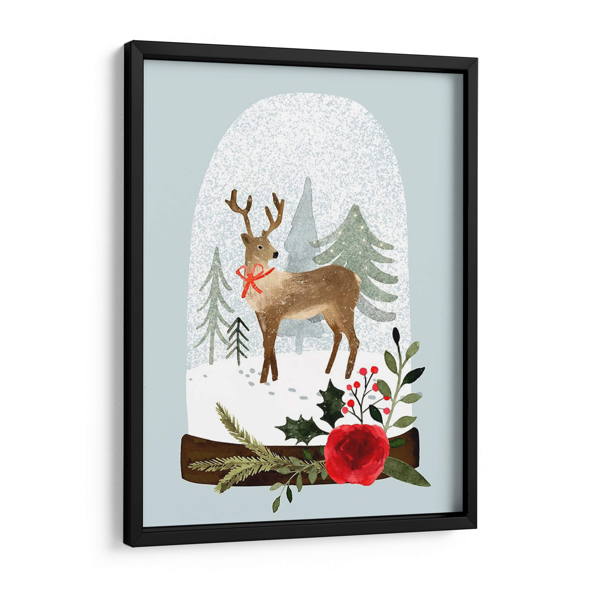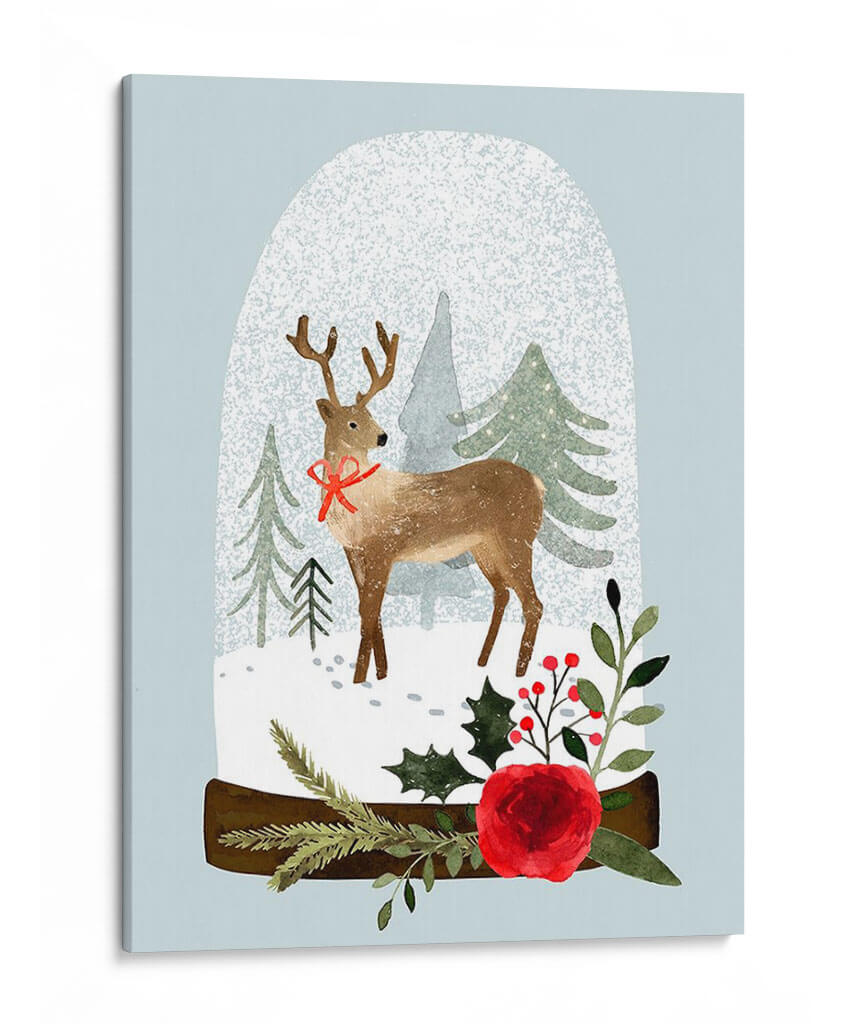 Sumérgete en la magia invernal con "Snow Globe Village Iii", una encantadora obra de arte que captura la esencia de la temporada navideña. Este cuadro decorativo presenta un tierno ciervo con un lazo rojo festivo, posicionado dentro de un caprichoso globo de nieve. Alrededor del ciervo, un paisaje nevado se despliega con árboles de pino estilizados, evocando la tranquilidad de un bosque cubierto de escarcha. La paleta de colores, dominada por suaves tonos celestes, verdes apagados y el cálido marrón del ciervo, se complementa con vibrantes toques de rojo en el lazo y las bayas, así como el detalle de una rosa escarlata, añadiendo un punto de calidez y festividad. El estilo, que combina elementos de ilustración y acuarela digital, confiere a la pieza una sensación de delicadeza y encanto artesanal. "Snow Globe Village Iii" es perfecto para añadir un ambiente acogedor y festivo a tu hogar u oficina, ideal para salas de estar, dormitorios o cualquier espacio que necesite un toque de alegría invernal y elegancia contemporánea. Transforma tu decoración con esta pieza que evoca recuerdos de la infancia y la paz de la nieve recién caída, creando un refugio visual lleno de espíritu navideño y sofisticación.