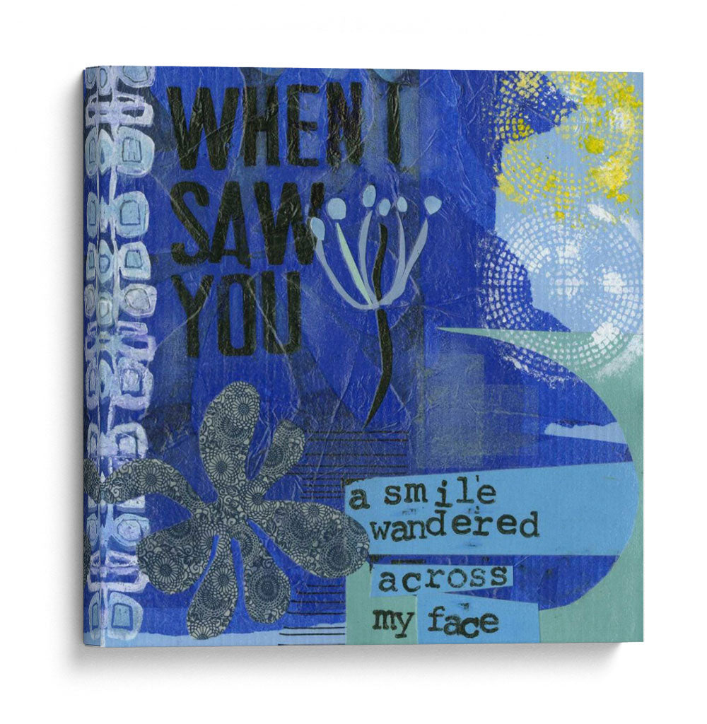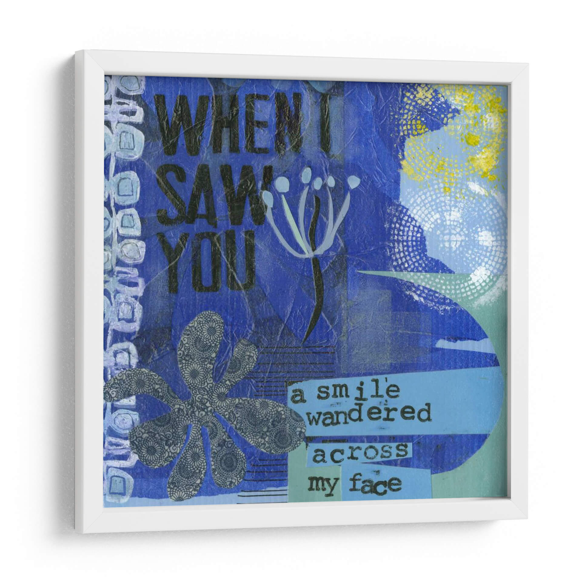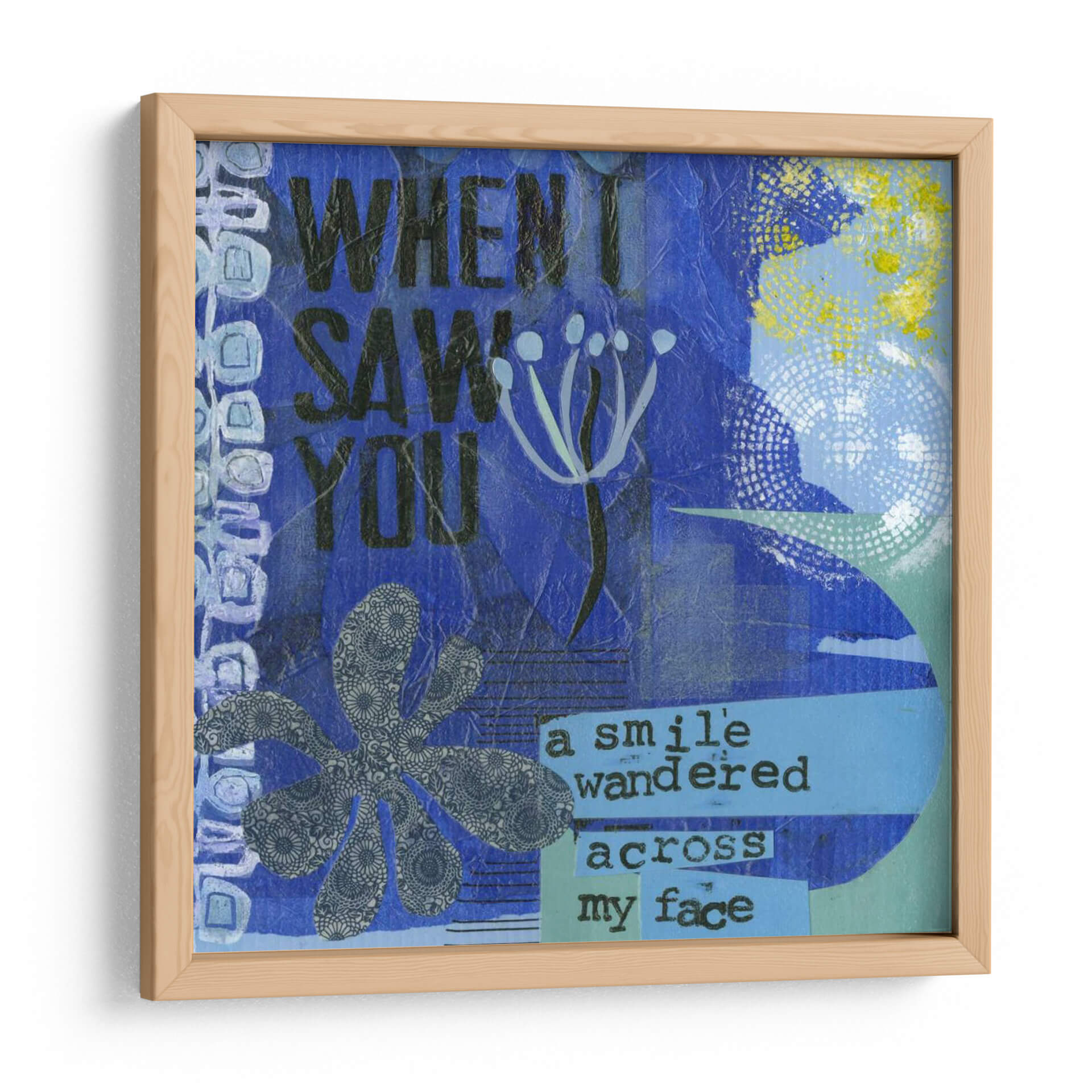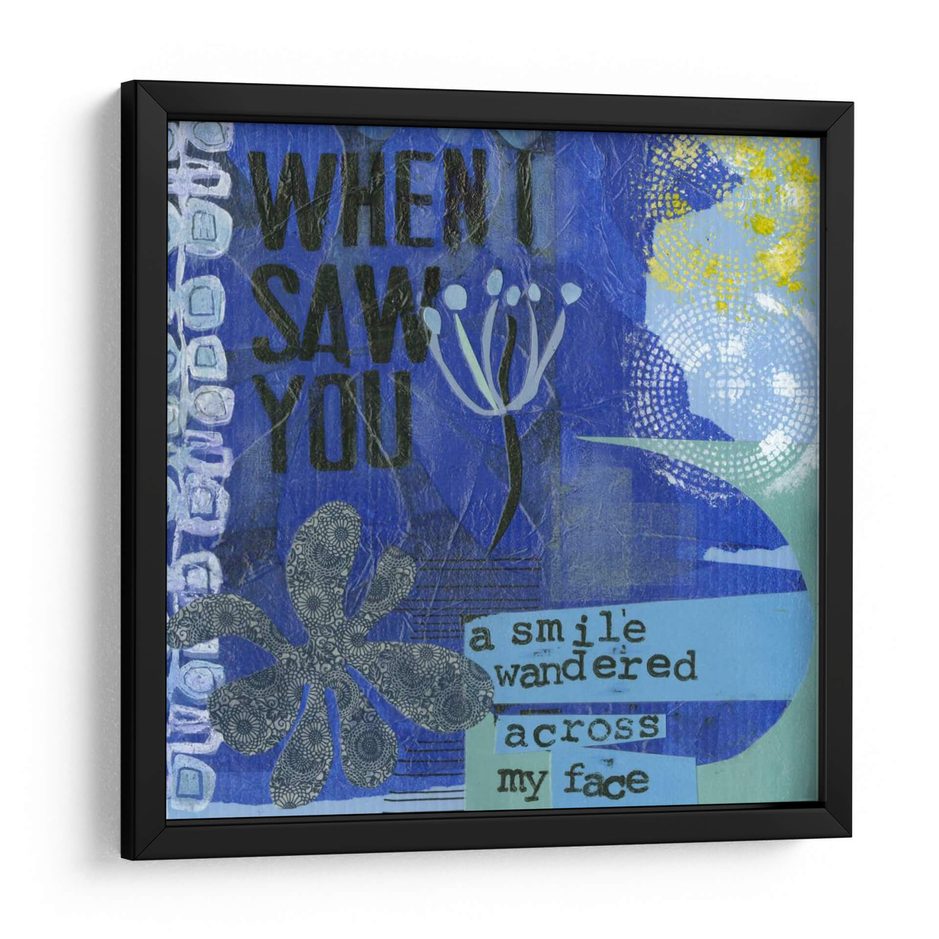 Sumérgete en la calidez y la positividad de "Sonrisa I", una cautivadora obra de arte de Deborah Velasquez que captura la esencia de un momento de alegría pura. Esta pieza, con su vibrante paleta de azules profundos, acentuados por toques de amarillo soleado y delicados patrones florales, crea una atmósfera de serenidad y optimismo. La composición abstracta, enriquecida con texturas visuales y elementos de collage, invita a la contemplación, mientras que la sutil inscripción "a smile wandered across my face" añade una capa de narración personal y relatable. Ideal para añadir un toque de inspiración y color a cualquier espacio, desde un acogedor hogar hasta una oficina moderna, este cuadro decorativo es una celebración de la felicidad simple. Su estilo único y contemporáneo lo convierte en un punto focal perfecto, capaz de transformar un ambiente y evocar emociones positivas en quienes lo contemplan. Descubre la belleza de la expresión artística y deja que "Sonrisa I" ilumine tu día y tu decoración.