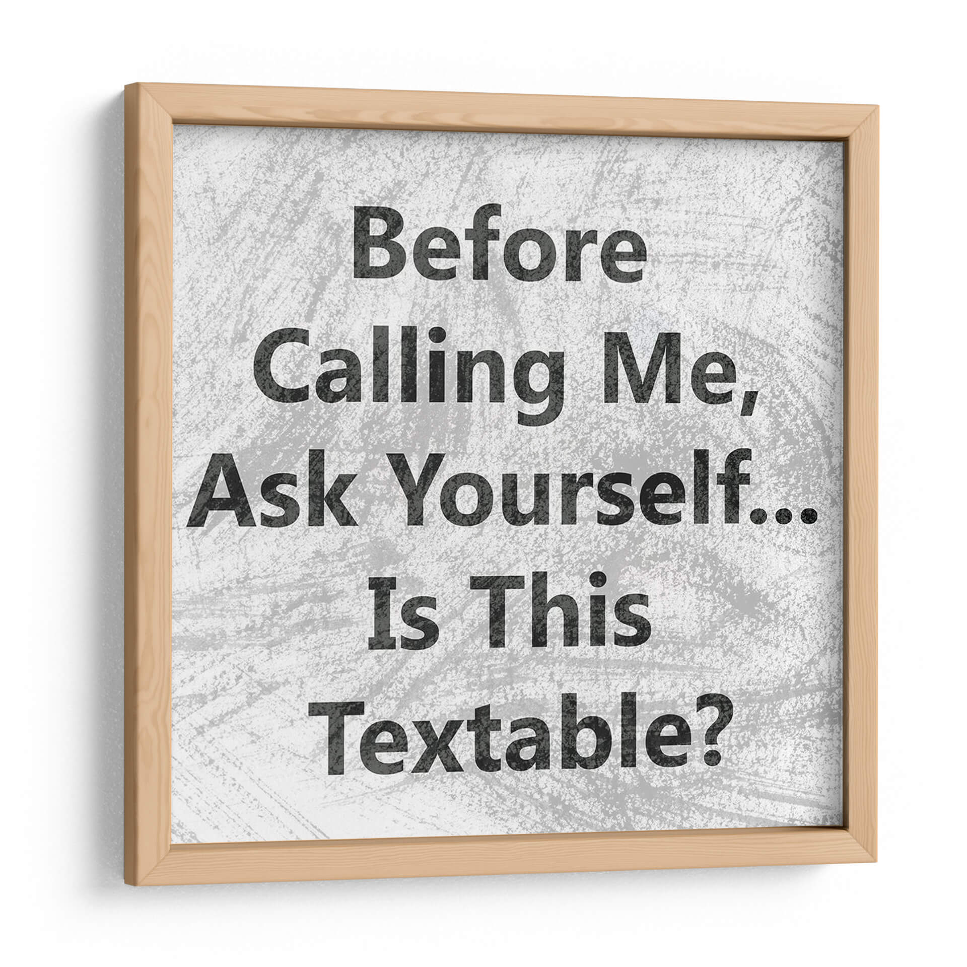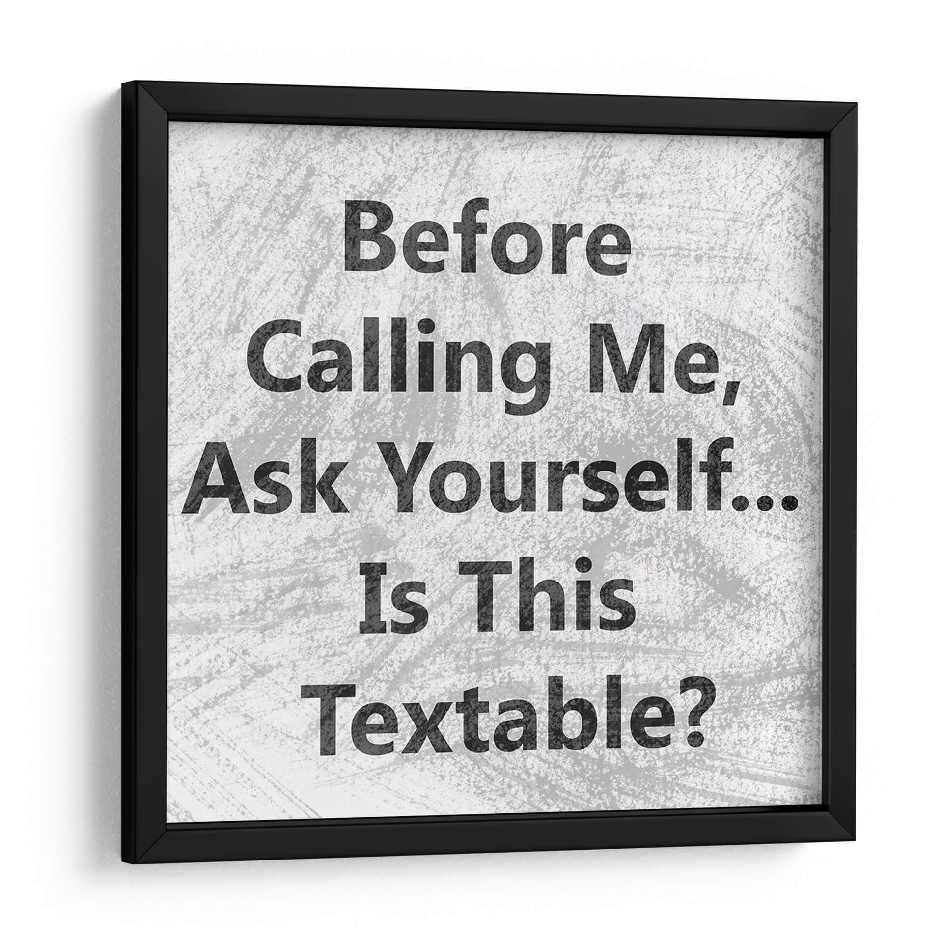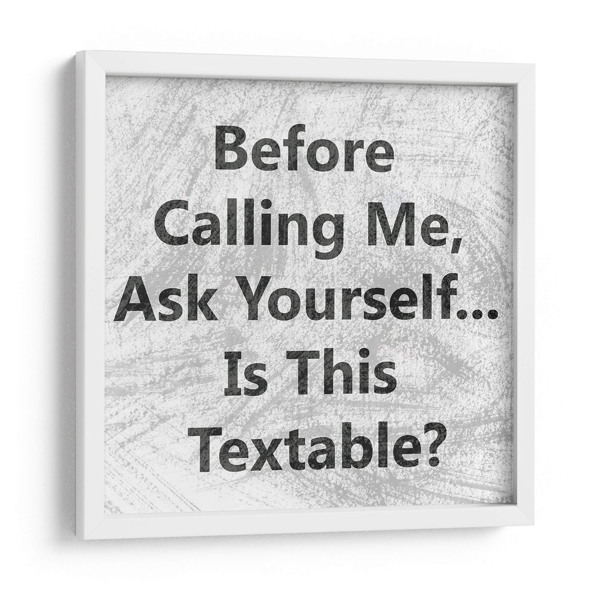 Transforma tu espacio con el cuadro decorativo "Teléfono Snark II" de Sharon Chandler. Esta obra de arte contemporáneo, con su audaz tipografía en blanco y negro, invita a la reflexión y al humor sutil. El diseño minimalista se centra en la pregunta intrigante: "Before Calling Me, Ask Yourself... Is This Textable?". La paleta de colores neutros y la textura de fondo crean un ambiente moderno y versátil, perfecto para cualquier decoración. Ideal para oficinas, estudios o cualquier rincón donde se aprecie un toque de ingenio y personalidad. Este cuadro decorativo no solo añade un punto focal visual, sino que también sirve como un iniciador de conversación, evocando una sensación de inteligencia y perspicacia. Su estilo gráfico y directo lo convierte en una pieza única para quienes buscan arte que desafíe y entretenga. Añade una dosis de sarcasmo inteligente a tu pared y expresa tu individualidad con esta pieza excepcional.