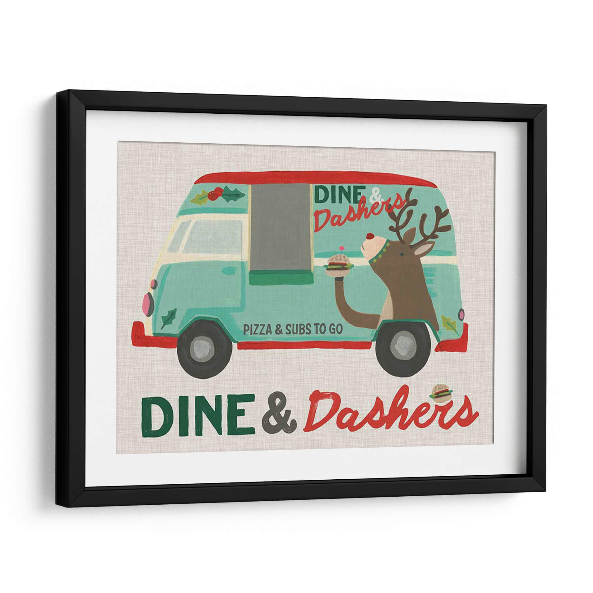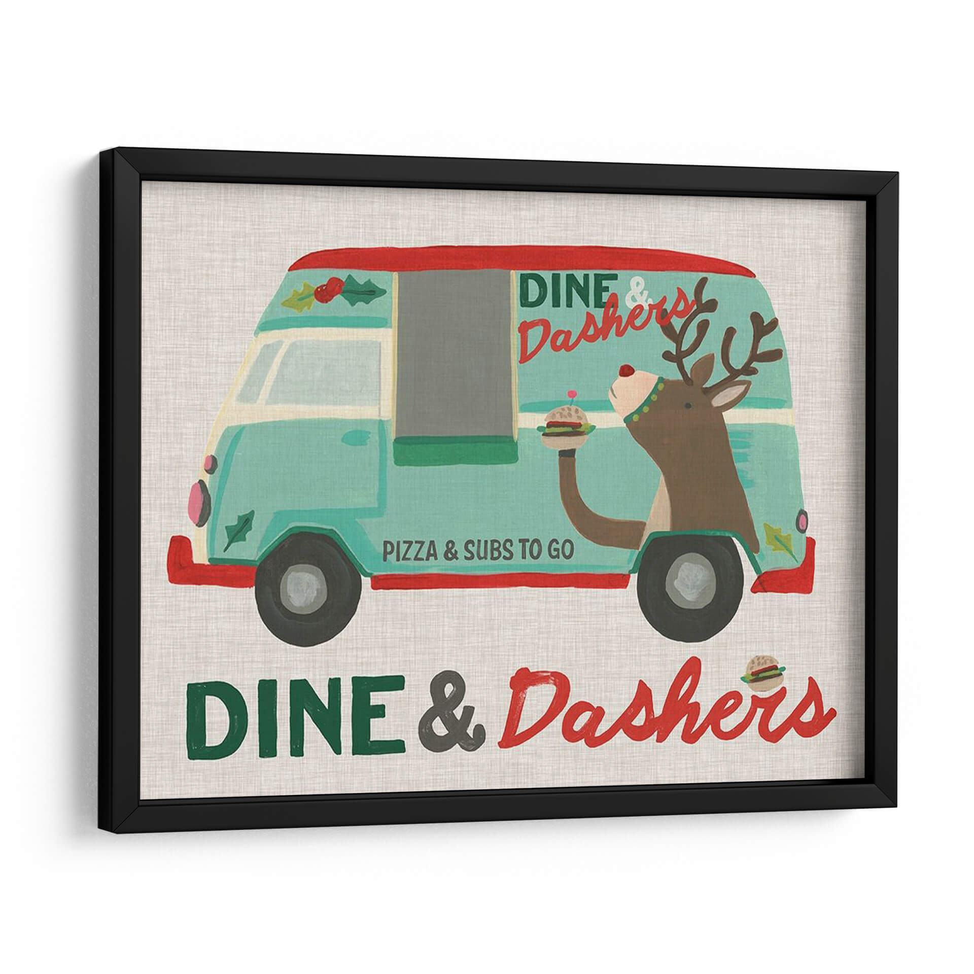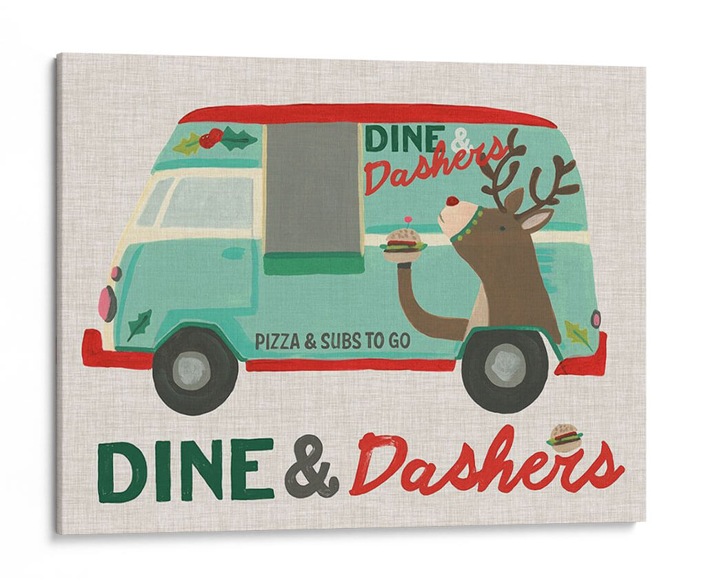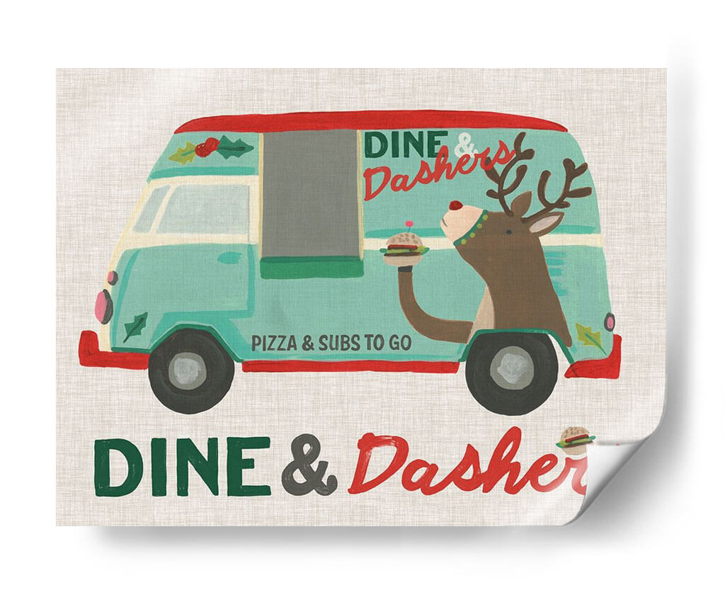 Celebra la temporada con un toque de alegría y sabor con este encantador cuadro decorativo titulado "Vacaciones De Los Camiones De Comida I" de June Erica Vess. La obra presenta un vibrante camión de comida en tonos turquesa y rojo, adornado con detalles festivos como acebo y luces, que evoca una sensación de calidez y celebración. Un simpático reno, con su cornamenta destacando, emerge del camión ofreciendo una hamburguesa, creando una escena lúdica y acogedora. Las letras "DINE & Dashers" en la parte superior y inferior de la pieza, junto con la frase "PIZZA & SUBS TO GO", añaden un toque nostálgico y divertido que recuerda a las clásicas caravanas de comida. La paleta de colores, dominada por el turquesa, el rojo festivo, el marrón del reno y el gris del fondo, crea una atmósfera alegre y desenfadada. Este cuadro es ideal para añadir un toque de humor y espíritu navideño a cocinas, comedores, o incluso como un elemento decorativo singular en espacios comerciales que busquen una identidad amigable y festiva. Su estilo pictórico y la temática única lo convierten en una pieza de conversación perfecta para aquellos que aprecian el arte con personalidad y un guiño a la cultura popular.
