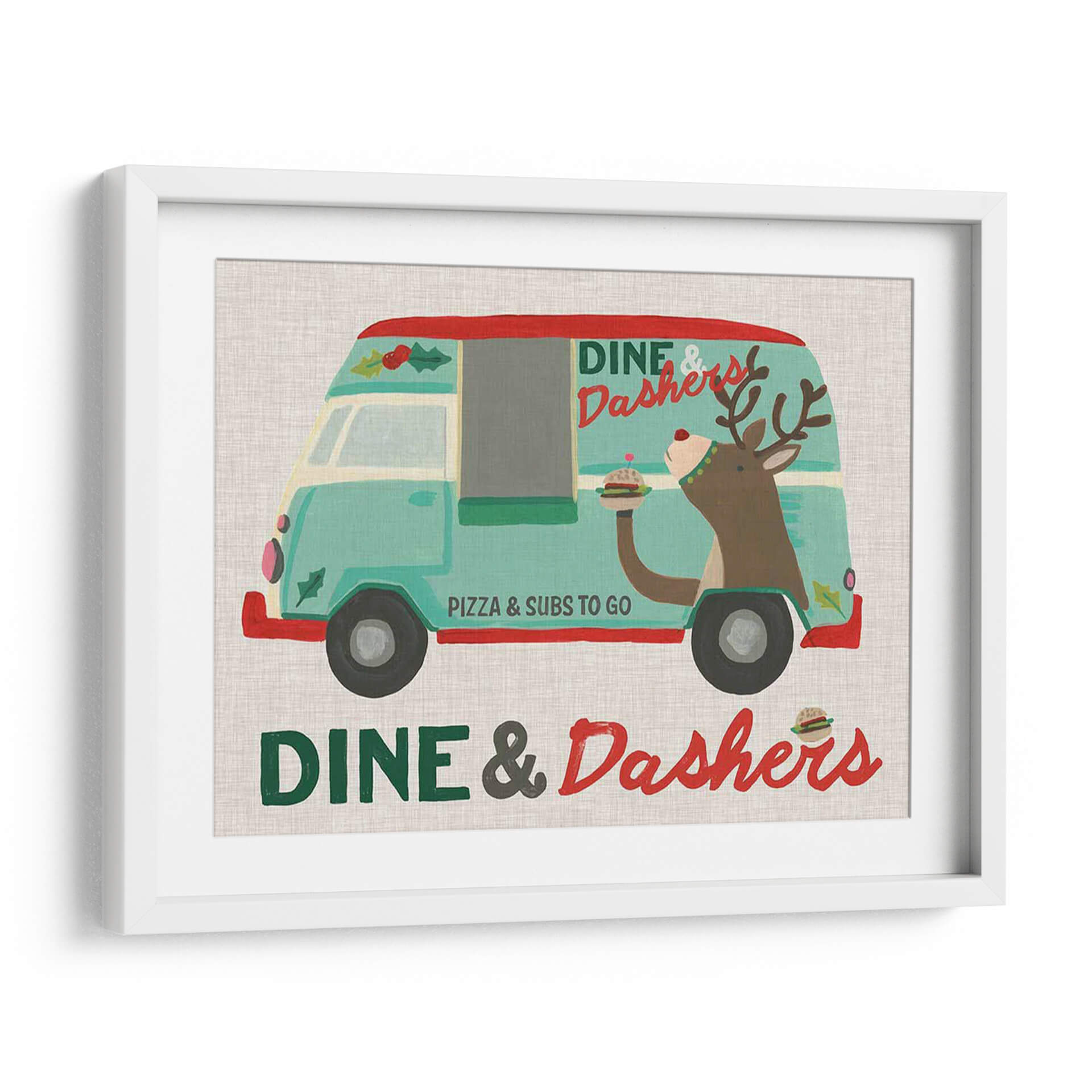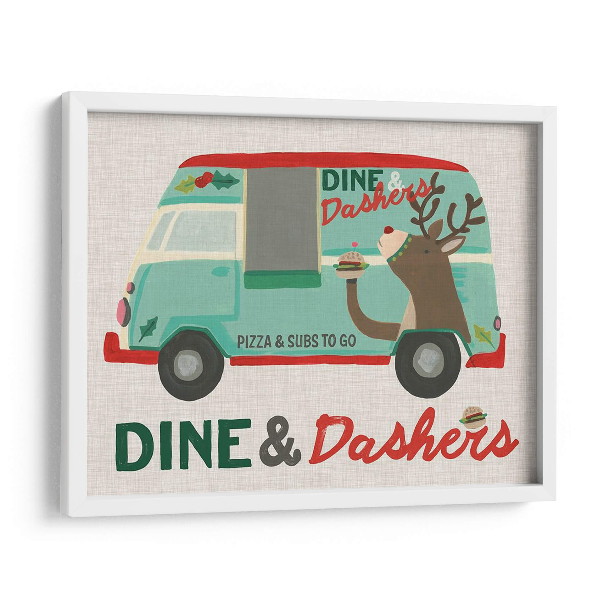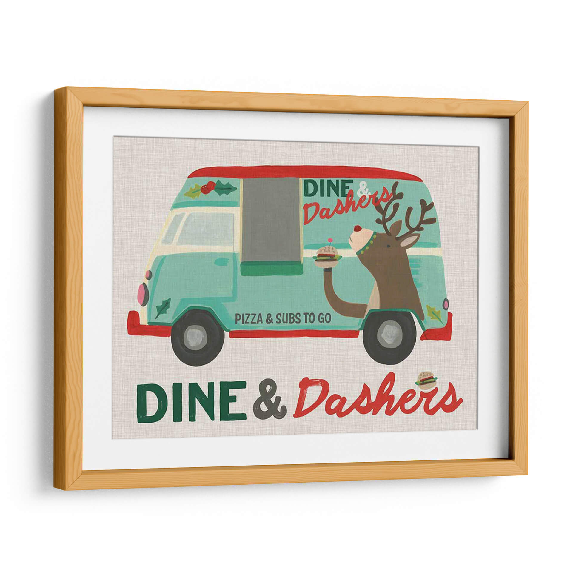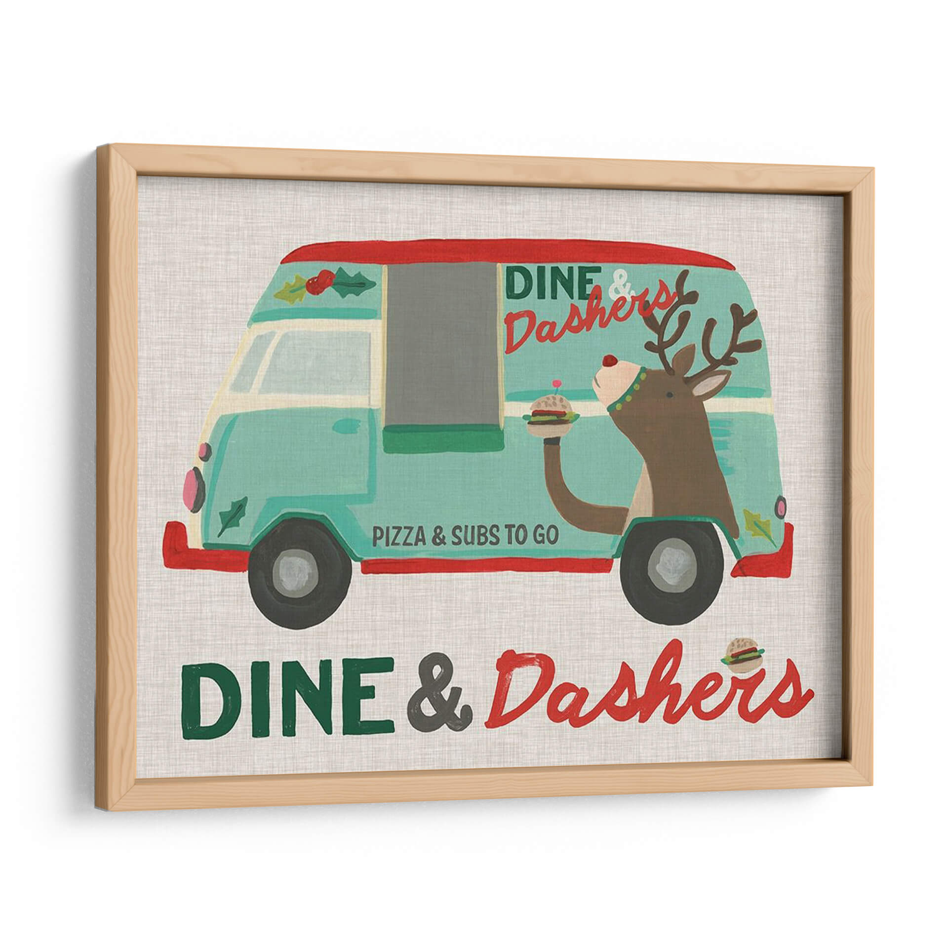 Celebra la temporada con un toque de alegría y sabor con este encantador cuadro decorativo titulado "Vacaciones De Los Camiones De Comida I" de June Erica Vess. La obra presenta un vibrante camión de comida en tonos turquesa y rojo, adornado con detalles festivos como acebo y luces, que evoca una sensación de calidez y celebración. Un simpático reno, con su cornamenta destacando, emerge del camión ofreciendo una hamburguesa, creando una escena lúdica y acogedora. Las letras "DINE & Dashers" en la parte superior y inferior de la pieza, junto con la frase "PIZZA & SUBS TO GO", añaden un toque nostálgico y divertido que recuerda a las clásicas caravanas de comida. La paleta de colores, dominada por el turquesa, el rojo festivo, el marrón del reno y el gris del fondo, crea una atmósfera alegre y desenfadada. Este cuadro es ideal para añadir un toque de humor y espíritu navideño a cocinas, comedores, o incluso como un elemento decorativo singular en espacios comerciales que busquen una identidad amigable y festiva. Su estilo pictórico y la temática única lo convierten en una pieza de conversación perfecta para aquellos que aprecian el arte con personalidad y un guiño a la cultura popular.