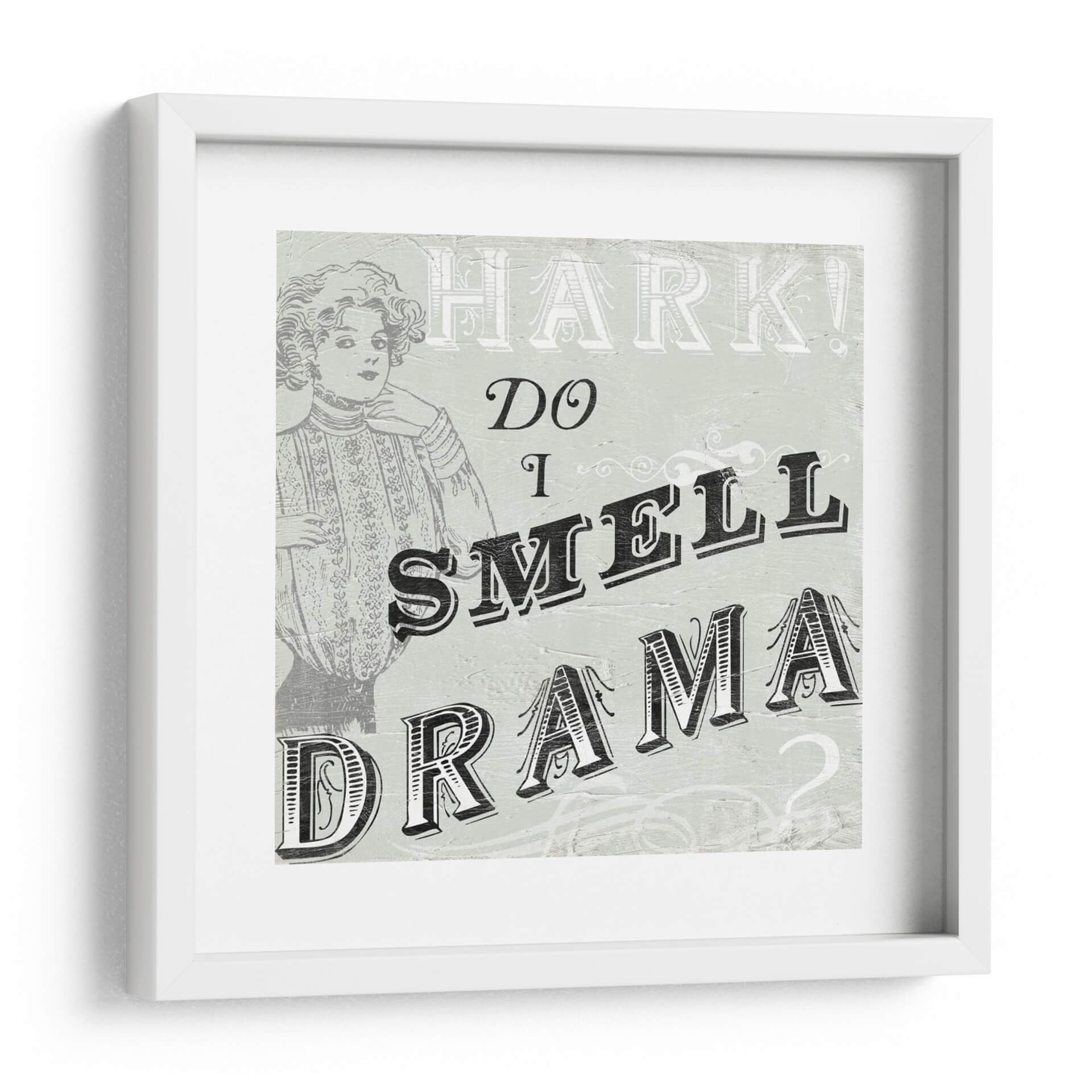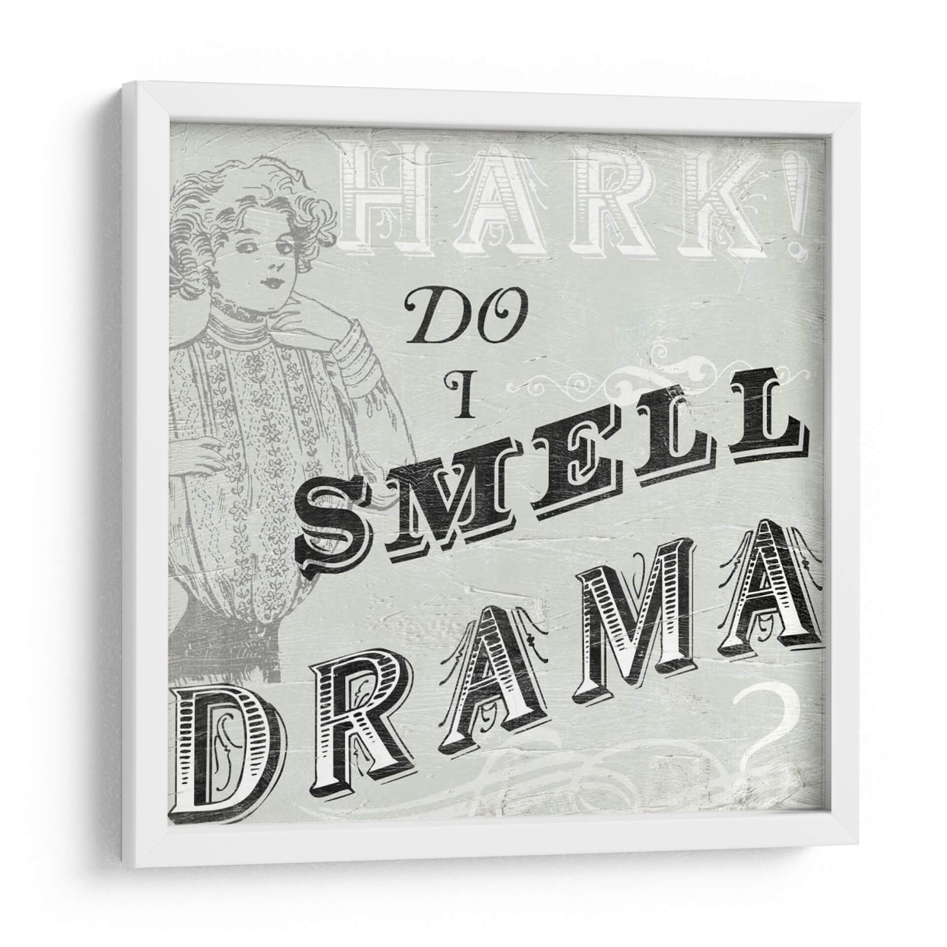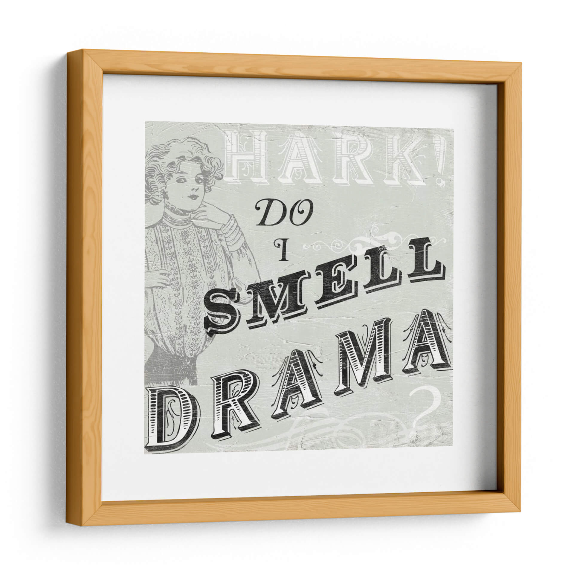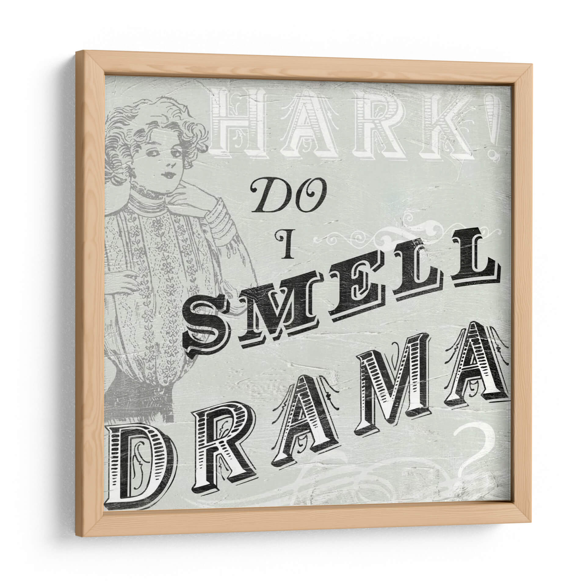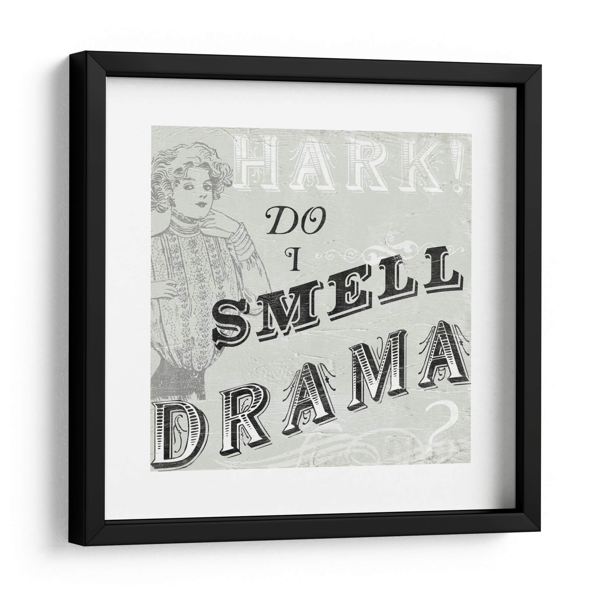 Este cautivador cuadro decorativo, titulado "Victorian Snark I" por June Erica Vess, evoca una atmósfera de intriga y humor sutil, perfecta para añadir personalidad a tu espacio. La obra presenta una figura femenina de estilo victoriano en tonos grises, con detalles intrincados en su vestimenta, que parece cuestionar con una mirada pícara. Sobre un fondo texturizado en un suave tono verdoso, resaltan las palabras "HARK! DO I SMELL DRAMA" en una tipografía audaz y contrastante. La composición juega con la yuxtaposición de la elegancia retro y un mensaje contemporáneo, creando una pieza que invita a la reflexión y a la sonrisa. Ideal para salones, estudios u oficinas, este cuadro decorativo de estilo vintage-chic añadirá un toque de sofisticación con un guiño divertido. Su paleta de colores limitada y el uso de texturas le confieren una profundidad visual única, haciéndolo un punto focal interesante sin abrumar el espacio. Un detalle de decoración que destaca por su originalidad y su capacidad para generar conversación, aportando un carácter distintivo a cualquier ambiente.