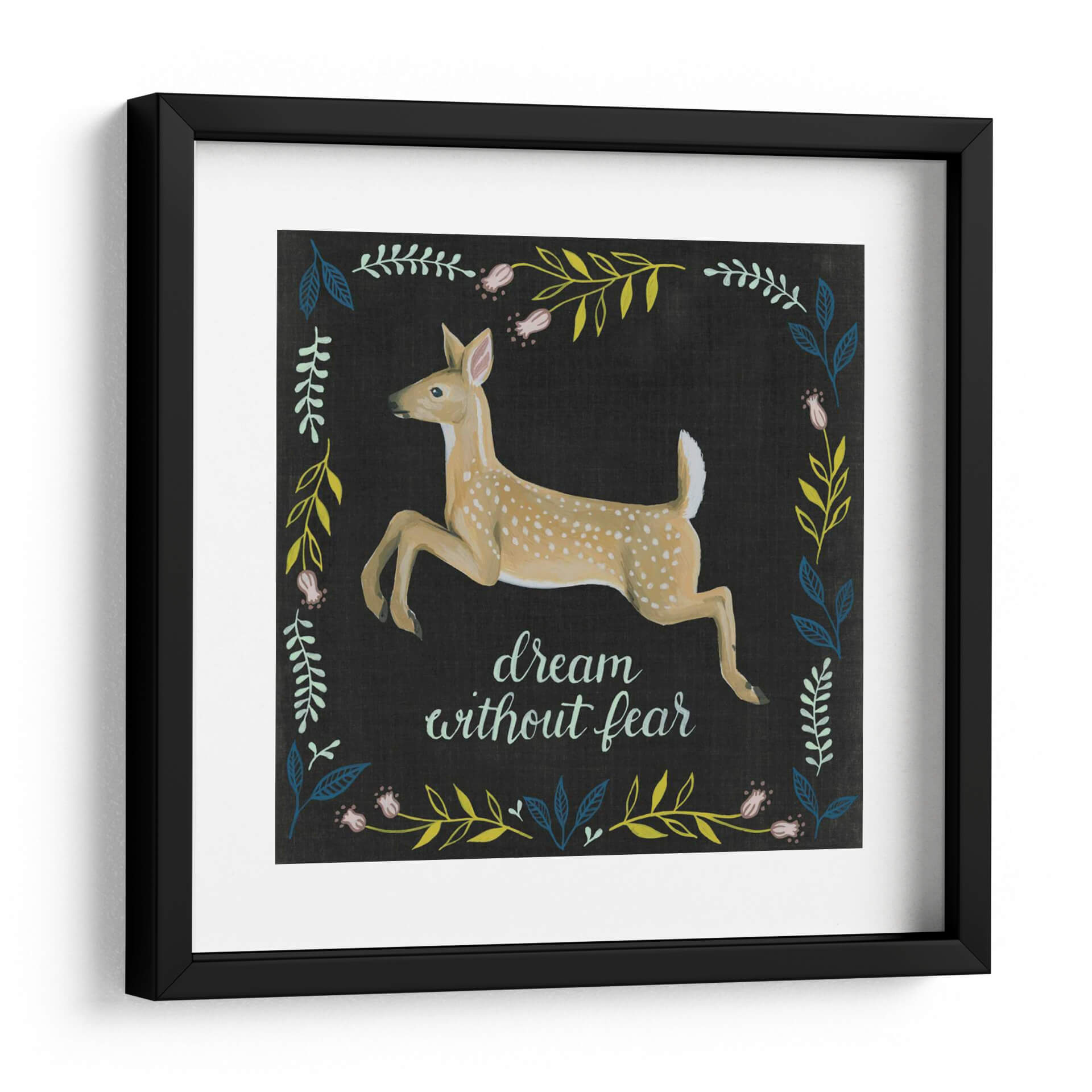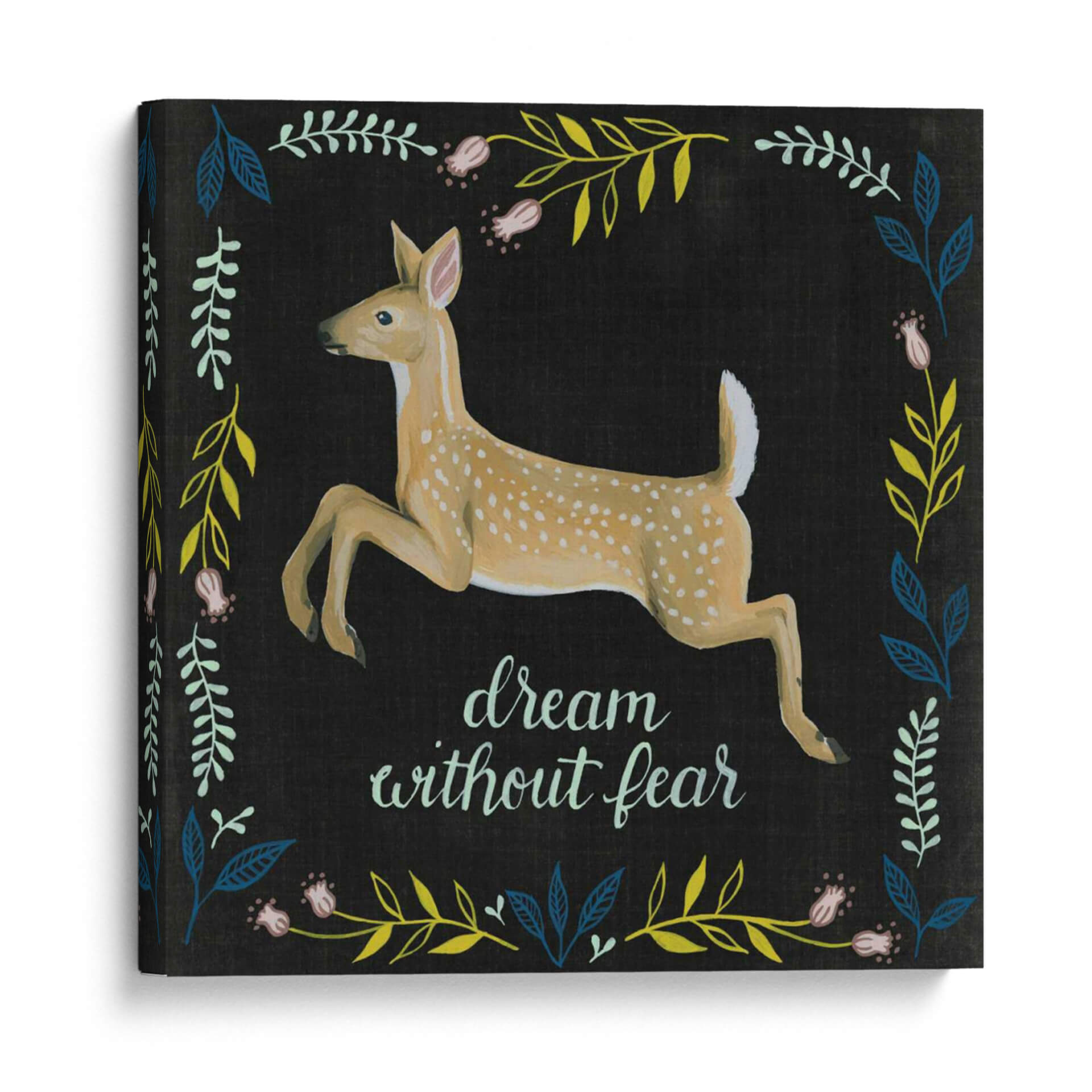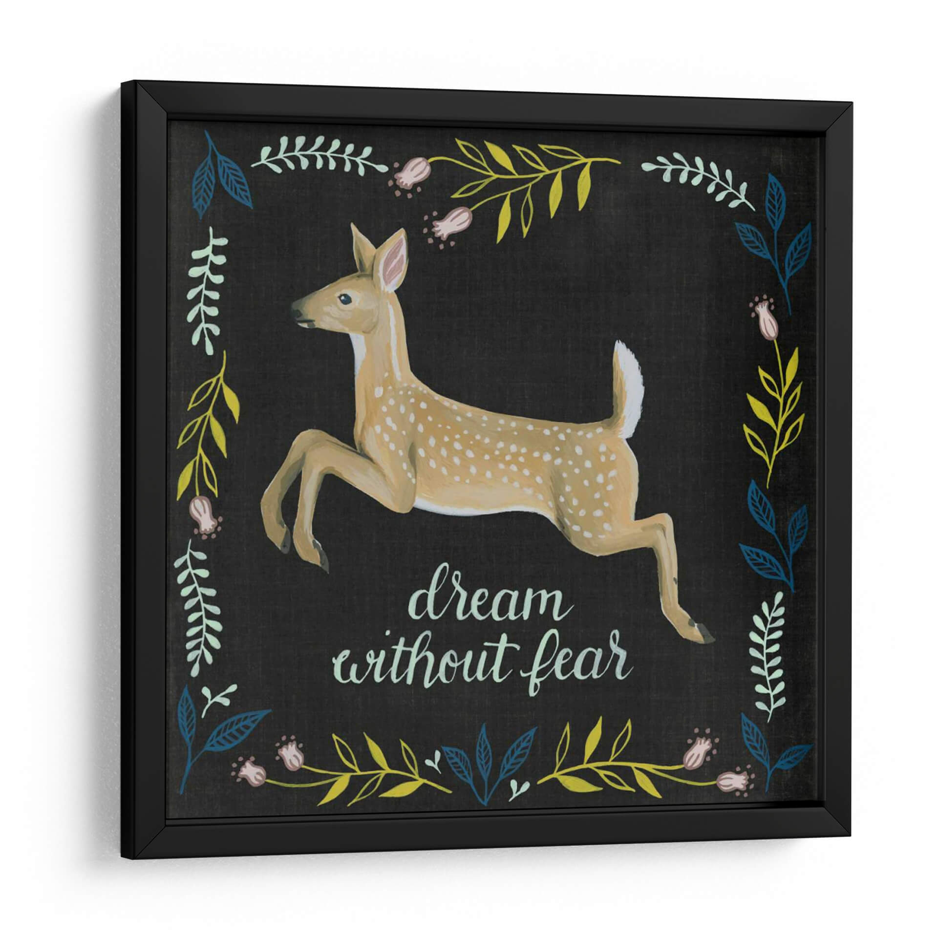 Embárcate en una 'Aventura en el Bosque' con este cautivador cuadro decorativo de Grace Popp, que presenta un tierno cervatillo en pleno salto, enmarcado por una exuberante vegetación y delicadas flores sobre un fondo oscuro y atmosférico. La obra evoca una sensación de ensueño y valentía, invitando a "soñar sin miedo" a través de su enigmático mensaje y su estilo artístico único. La paleta de colores, dominada por tonos tierra y acentos vibrantes de azul y amarillo, crea un contraste visual impactante y añade profundidad a la composición. La representación estilizada del cervatillo y los elementos botánicos aporta un toque moderno y encantador, ideal para infundir serenidad y un espíritu aventurero en cualquier espacio. Este cuadro es perfecto para añadir personalidad a una habitación infantil, un rincón de lectura acogedor o como un punto focal inspirador en una sala de estar o estudio. Su diseño versátil se adapta a decoraciones contemporáneas, bohemias o rústicas, transformando tu hogar en un refugio de creatividad y optimismo.