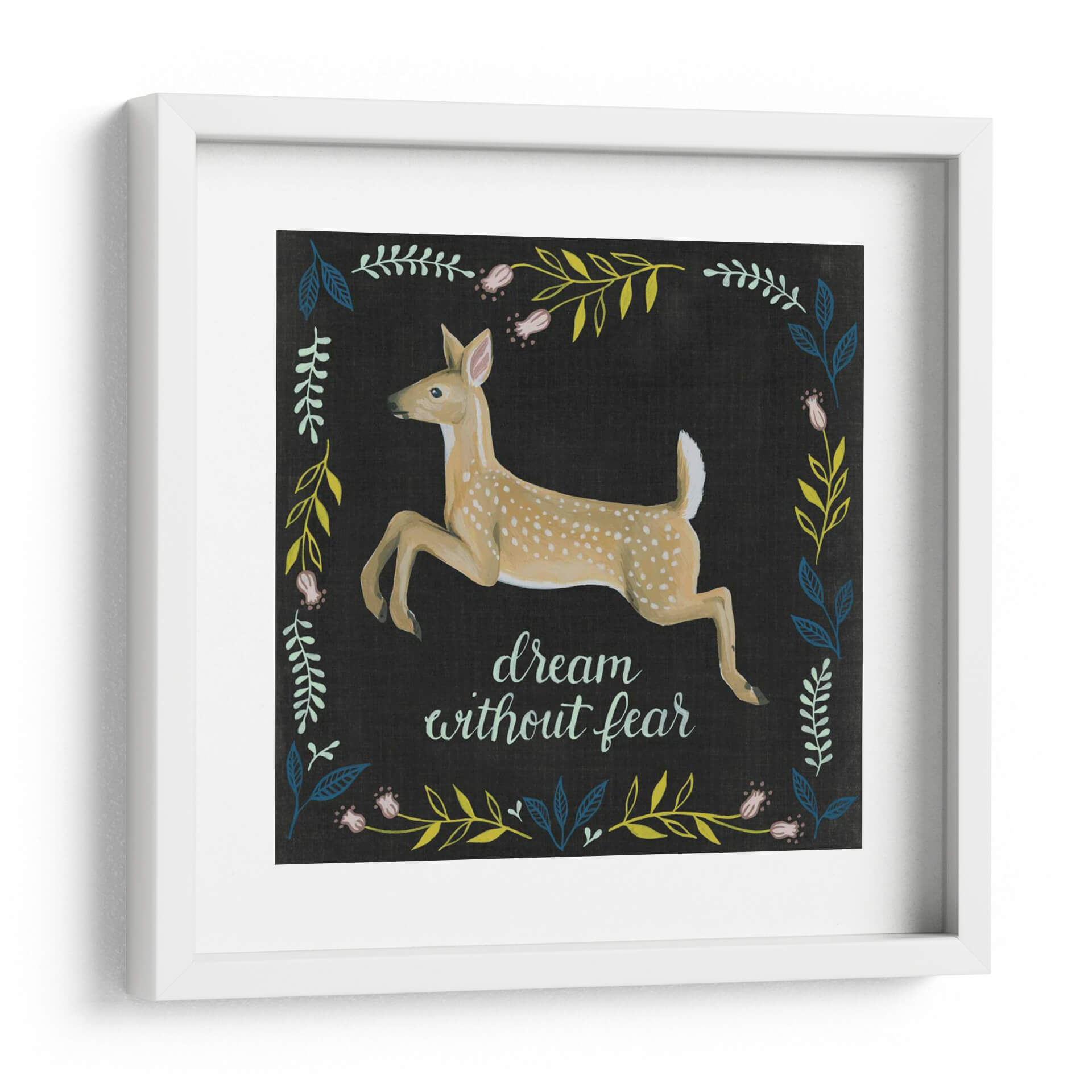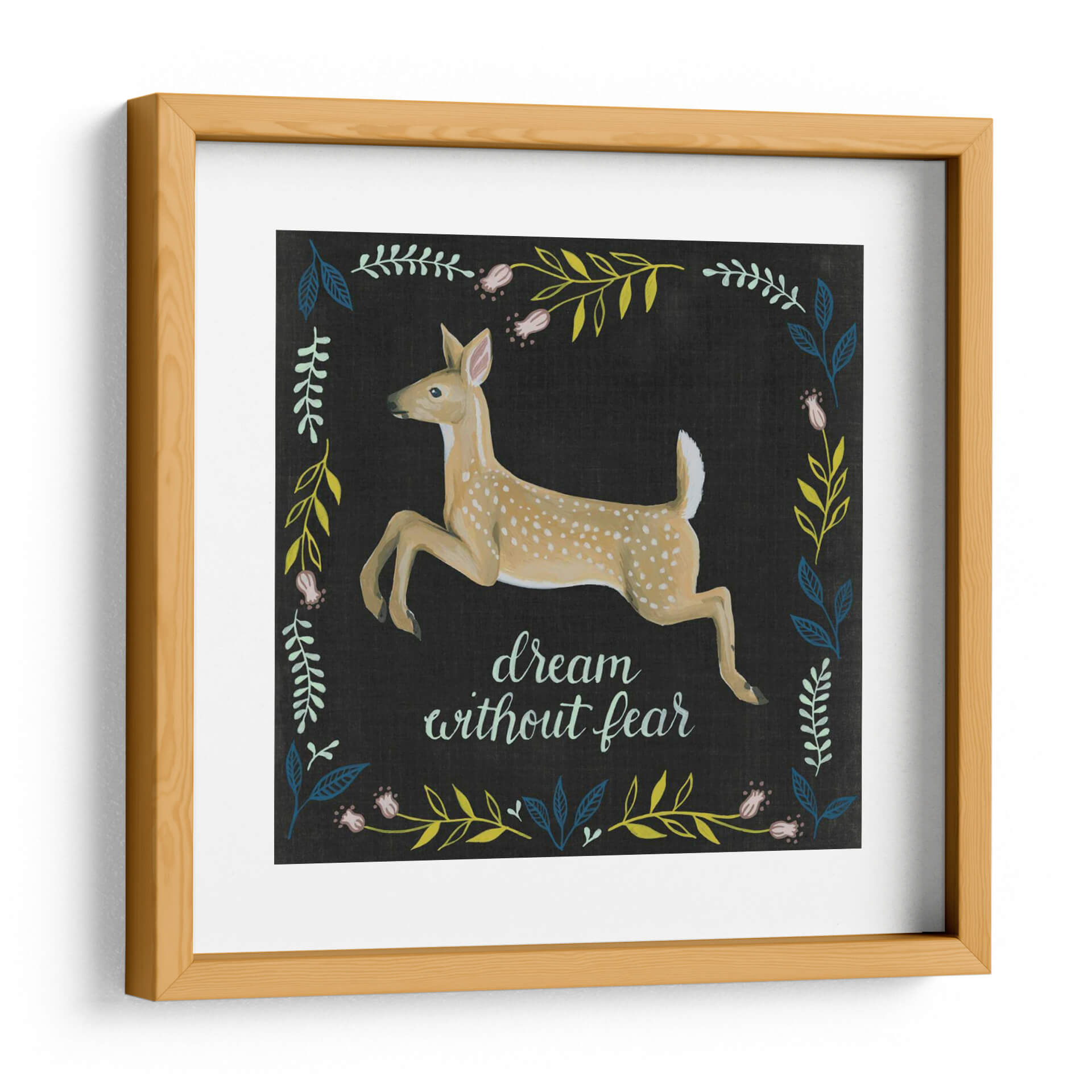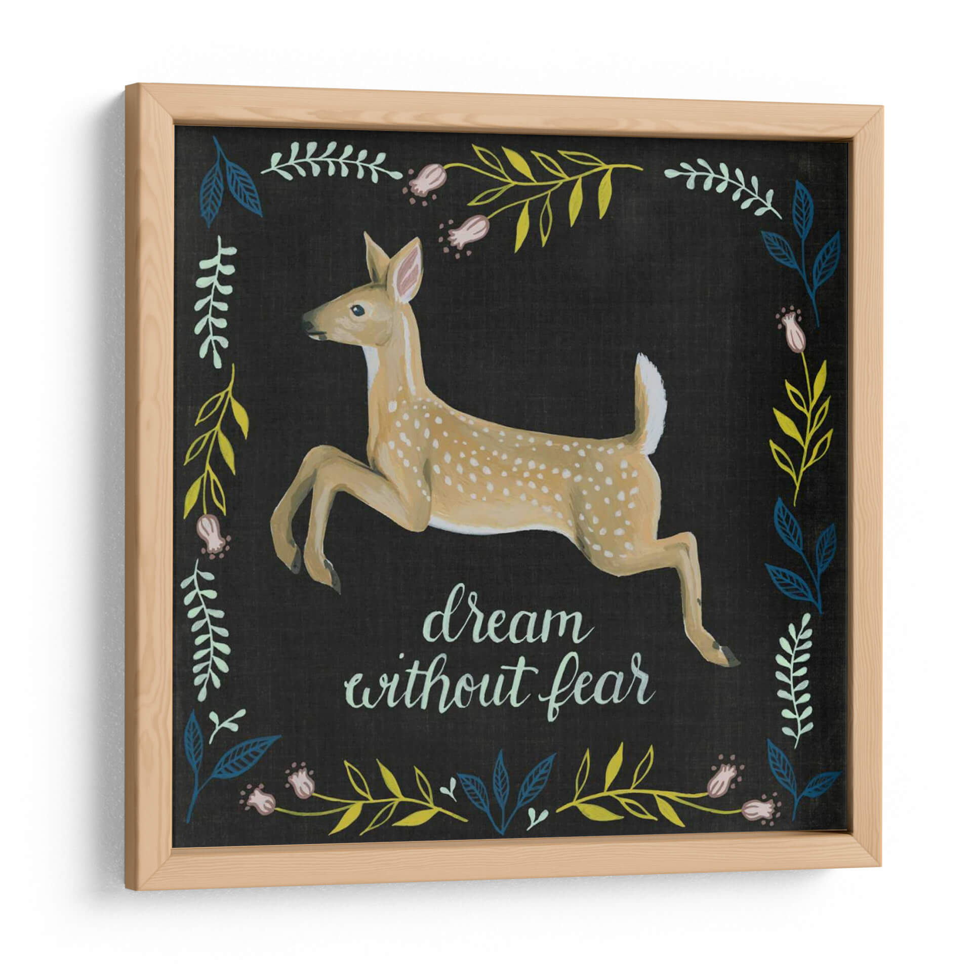 Embárcate en una 'Aventura en el Bosque' con este cautivador cuadro decorativo de Grace Popp, que presenta un tierno cervatillo en pleno salto, enmarcado por una exuberante vegetación y delicadas flores sobre un fondo oscuro y atmosférico. La obra evoca una sensación de ensueño y valentía, invitando a "soñar sin miedo" a través de su enigmático mensaje y su estilo artístico único. La paleta de colores, dominada por tonos tierra y acentos vibrantes de azul y amarillo, crea un contraste visual impactante y añade profundidad a la composición. La representación estilizada del cervatillo y los elementos botánicos aporta un toque moderno y encantador, ideal para infundir serenidad y un espíritu aventurero en cualquier espacio. Este cuadro es perfecto para añadir personalidad a una habitación infantil, un rincón de lectura acogedor o como un punto focal inspirador en una sala de estar o estudio. Su diseño versátil se adapta a decoraciones contemporáneas, bohemias o rústicas, transformando tu hogar en un refugio de creatividad y optimismo.