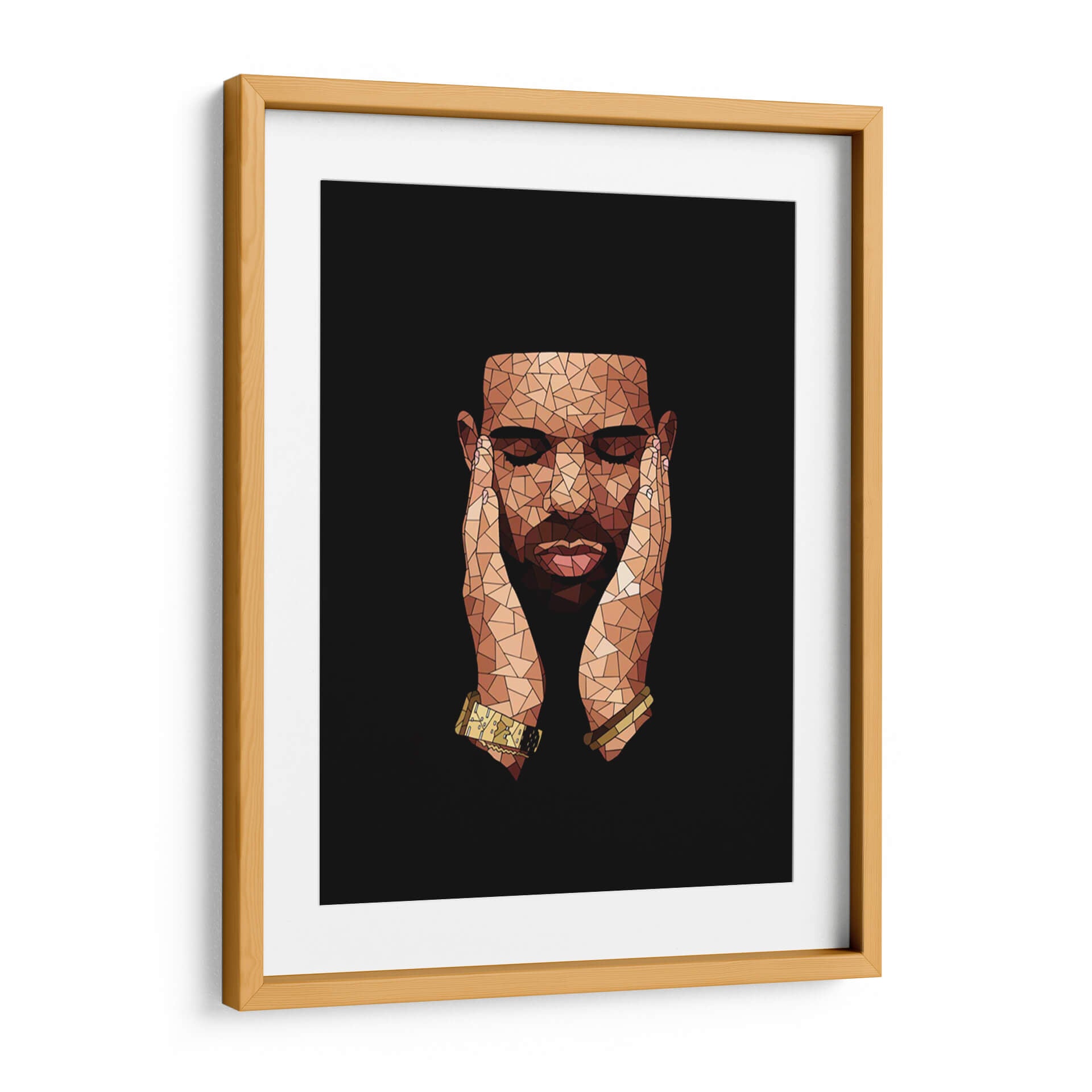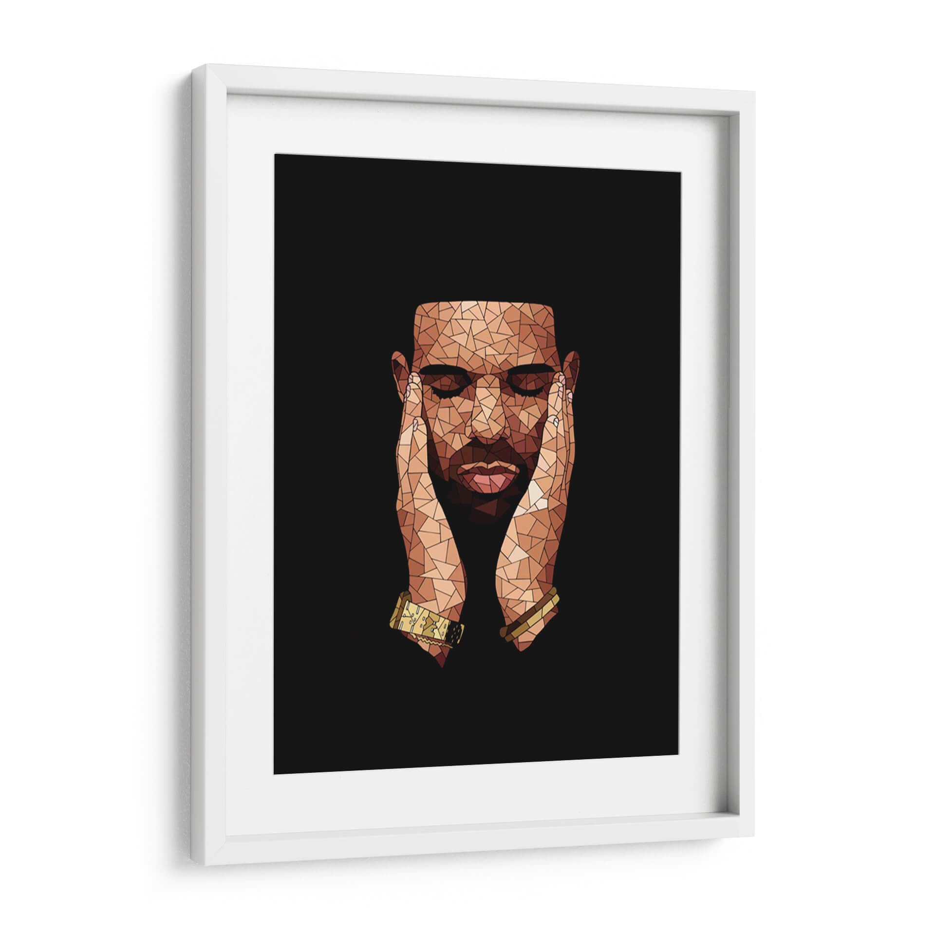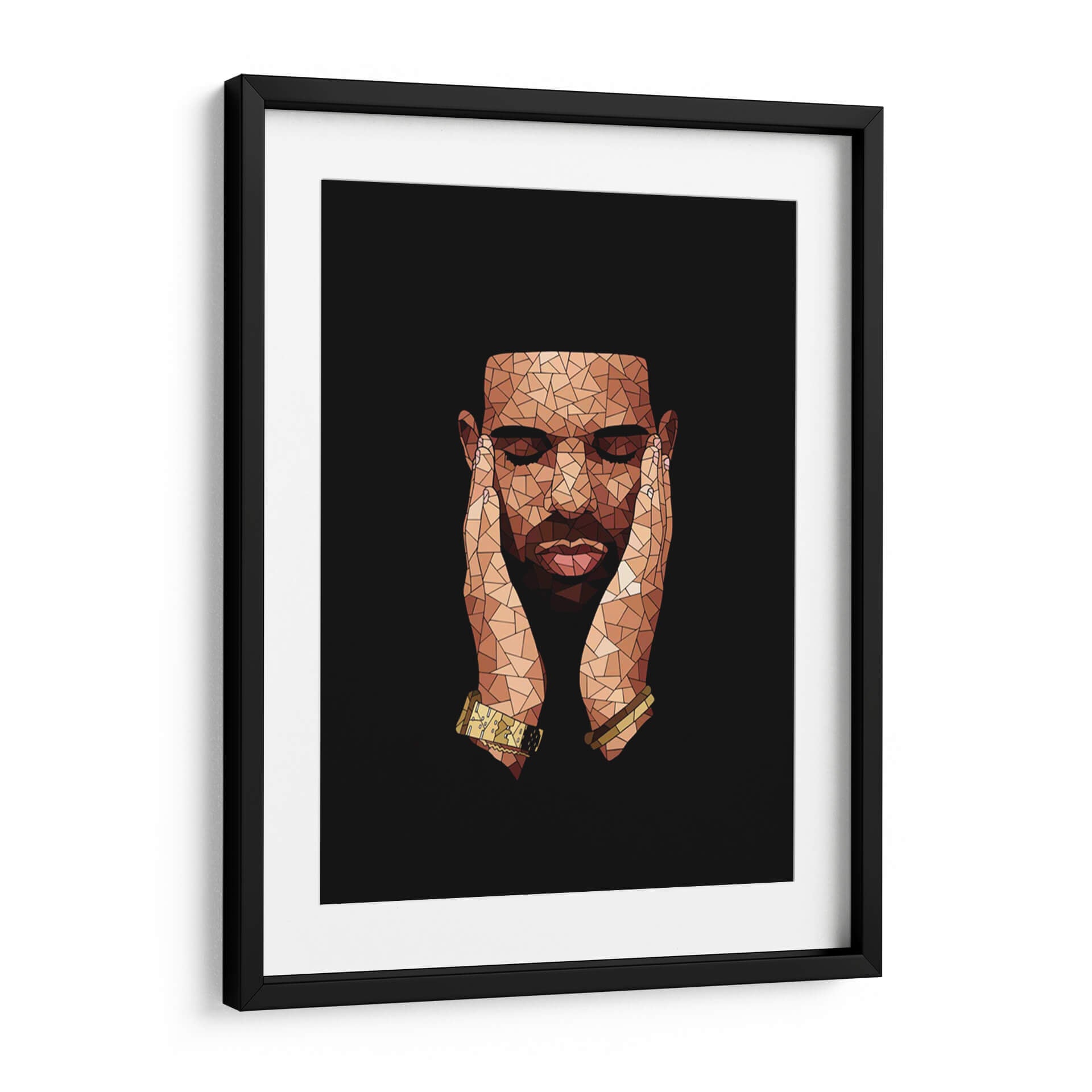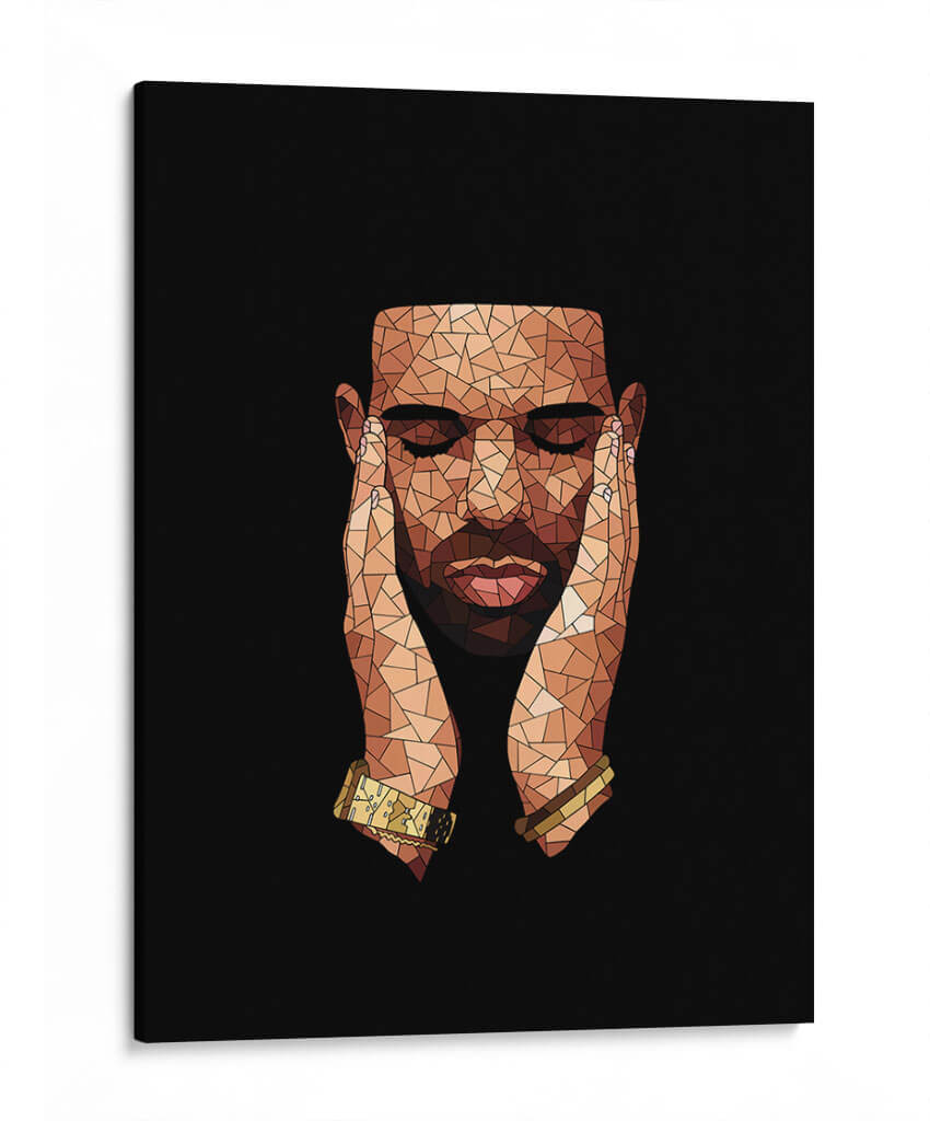 Sumérgete en la intensidad emocional de "Drake Mosaic", una obra de arte digital que captura un momento de profunda introspección. Este cuadro decorativo presenta un retrato estilizado del artista, con los ojos cerrados y las manos apoyando las sienes, transmitiendo una sensación de concentración o quizás de agobio. La técnica de mosaico, compuesta por innumerables polígonos de tonos tierra y cálidos, crea una textura visual rica y moderna que atrae la mirada. El contraste con el fondo negro profundo acentúa la figura central, haciendo de esta pieza un punto focal magnético para cualquier espacio. Ideal para salones, estudios o dormitorios que buscan un toque de arte contemporáneo con un aire introspectivo y urbano. La paleta de colores, dominada por marrones, beiges y toques de dorado en las pulseras, añade calidez y sofisticación. "Drake Mosaic" es más que una decoración; es una declaración de estilo, una pieza que invita a la reflexión y añade carácter a tu hogar u oficina.