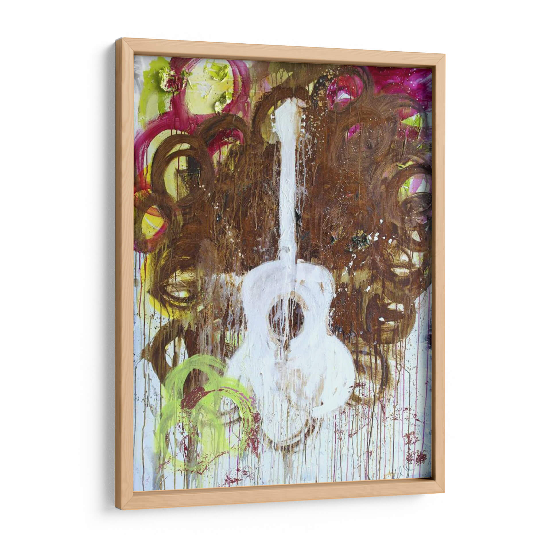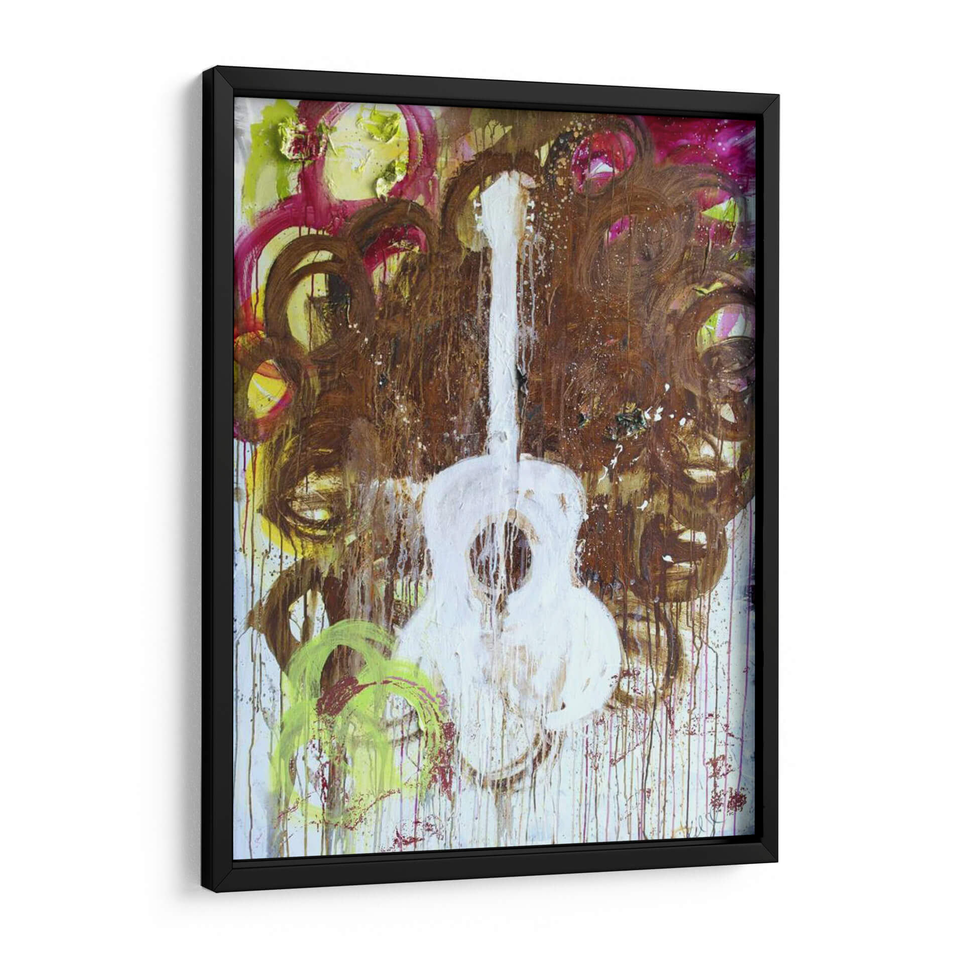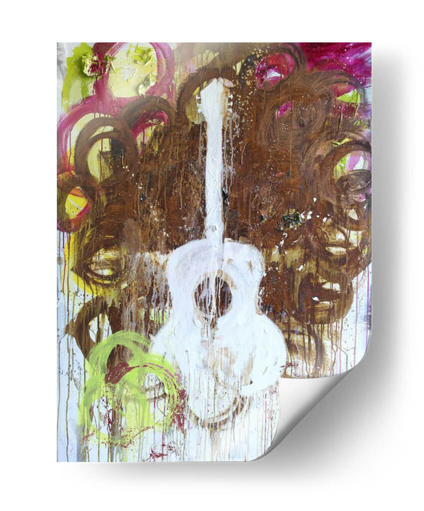 Sumérgete en la vibrante energía de "Guitarra Blanca" de Kent Youngstrom, una obra de arte contemporáneo que captura la esencia de la música con una audacia expresiva. Este cuadro decorativo presenta una representación abstracta y enérgica de una guitarra, dominada por un blanco puro que contrasta con un fondo turbulento de tonos tierra, marrones profundos, toques de fucsia y vibrantes amarillos y verdes. Las pinceladas sueltas, las gotas de pintura y las texturas ricas crean una sensación de movimiento y pasión, evocando el alma de una interpretación musical. La composición, audaz y dinámica, invita a la reflexión, mientras que la paleta de colores crea un equilibrio entre lo terrenal y lo etéreo. Ideal para espacios que buscan un toque de personalidad artística y un punto focal que inspire conversación, este lienzo es perfecto para salas de estar modernas, estudios de música o cualquier lugar donde se aprecie el arte contemporáneo audaz. Añade una dosis de carácter y emoción a tu decoración con esta pieza única.