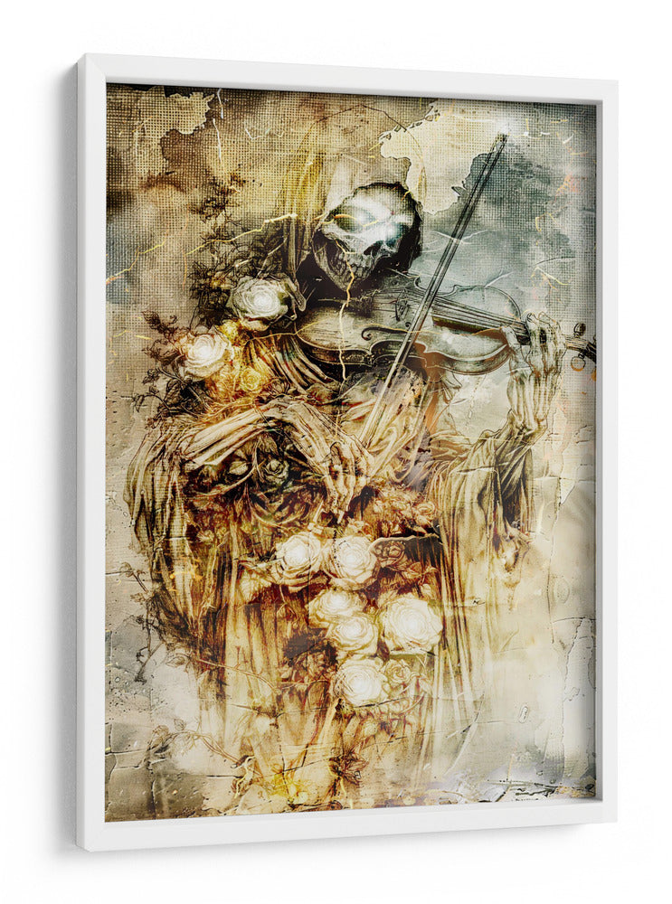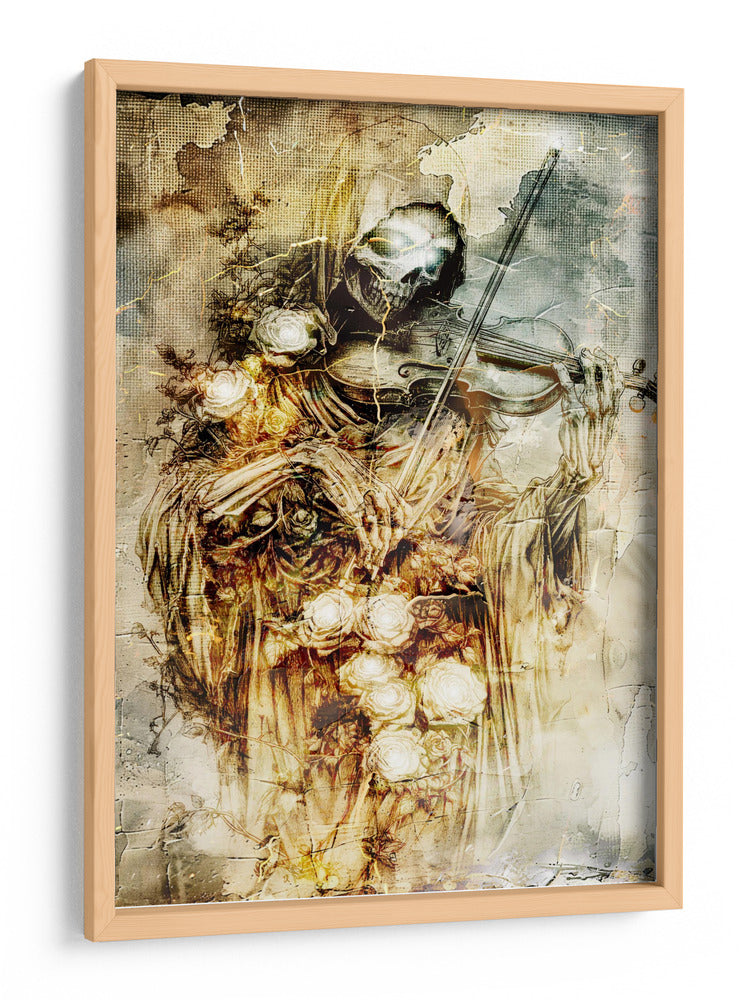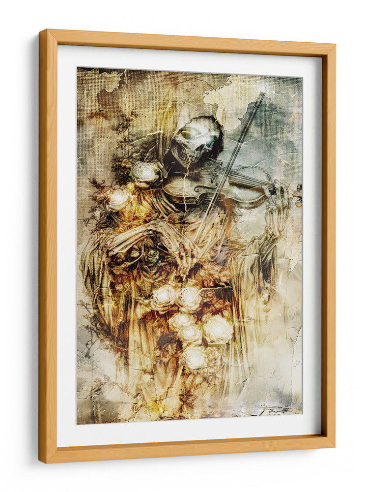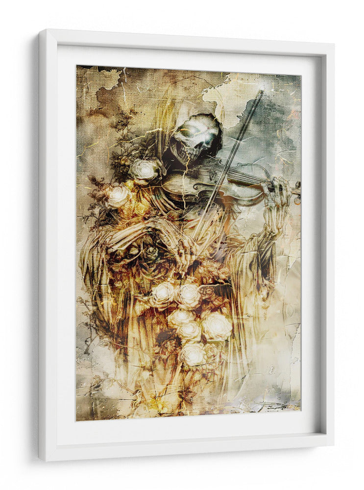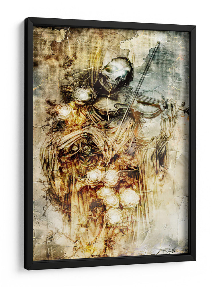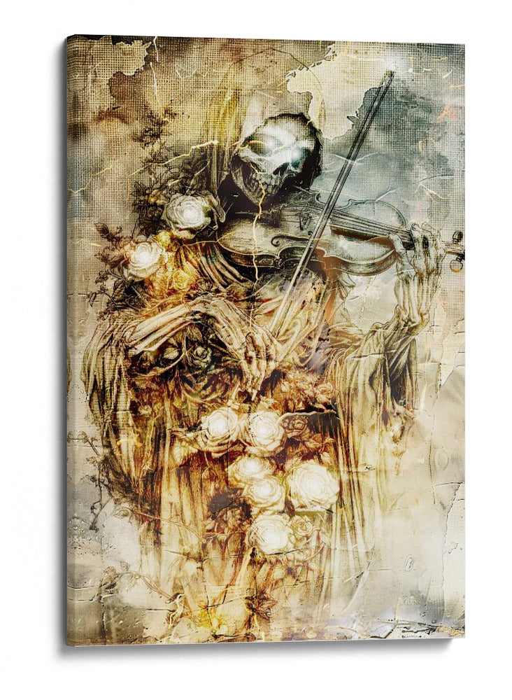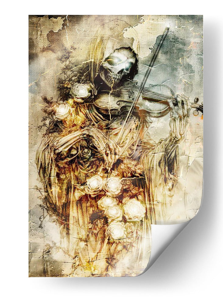 Sumérgete en la fascinante dualidad de la vida y la muerte con esta cautivadora obra de arte. La ilustración presenta una figura esquelética, evocando la imagen de la parca, tocando un violín con una delicadeza sorprendente. Rodeada de un profuso ramo de rosas blancas y amarillas, la pieza crea un contraste poético entre la fugacidad de la existencia y la belleza perdurable de la naturaleza. Los tonos ocres, dorados y grises dominan la paleta, confiriendo a la composición una atmósfera sombría pero elegante, con texturas que recuerdan a grabados antiguos y un toque de misterio gótico. El estilo detallado y la composición dramática hacen de este cuadro decorativo una pieza impactante, ideal para añadir un toque de intriga y sofisticación a tu sala de estar, estudio o cualquier espacio que busque una declaración artística audaz y reflexiva. Es una invitación a contemplar la música de la vida y su inevitable fin, todo en un solo y poderoso lienzo. Este arte de pared es perfecto para quienes aprecian lo macabro con un toque de belleza surrealista, generando conversación y admiración.