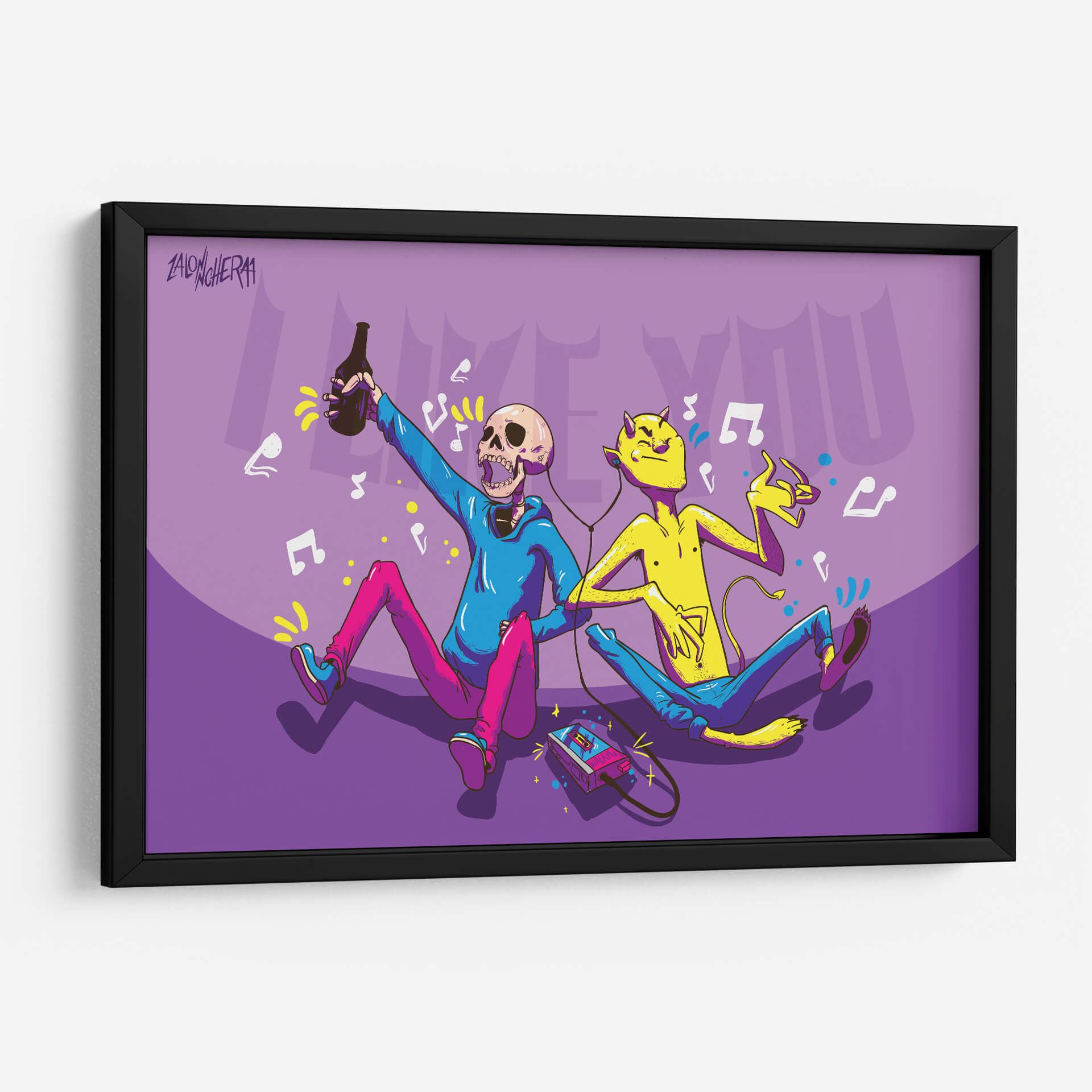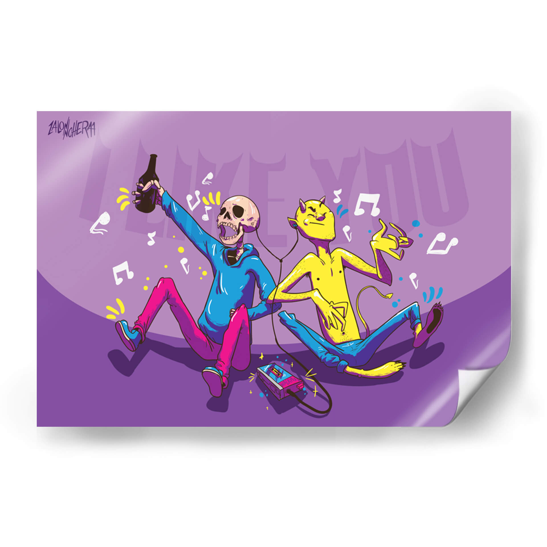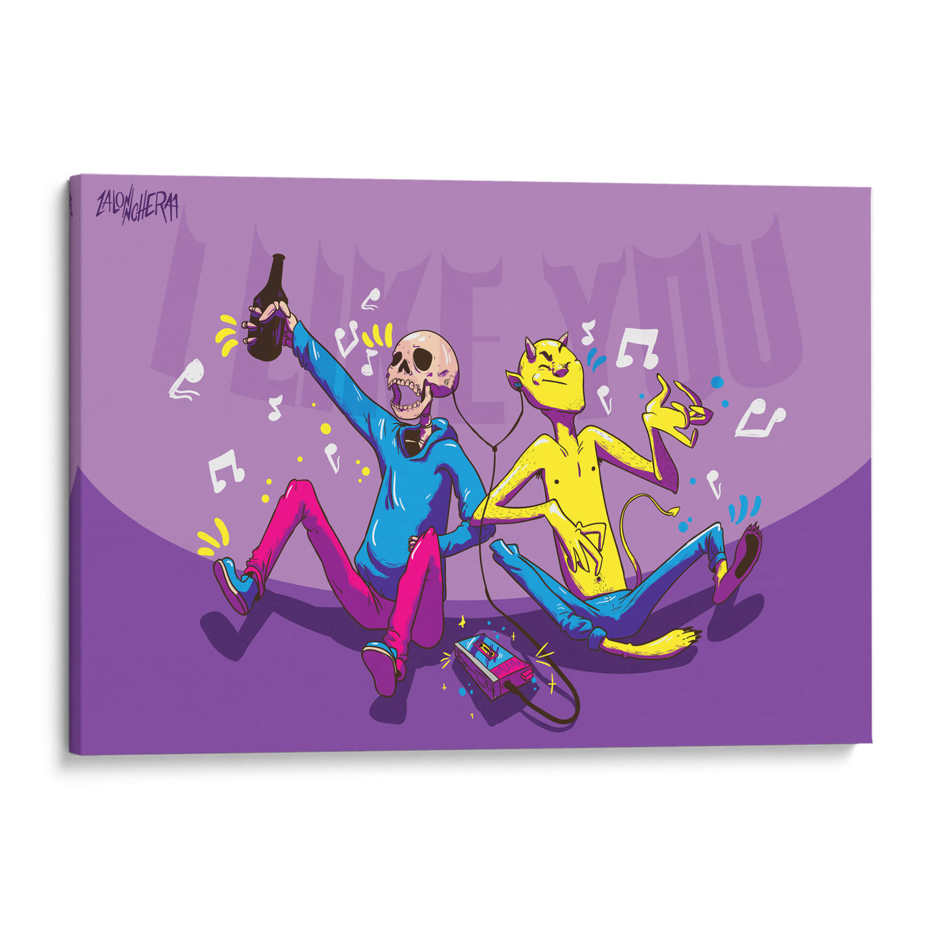 Sumérgete en la vibrante y enigmática obra "mas volumen cuando suena ..." del artista Lalonncheraa. Este cuadro decorativo captura un momento surrealista y juguetón, presentando a dos figuras inesperadas: un esqueleto con una botella en alto y un demonio con cuernos, ambos compartiendo auriculares y disfrutando de la música. La paleta de colores es audaz y contrastante, dominada por un púrpura intenso que sirve de fondo a los vibrantes azules, amarillos y rosas de los personajes y los elementos musicales dispersos. El estilo artístico, de corte contemporáneo y con influencias del cómic y el arte digital, crea una atmósfera de diversión despreocupada y un toque de rebeldía. Las notas musicales flotando en el aire refuerzan el tema central de la música y la conexión. Ideal para espacios que buscan un toque de originalidad, humor y energía, como una sala de estar moderna, un estudio de música o incluso una oficina creativa. Este cuadro decorativo es perfecto para aquellos que aprecian el arte con una narrativa intrigante y un diseño llamativo que rompe con lo convencional. Añade personalidad y conversación a tu decoración con esta pieza única.