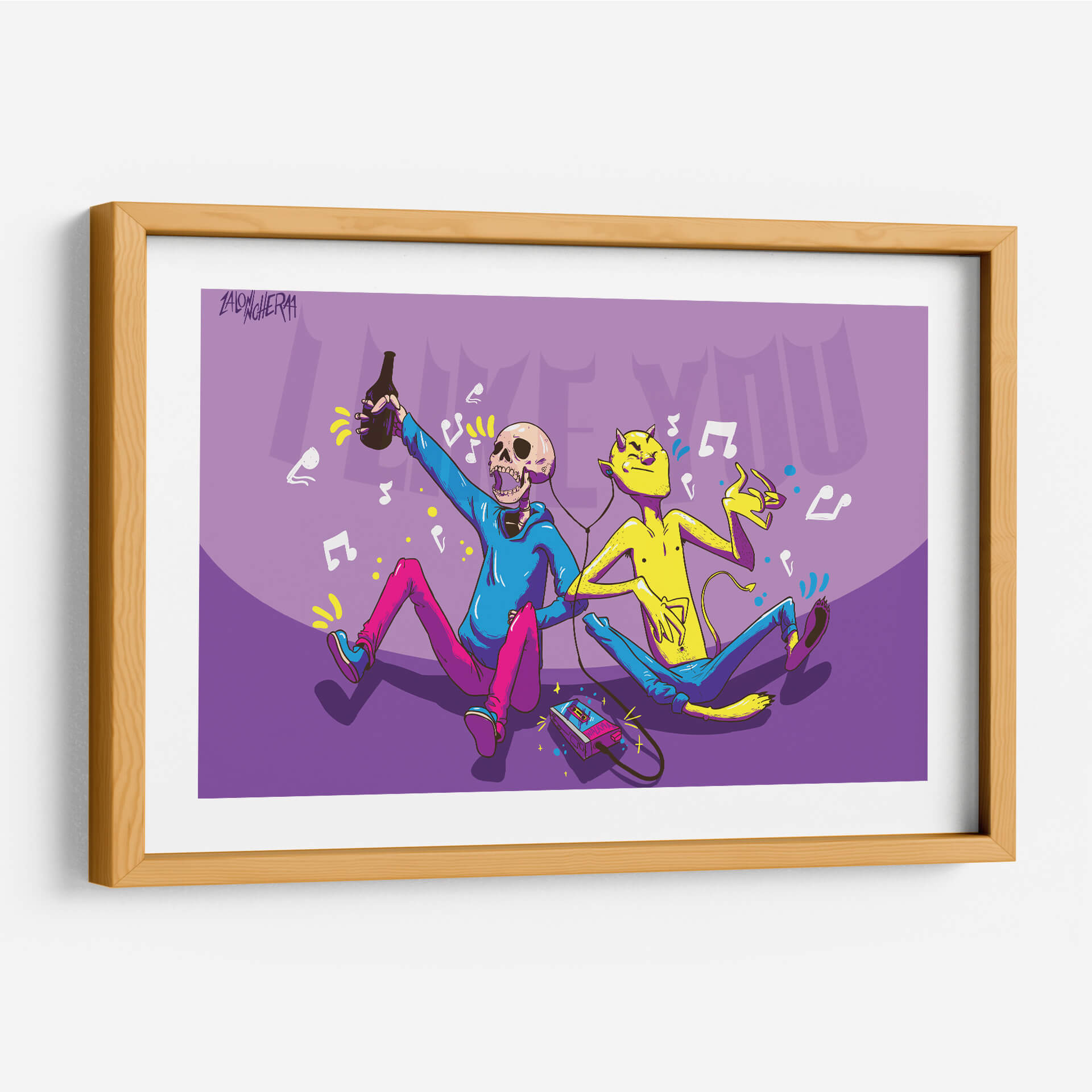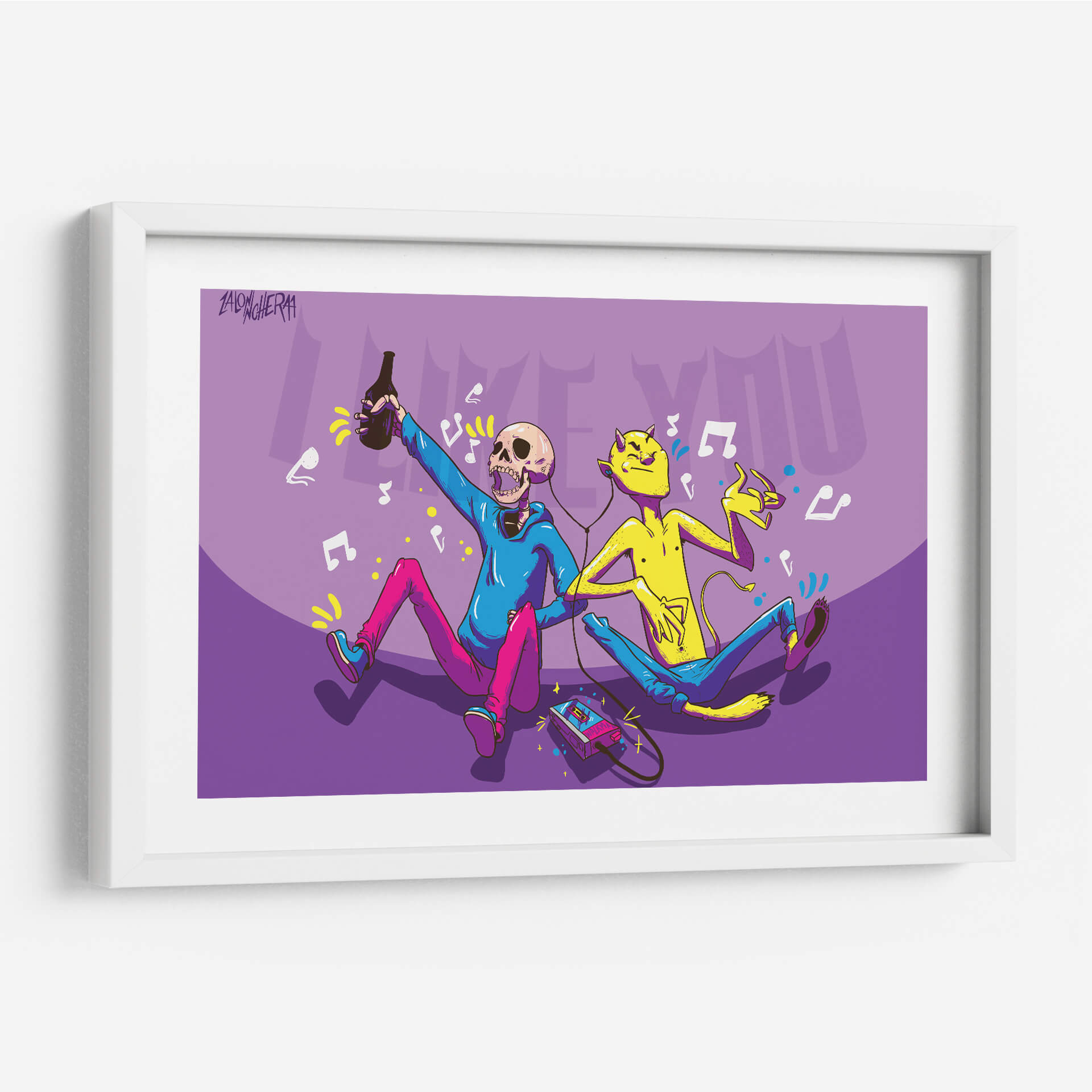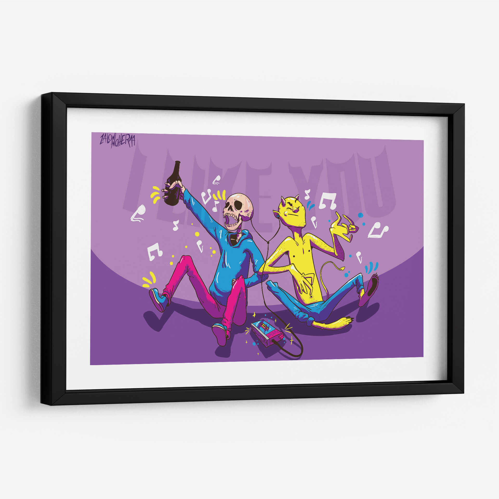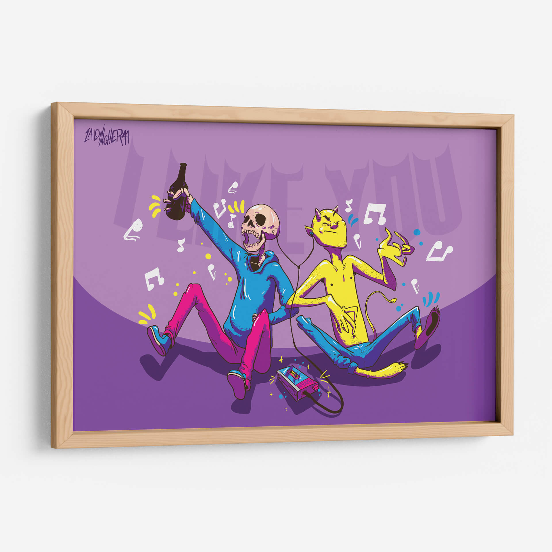 Sumérgete en la vibrante y enigmática obra "mas volumen cuando suena ..." del artista Lalonncheraa. Este cuadro decorativo captura un momento surrealista y juguetón, presentando a dos figuras inesperadas: un esqueleto con una botella en alto y un demonio con cuernos, ambos compartiendo auriculares y disfrutando de la música. La paleta de colores es audaz y contrastante, dominada por un púrpura intenso que sirve de fondo a los vibrantes azules, amarillos y rosas de los personajes y los elementos musicales dispersos. El estilo artístico, de corte contemporáneo y con influencias del cómic y el arte digital, crea una atmósfera de diversión despreocupada y un toque de rebeldía. Las notas musicales flotando en el aire refuerzan el tema central de la música y la conexión. Ideal para espacios que buscan un toque de originalidad, humor y energía, como una sala de estar moderna, un estudio de música o incluso una oficina creativa. Este cuadro decorativo es perfecto para aquellos que aprecian el arte con una narrativa intrigante y un diseño llamativo que rompe con lo convencional. Añade personalidad y conversación a tu decoración con esta pieza única.