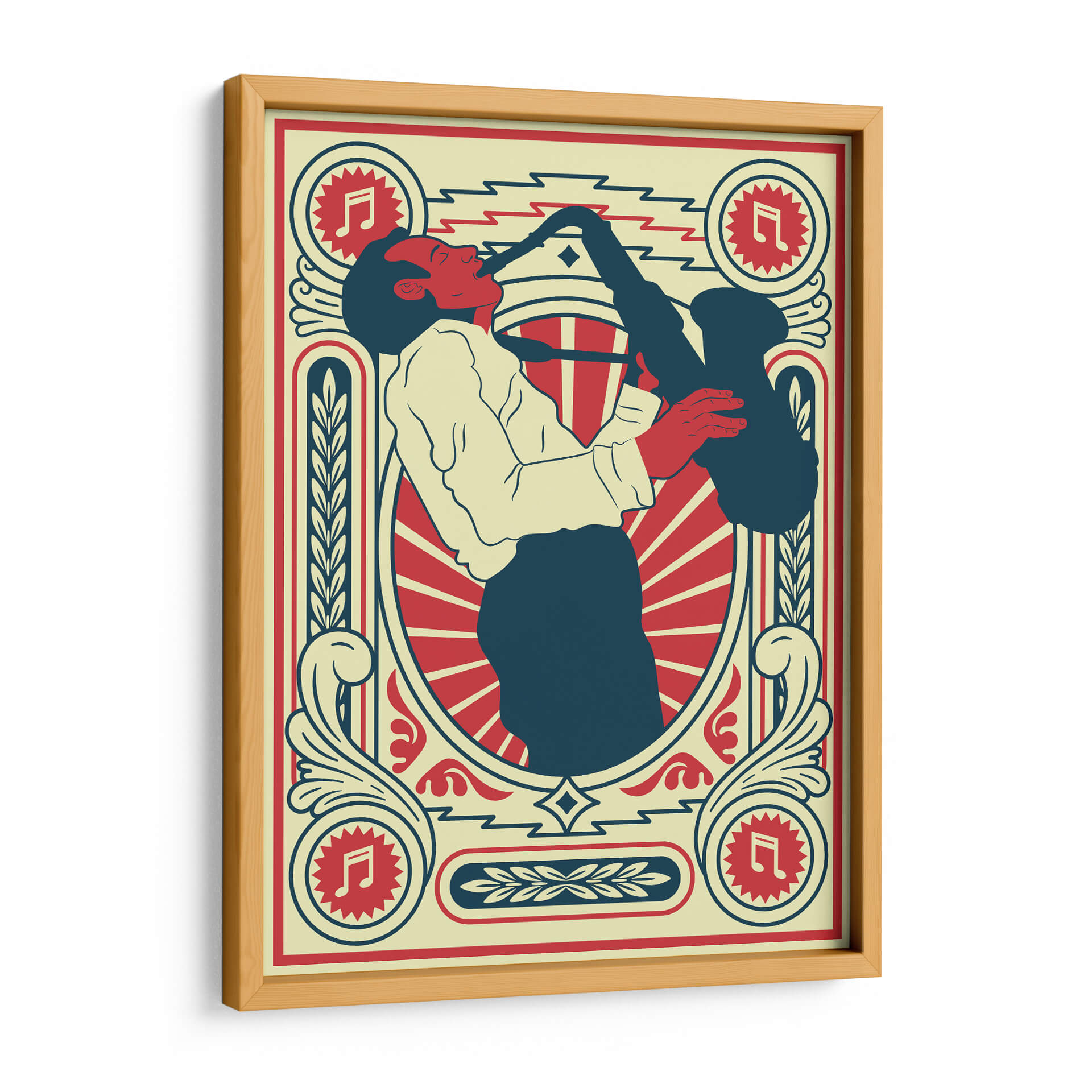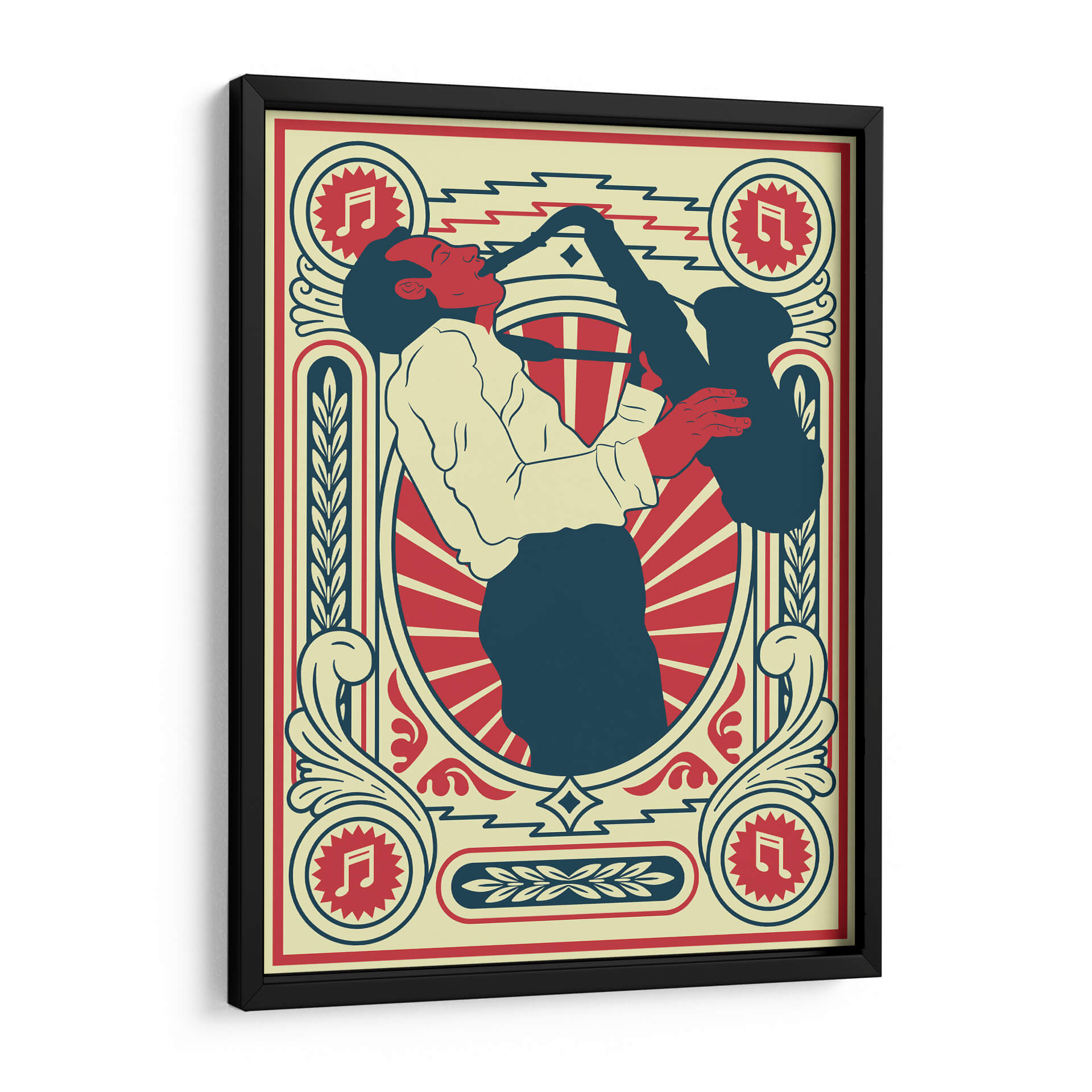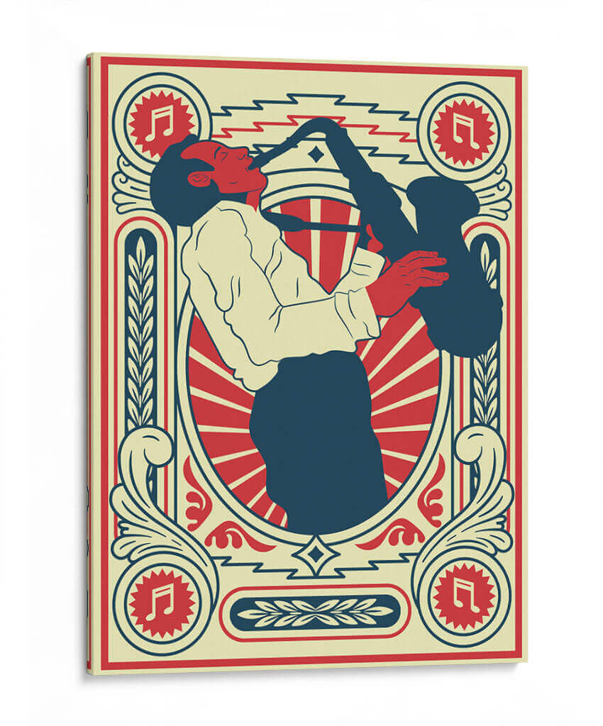 Sumérgete en el vibrante mundo del jazz con "Música Jazz" de Najesi, una obra de arte que captura la pasión y el alma de este género musical. La pieza presenta a un saxofonista en plena interpretación, con su rostro inclinado hacia el instrumento y una expresión de profunda concentración. La paleta de colores, dominada por tonos crema, azul marino y rojo intenso, crea un contraste audaz y una atmósfera retro, evocando la época dorada del jazz. El estilo gráfico, con contornos definidos y formas estilizadas, le otorga una energía visual única. Los intrincados detalles decorativos, como los símbolos musicales y los elementos ornamentales en los bordes, añaden un toque de sofisticación y un aire vintage. "Música Jazz" es ideal para cualquier espacio que busque un punto focal lleno de ritmo y carácter, como una sala de estar, un estudio musical o una oficina con un toque de estilo. Esta obra no solo decora, sino que también transmite una sensación de movimiento, emoción y la inconfundible melodía del jazz, convirtiéndose en una pieza central que inspira y cautiva a todos los que la contemplan. Añade un toque de sofisticación y pasión musical a tu hogar con este impresionante lienzo.