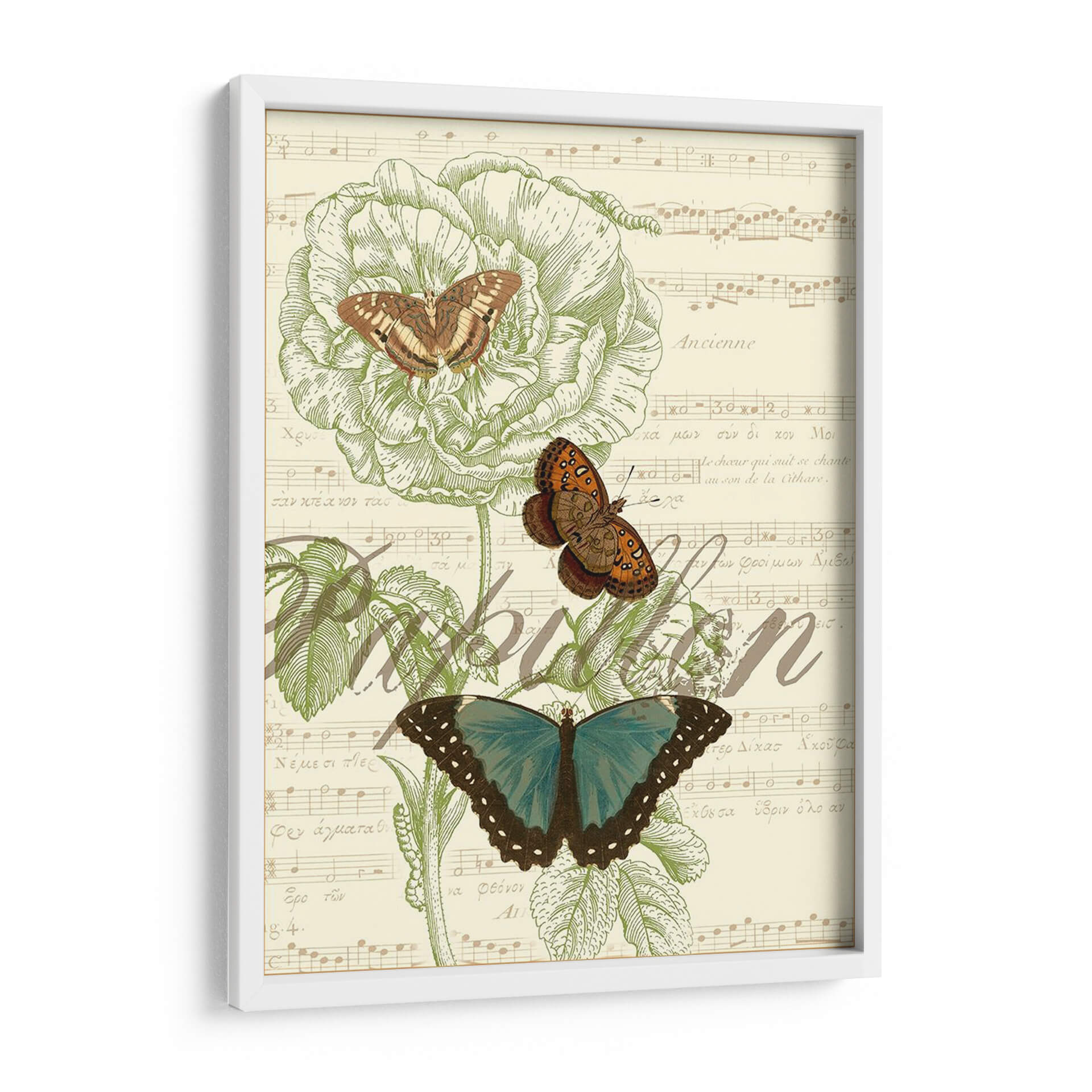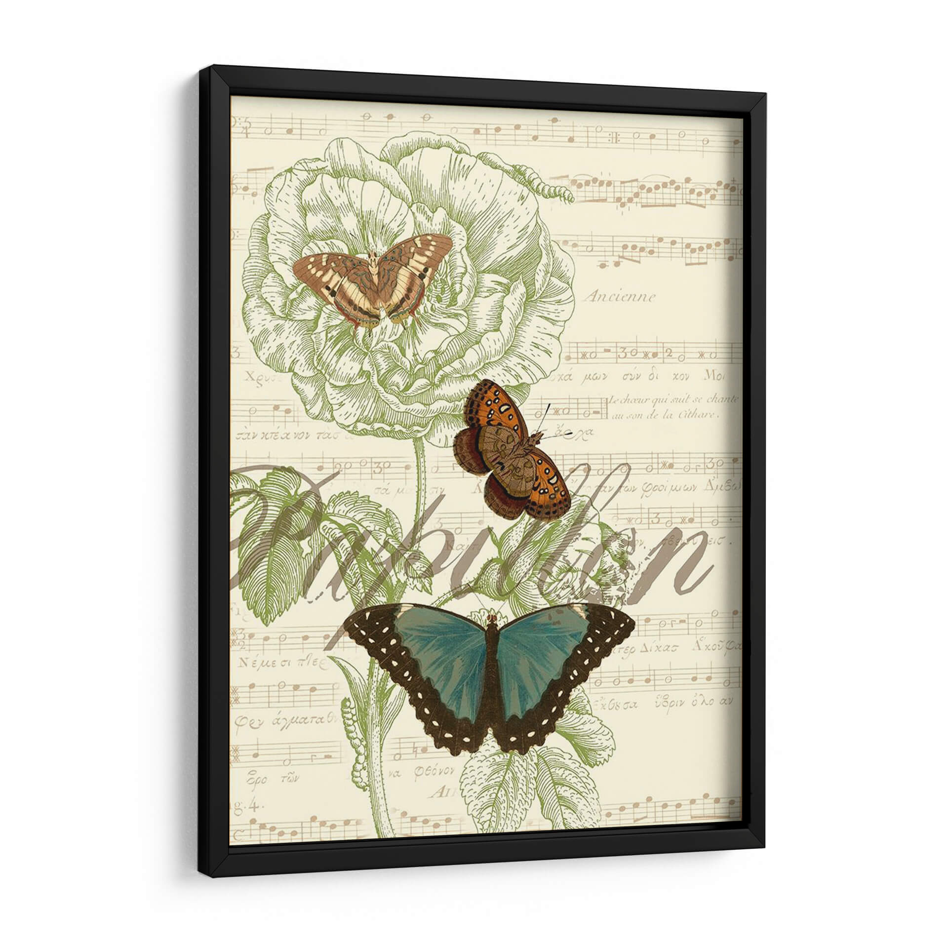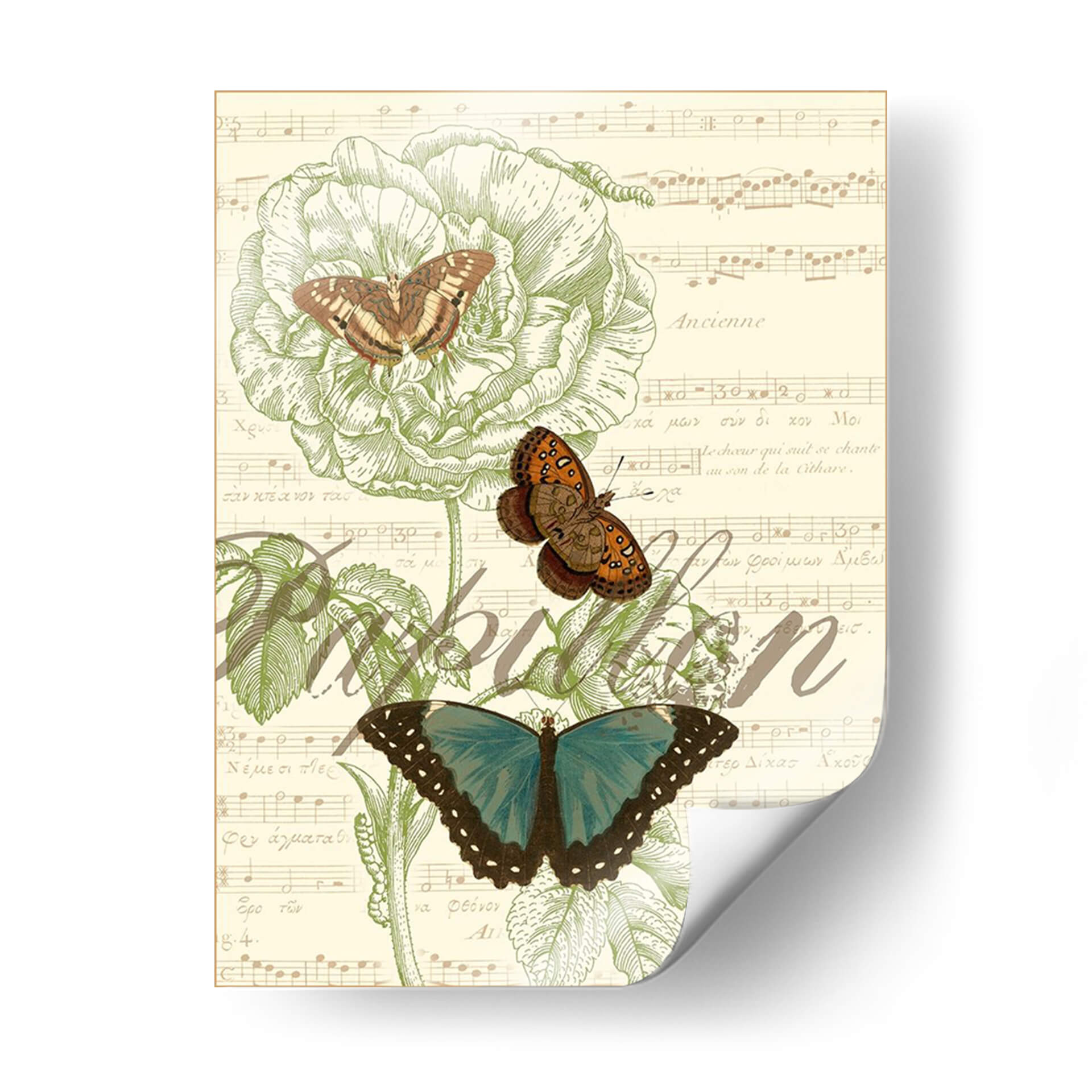 Transforma tu espacio con la delicada belleza de 'Papillon Melange Ii', una obra de arte digital que evoca la serenidad de la naturaleza y la elegancia atemporal de la música. Este cuadro decorativo presenta un exquisito estudio botánico de una flor grande, bellamente detallada en un tono verde pálido, acompañada por tres mariposas en distintas etapas de vuelo y color. Las mariposas, una de un vibrante azul turquesa y dos en tonos tierra y naranjas, añaden un toque de color y dinamismo a la composición. El fondo, una partitura musical vintage con caligrafía antigua, crea una atmósfera nostálgica y sofisticada, fusionando el arte visual con la armonía sonora. 'Papillon Melange Ii' es perfecto para aquellos que buscan infundir calma y un toque de sofisticación en su hogar u oficina. Su estilo ecléctico lo hace ideal para salas de estar modernas, dormitorios tranquilos o estudios creativos, aportando una sensación de orden y belleza natural. Imagina este cuadro como el punto focal de tu pared, inspirando paz y admiración en cada mirada. Añade una pieza única que celebre la intrincada danza entre la flora, la fauna y la melodía.