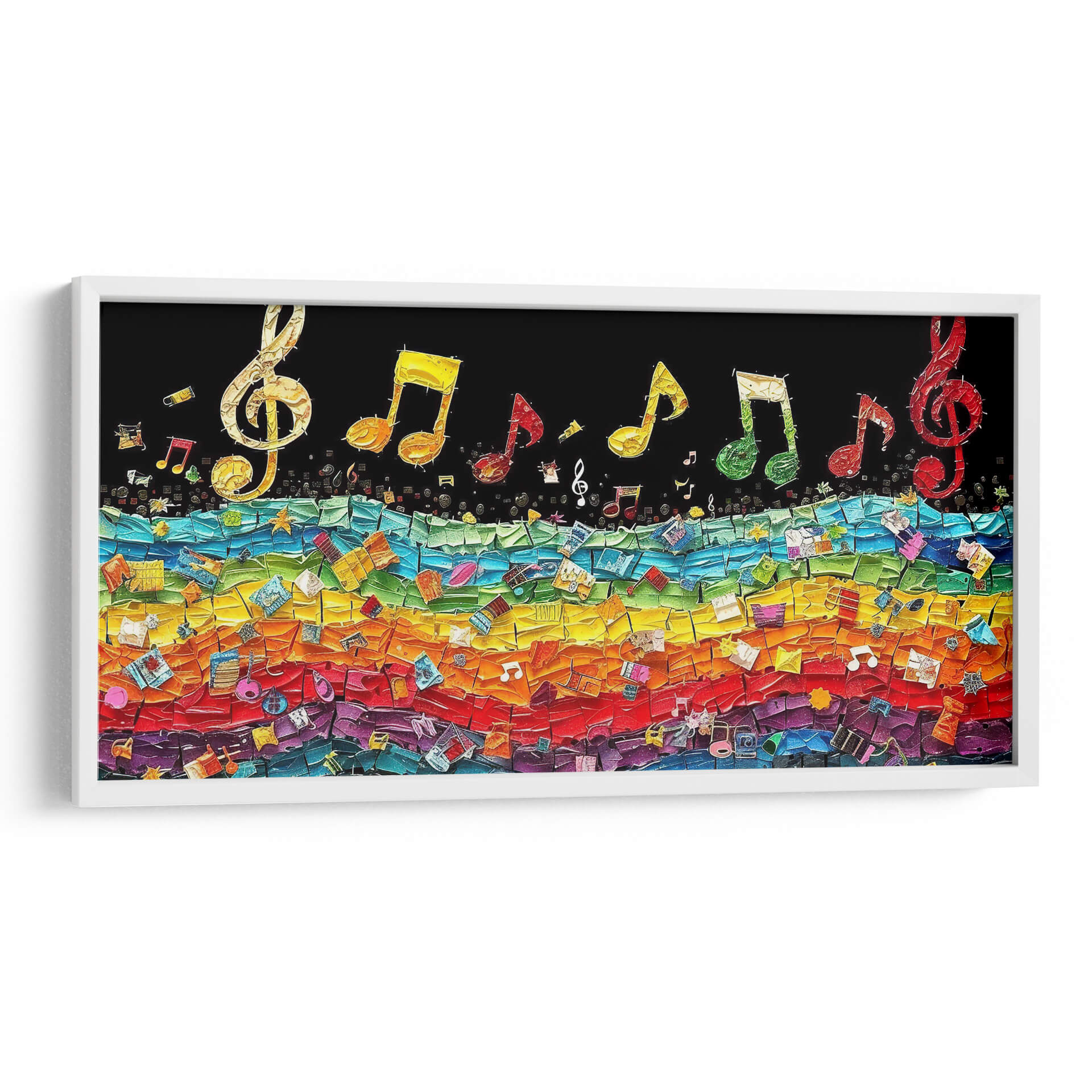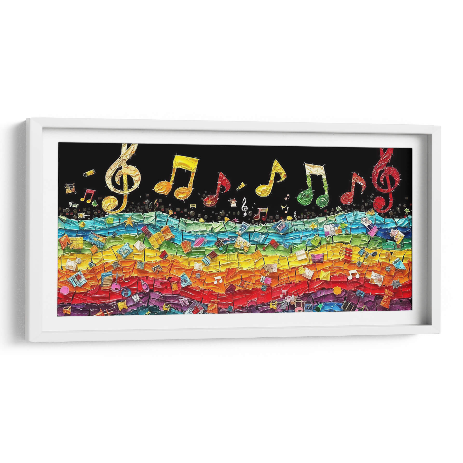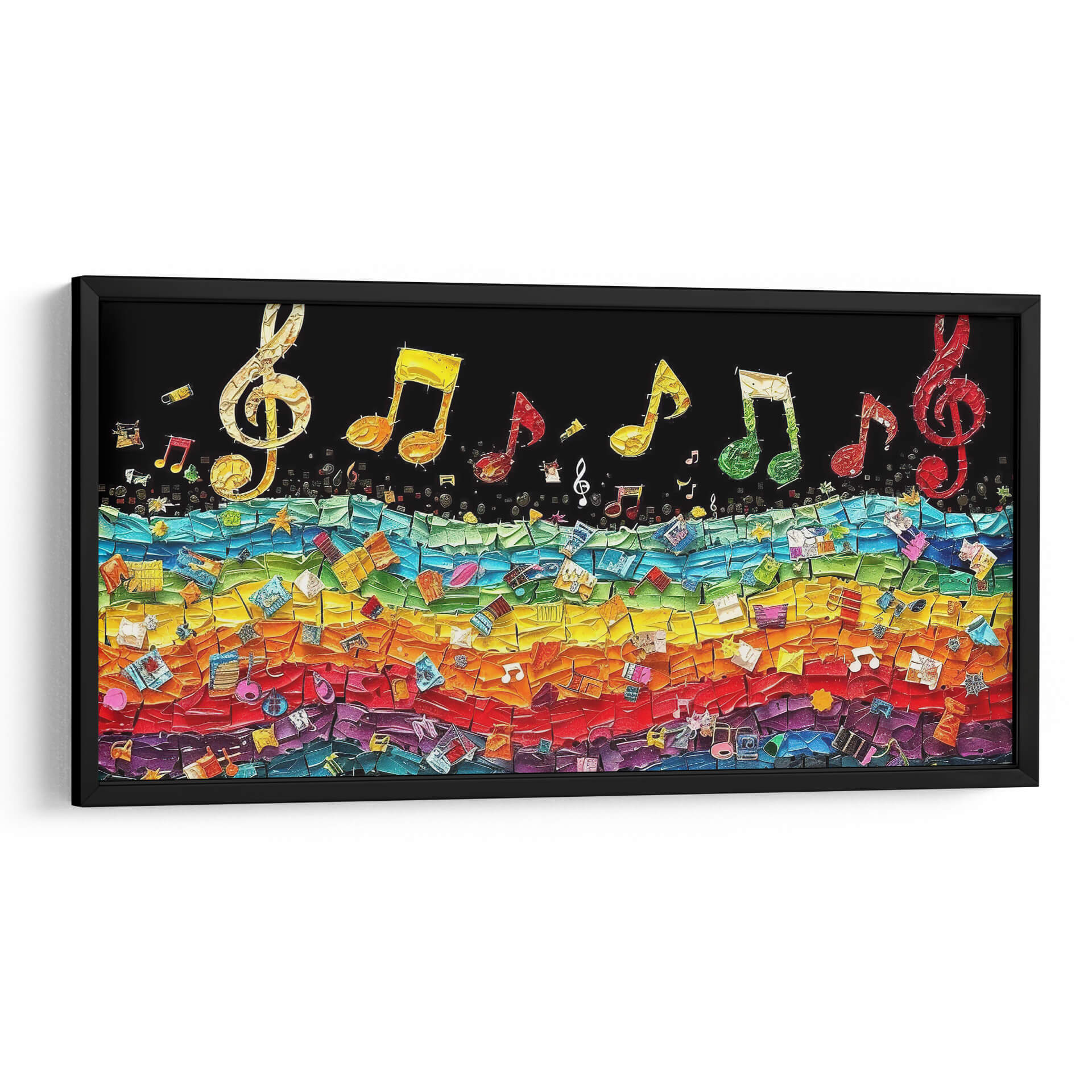 Sumérgete en la vibrante sinfonía visual de 'Pared Musical', una obra de arte que captura la energía y la alegría de la música a través de un caleidoscopio de colores. Cecilia Flores nos presenta una composición dinámica donde notas musicales doradas y de vivos tonos flotan sobre un fondo negro, como si estuvieran suspendidas en el aire, invitando a la imaginación a volar. Debajo, una explosión de color en forma de arcoíris, construida a partir de fragmentos texturizados que evocan partituras, instrumentos y otros elementos musicales, crea una base rica y llena de vida. Cada fragmento es una pincelada de historia sonora, invitando a una inspección detallada que revela sorpresas visuales. Los colores cálidos como el rojo, naranja y amarillo se fusionan con tonos fríos de azul y verde, creando un equilibrio visual que es a la vez estimulante y armonioso. Este cuadro decorativo es perfecto para espacios que buscan un toque de personalidad y vitalidad, como salas de estar, estudios musicales o incluso oficinas creativas. Añade un elemento de inspiración y ritmo a tu decoración con esta pieza única que celebra la universalidad del lenguaje musical.