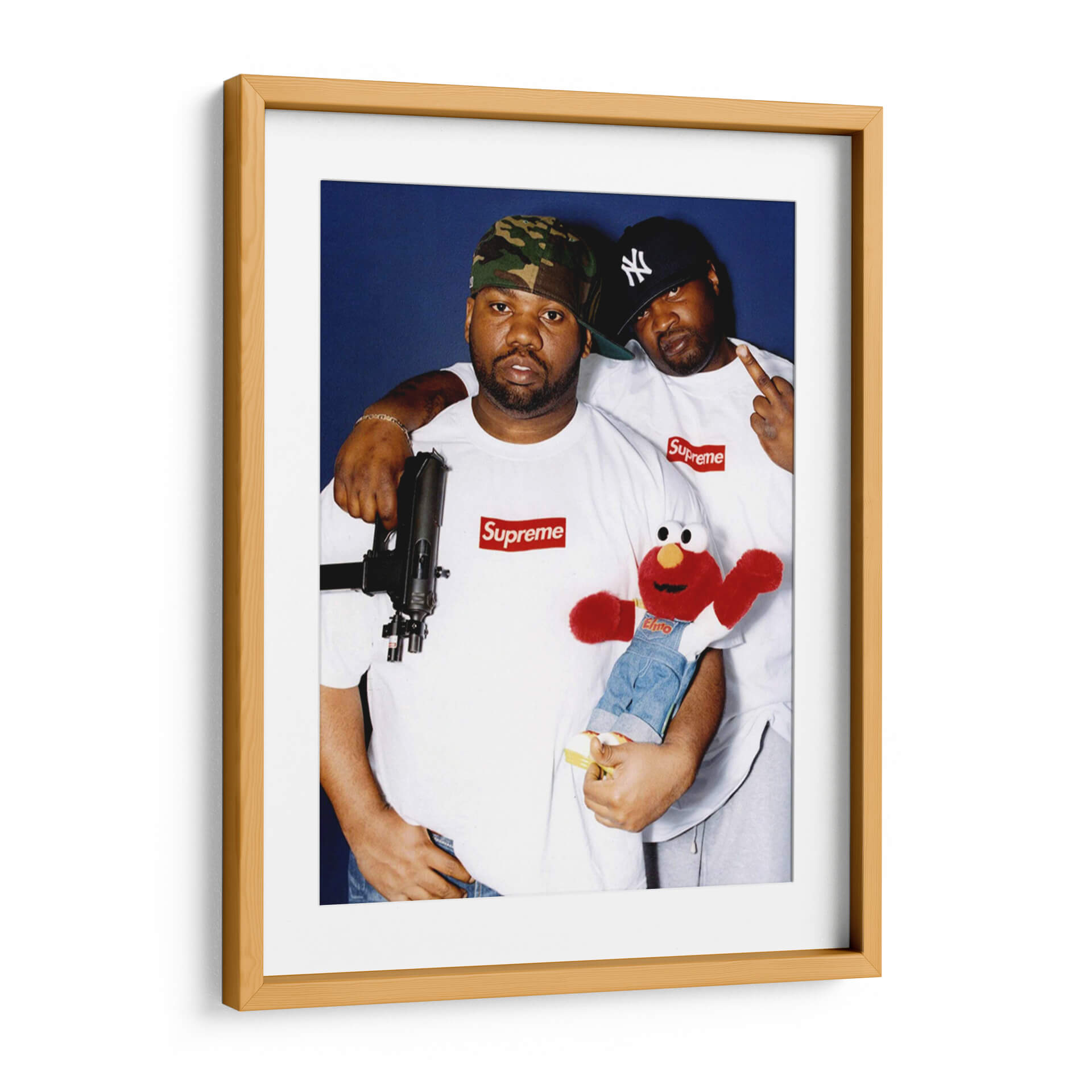 Este cuadro decorativo captura la esencia cruda y audaz de la cultura hip-hop, presentando una imagen icónica de dos figuras masculinas con una actitud desafiante. La paleta de colores es dominada por el contraste entre el azul profundo del fondo y el blanco de las camisetas, acentuado por los detalles en rojo de los logotipos de Supreme. La composición es un retrato directo y sin concesiones que evoca una sensación de poder y rebeldía. La presencia de un arma y un muñeco de Elmo añade una capa de ironía y complejidad, sugiriendo una narrativa visual rica en simbolismo y referencias culturales. Ideal para espacios que buscan un toque de carácter urbano y vanguardista, como salas de estar, estudios o espacios de entretenimiento. Este cuadro es perfecto para los amantes de la música, la moda urbana y el arte que rompe esquemas, añadiendo un punto focal intrigante y lleno de personalidad a cualquier decoración. Su estética potente y su conexión con la iconografía moderna lo convierten en una pieza de conversación única.