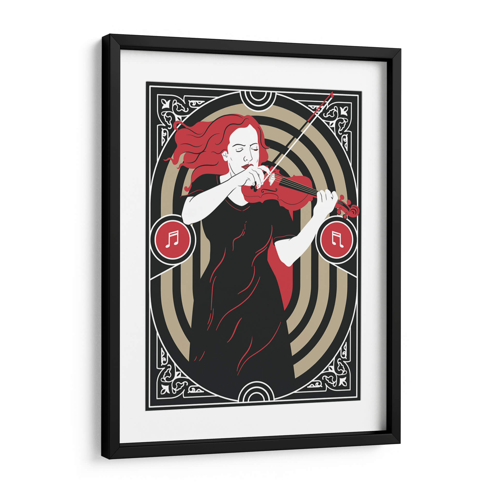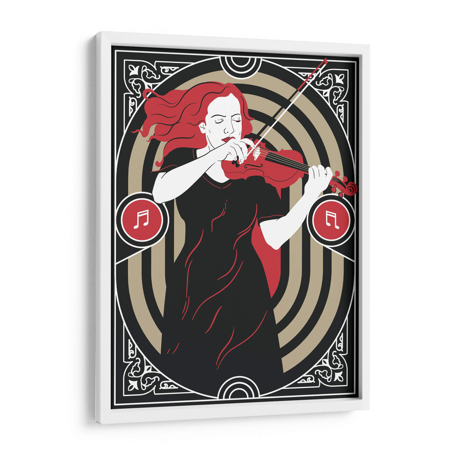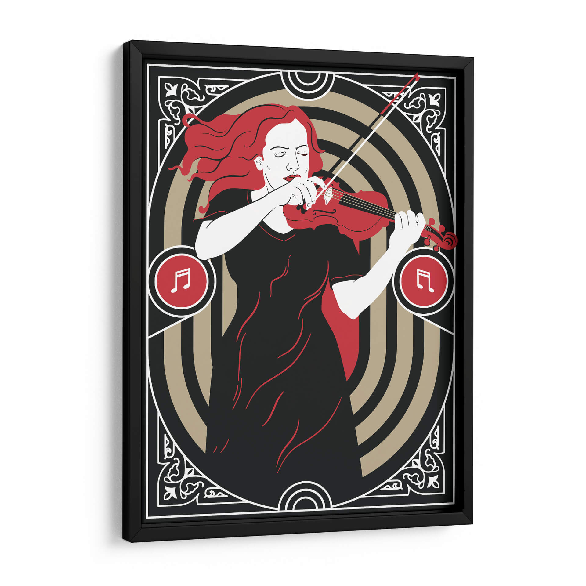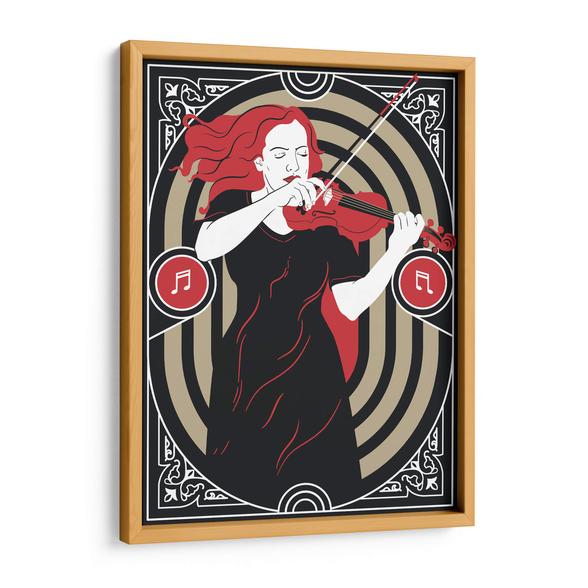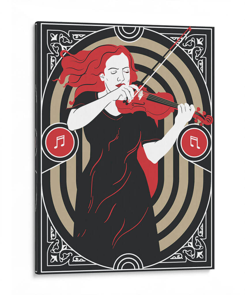 Sumérgete en la melodía visual de "Música Clásica" de Najesi, una obra de arte que evoca la pasión y la elegancia de una interpretación musical. Esta pieza, con su distintivo estilo gráfico y una paleta de colores contrastante de negro profundo, blanco puro y vibrante rojo, captura la esencia de una violinista inmersa en su música. La composición se centra en la figura femenina, con su cabello rojo ondeando y sus ojos cerrados en concentración, transmitiendo una profunda conexión emocional con el instrumento. Los elementos circulares y los motivos ornamentales en los bordes añaden un toque Art Decó y sofisticación, enmarcando la escena con un aire de clasicismo moderno. Los símbolos musicales integrados refuerzan el tema central, invitando al espectador a sentir el ritmo y la armonía. "Música Clásica" es perfecta para añadir un punto focal de refinamiento y sentimiento a cualquier espacio, ya sea una sala de estar moderna, un estudio de música o una oficina. Ideal para amantes de la música y del arte contemporáneo que buscan piezas con alma.