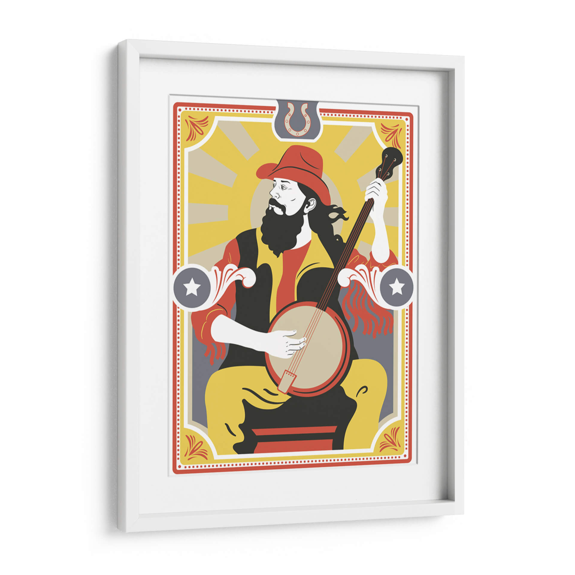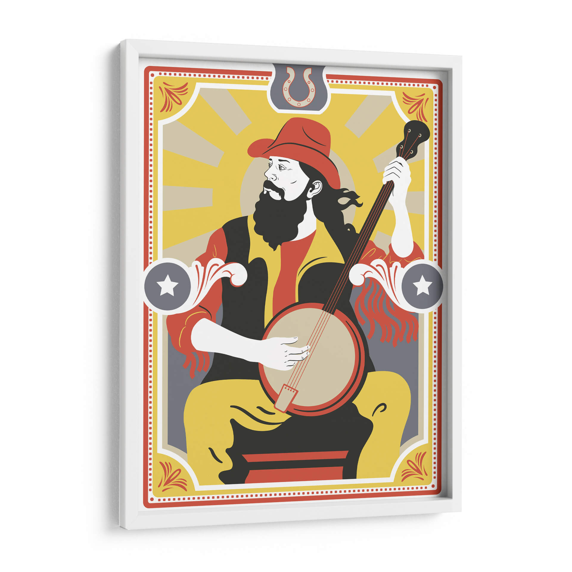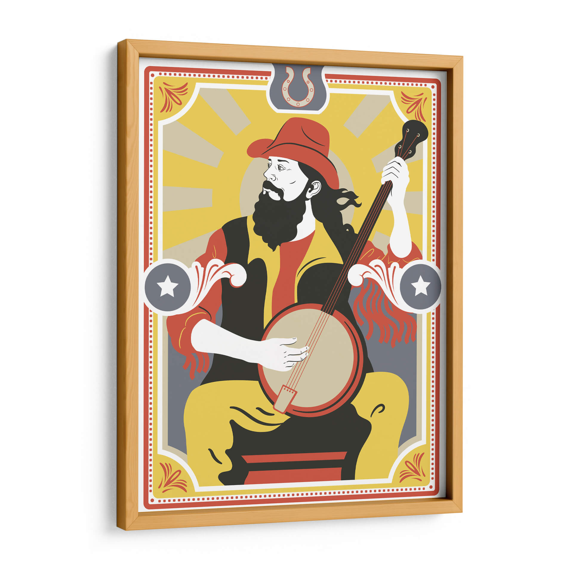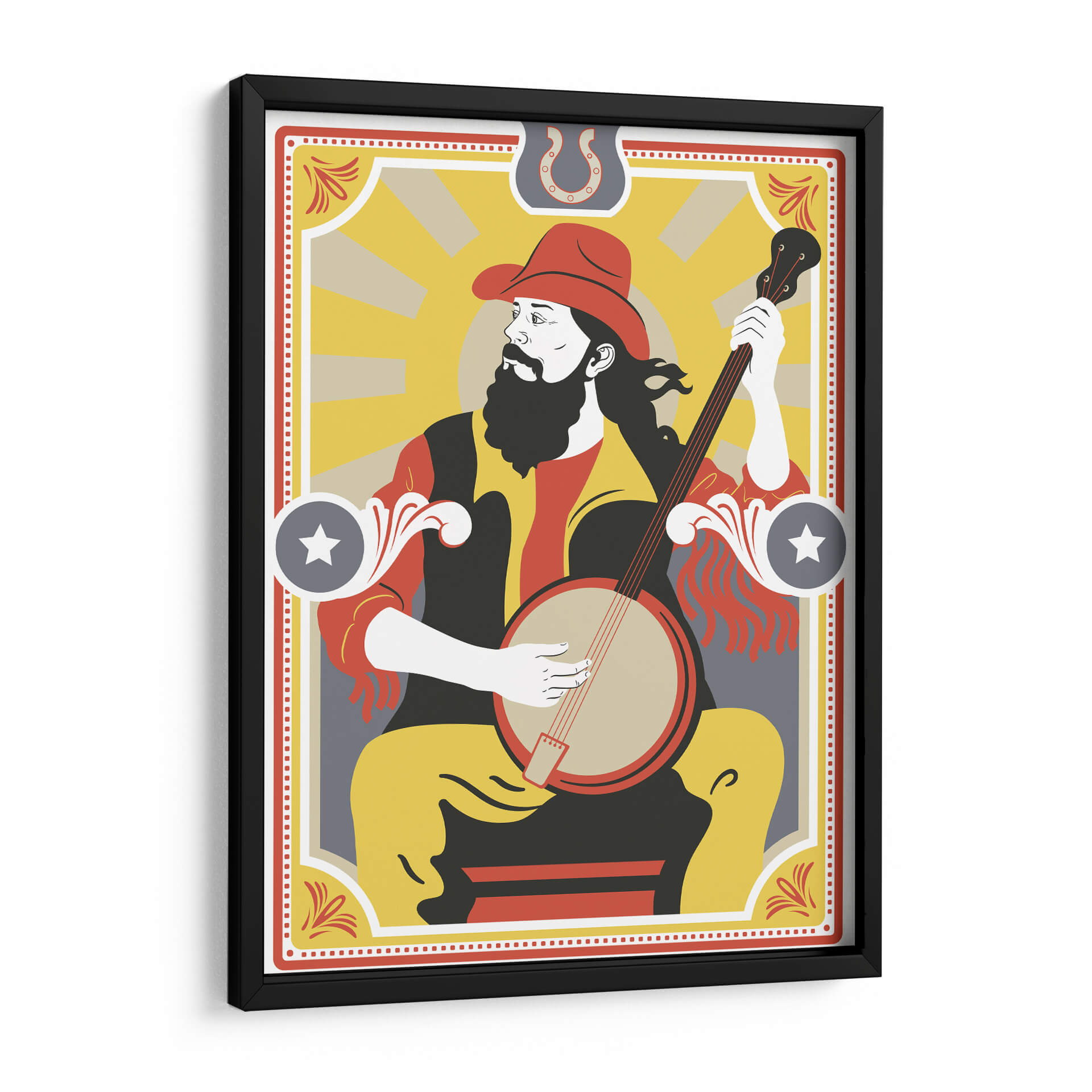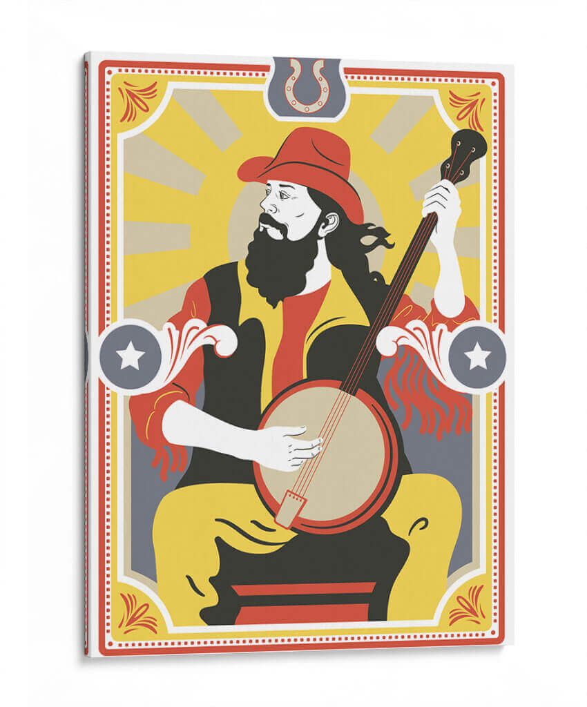 Sumérgete en la vibrante esencia de la música country con esta cautivadora obra de arte de Najesi. La pieza presenta a un músico con sombrero de vaquero y barba, absorto en la melodía de su banjo. Los colores cálidos y audaces, dominados por amarillos, rojos y negros, evocan la energía y el espíritu de las raíces americanas. La composición estilizada, con influencias del arte pop y un toque retro, crea una atmósfera nostálgica pero moderna. Los detalles gráficos, como el sol naciente en el fondo y los adornos laterales, añaden profundidad y carácter. Ideal para salas de estar, estudios de música o cualquier espacio que busque un punto focal lleno de personalidad y ritmo. Esta pieza es un homenaje visual a la tradición musical, perfecta para añadir un toque distintivo y lleno de vida a tu decoración.