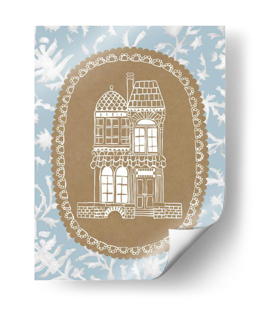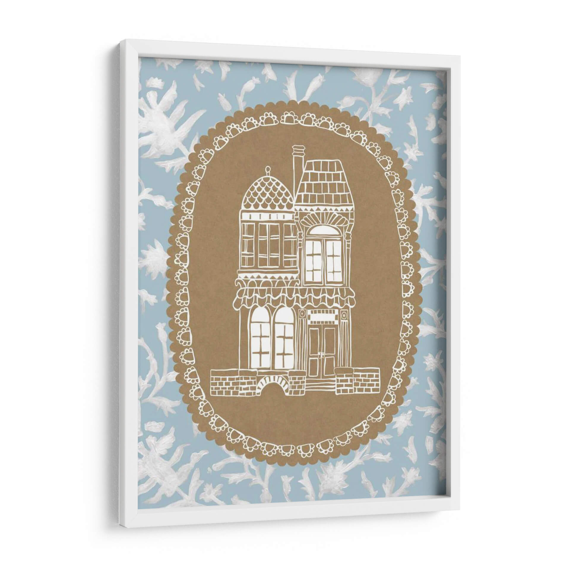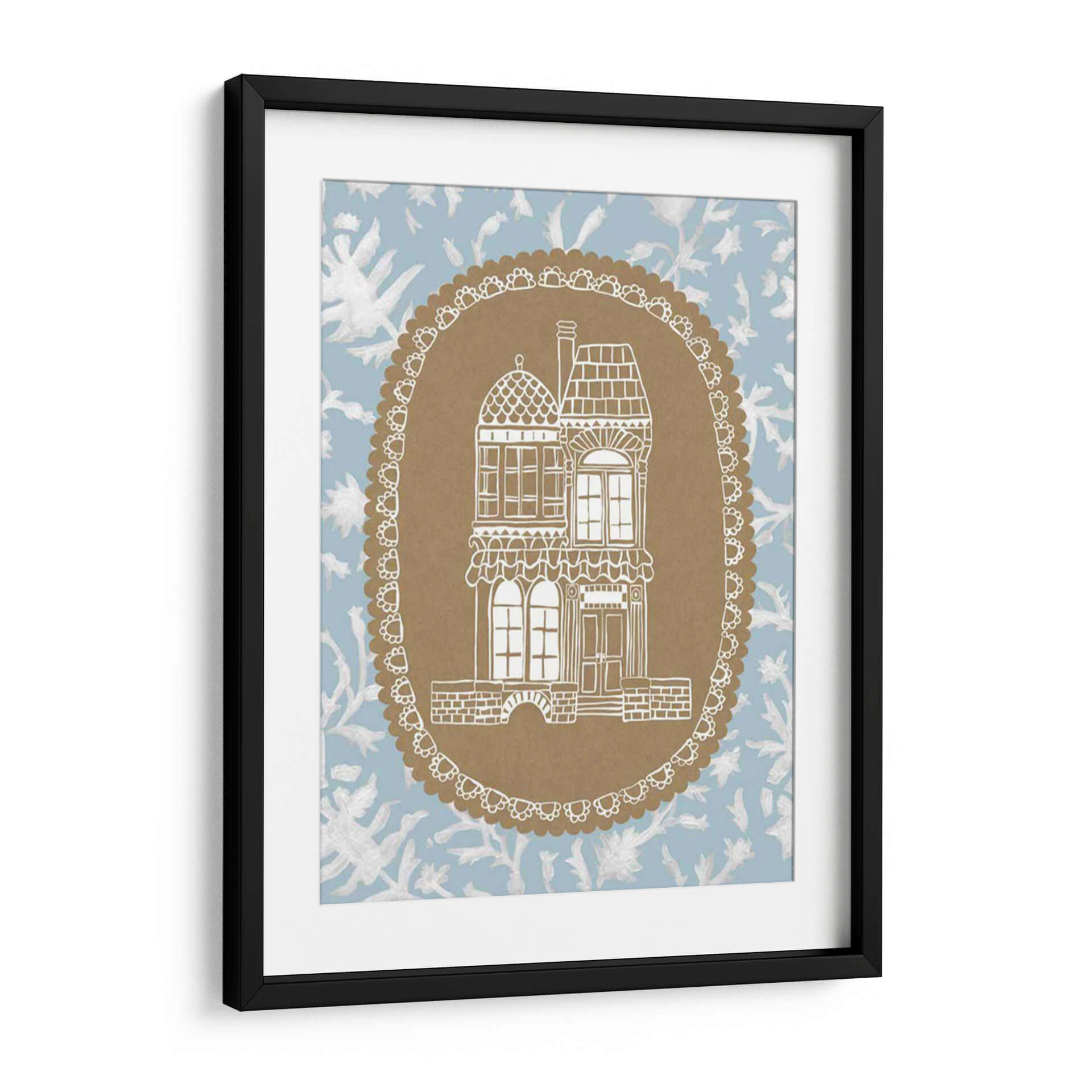Sumérgete en la nostalgia y el encanto de "Averys Dollhouse II", una obra de arte que evoca la calidez de los hogares de antaño. Esta pieza presenta una detallada ilustración lineal de una casa de muñecas estilizada, delineada en blanco sobre un fondo de papel kraft, encapsulada dentro de un marco ovalado ornamentado con un delicado borde de encaje. El fondo de la obra se adorna con un patrón floral suave en tonos azul pálido y blanco, que aporta una sensación de serenidad y ligereza. La composición general es simétrica y equilibrada, centrada en la intrincada arquitectura de la casa, con sus múltiples ventanas, tejados abovedados y un distinguido tejado a dos aguas. La paleta de colores, dominada por el marrón terroso, el azul cielo y el blanco nítido, crea una atmósfera acogedora y ligeramente caprichosa. Este cuadro decorativo es perfecto para añadir un toque de dulzura y carácter a cualquier espacio, desde una habitación infantil hasta una sala de estar con un estilo ecléctico o vintage. Su diseño detallado invita a la contemplación, convirtiéndolo en un punto focal encantador que evoca recuerdos y sueños.