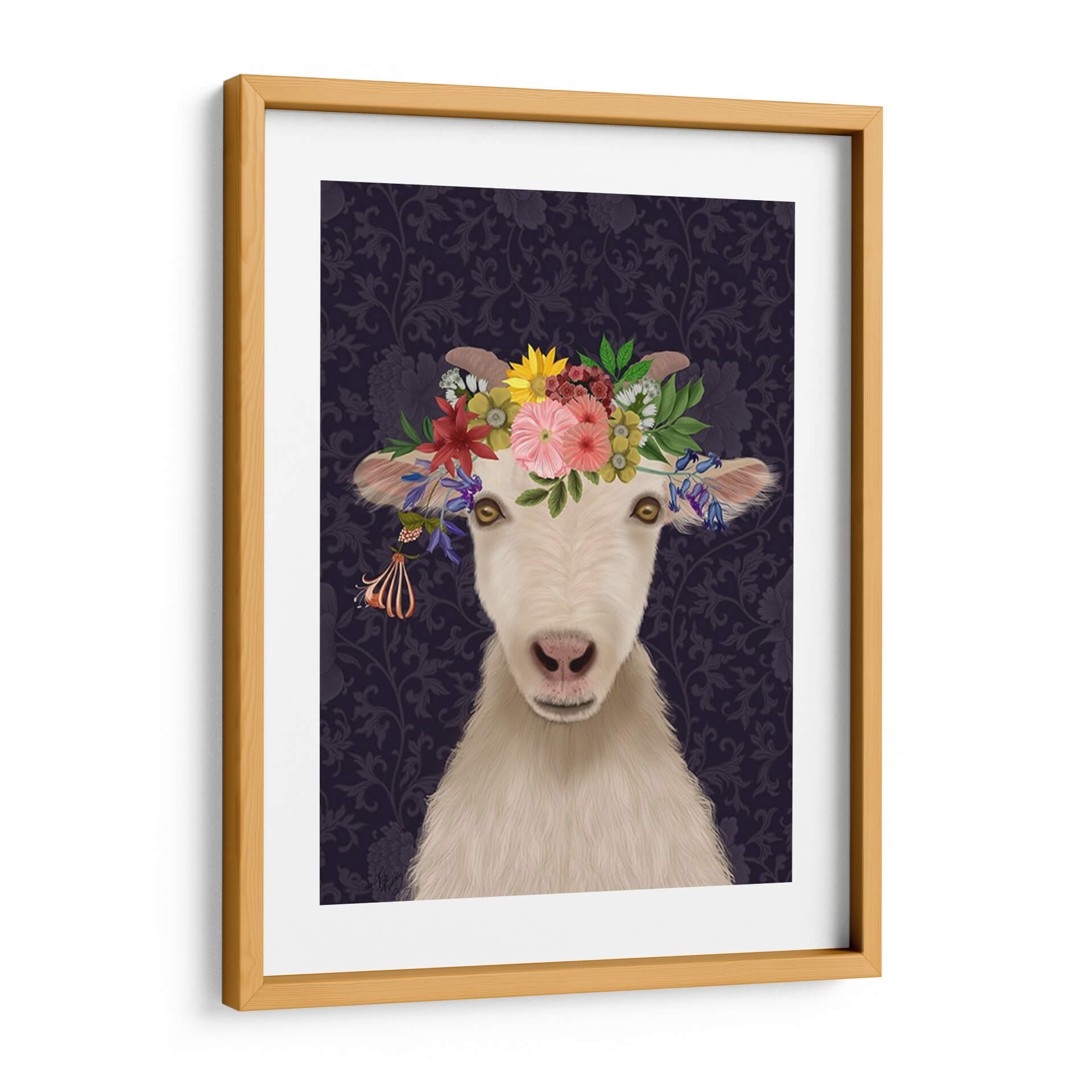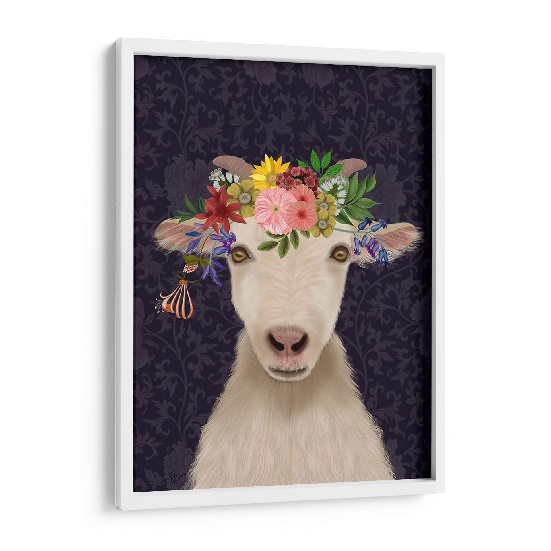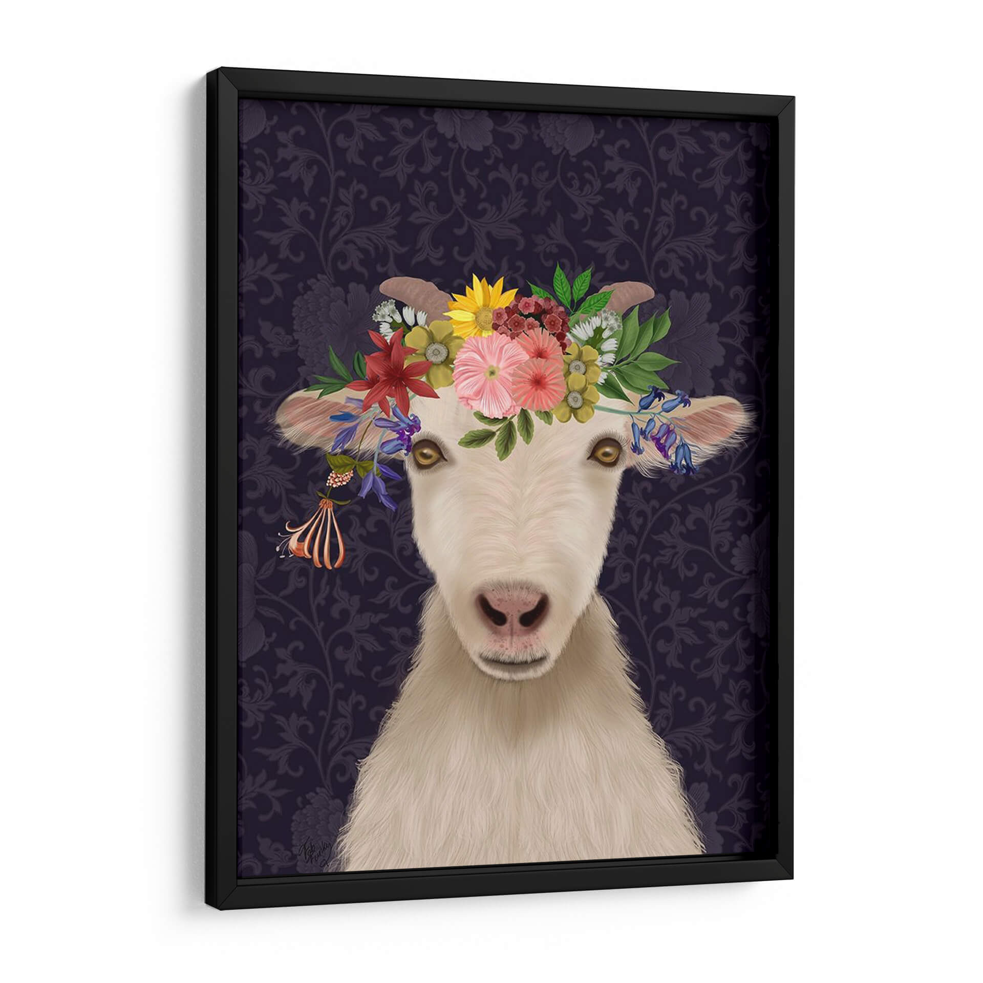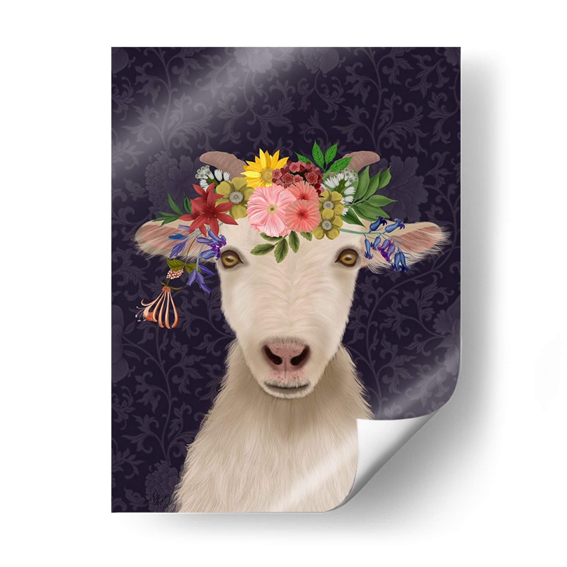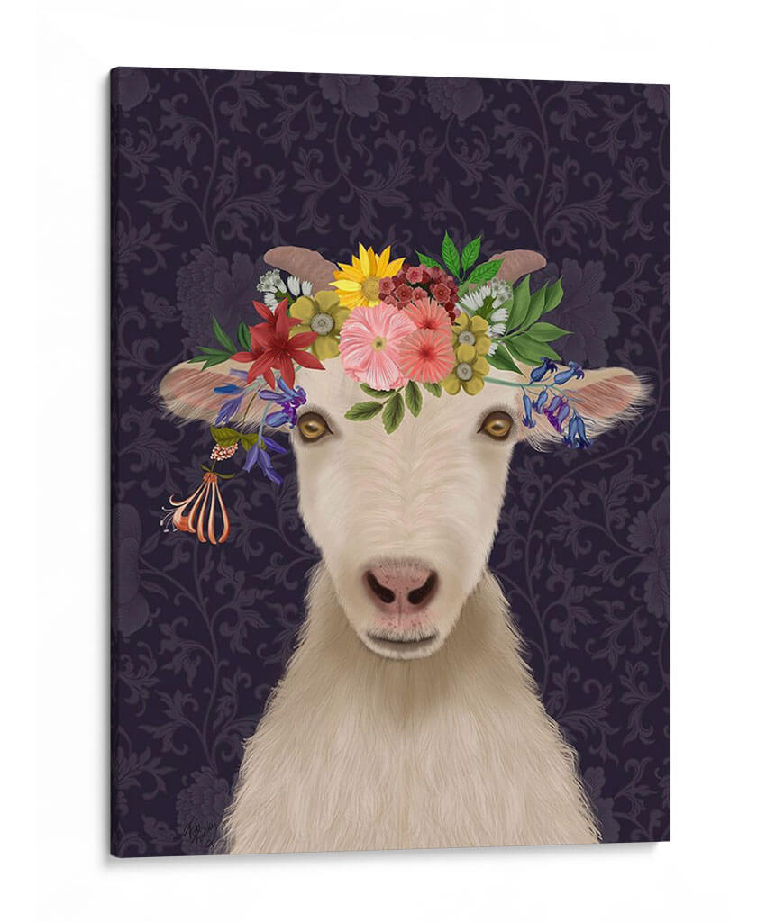 Adéntrate en un mundo de encanto rústico y sofisticación bohemia con este cautivador cuadro decorativo "Cabra Bohemia 1". Esta obra de arte digital presenta el rostro de una cabra con una exuberante corona de flores vibrantes, que contrasta maravillosamente con un fondo de intrincados motivos florales en tonos morados oscuros. Los ojos dorados de la cabra irradian una mirada curiosa y serena, invitando a la contemplación. La detallada representación de la textura del pelaje y la delicadeza de cada pétalo floral crean una pieza visualmente rica y atractiva. El estilo, que combina elementos realistas con un toque caprichoso, lo convierte en una elección perfecta para aquellos que buscan añadir un punto focal único y lleno de personalidad a su hogar u oficina. Este cuadro decorativo es ideal para salas de estar, dormitorios o estudios, aportando un aire de originalidad y un toque de naturaleza estilizada a cualquier ambiente. Su paleta de colores, aunque dominada por los morados profundos, se ilumina con los tonos vivos de las flores, creando un equilibrio armonioso. Una pieza que celebra la belleza inesperada y el espíritu libre.