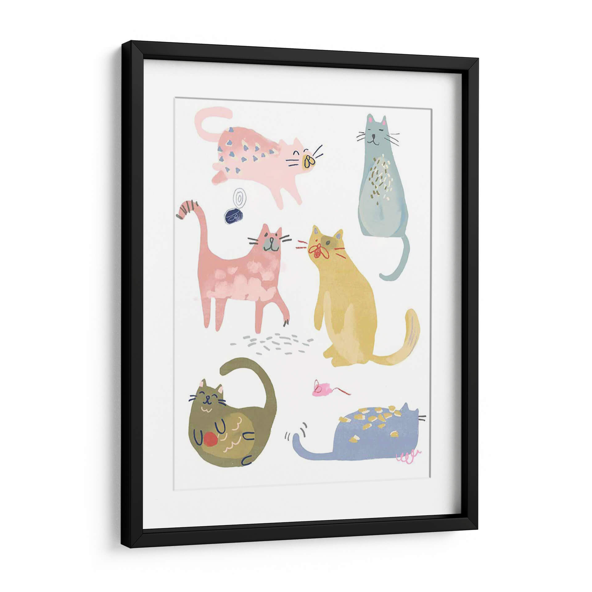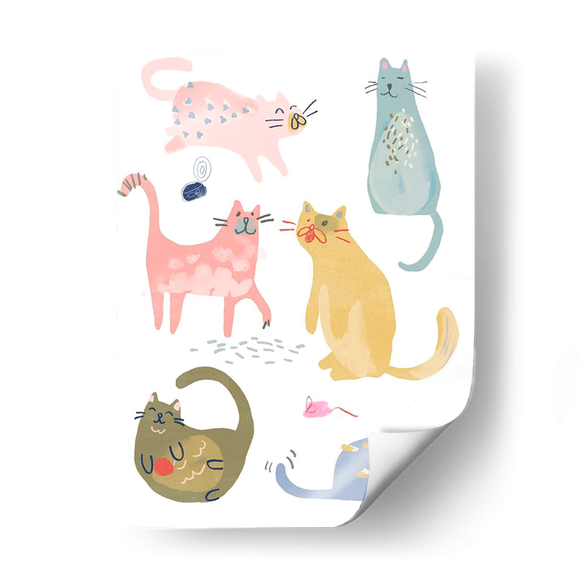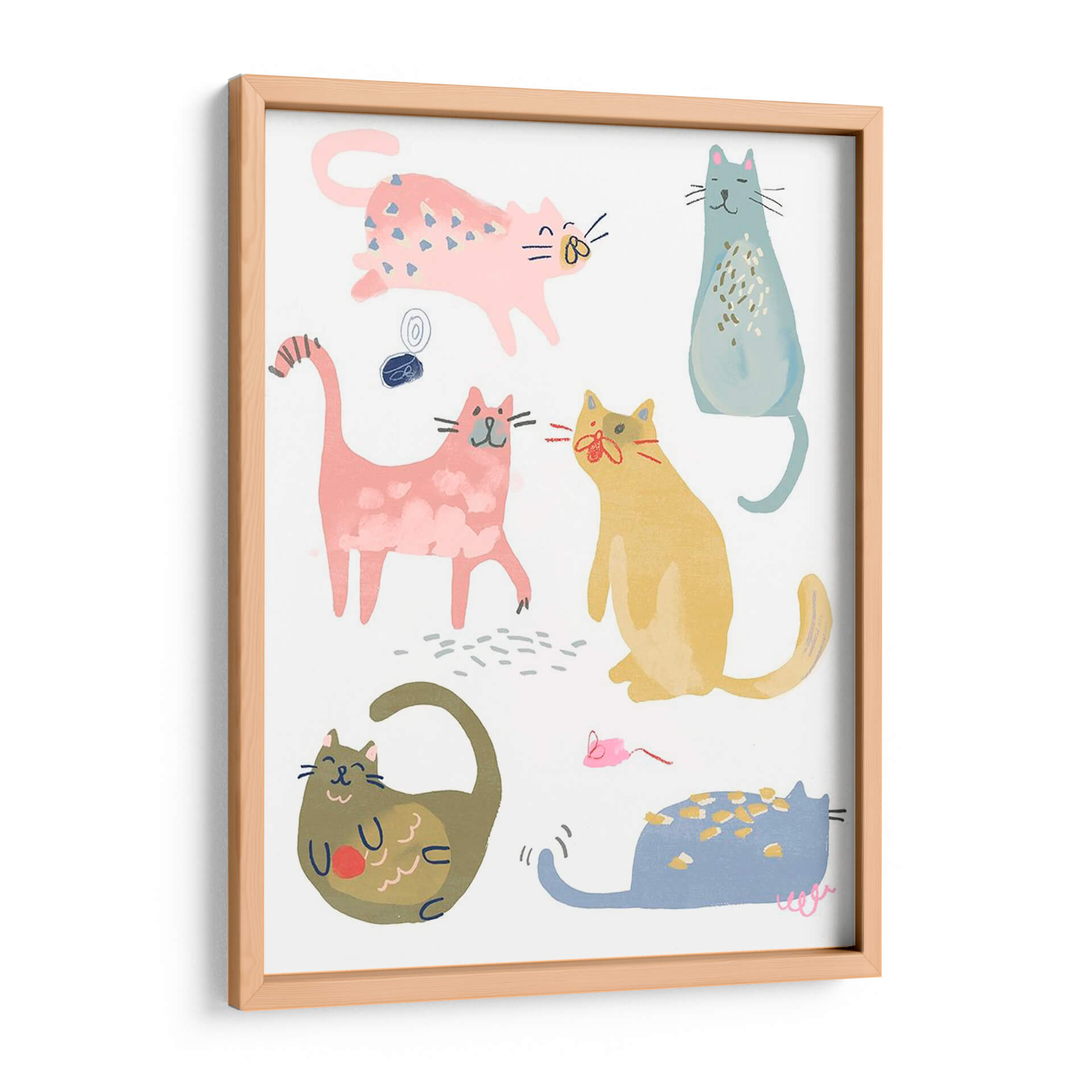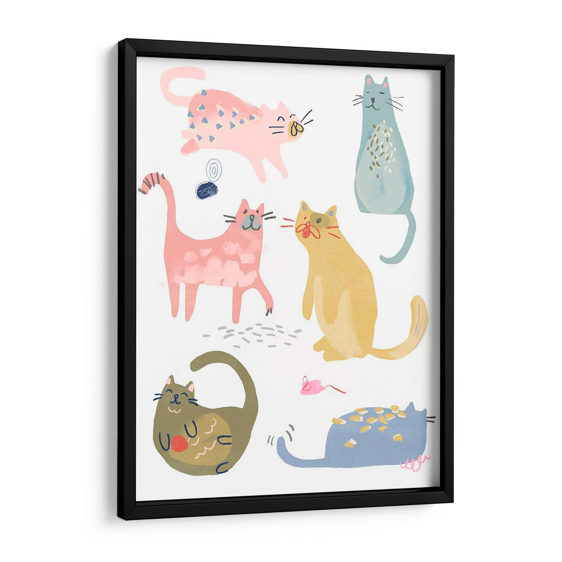 Descubre la encantadora obra 'Cat Squad Iv' de June Erica Vess, una pieza vibrante y juguetona que captura la esencia de nuestros amigos felinos con un estilo contemporáneo y lleno de personalidad. Este cuadro decorativo presenta una colección de gatos estilizados en diversas poses, cada uno con un encanto único. La paleta de colores pastel, con predominio de rosas, azules, amarillos y toques de verde, crea una atmósfera alegre y acogedora, perfecta para iluminar cualquier espacio. La composición, con figuras de gatos distribuidas de manera dinámica sobre un fondo blanco, aporta una sensación de movimiento y vitalidad. Las líneas sencillas y las formas redondeadas otorgan a la obra un aire moderno y accesible, ideal para amantes del arte minimalista y divertido. 'Cat Squad Iv' es más que una simple decoración; es una expresión de alegría y compañerismo felino que añadirá un toque de calidez y carácter a tu hogar u oficina. Imagina este cuadro como un punto focal divertido en tu sala de estar, un toque de color en tu estudio, o una adición lúdica a la habitación de un niño. Su versatilidad lo hace perfecto para cualquier ambiente que busque una dosis de encanto y originalidad.