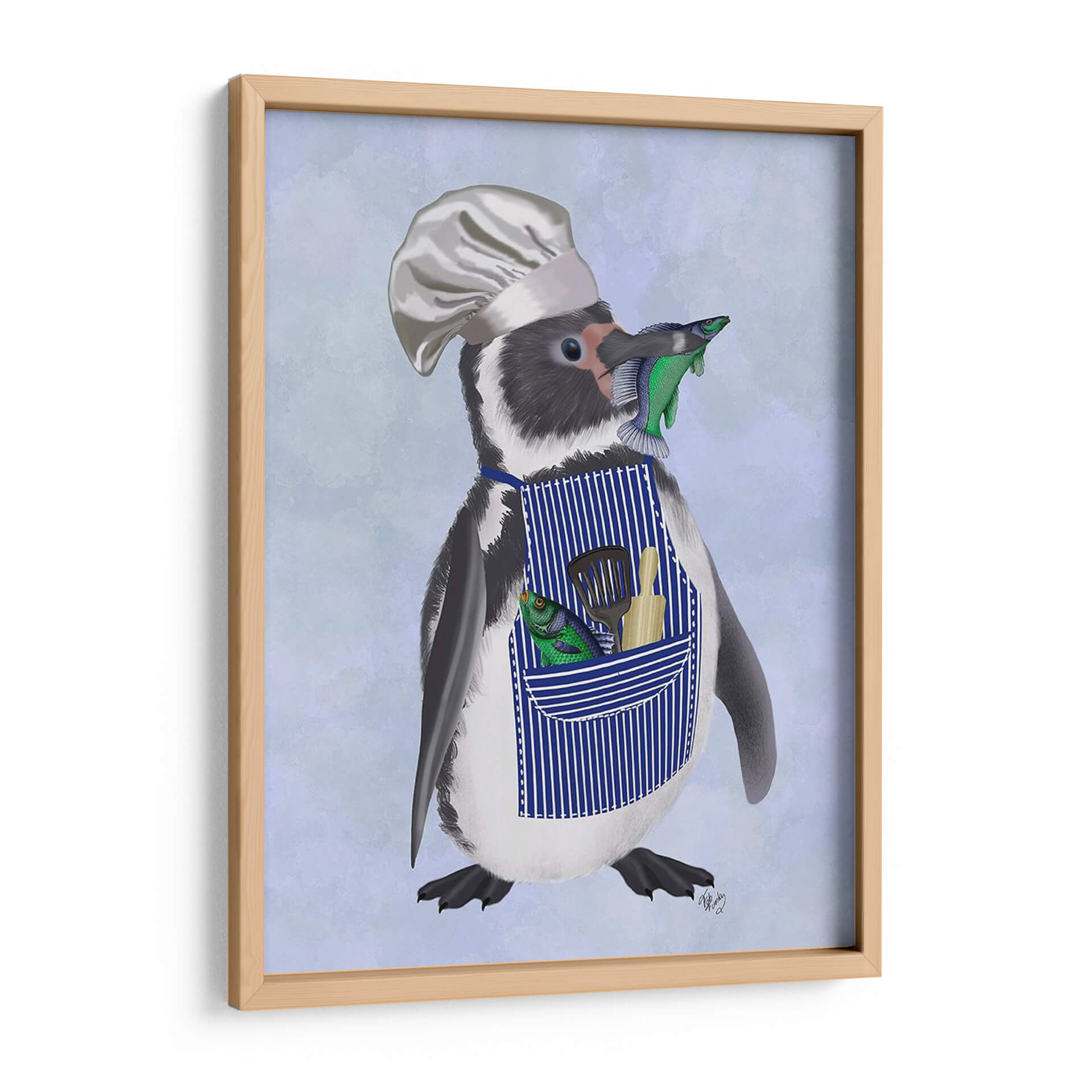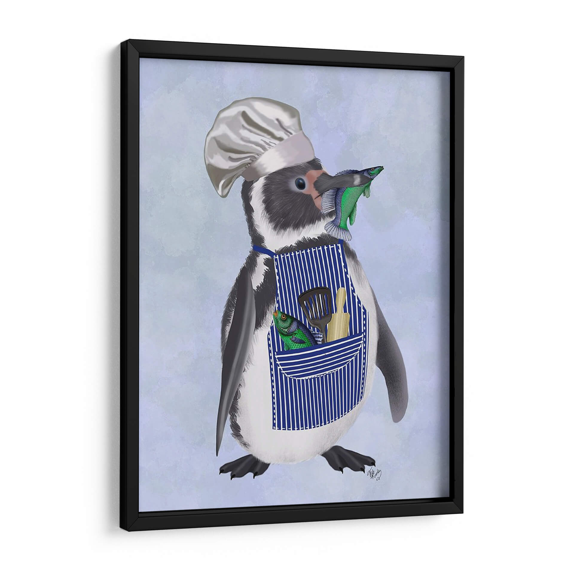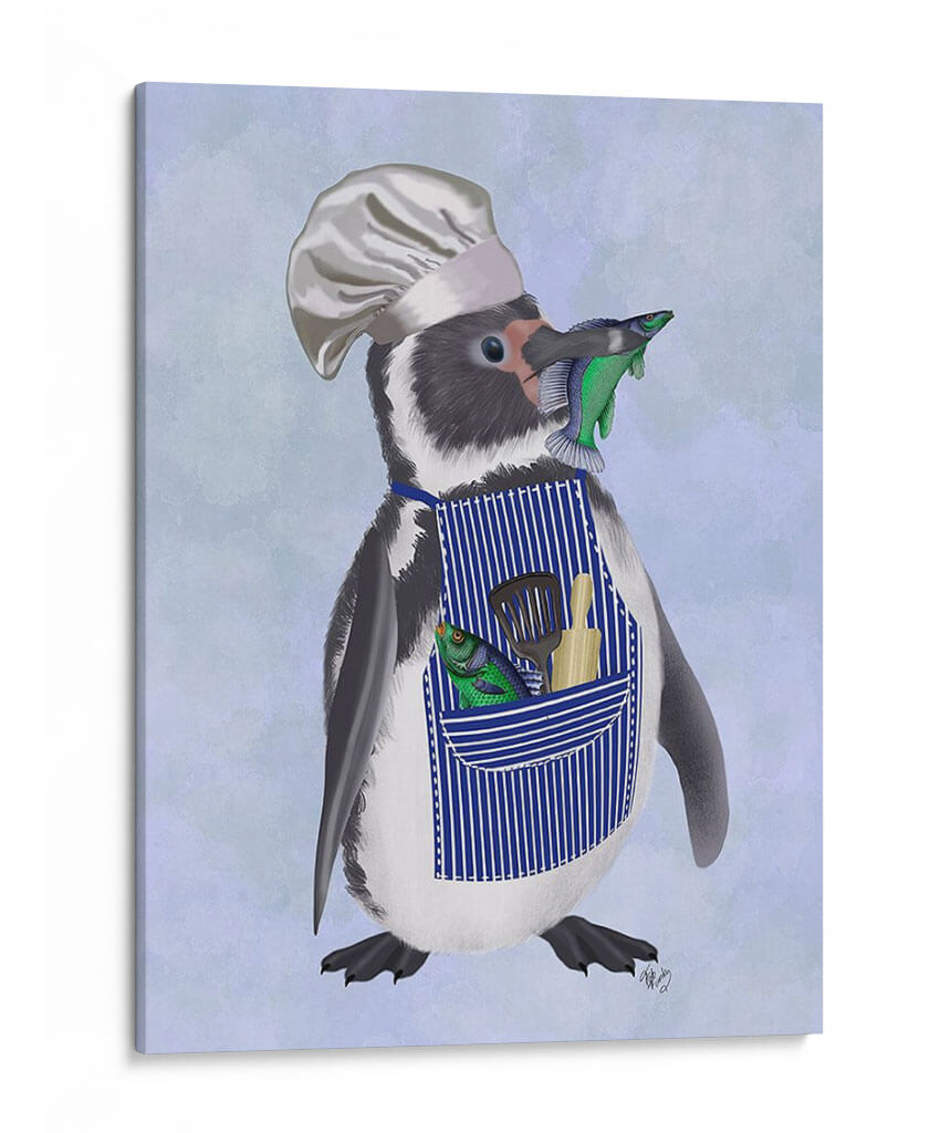 Este encantador cuadro decorativo, titulado "Chef Pingüino" por Fab Funky, captura la imaginación con su personaje peculiar y entrañable. La obra presenta un pingüino vestido con un gorro de chef y un delantal a rayas azules, sosteniendo ingeniosamente un pez en su pico y luciendo otro pez y utensilios de cocina en su bolsillo. El fondo, con un suave degradado de tonos celestes y lavanda, realza la figura central sin distraer. El estilo de la ilustración es detallado y juguetón, con un toque de realismo en la textura del plumaje del pingüino y el brillo de los peces. La paleta de colores, dominada por azules, blancos, negros y los vibrantes toques de verde y naranja de los peces, crea una atmósfera alegre y un tanto cómica. Este cuadro es perfecto para añadir un toque de personalidad y humor a cualquier cocina, comedor o espacio infantil. Su diseño único lo convierte en un punto focal que sin duda generará conversación y sonreirá a quienes lo contemplen, aportando una dosis de fantasía y originalidad a la decoración de tu hogar.